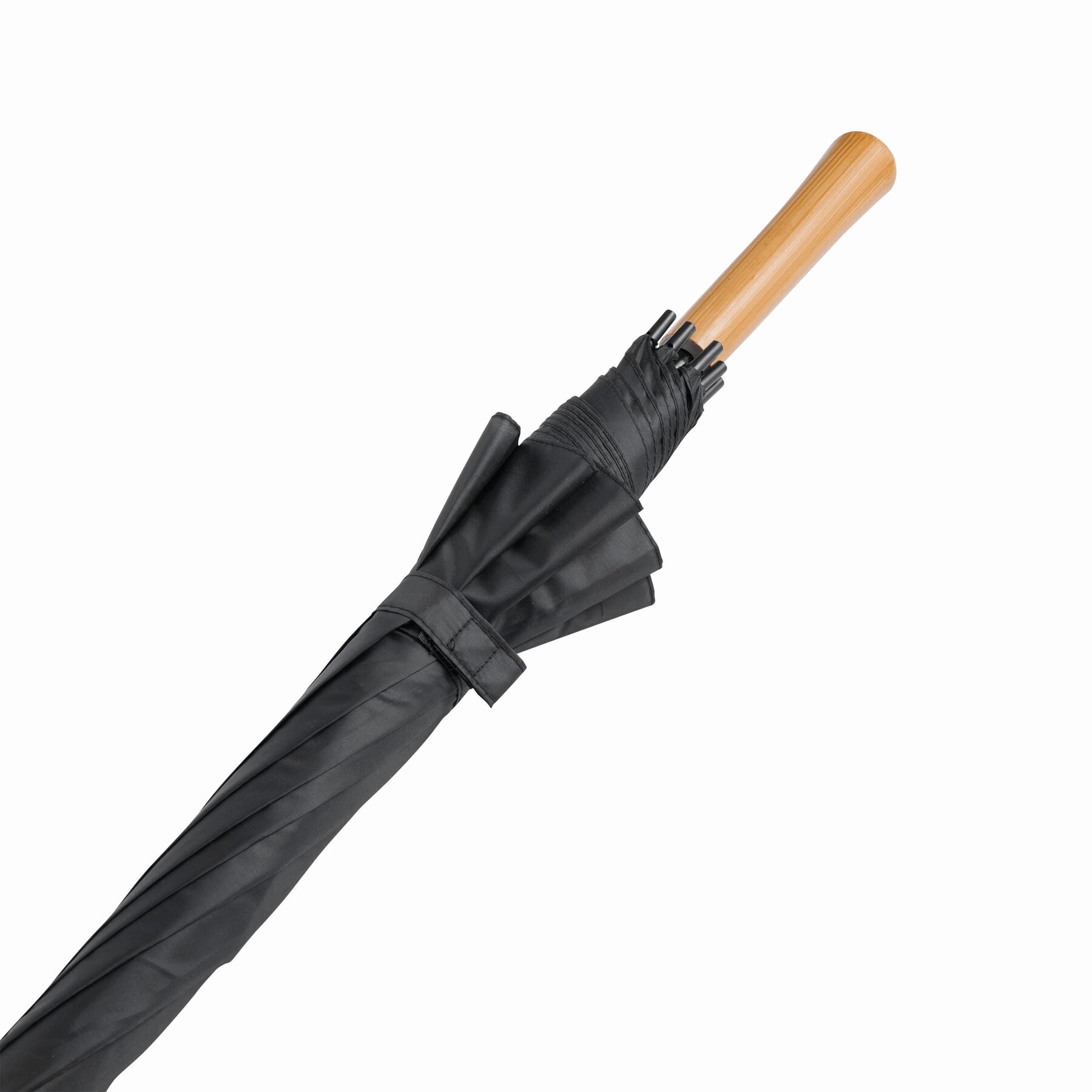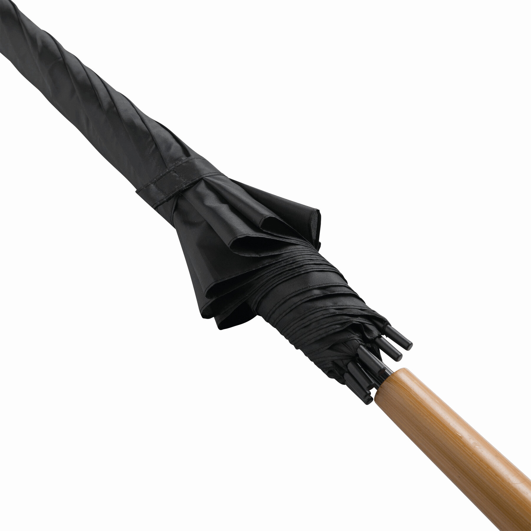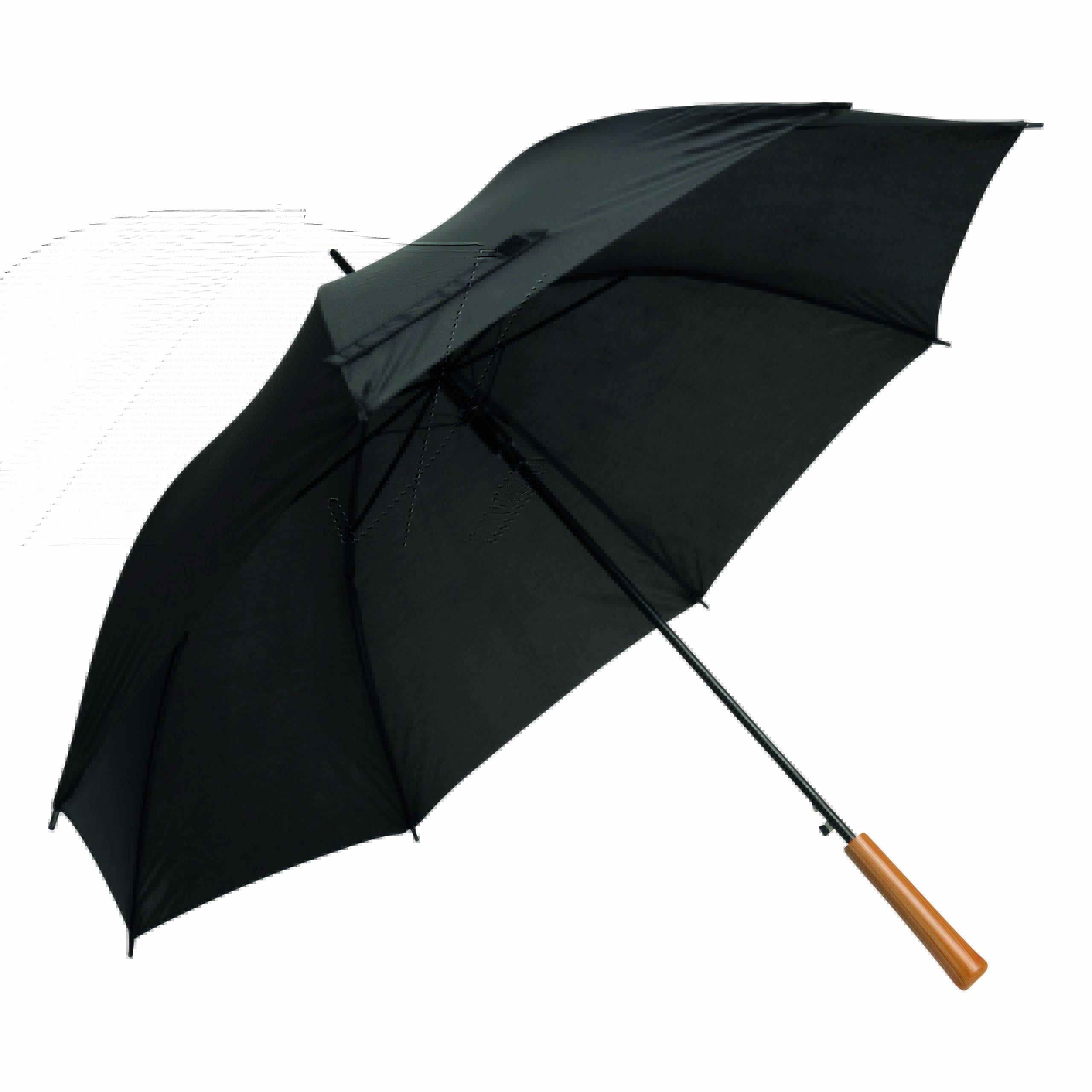 Automatyczny parasol LIMBO z metalową laską i szynami oraz plastikowymi kolcami dopasowanymi kolorystycznie, uchwyt z drewnopodobnym wykończeniem, poszycie poliestrowe, zamknięcie na rzep Velcro.