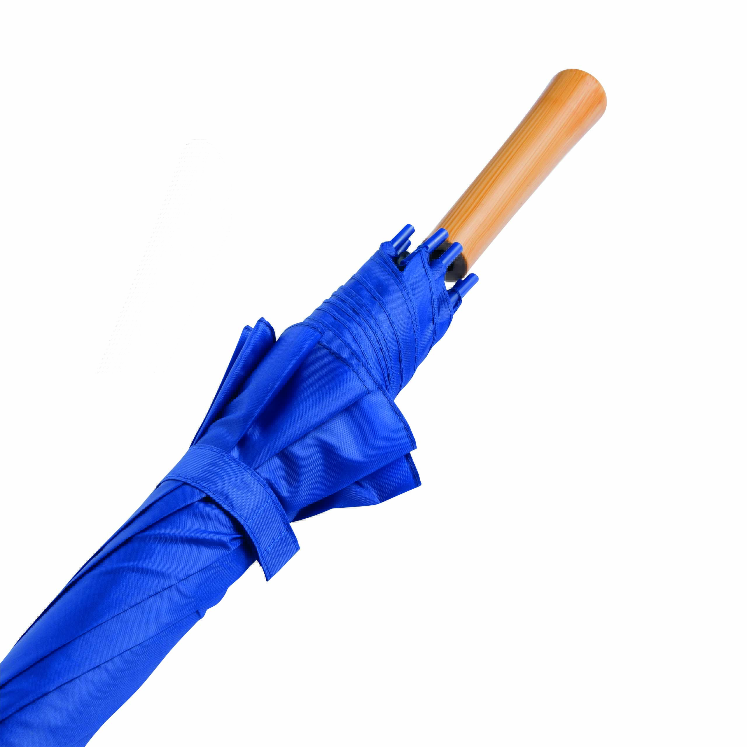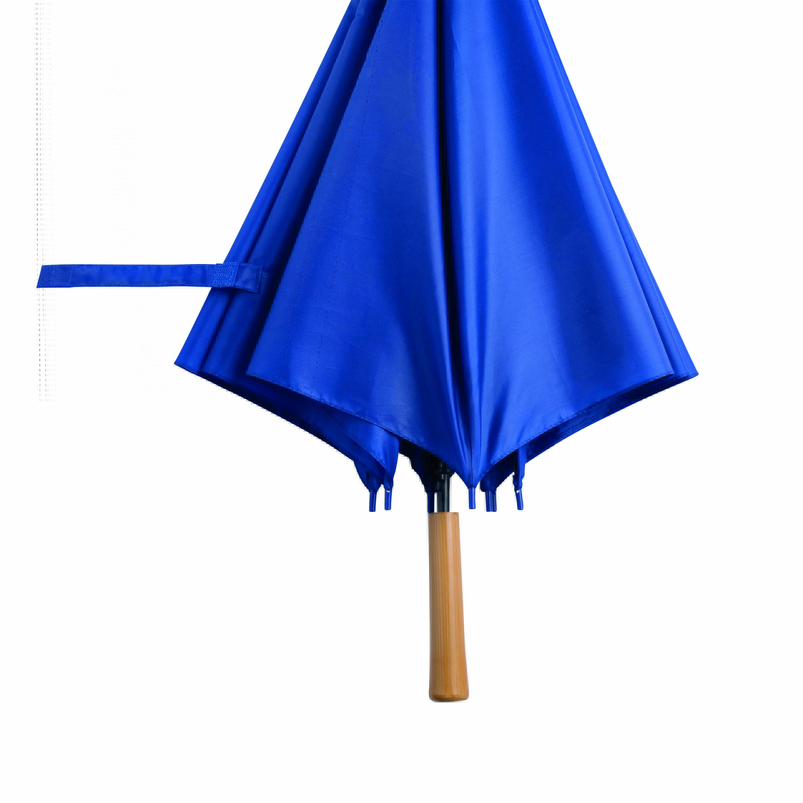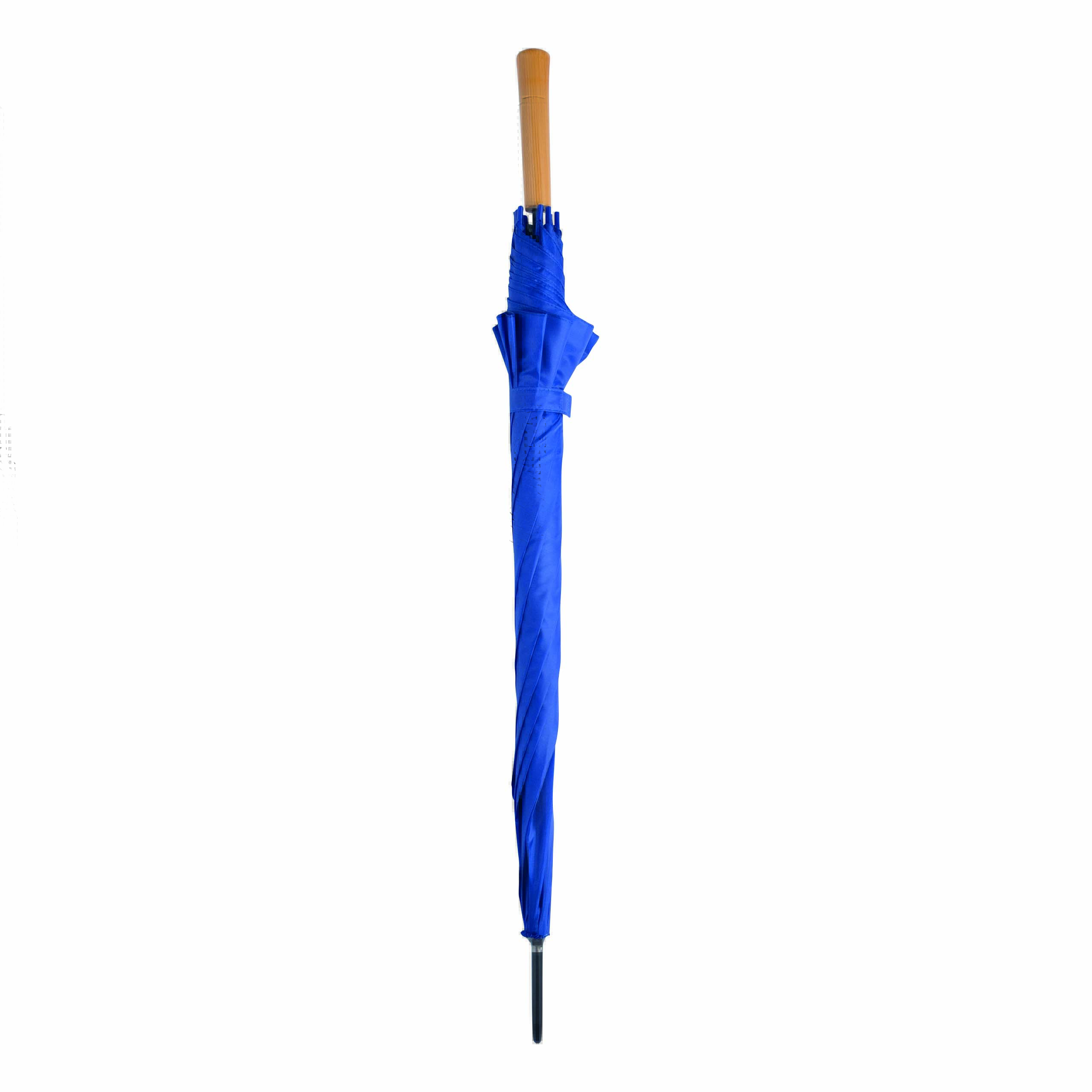 Automatyczny parasol LIMBO z metalową laską i szynami oraz plastikowymi kolcami dopasowanymi kolorystycznie, uchwyt z drewnopodobnym wykończeniem, poszycie poliestrowe, zamknięcie na rzep Velcro.