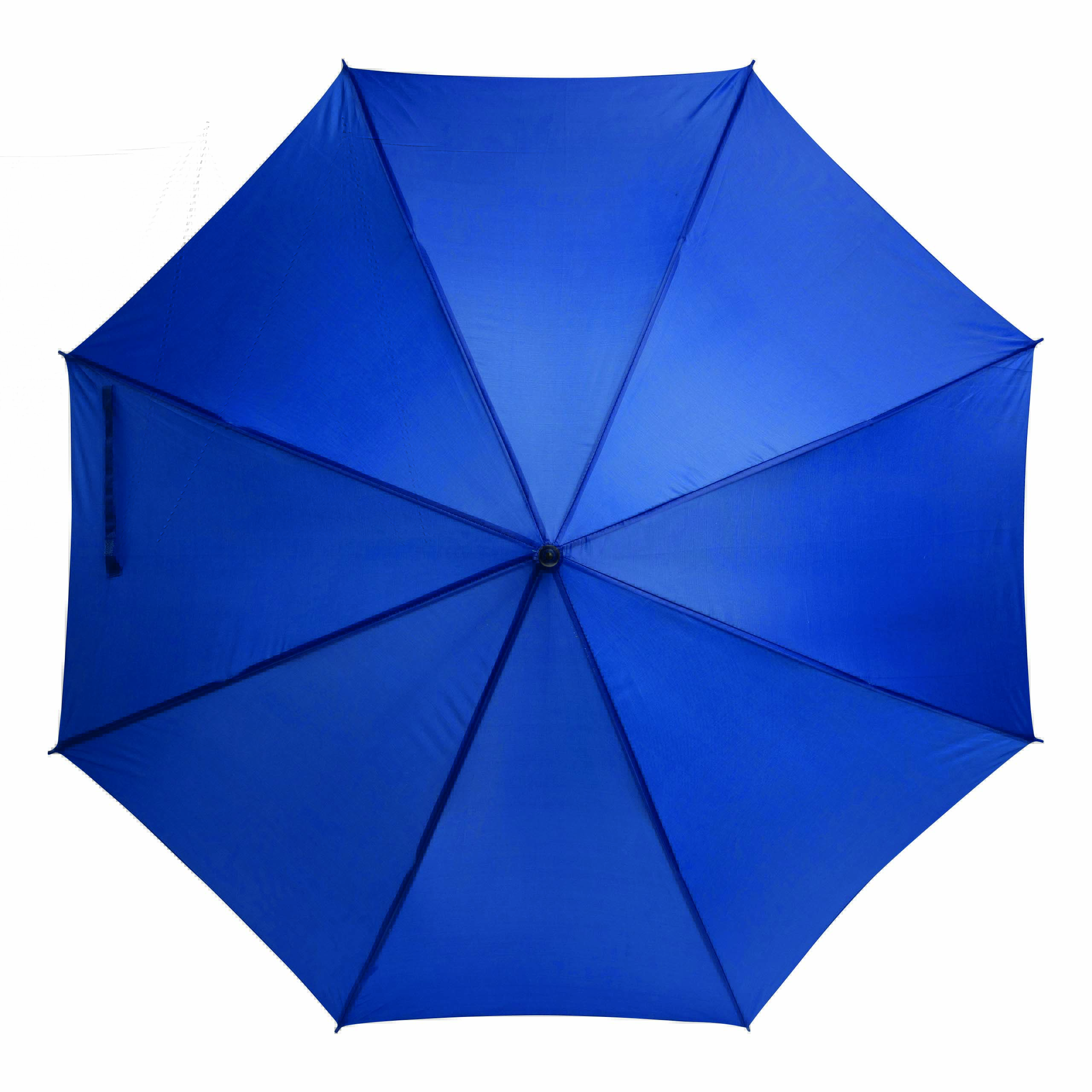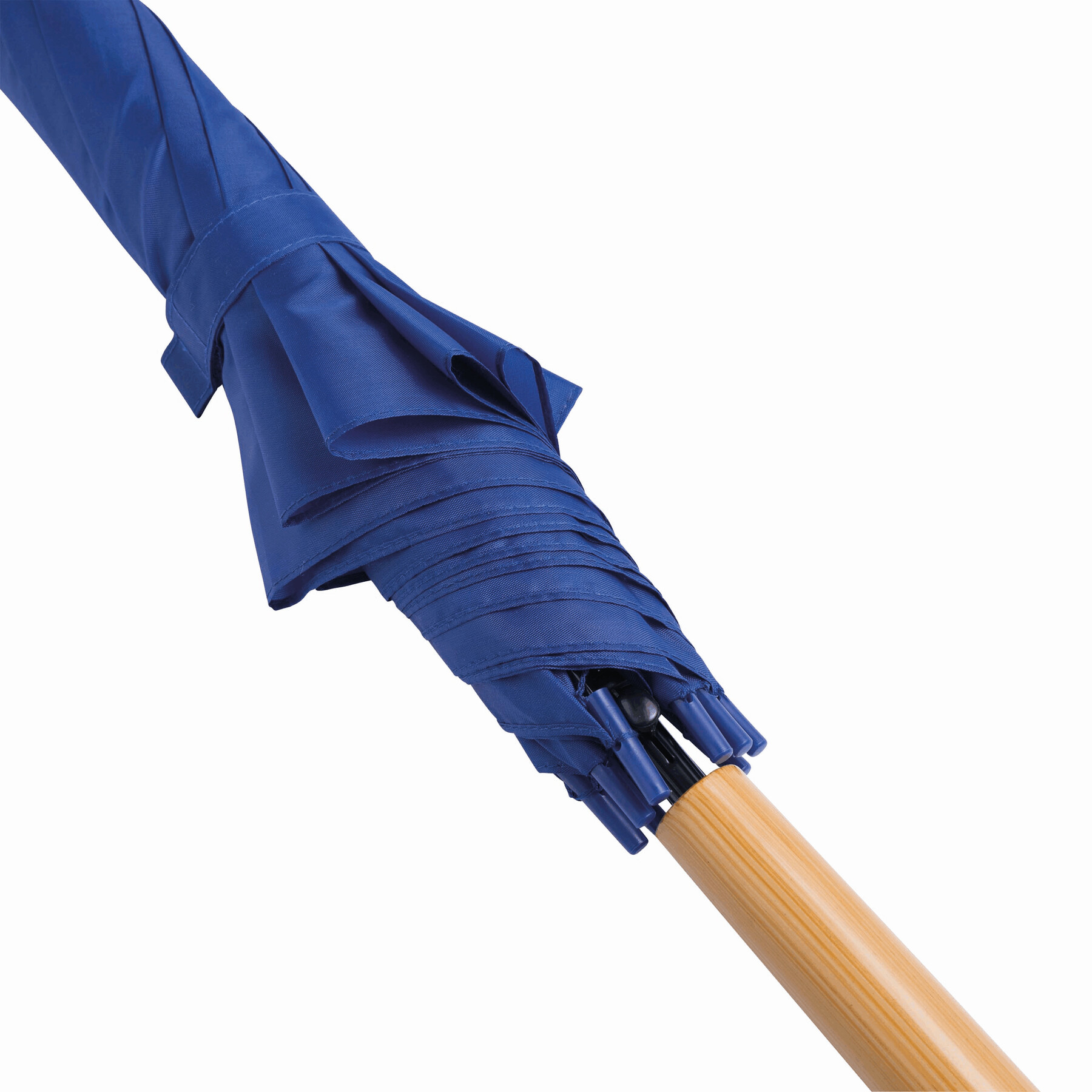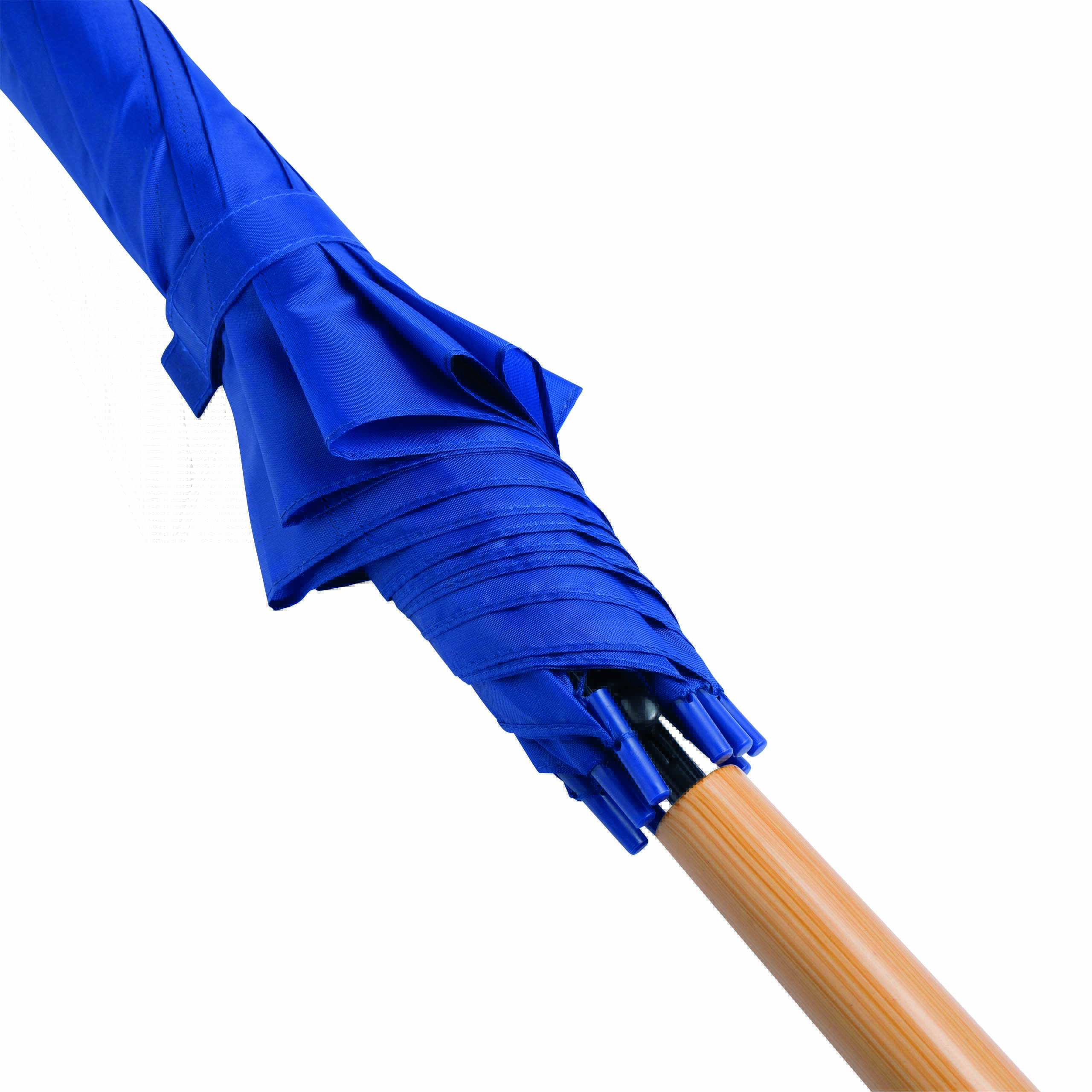 Automatyczny parasol LIMBO z metalową laską i szynami oraz plastikowymi kolcami dopasowanymi kolorystycznie, uchwyt z drewnopodobnym wykończeniem, poszycie poliestrowe, zamknięcie na rzep Velcro.