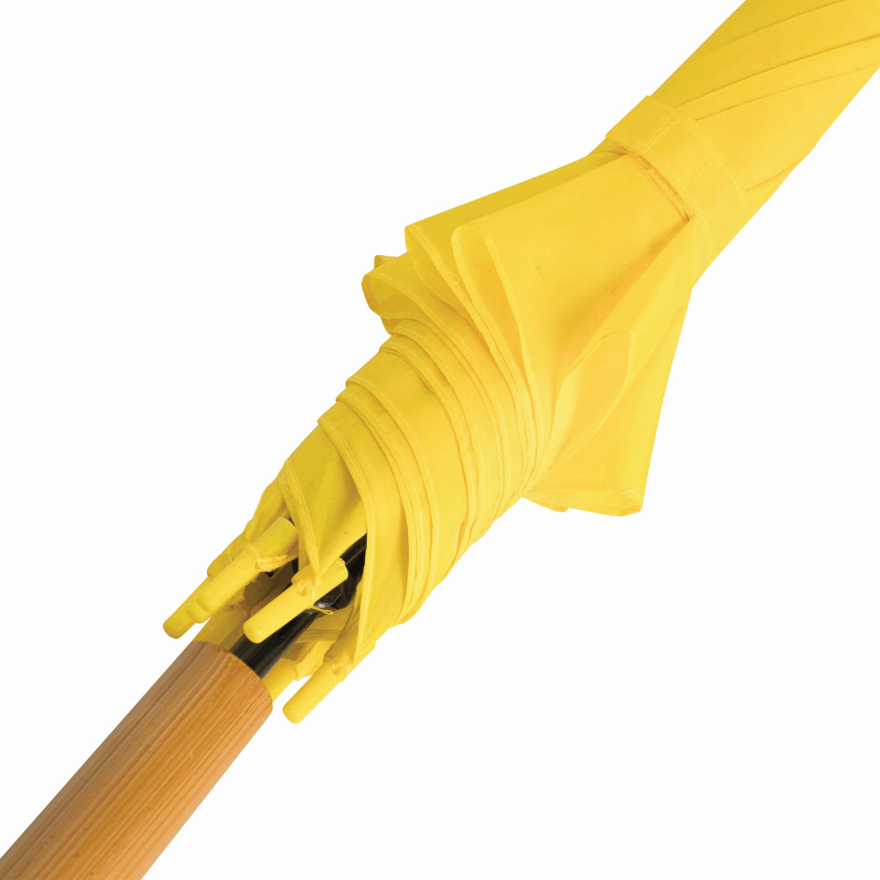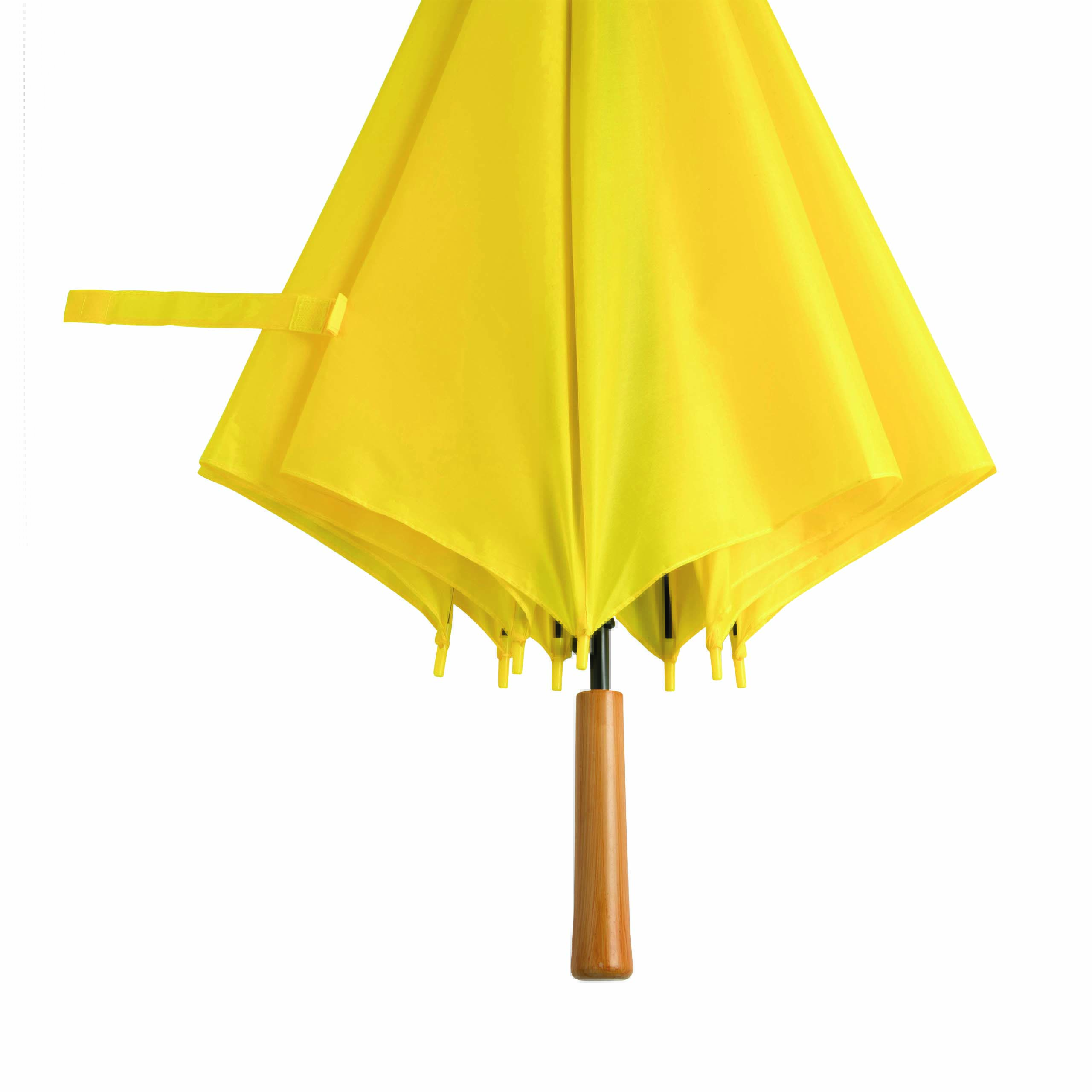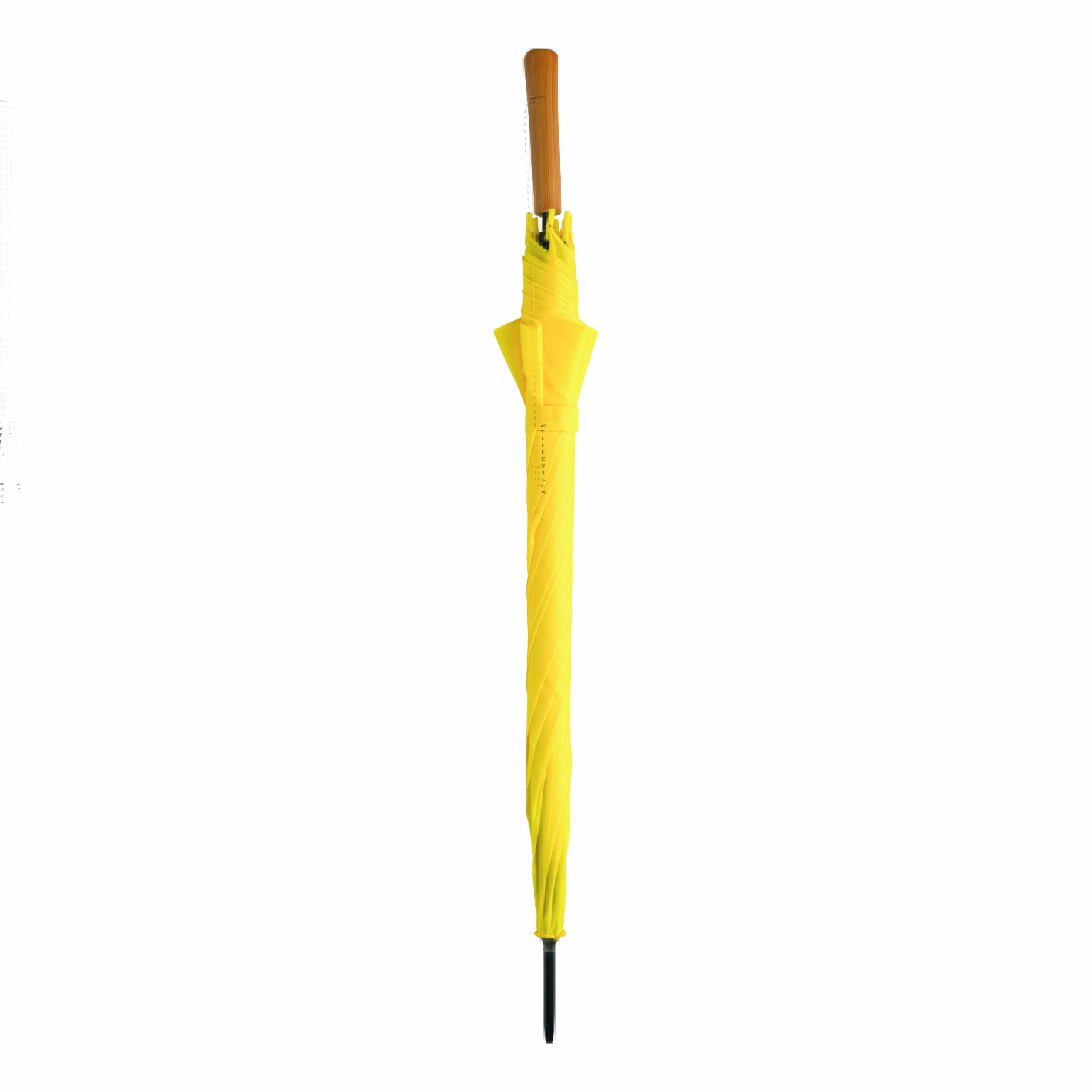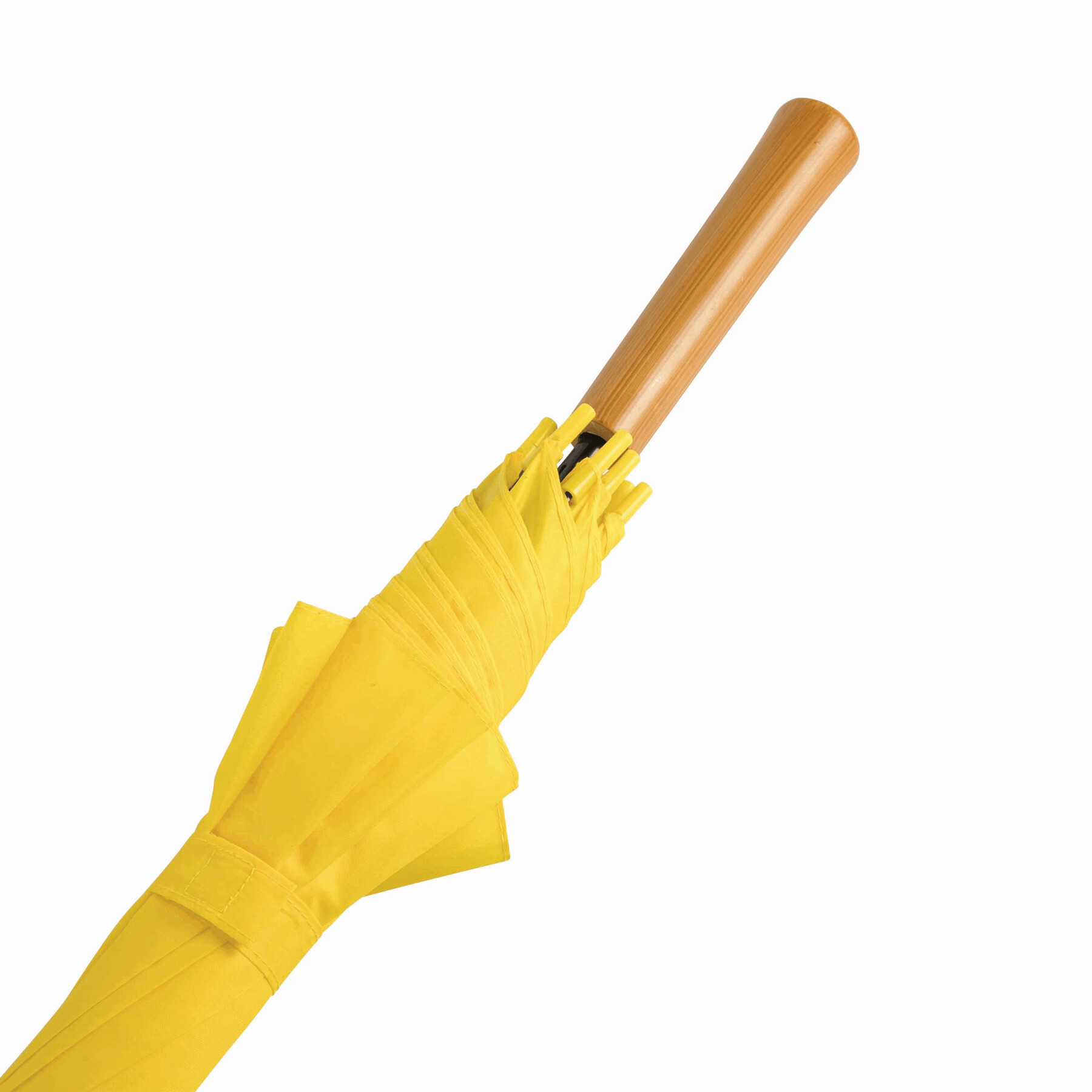 Automatyczny parasol LIMBO z metalową laską i szynami oraz plastikowymi kolcami dopasowanymi kolorystycznie, uchwyt z drewnopodobnym wykończeniem, poszycie poliestrowe, zamknięcie na rzep Velcro.