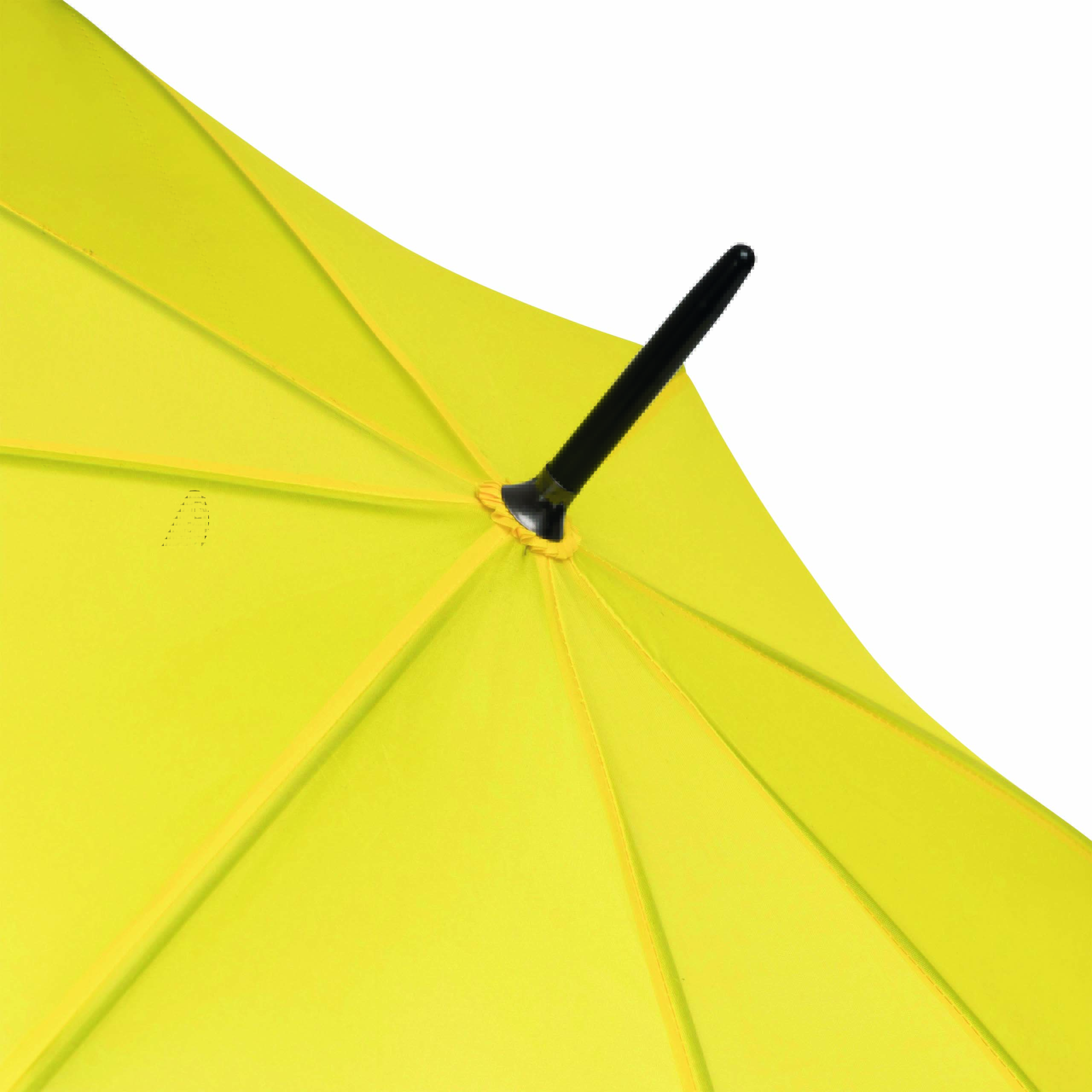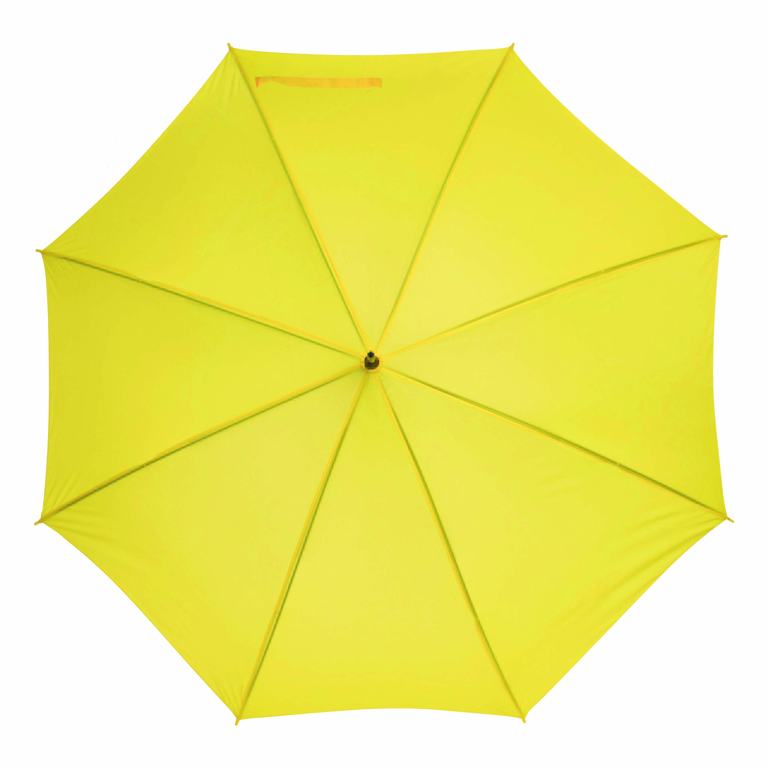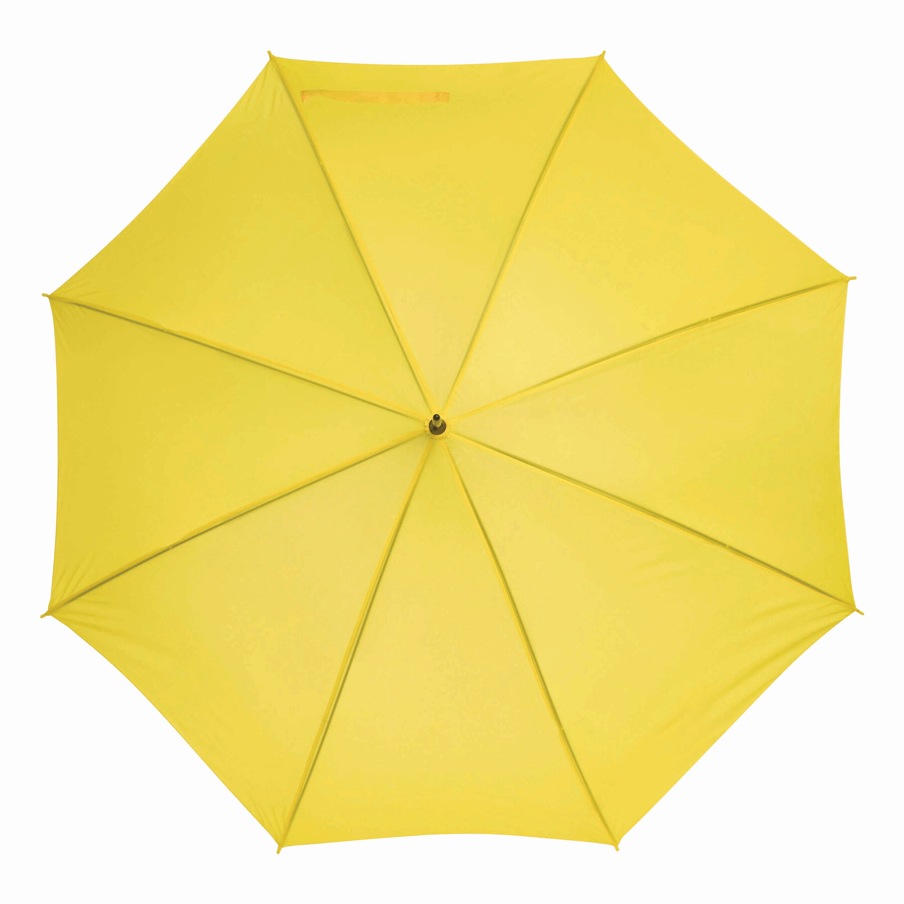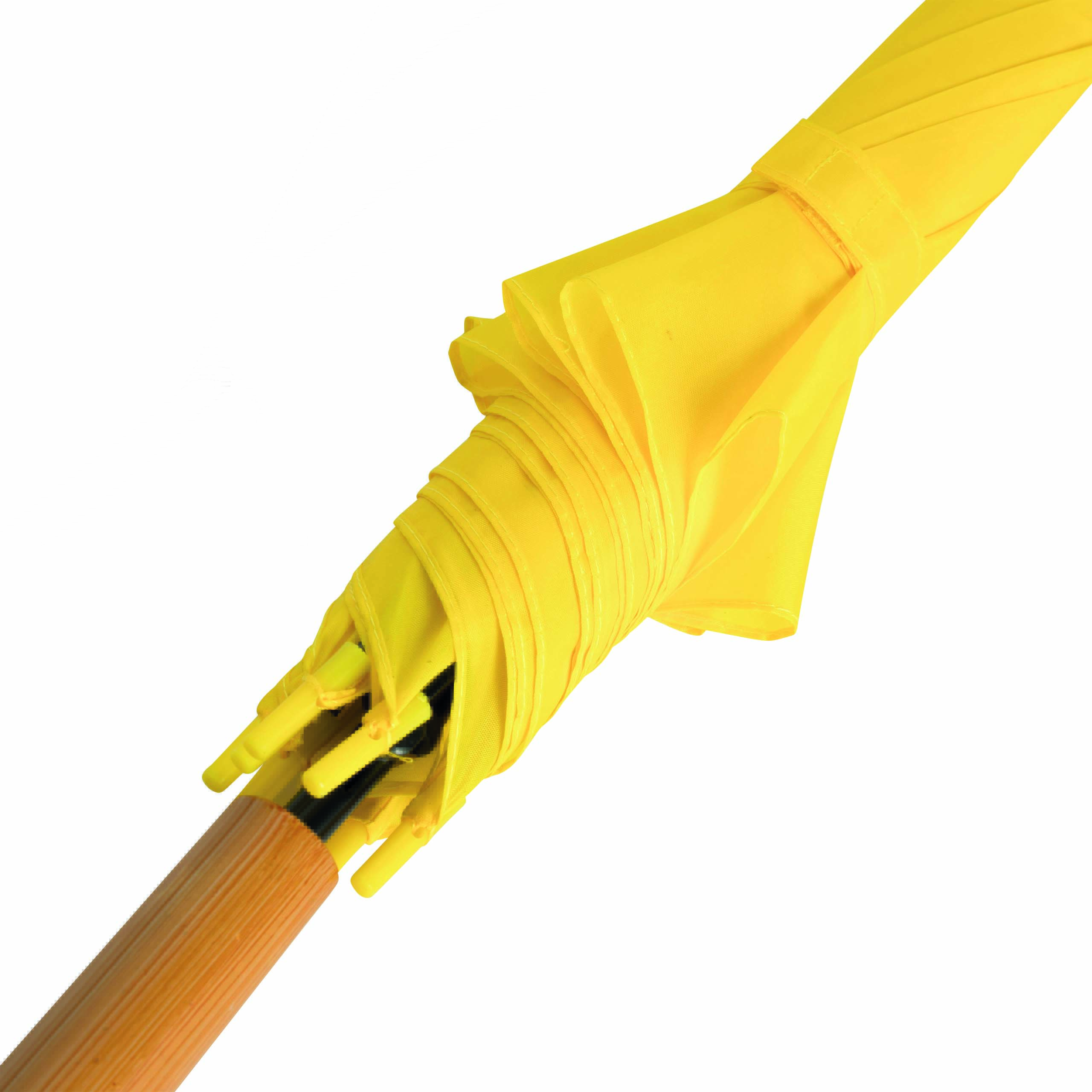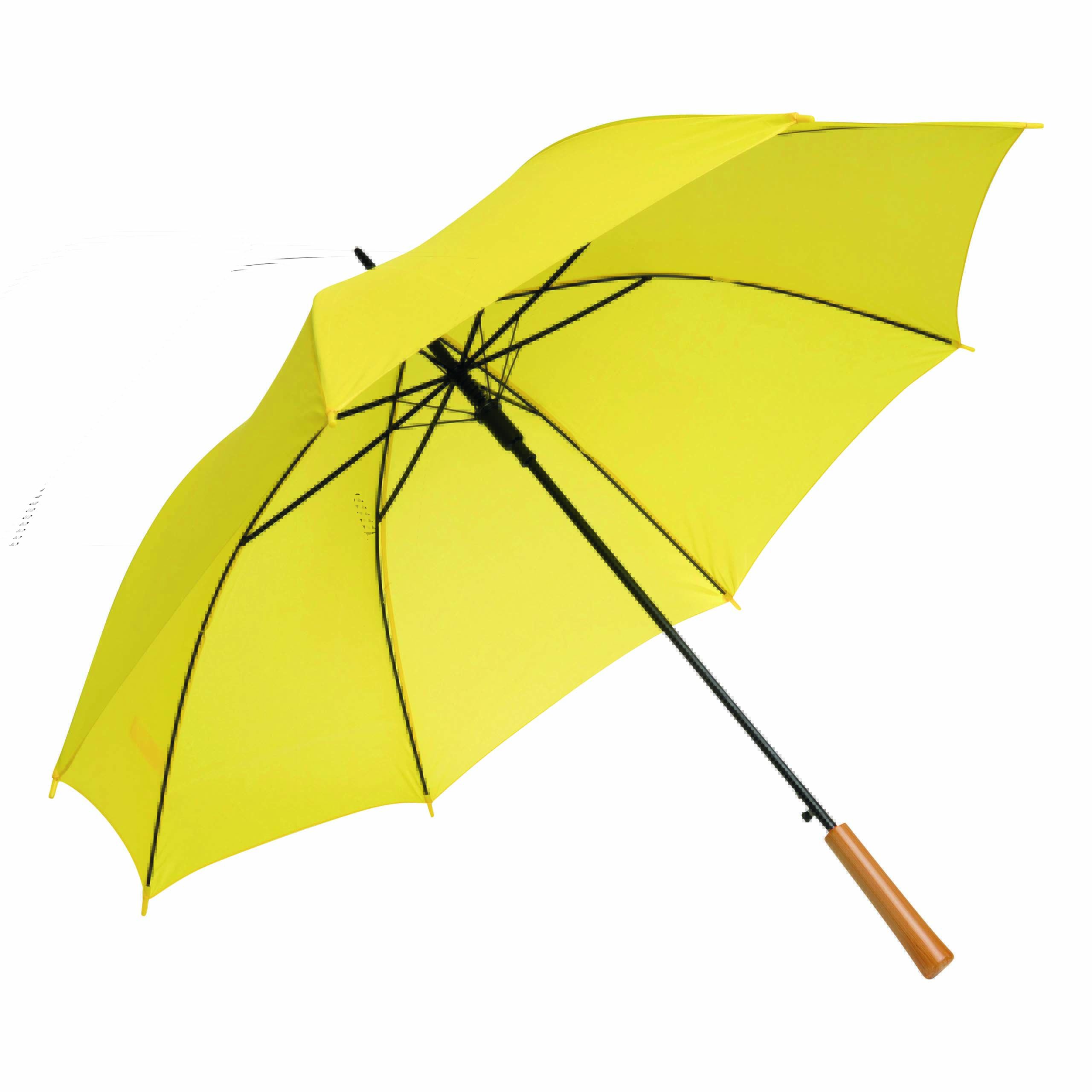 Automatyczny parasol LIMBO z metalową laską i szynami oraz plastikowymi kolcami dopasowanymi kolorystycznie, uchwyt z drewnopodobnym wykończeniem, poszycie poliestrowe, zamknięcie na rzep Velcro.