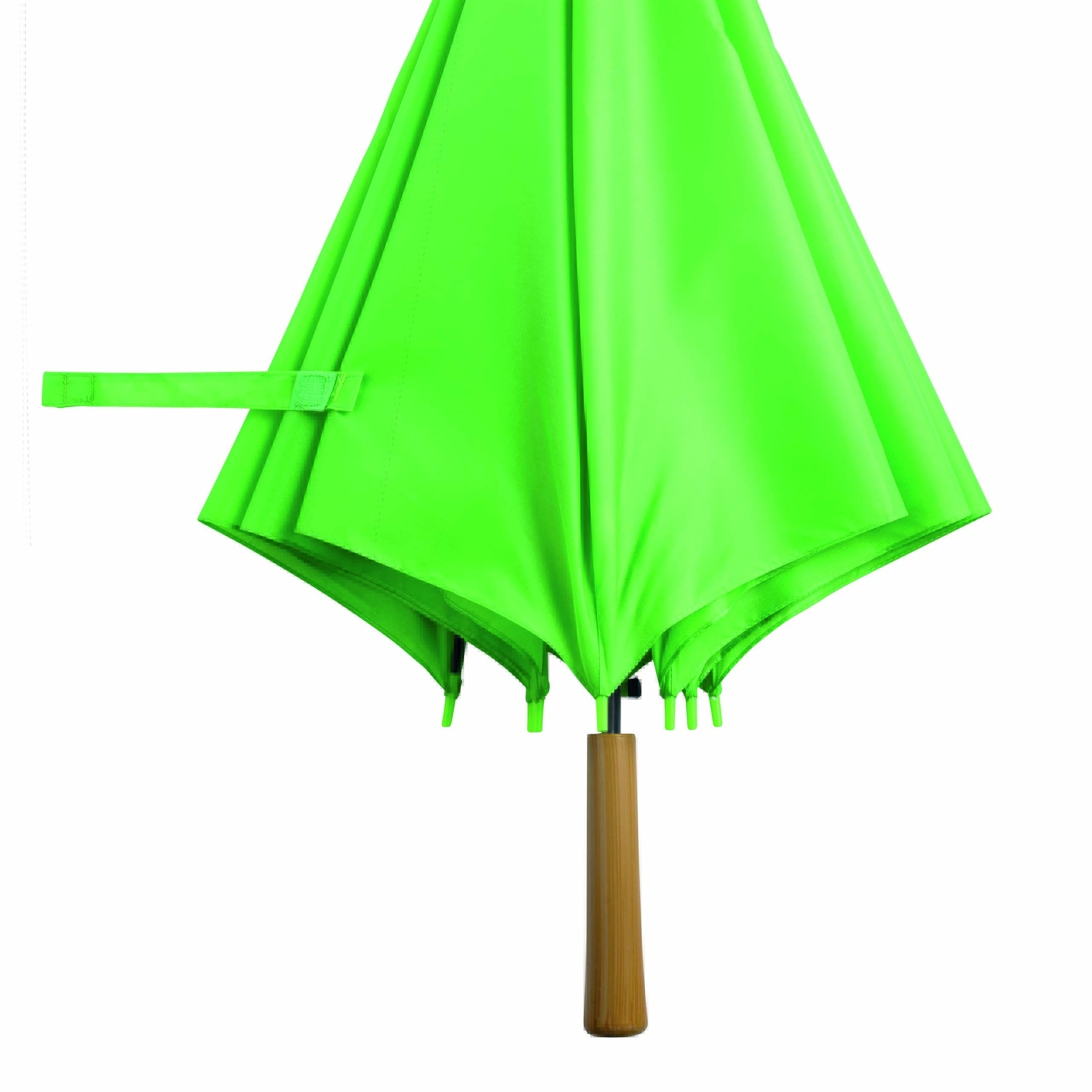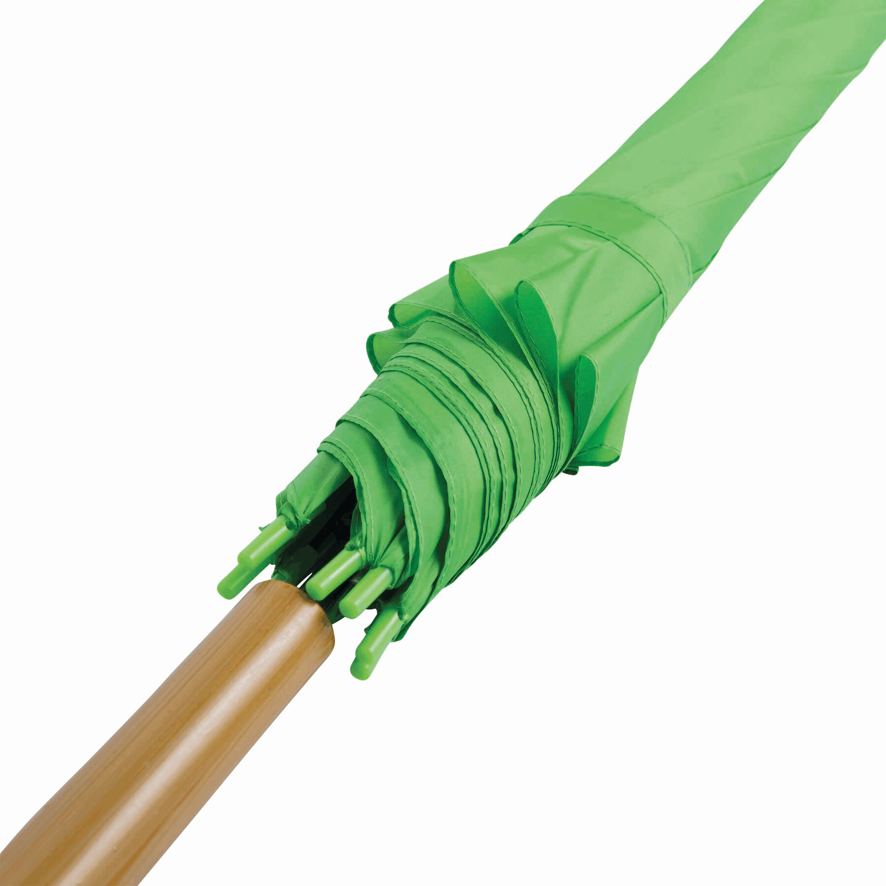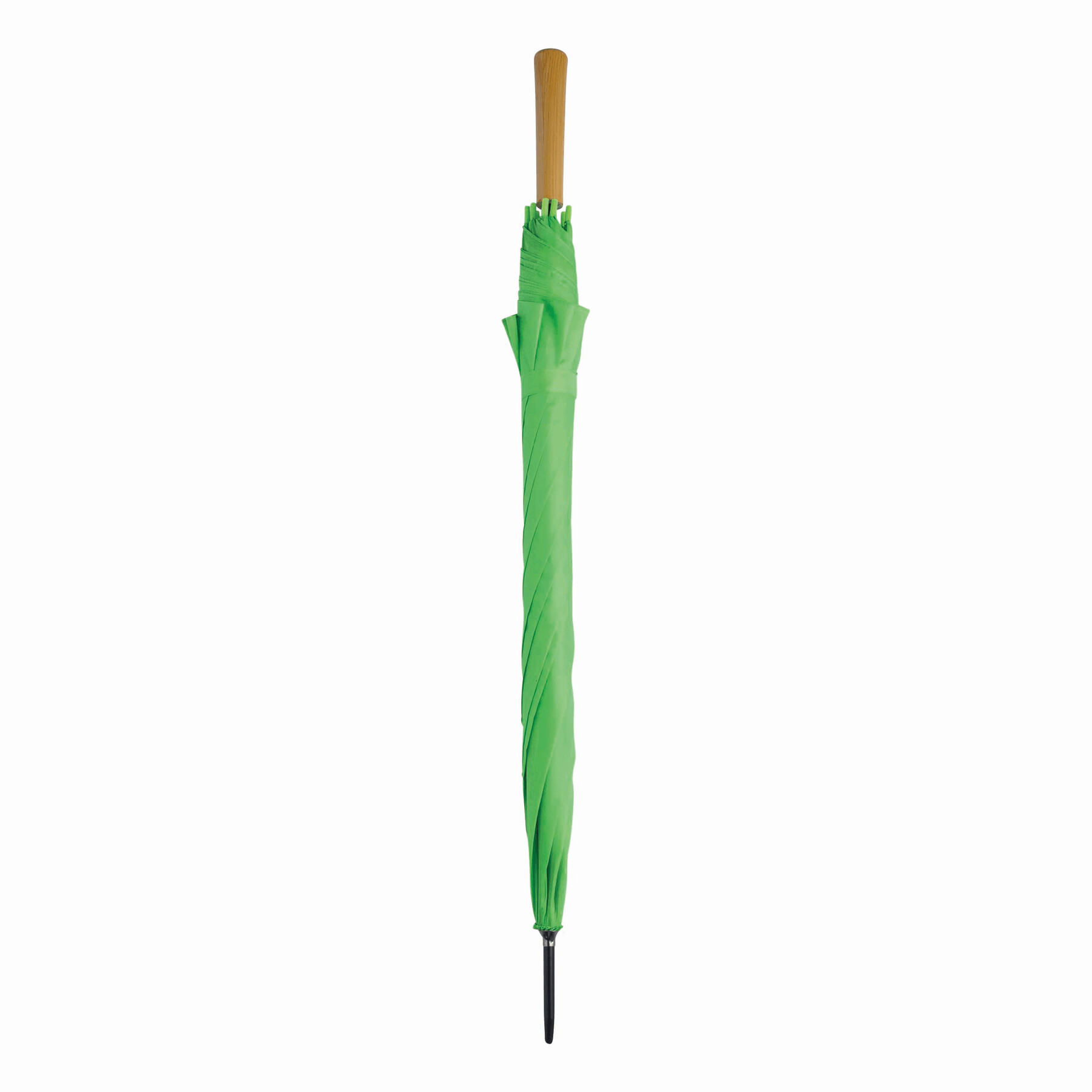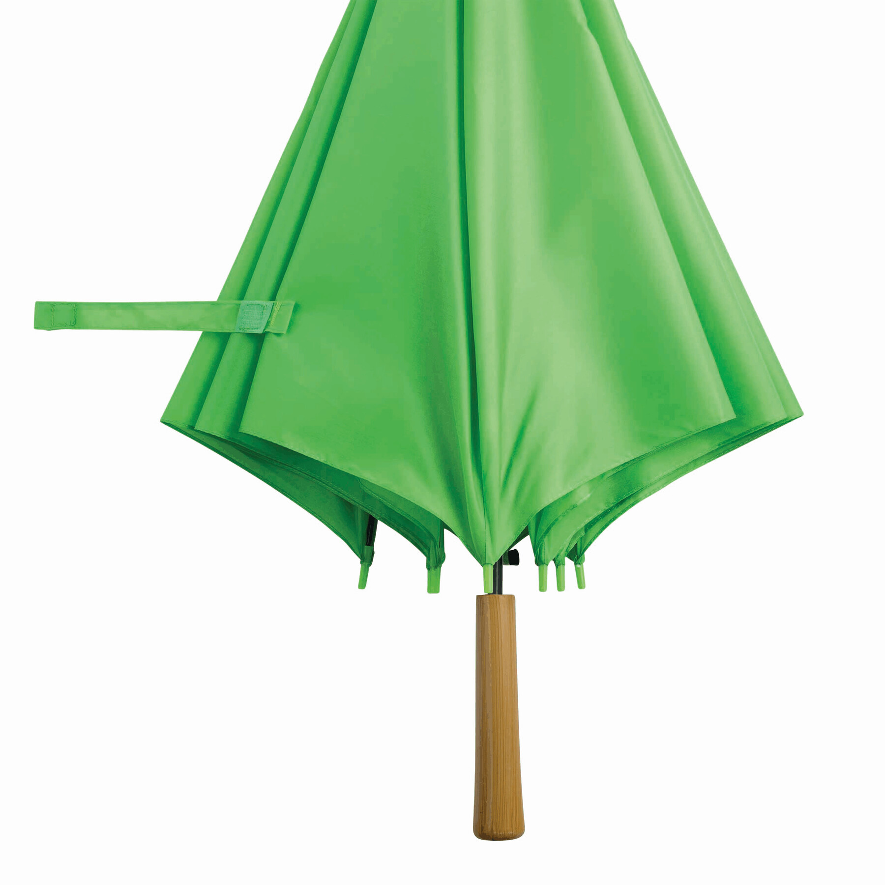 Automatyczny parasol LIMBO z metalową laską i szynami oraz plastikowymi kolcami dopasowanymi kolorystycznie, uchwyt z drewnopodobnym wykończeniem, poszycie poliestrowe, zamknięcie na rzep Velcro.