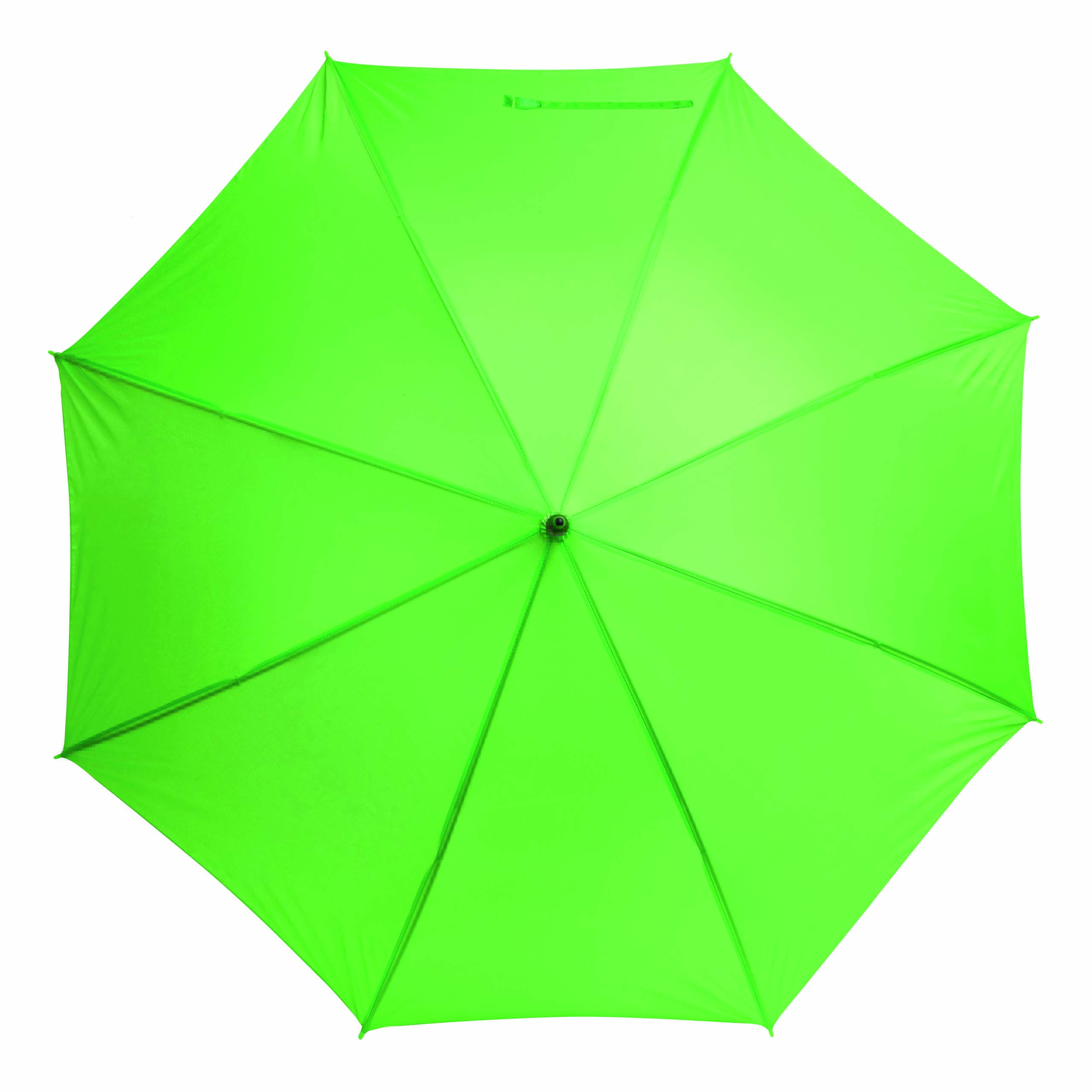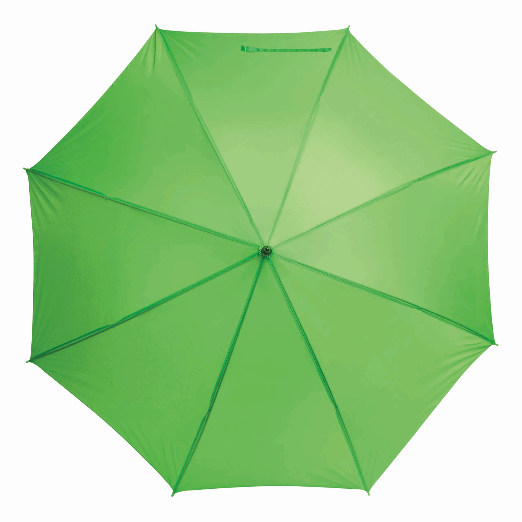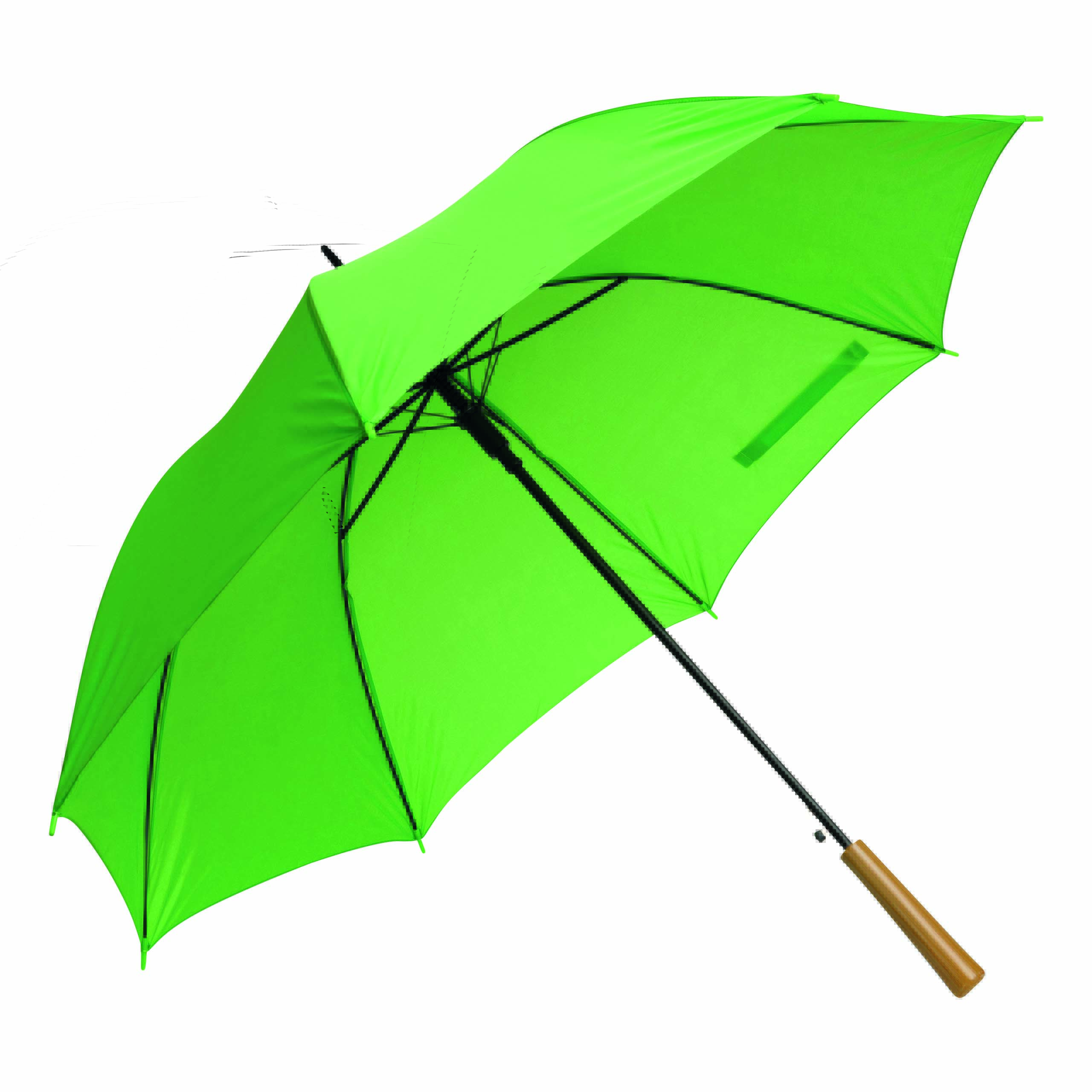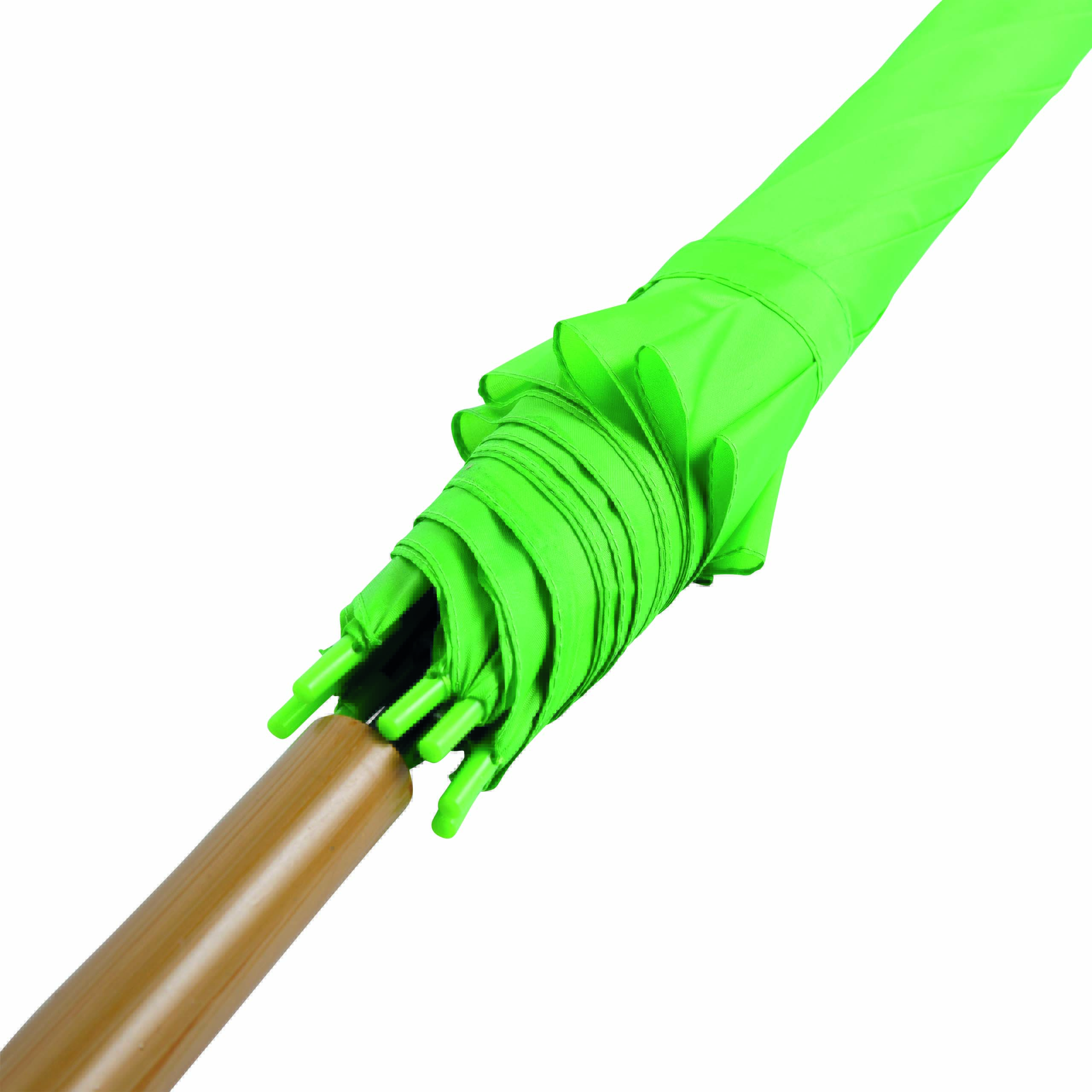 Automatyczny parasol LIMBO z metalową laską i szynami oraz plastikowymi kolcami dopasowanymi kolorystycznie, uchwyt z drewnopodobnym wykończeniem, poszycie poliestrowe, zamknięcie na rzep Velcro.