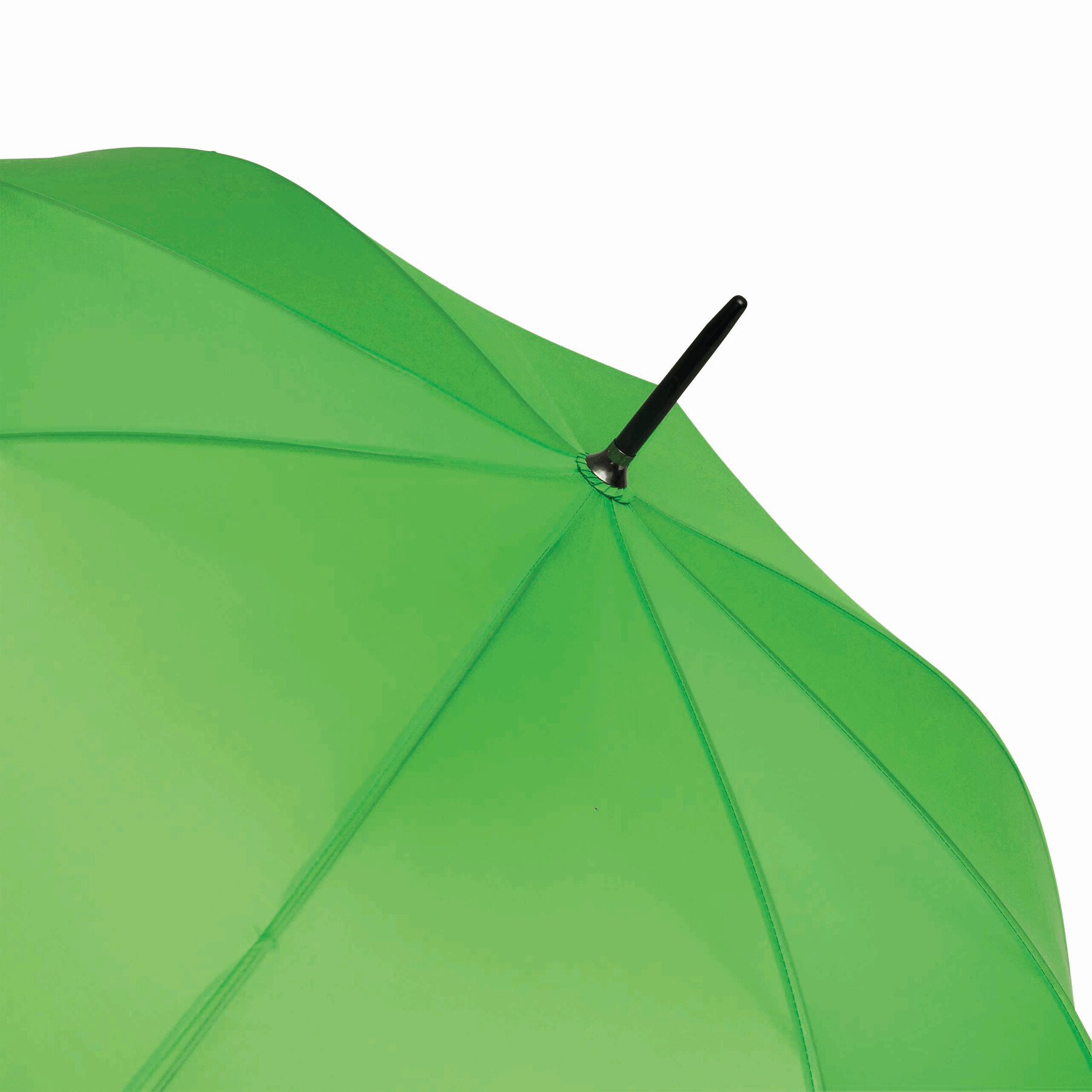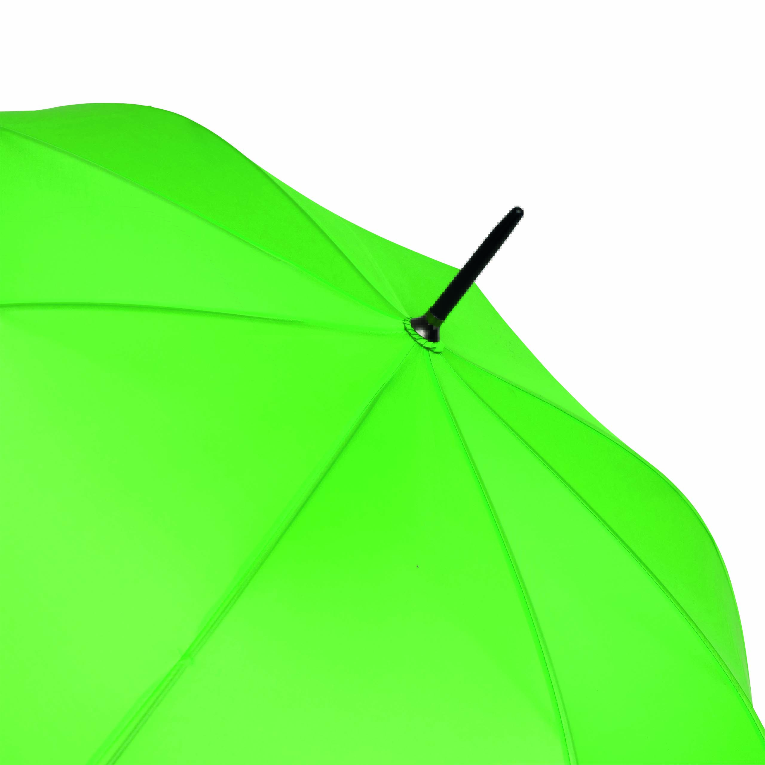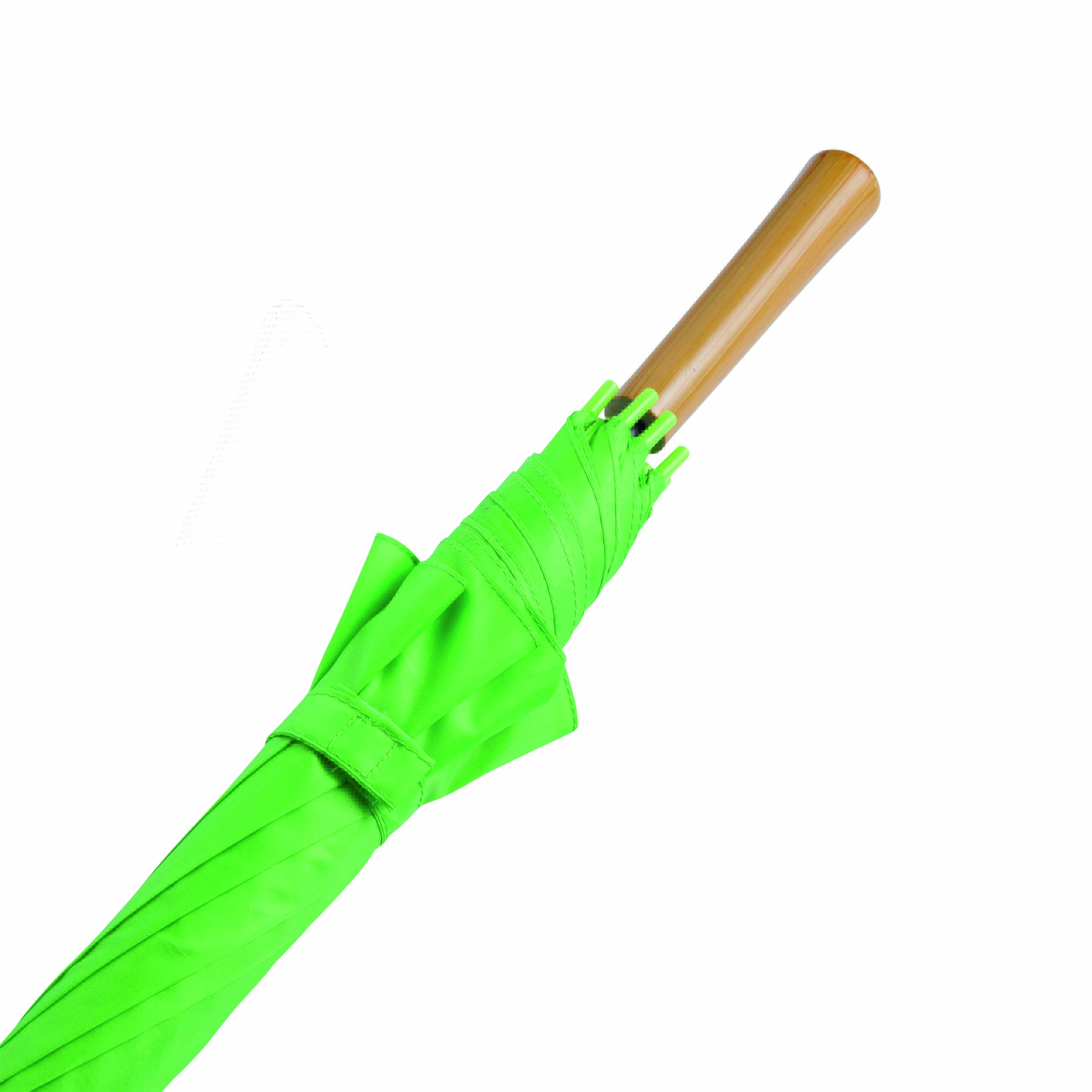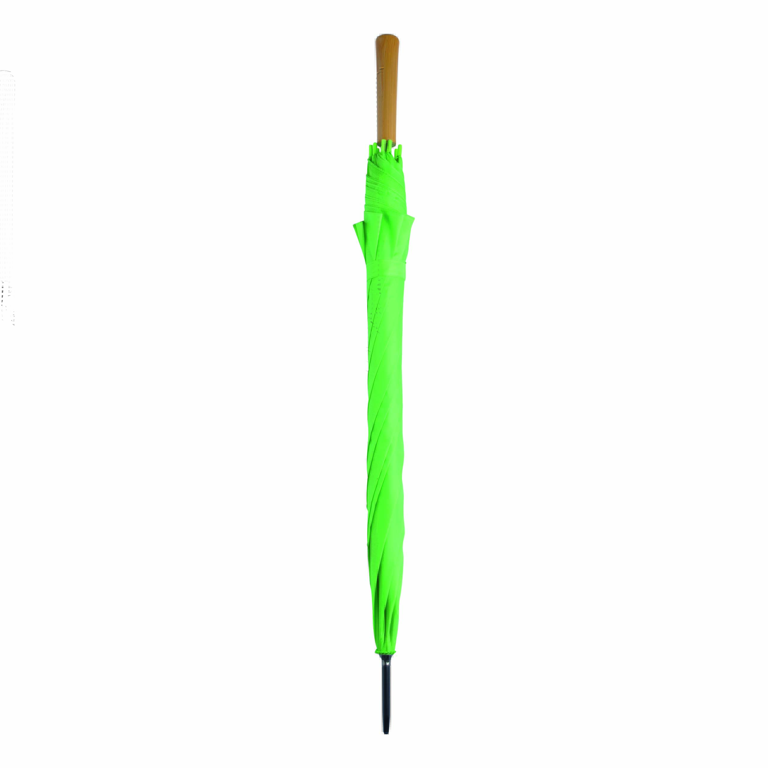 Automatyczny parasol LIMBO z metalową laską i szynami oraz plastikowymi kolcami dopasowanymi kolorystycznie, uchwyt z drewnopodobnym wykończeniem, poszycie poliestrowe, zamknięcie na rzep Velcro.