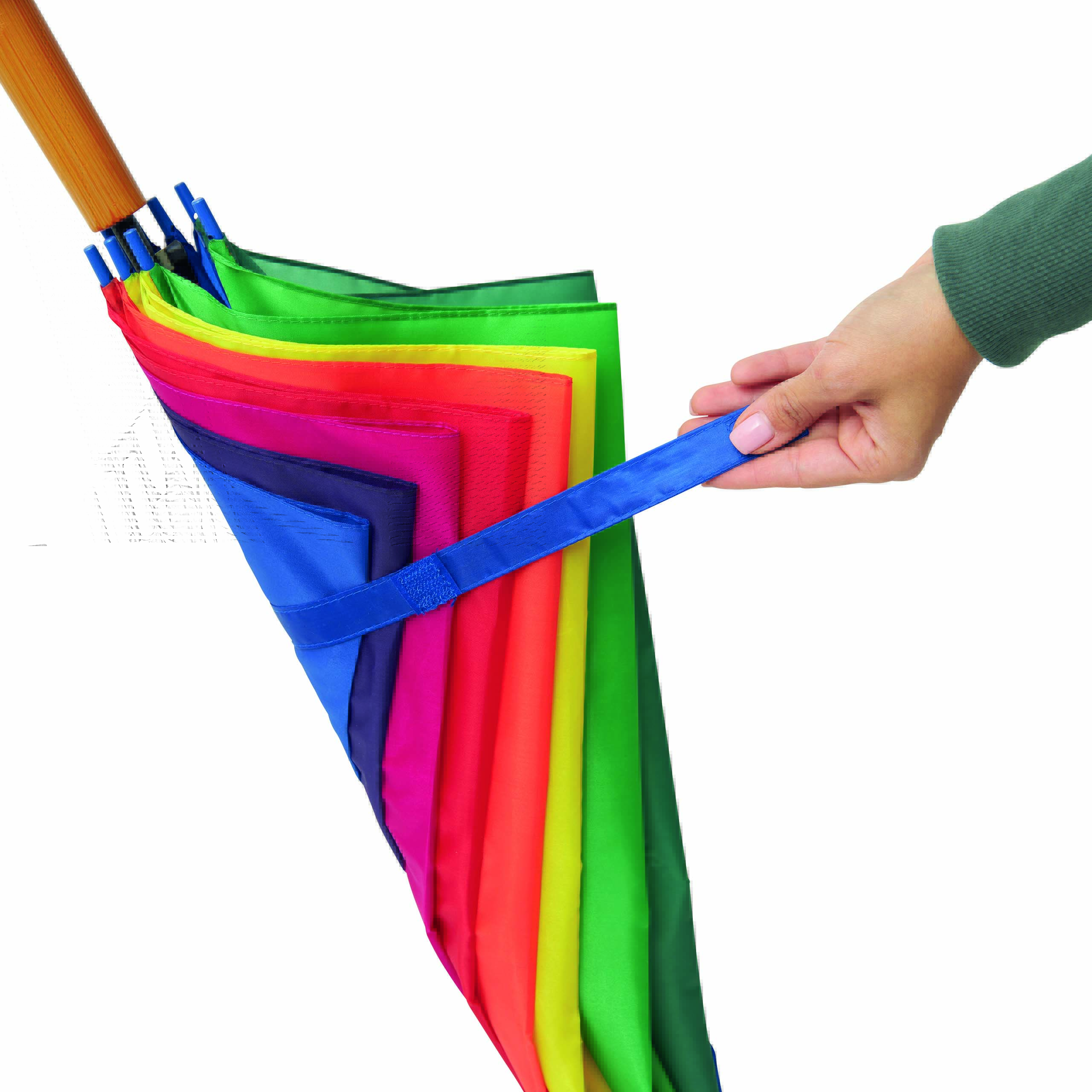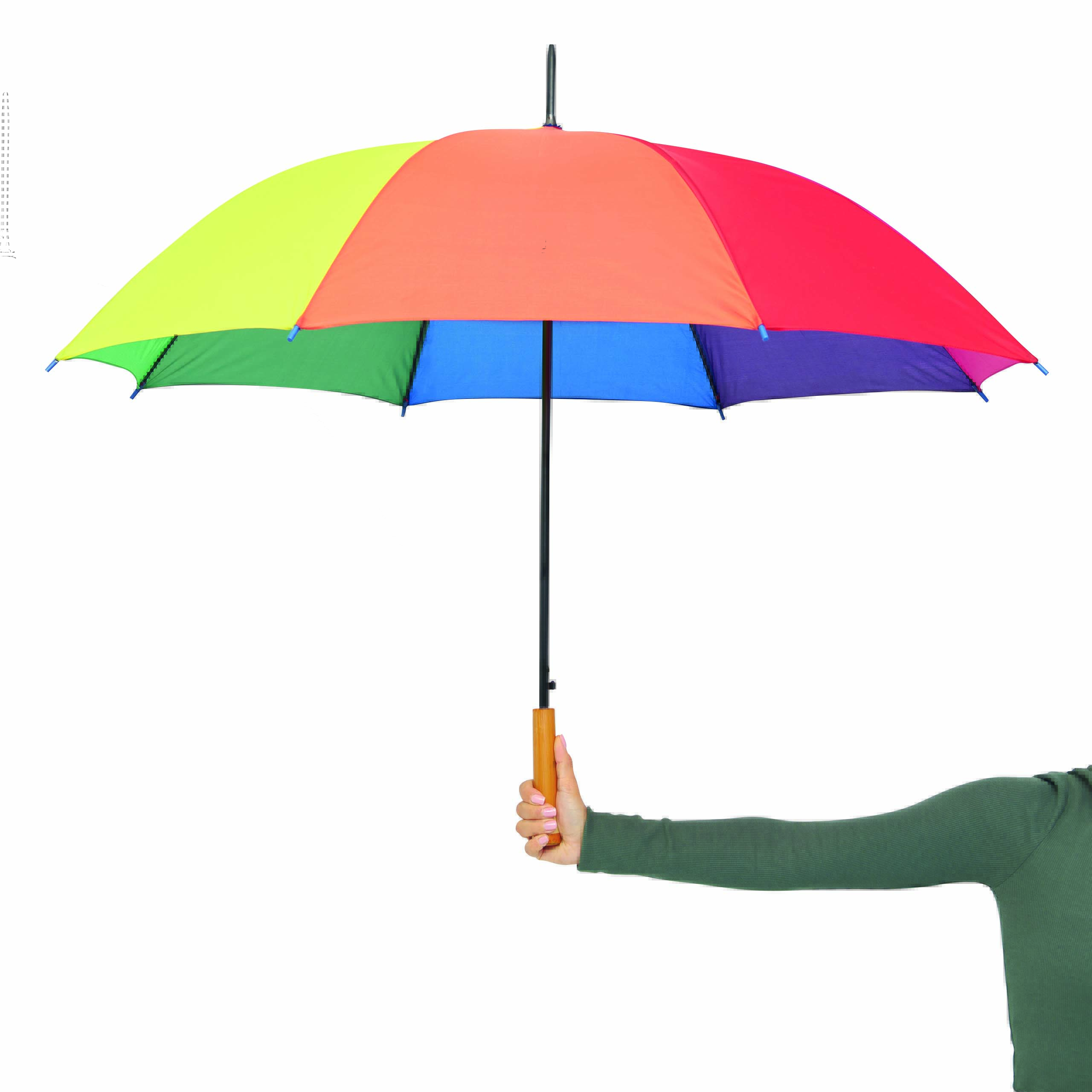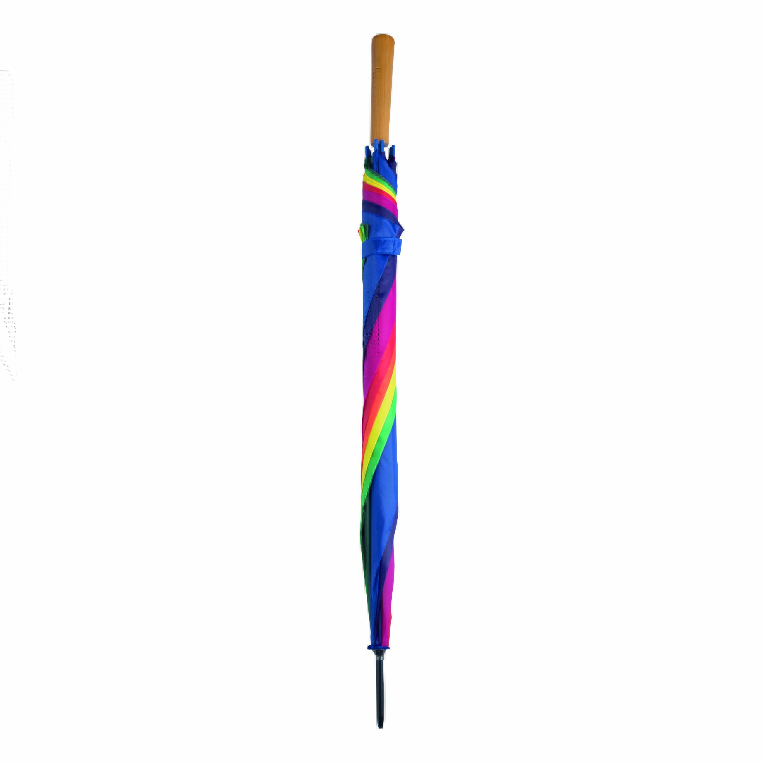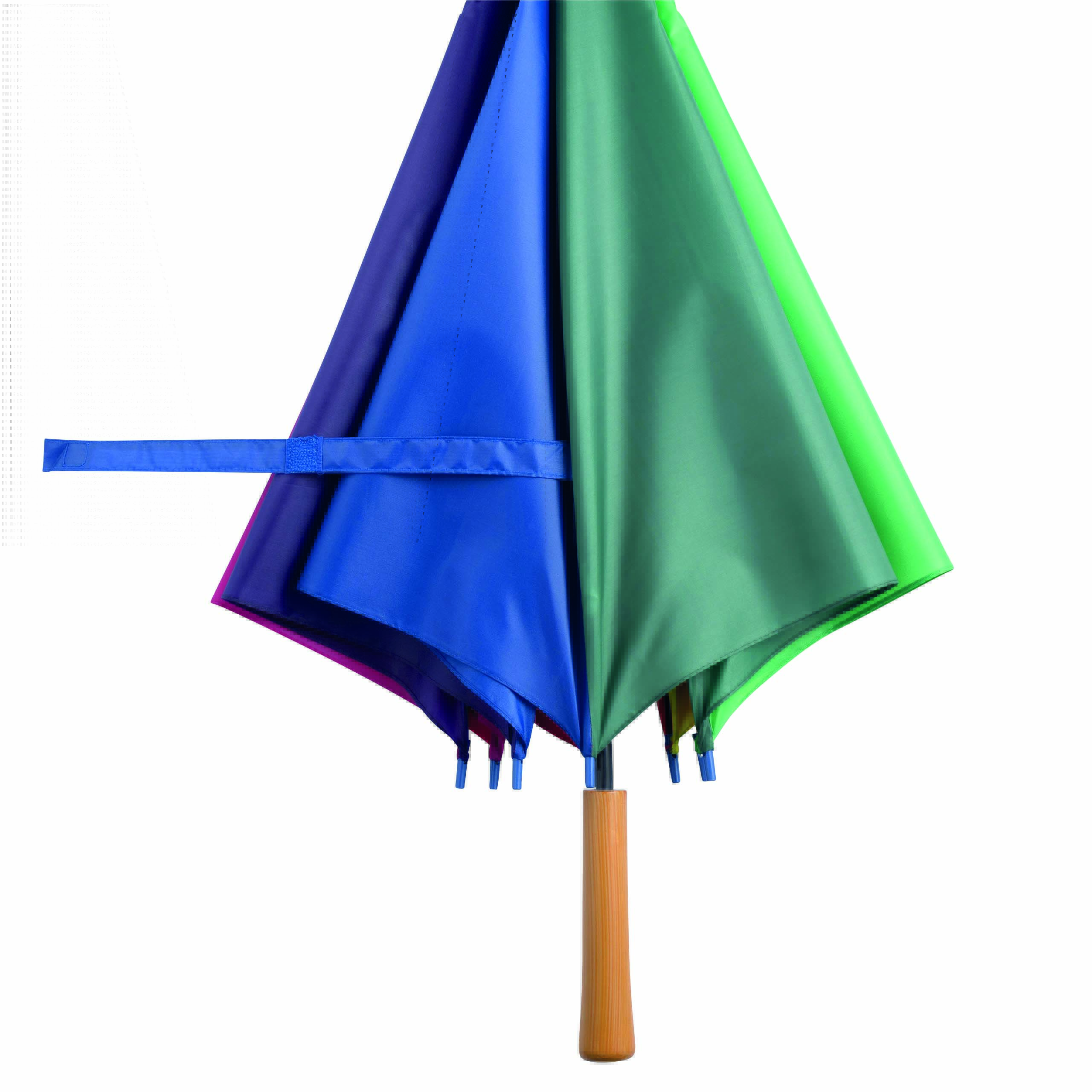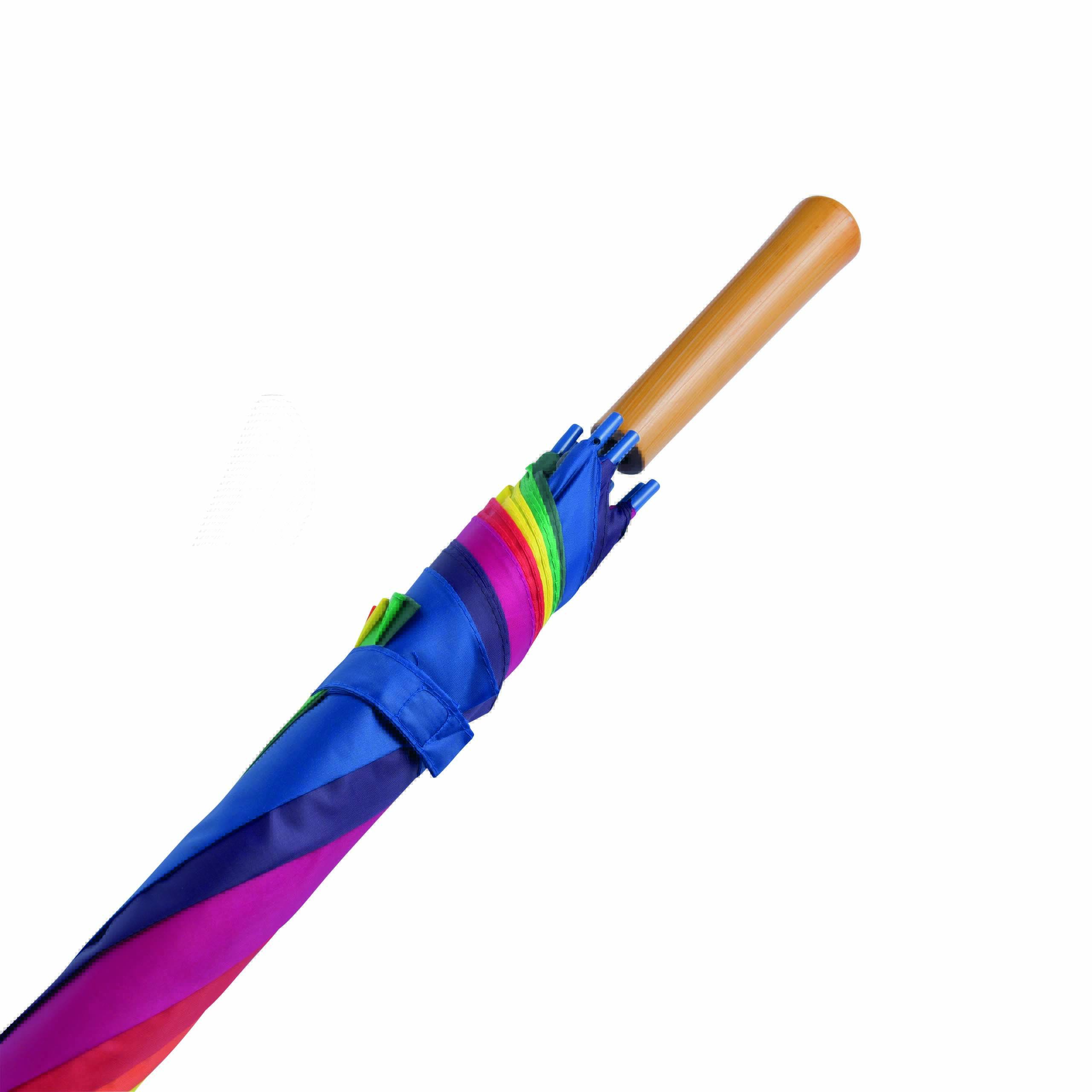 Automatyczny parasol LIMBO z metalową laską i szynami oraz plastikowymi kolcami dopasowanymi kolorystycznie, uchwyt z drewnopodobnym wykończeniem, poszycie poliestrowe, zamknięcie na rzep Velcro.