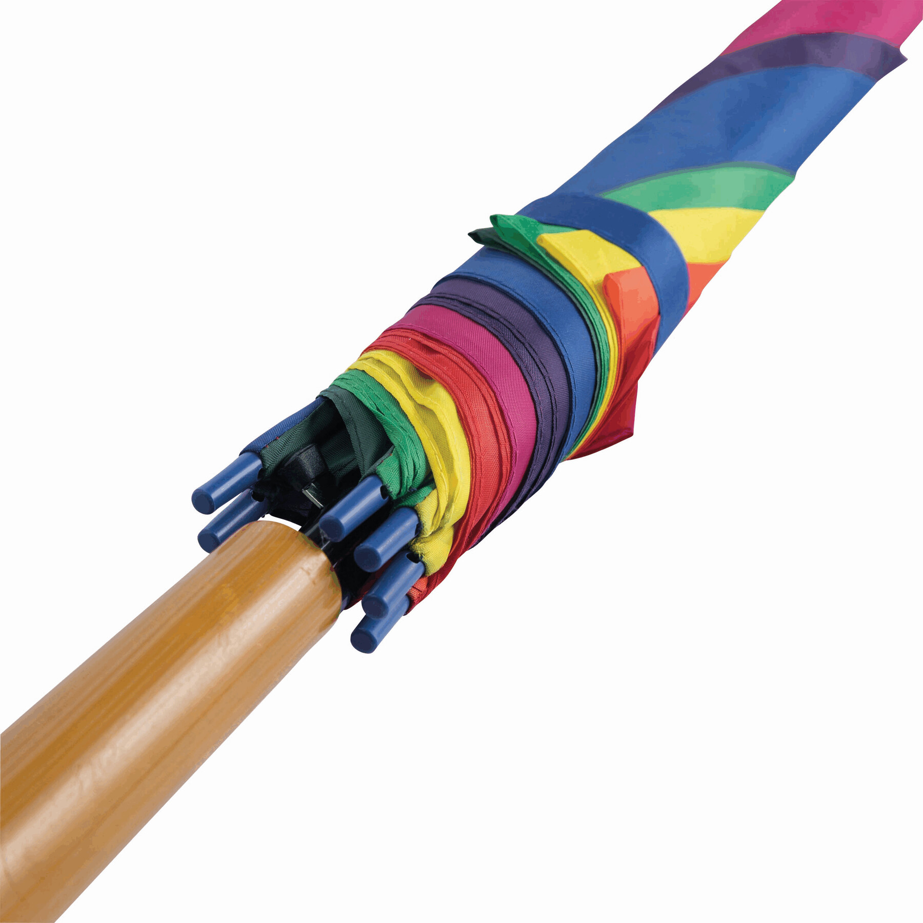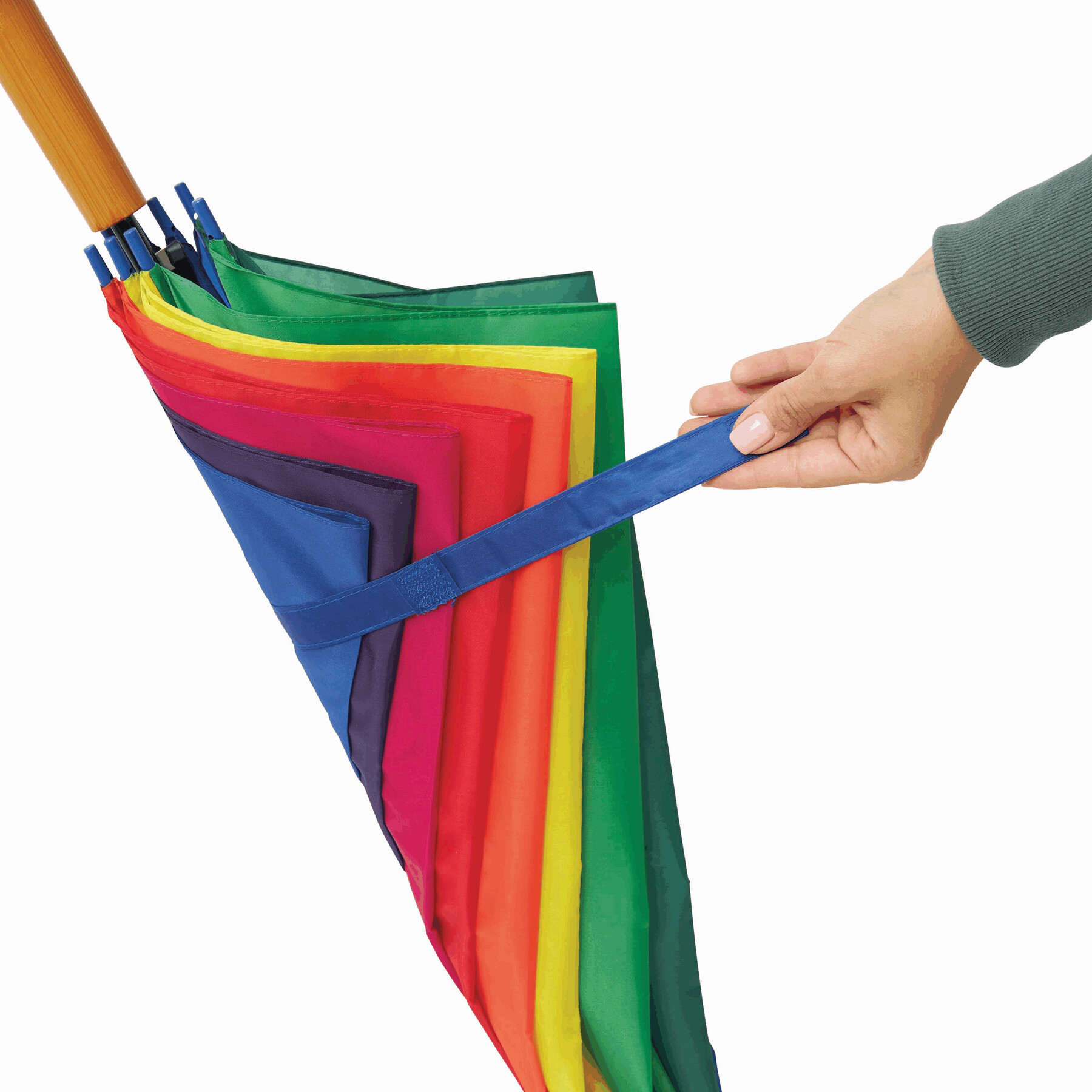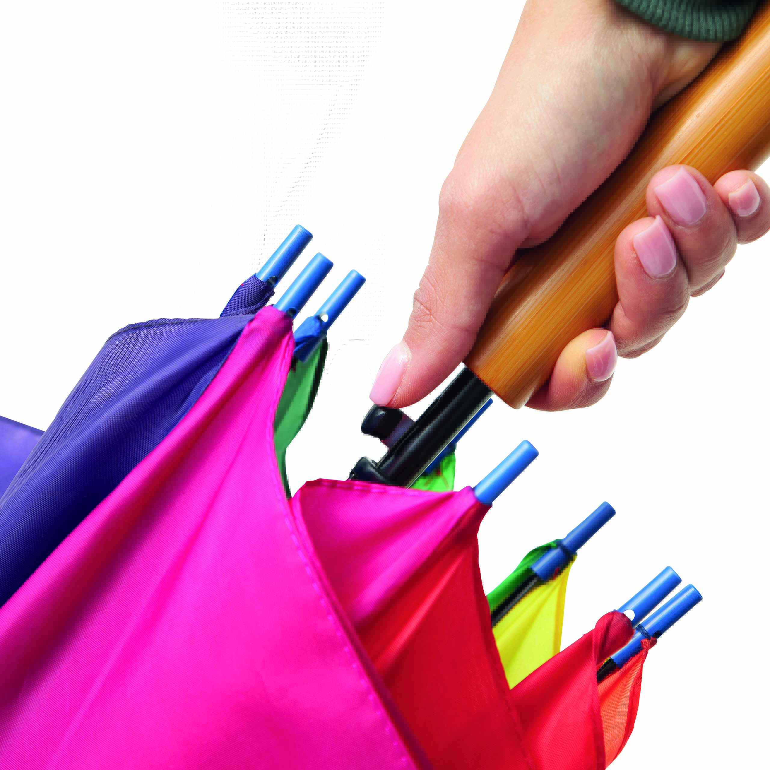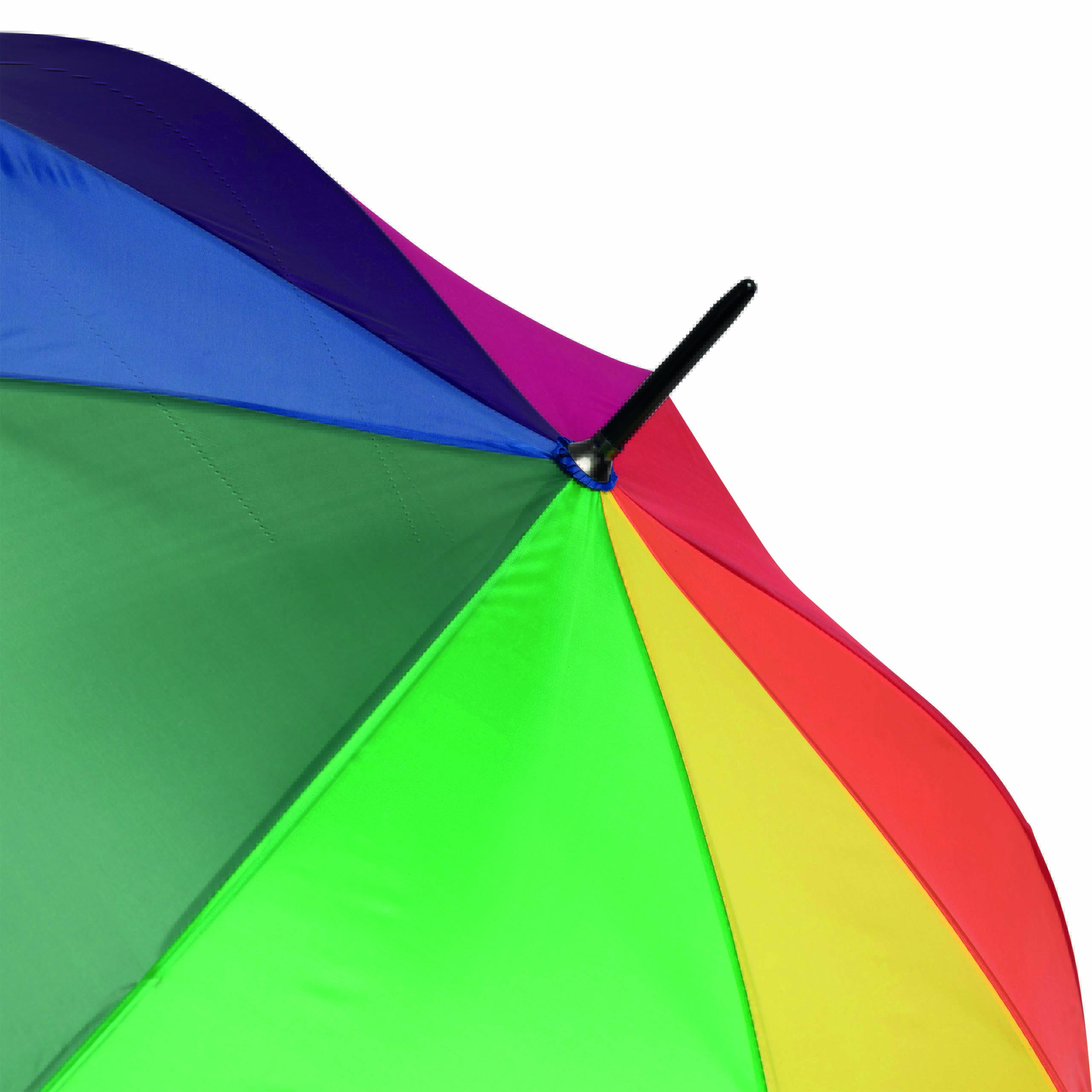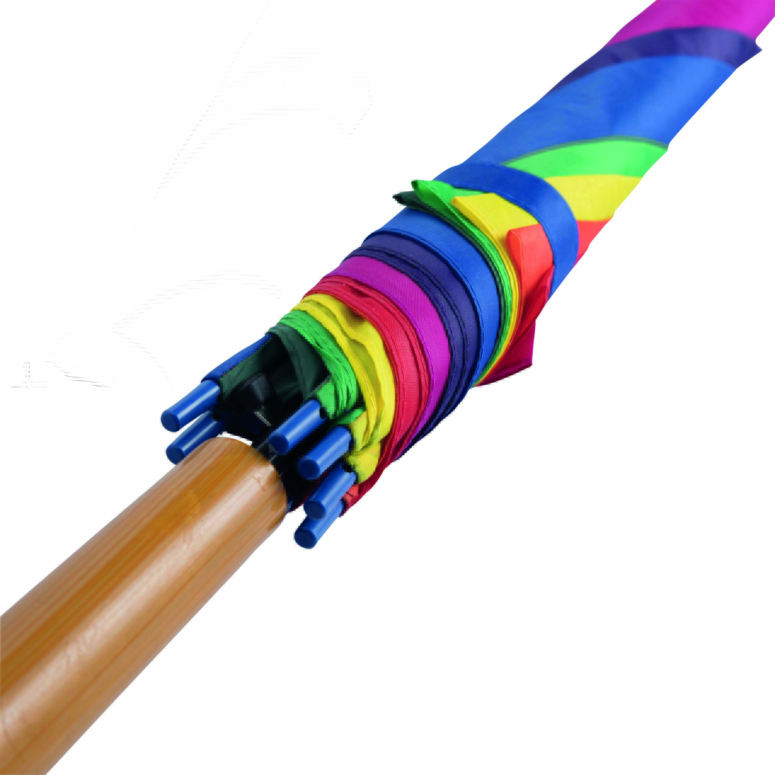 Automatyczny parasol LIMBO z metalową laską i szynami oraz plastikowymi kolcami dopasowanymi kolorystycznie, uchwyt z drewnopodobnym wykończeniem, poszycie poliestrowe, zamknięcie na rzep Velcro.
