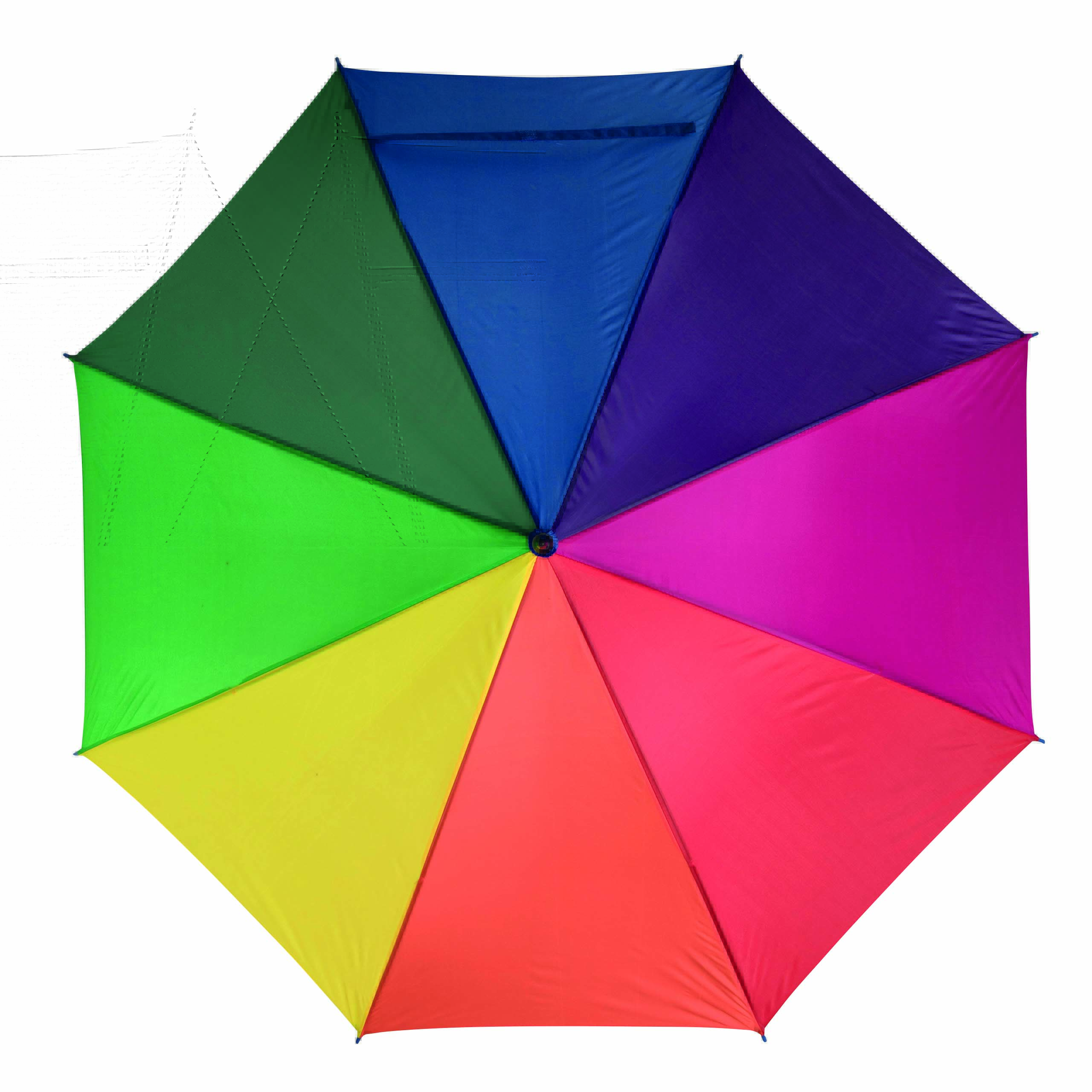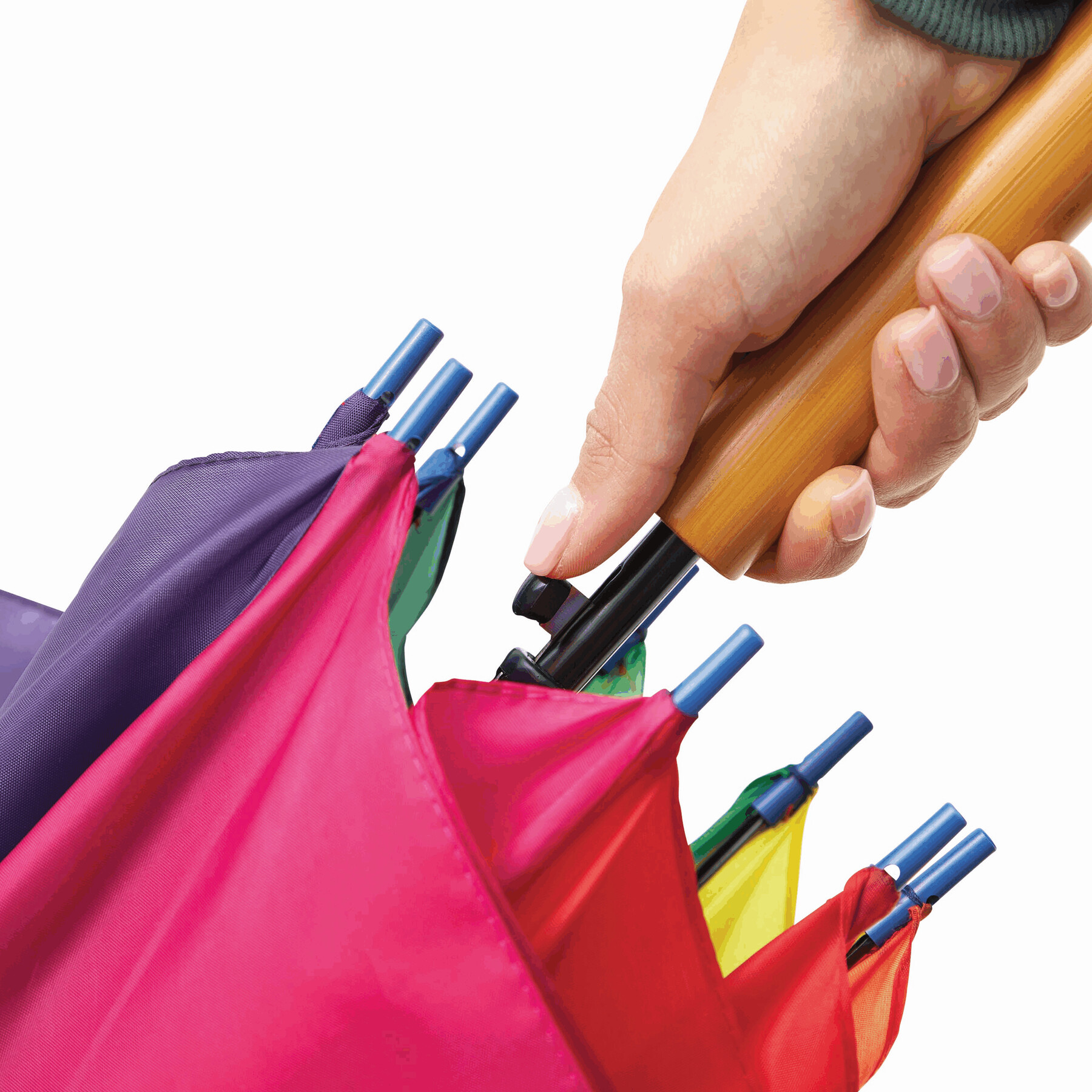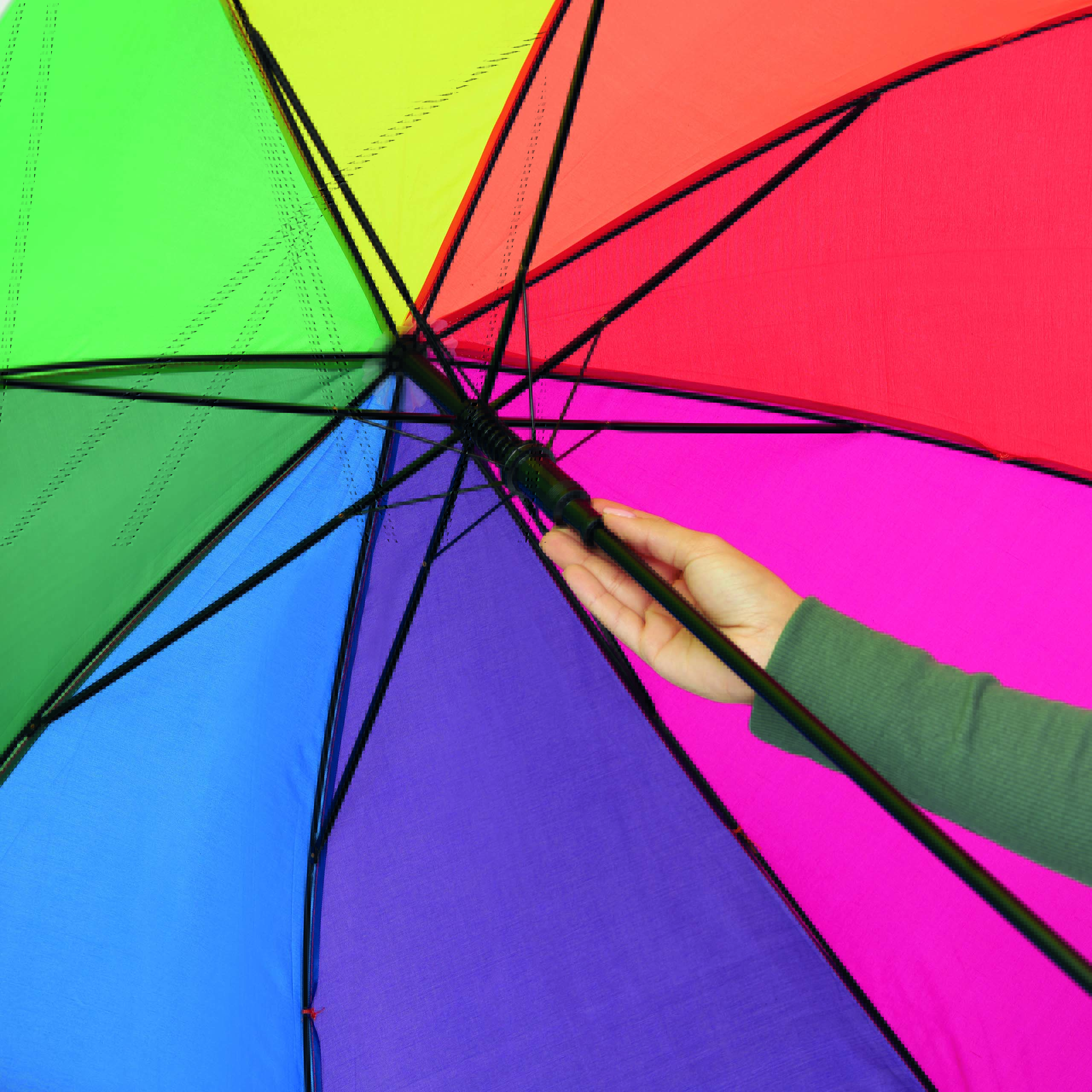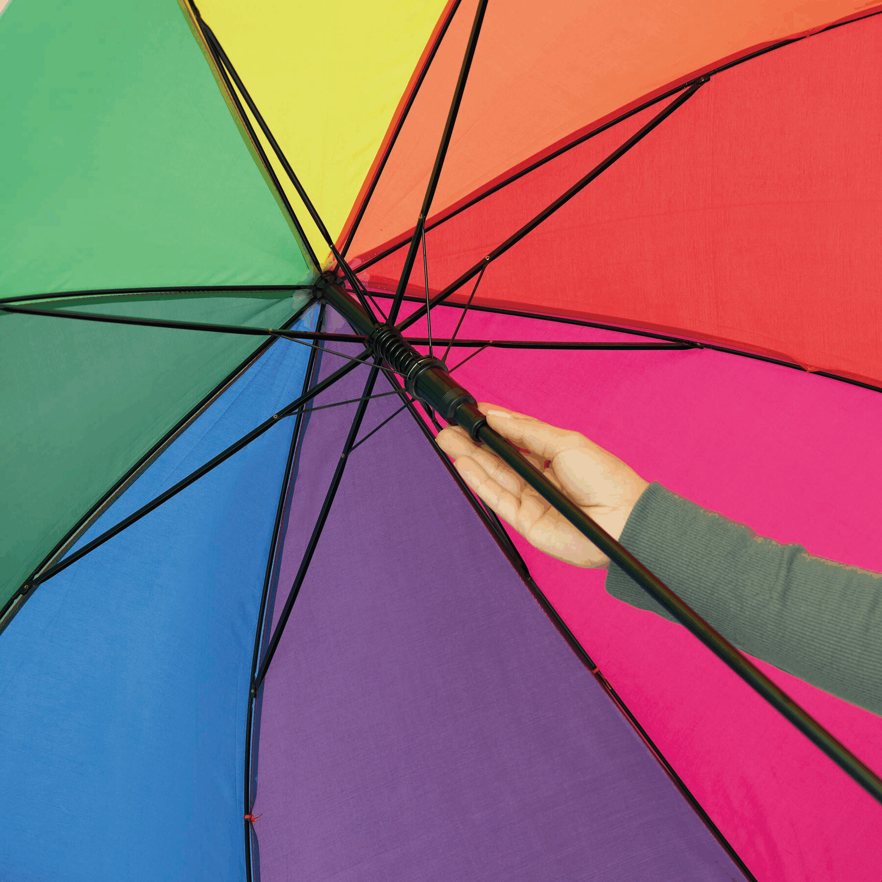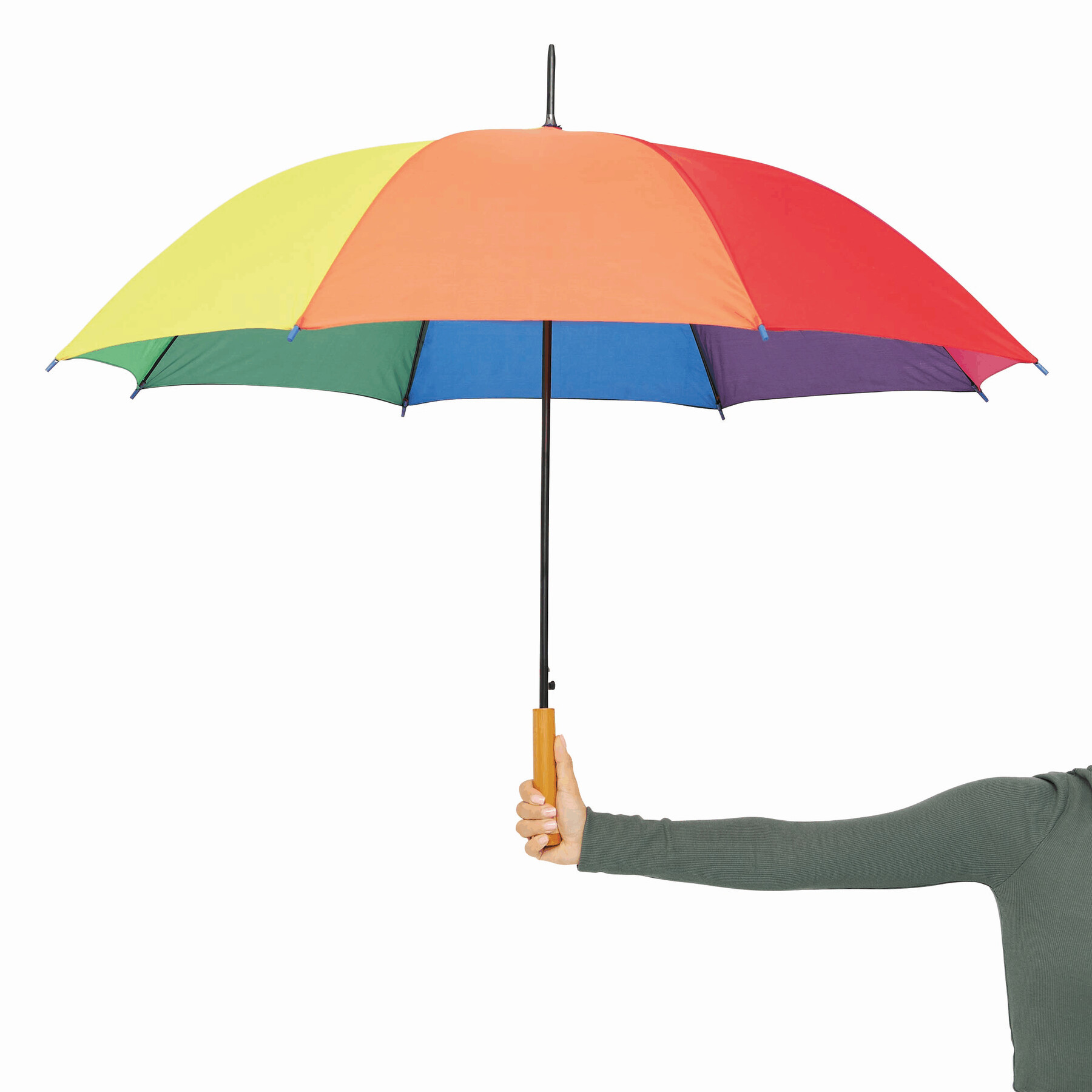 Automatyczny parasol LIMBO z metalową laską i szynami oraz plastikowymi kolcami dopasowanymi kolorystycznie, uchwyt z drewnopodobnym wykończeniem, poszycie poliestrowe, zamknięcie na rzep Velcro.