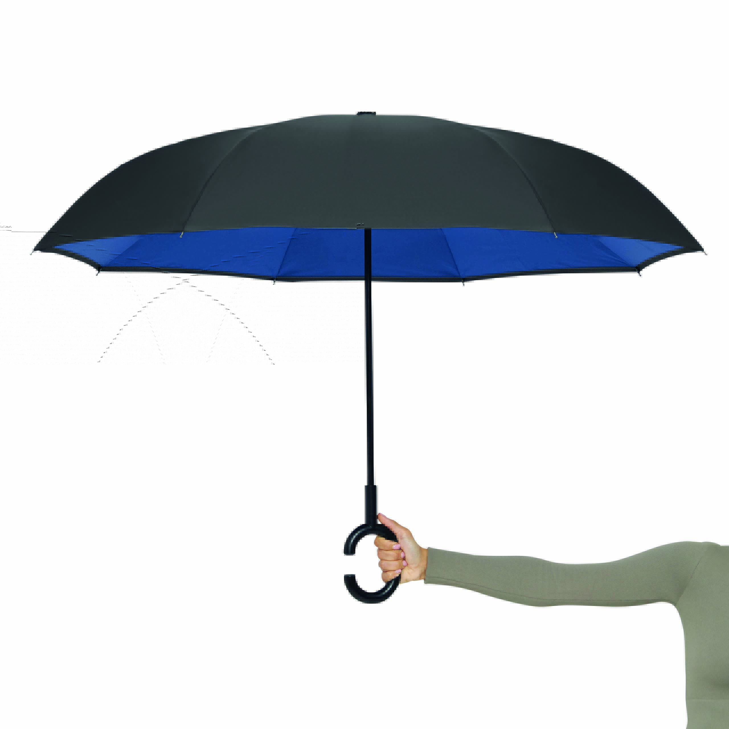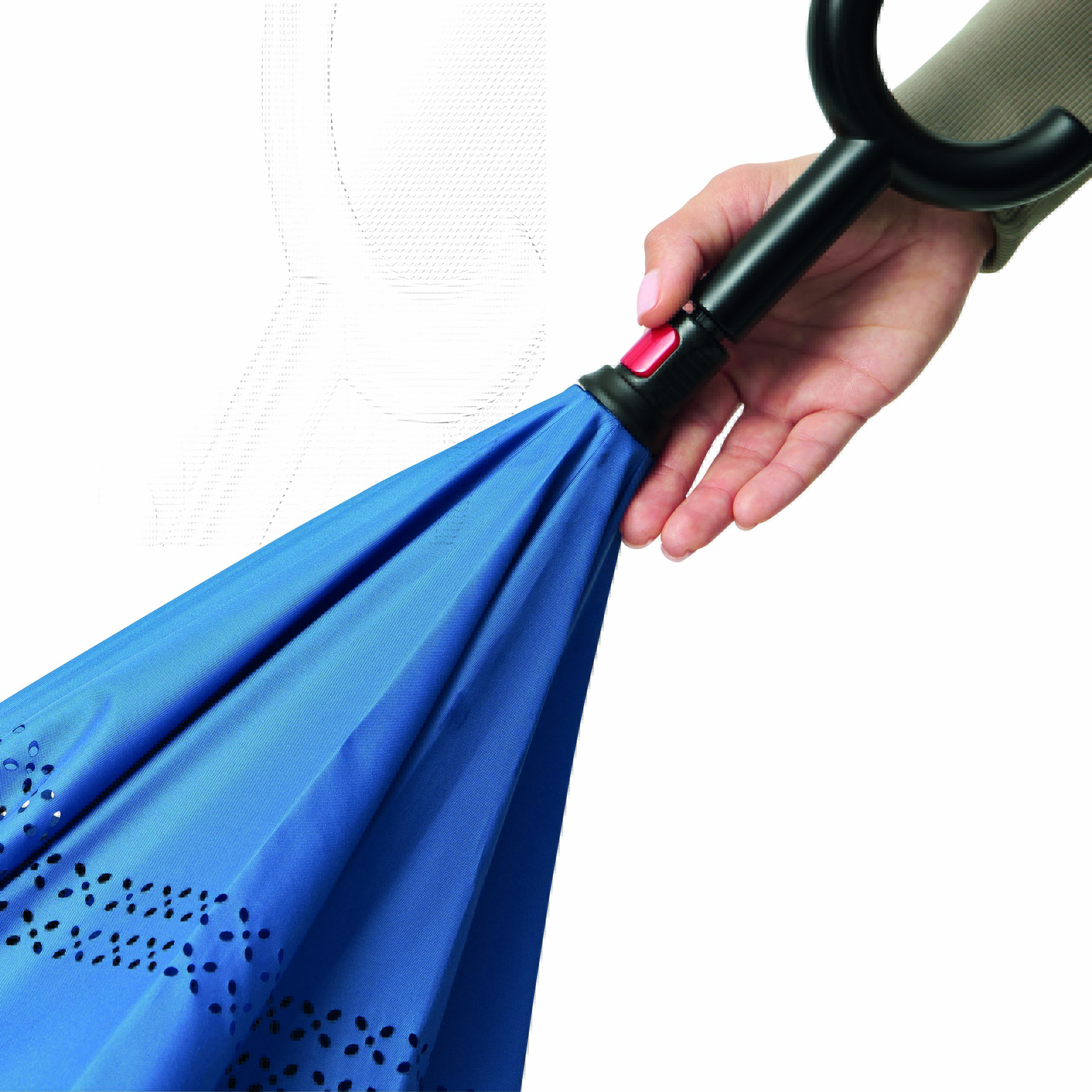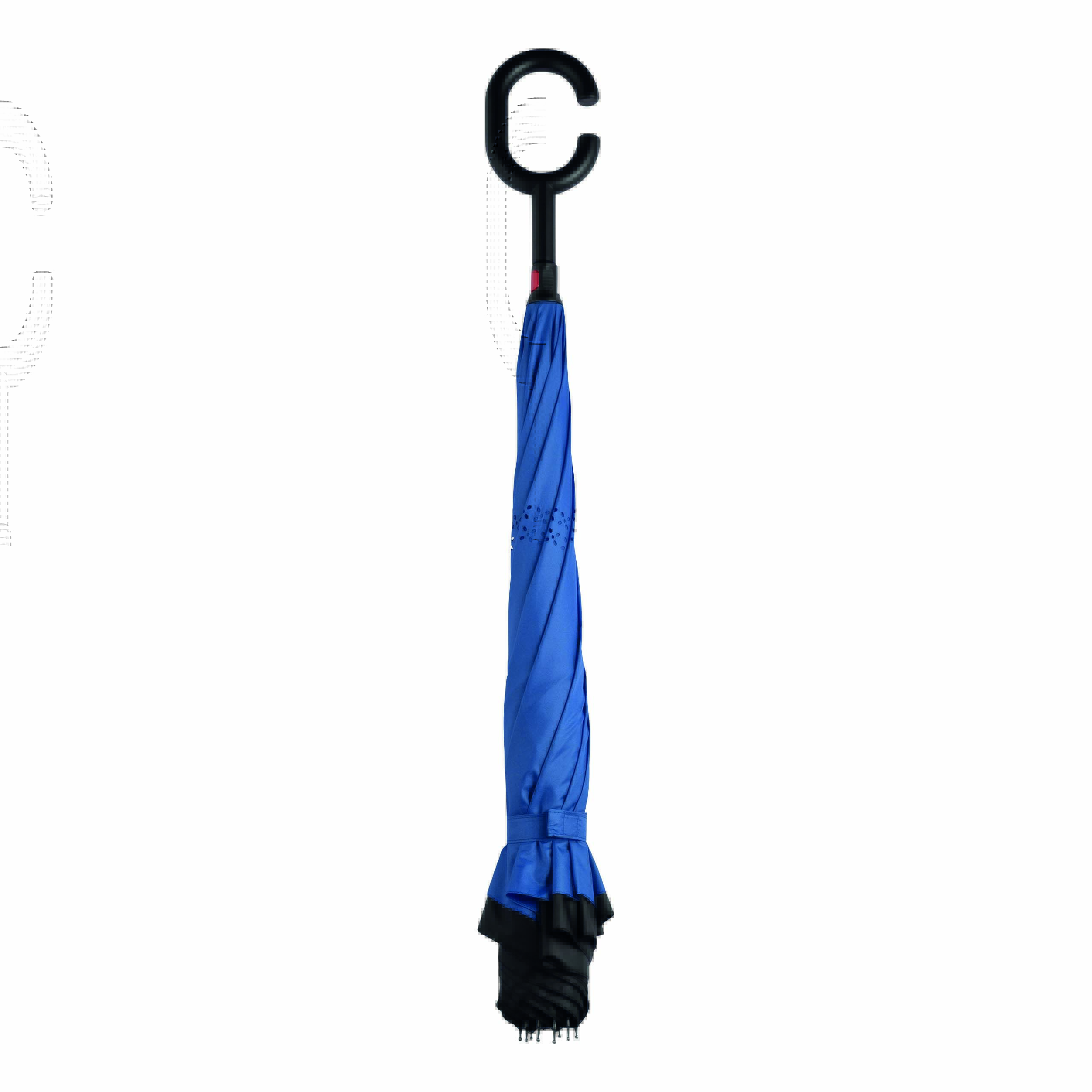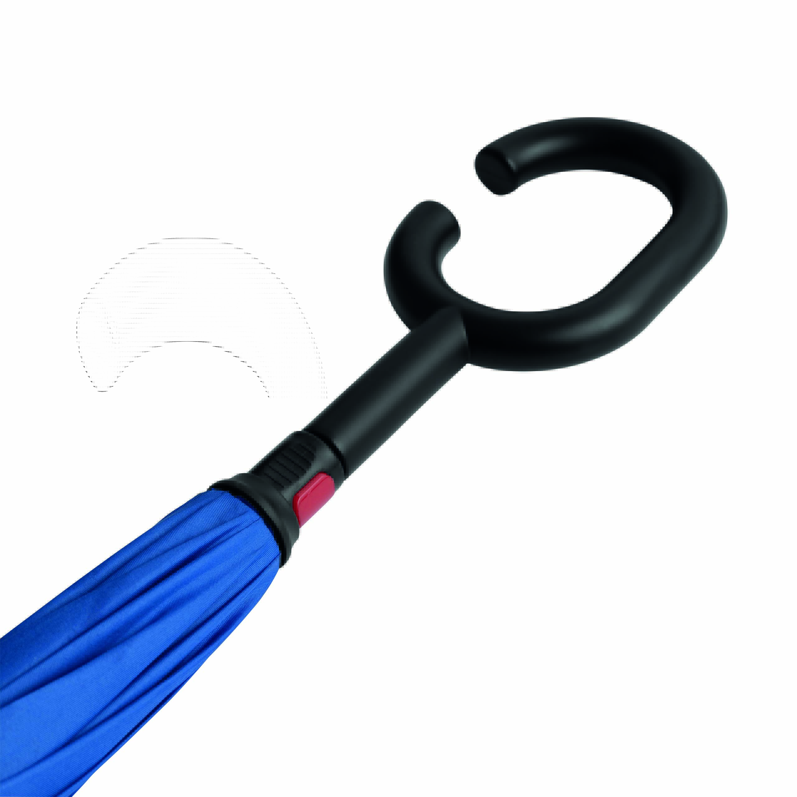 Parasol FLIPPED odwrotnie otwierany, z automatycznym mechanizmem zamykającym, z zabezpieczeniem, z uchwytem w kształcie litery C, dzięki któremu dłonie pozostają wolne, z podwójną, wentylowaną powłoką, metalową laską, szynami z włókna szklanego, metalowymi kolcami. Poszycie z poliestru-pongee, zapinany na rzep.