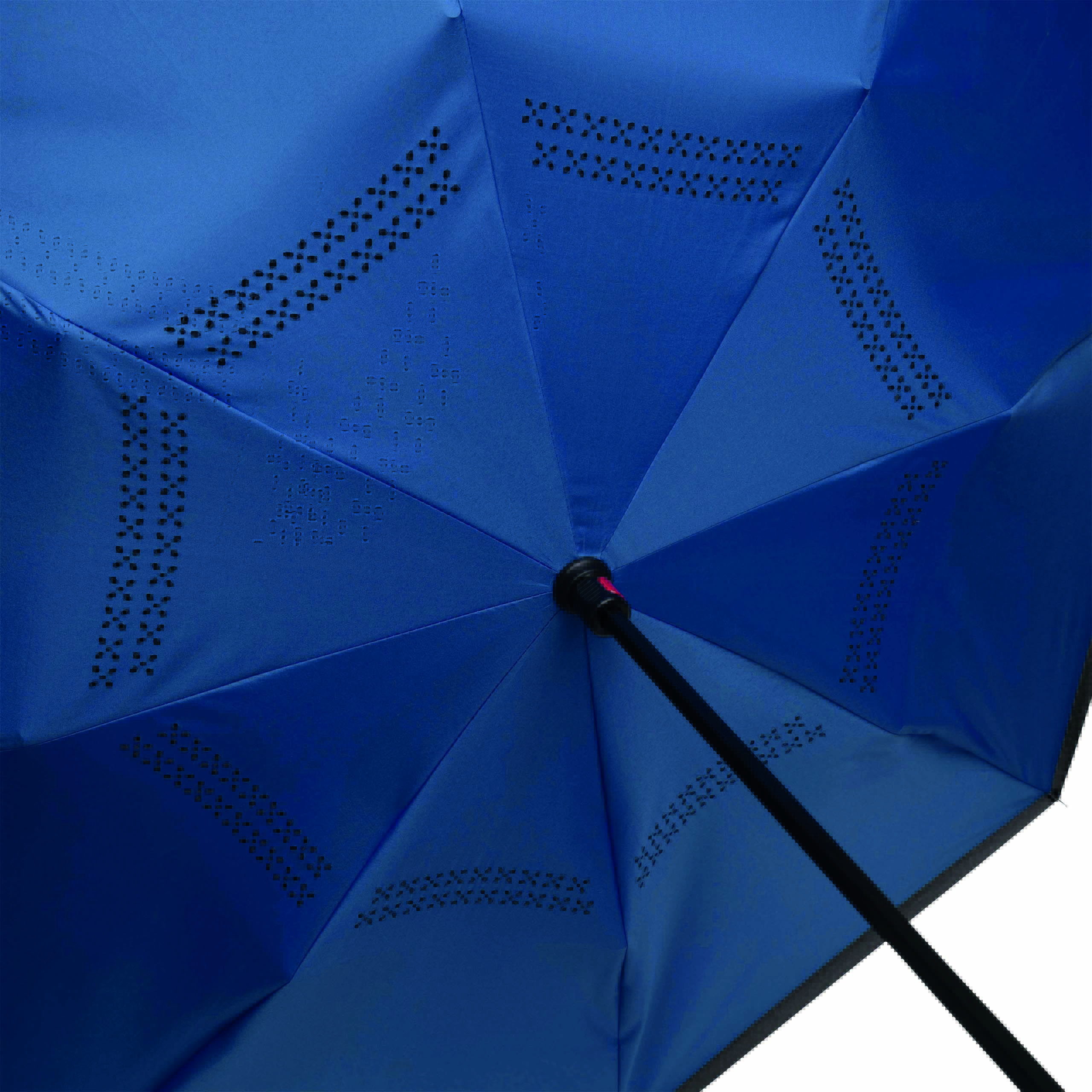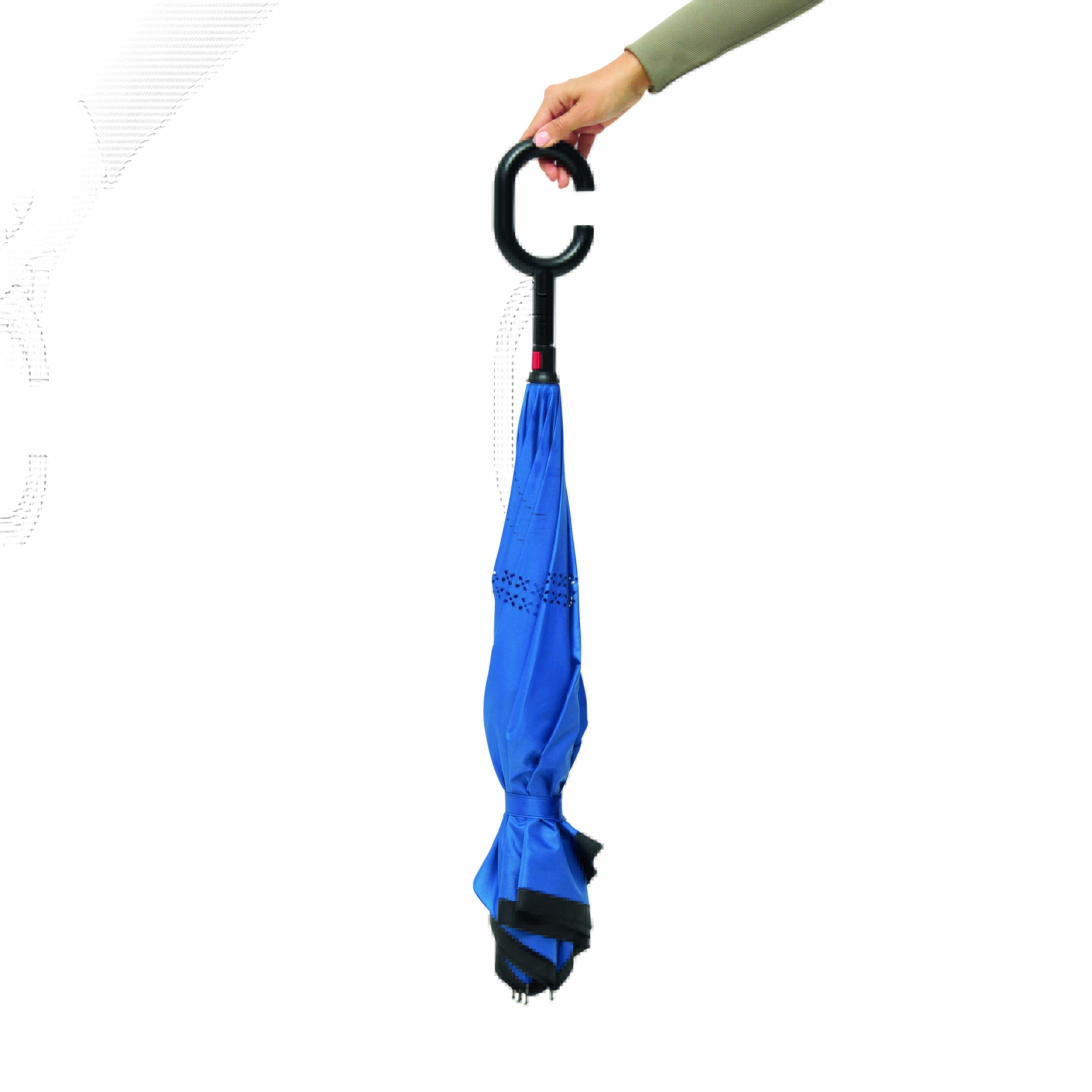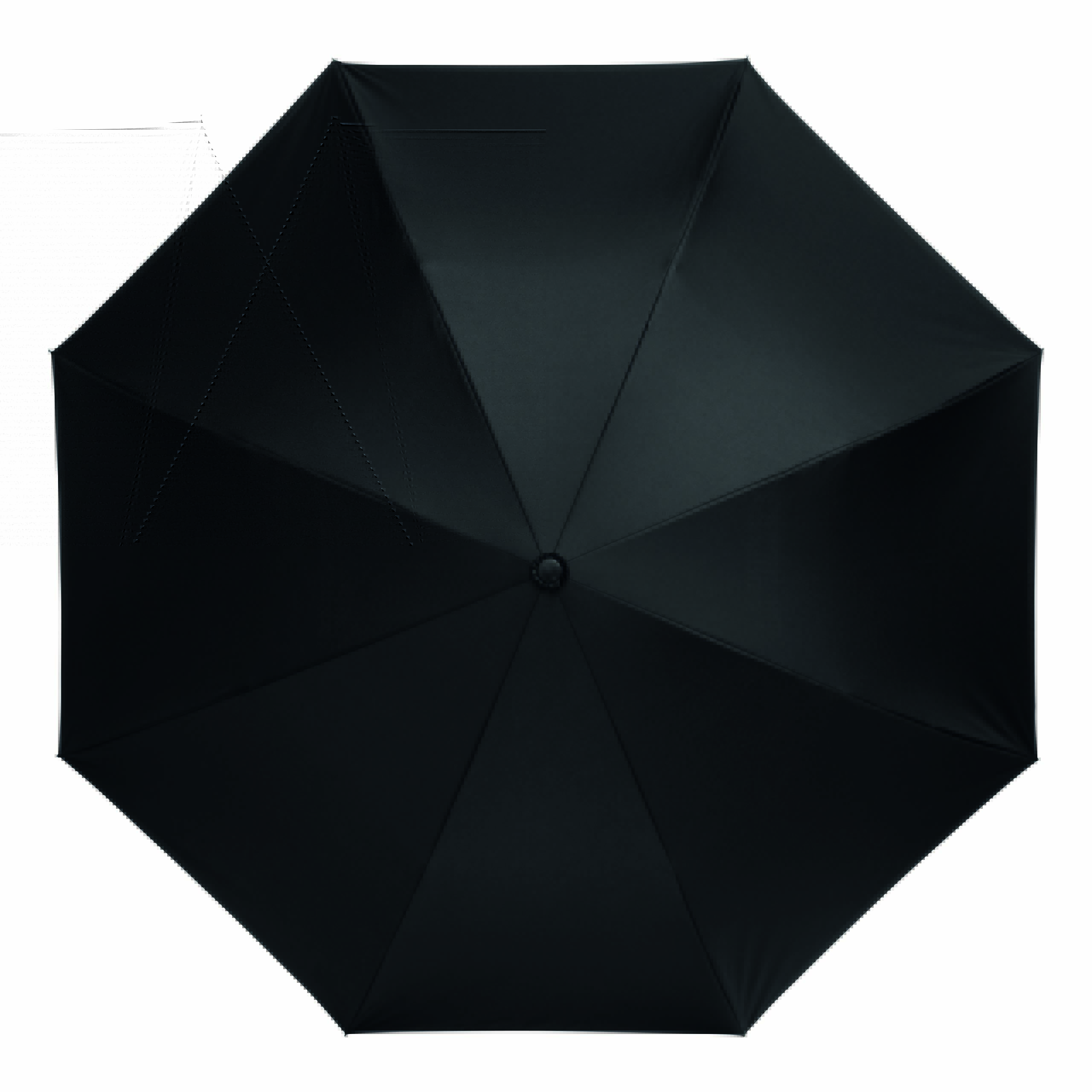 Parasol FLIPPED odwrotnie otwierany, z automatycznym mechanizmem zamykającym, z zabezpieczeniem, z uchwytem w kształcie litery C, dzięki któremu dłonie pozostają wolne, z podwójną, wentylowaną powłoką, metalową laską, szynami z włókna szklanego, metalowymi kolcami. Poszycie z poliestru-pongee, zapinany na rzep.