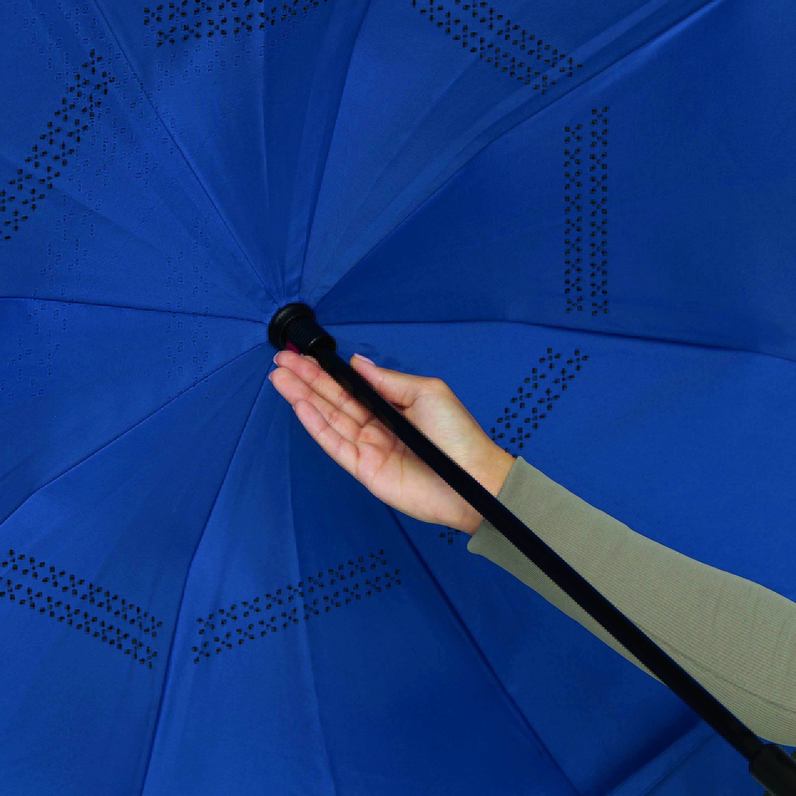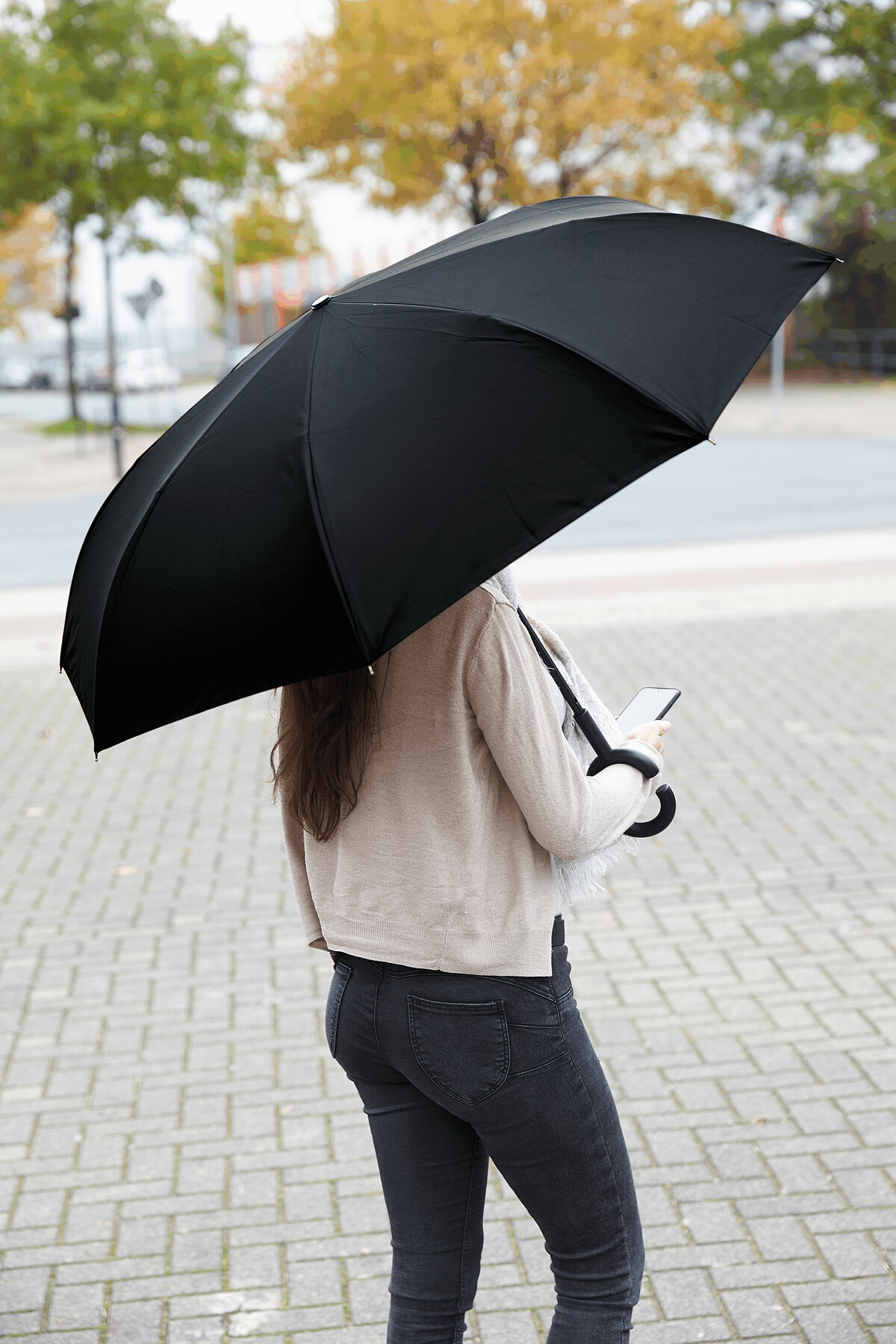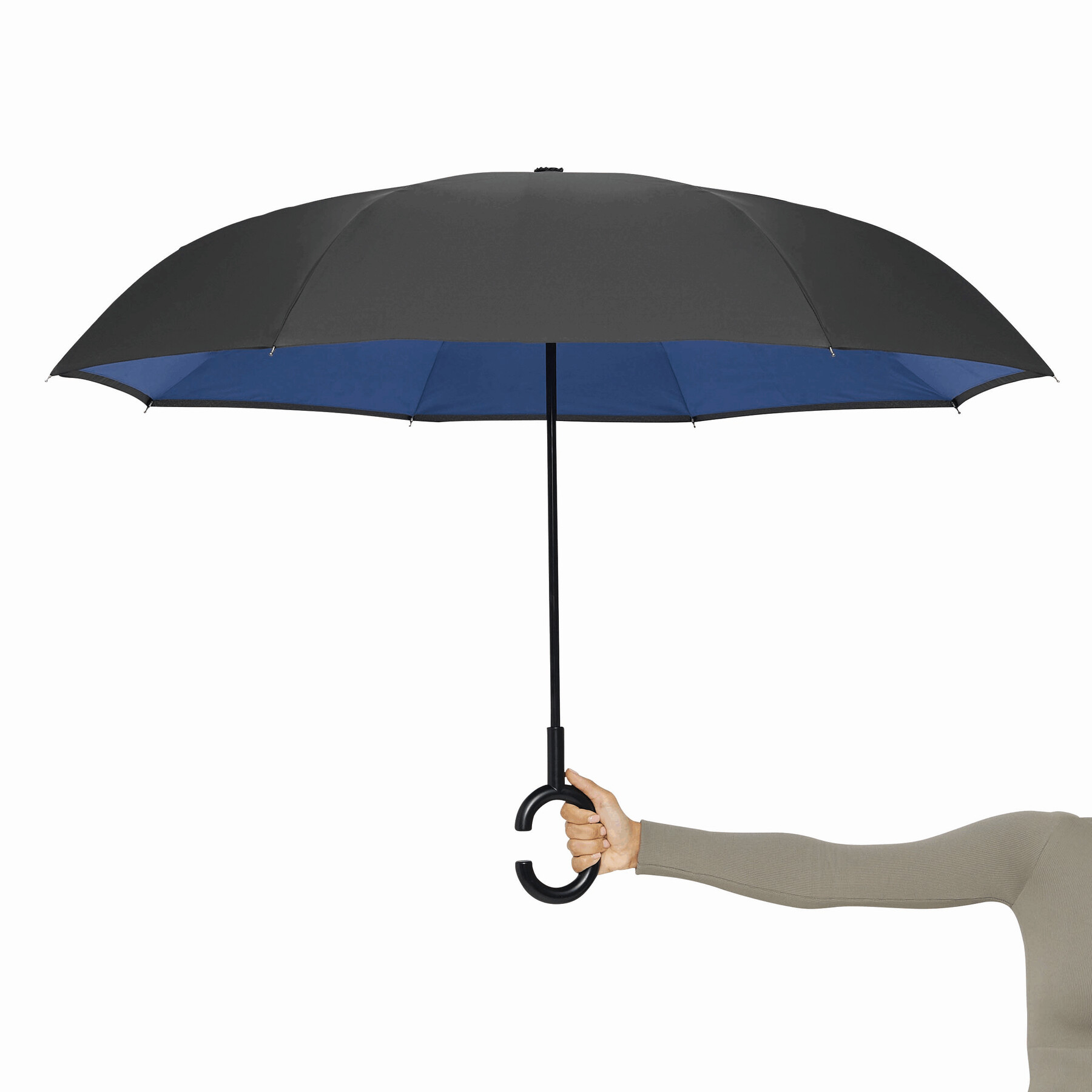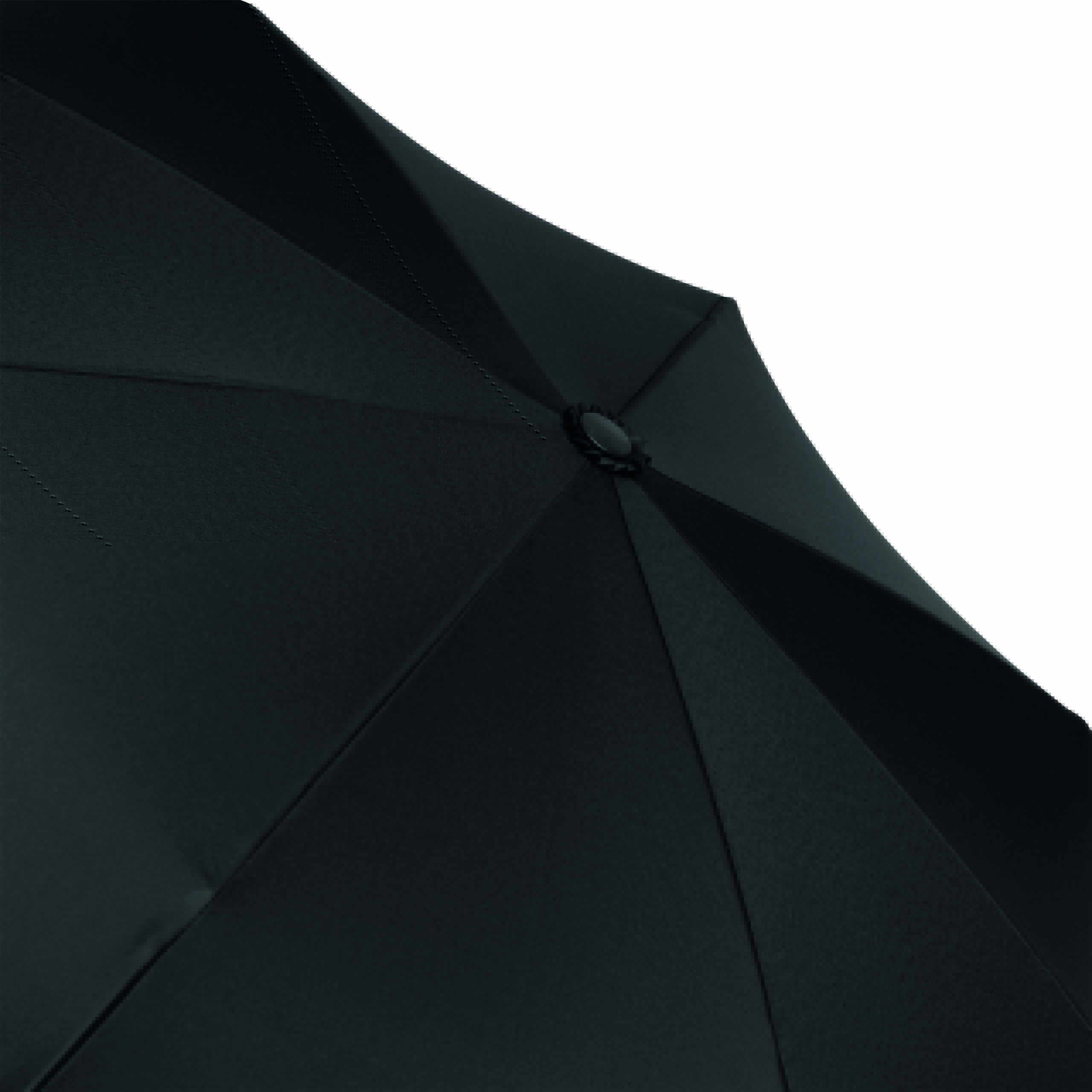 Parasol FLIPPED odwrotnie otwierany, z automatycznym mechanizmem zamykającym, z zabezpieczeniem, z uchwytem w kształcie litery C, dzięki któremu dłonie pozostają wolne, z podwójną, wentylowaną powłoką, metalową laską, szynami z włókna szklanego, metalowymi kolcami. Poszycie z poliestru-pongee, zapinany na rzep.