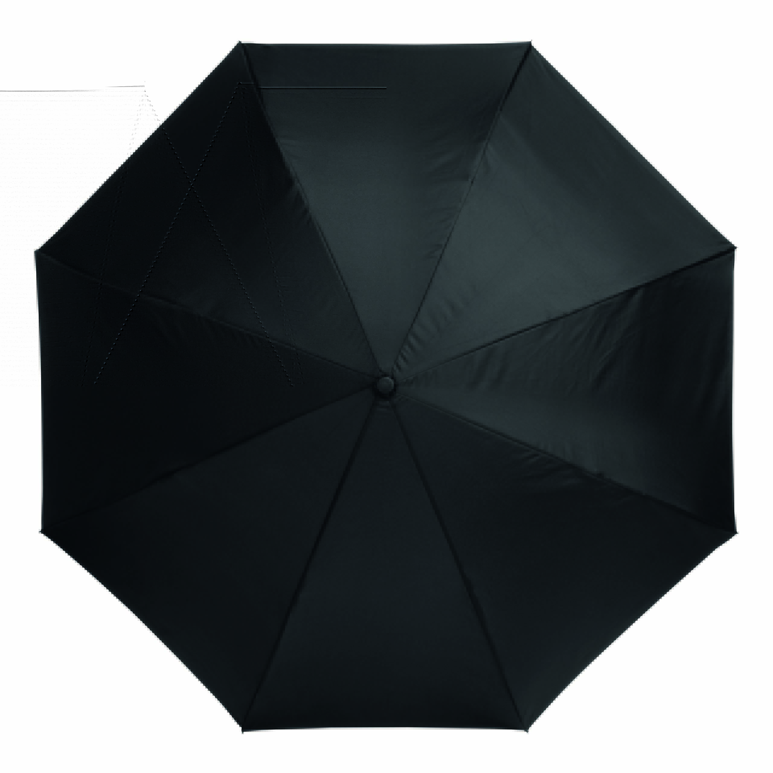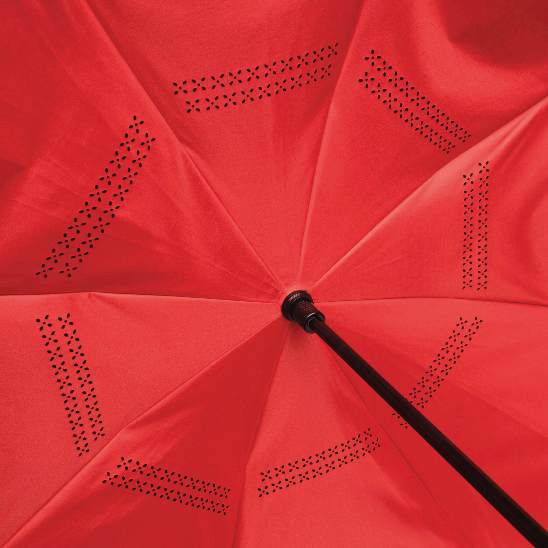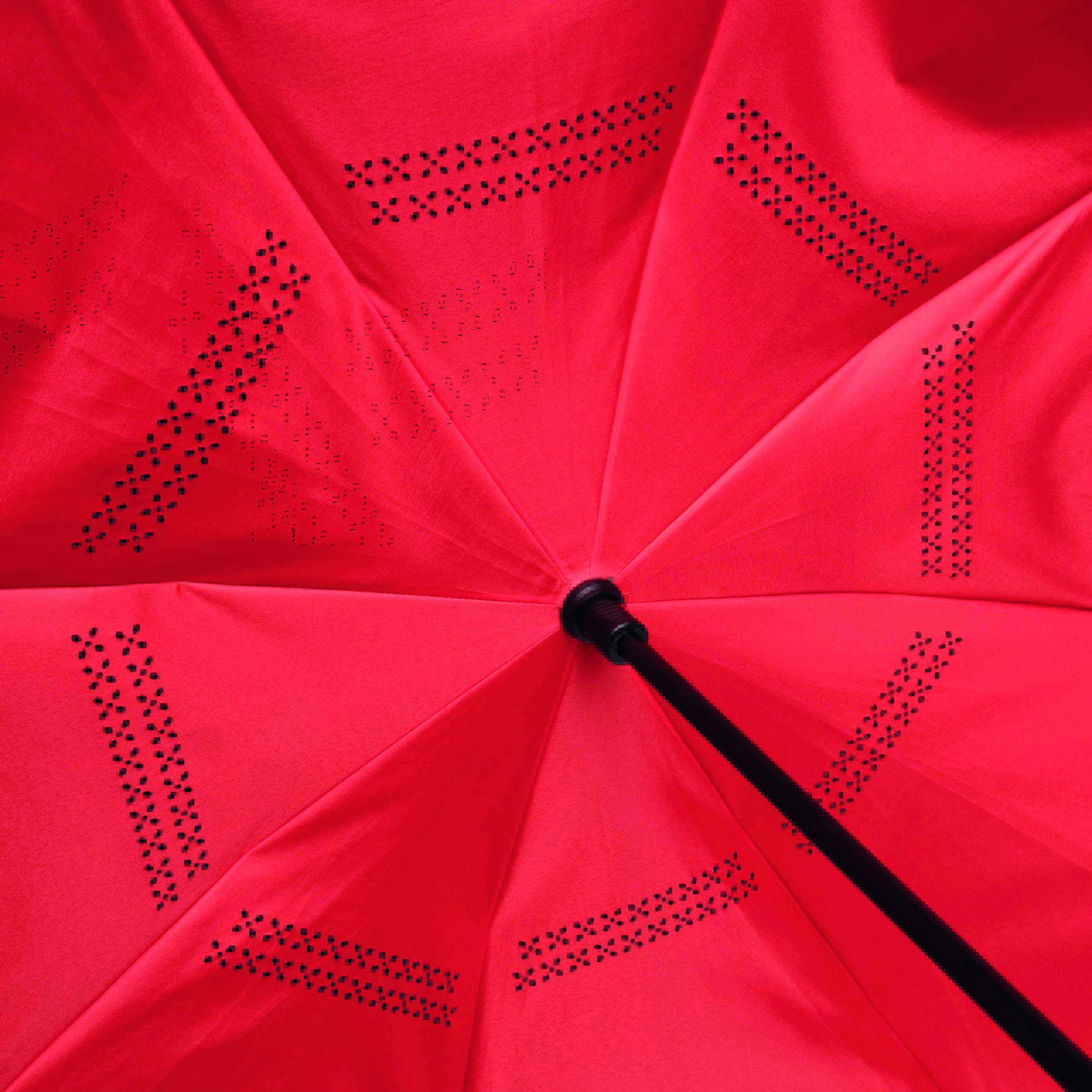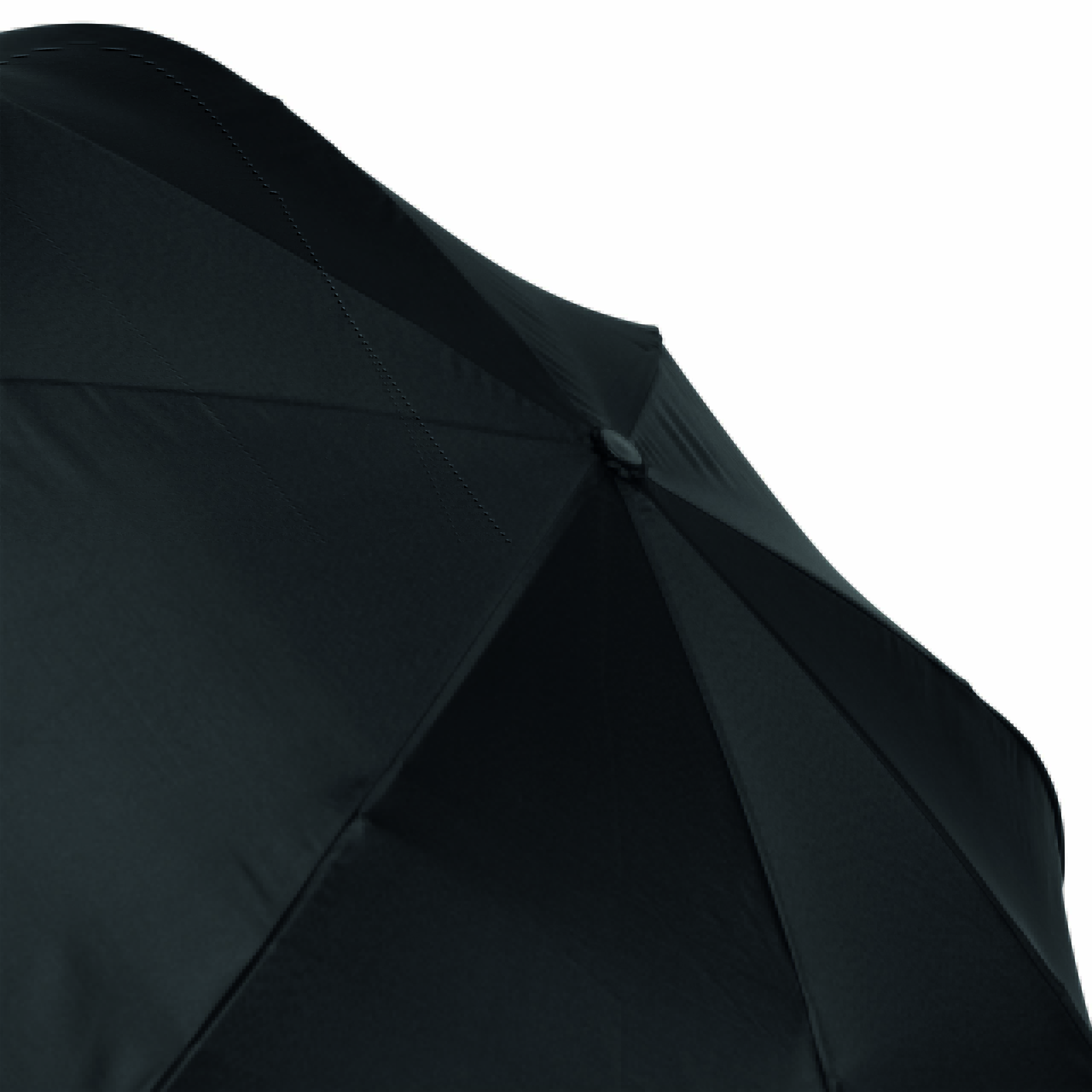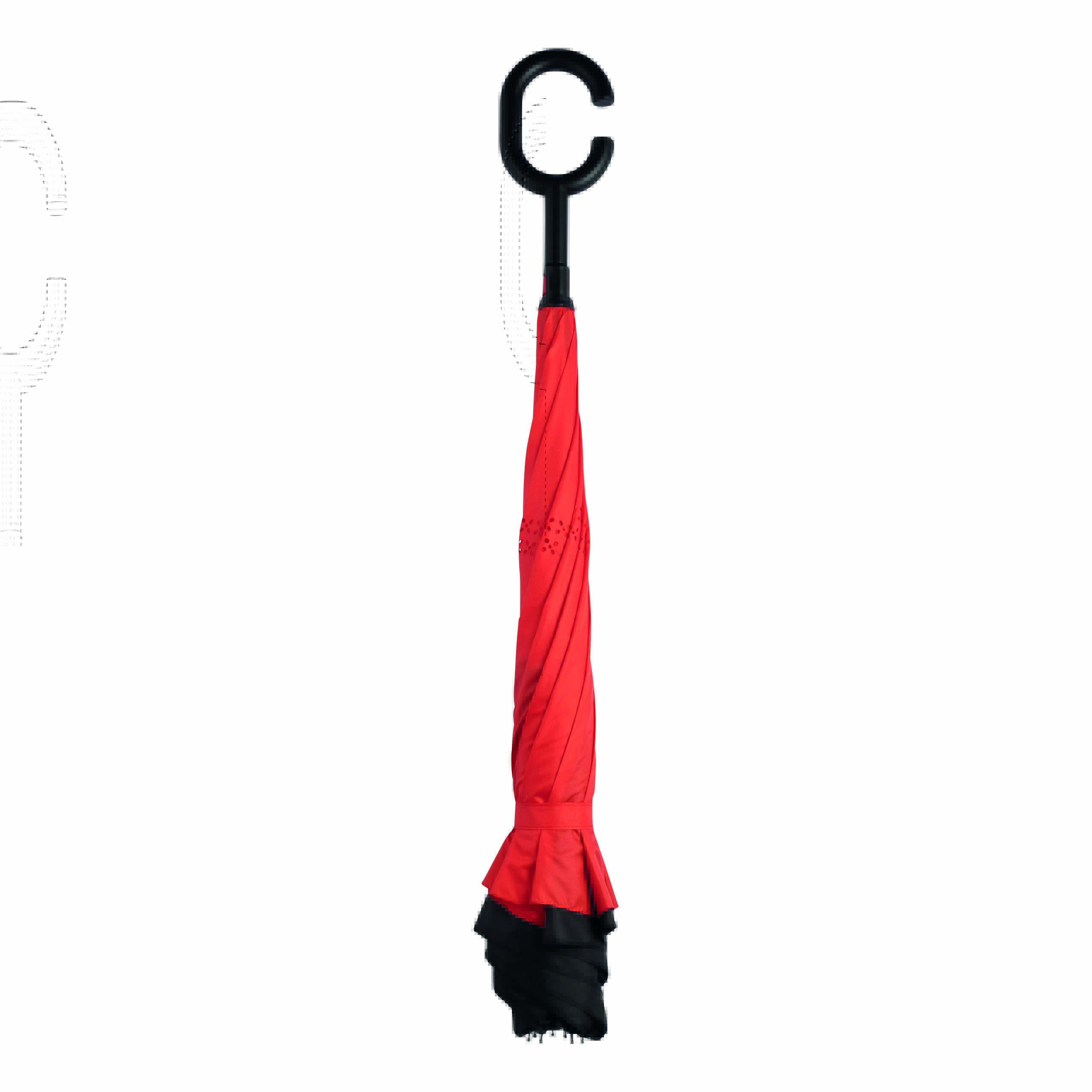 Parasol FLIPPED odwrotnie otwierany, z automatycznym mechanizmem zamykającym, z zabezpieczeniem, z uchwytem w kształcie litery C, dzięki któremu dłonie pozostają wolne, z podwójną, wentylowaną powłoką, metalową laską, szynami z włókna szklanego, metalowymi kolcami. Poszycie z poliestru-pongee, zapinany na rzep.