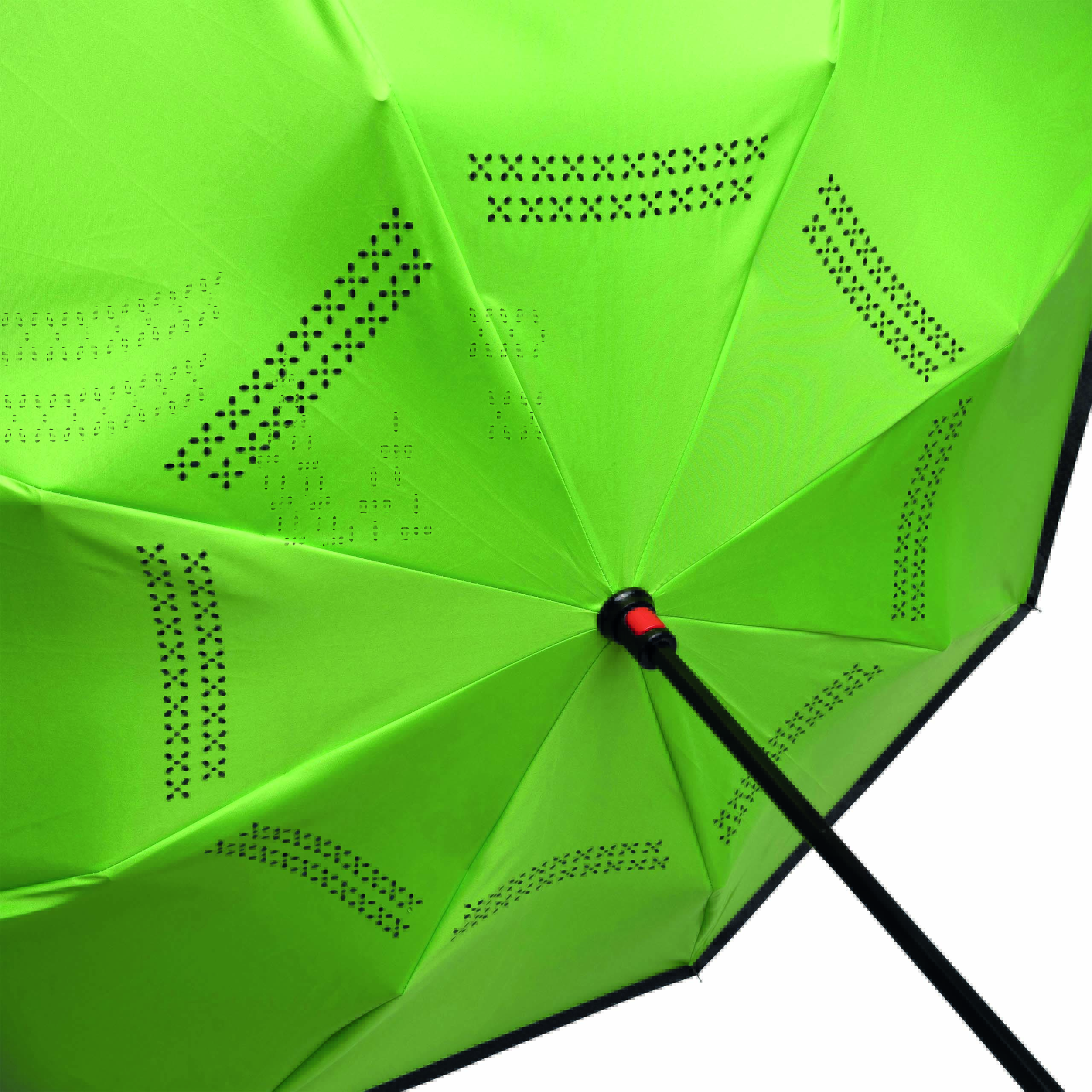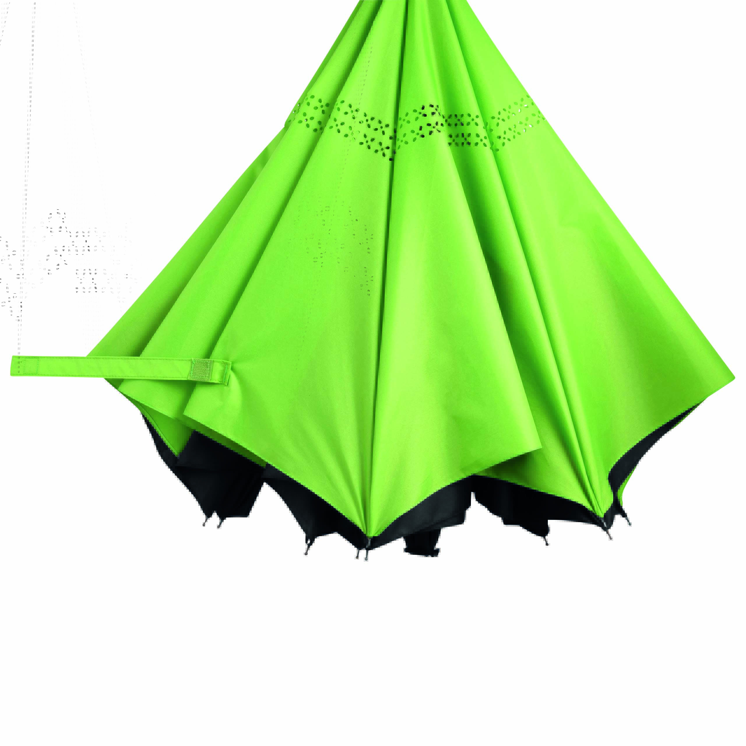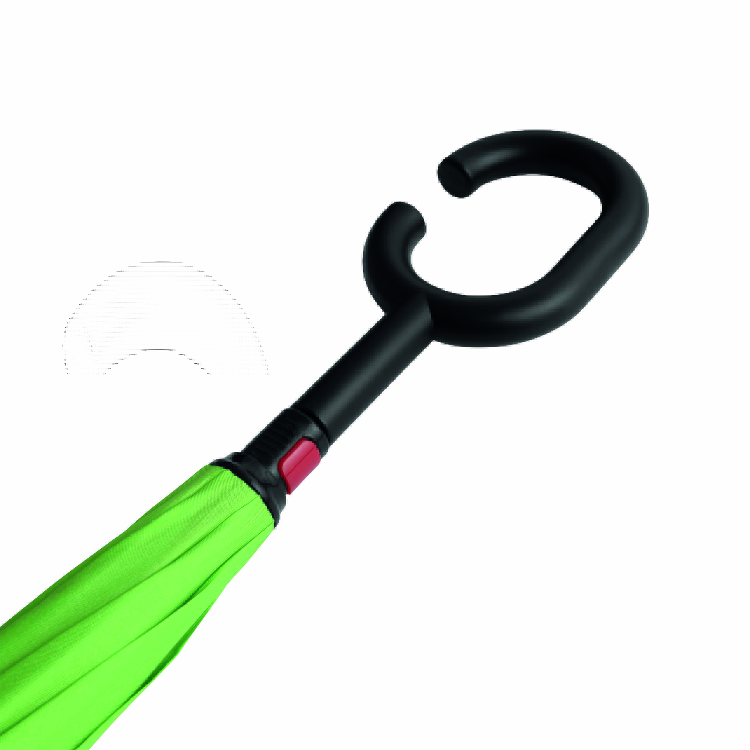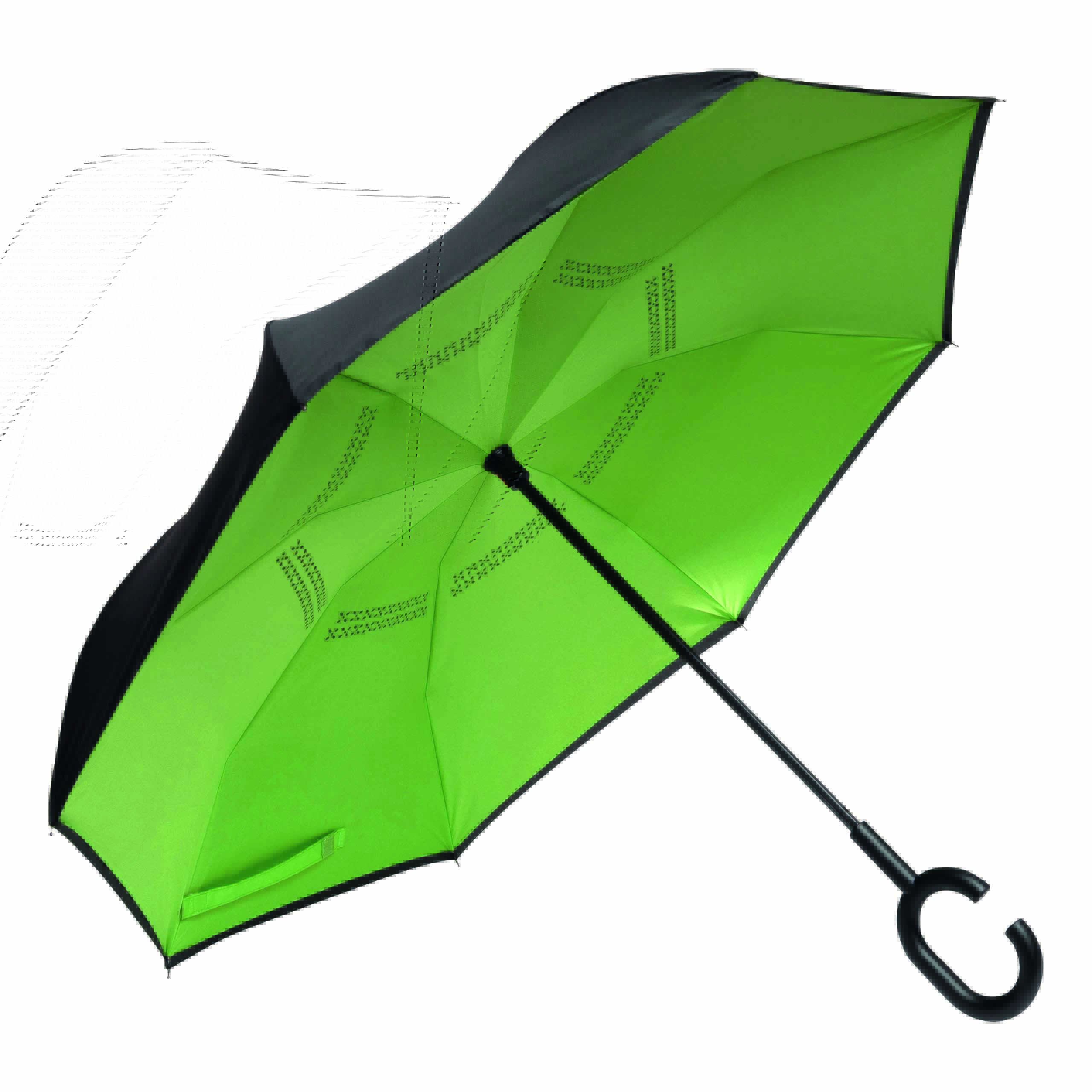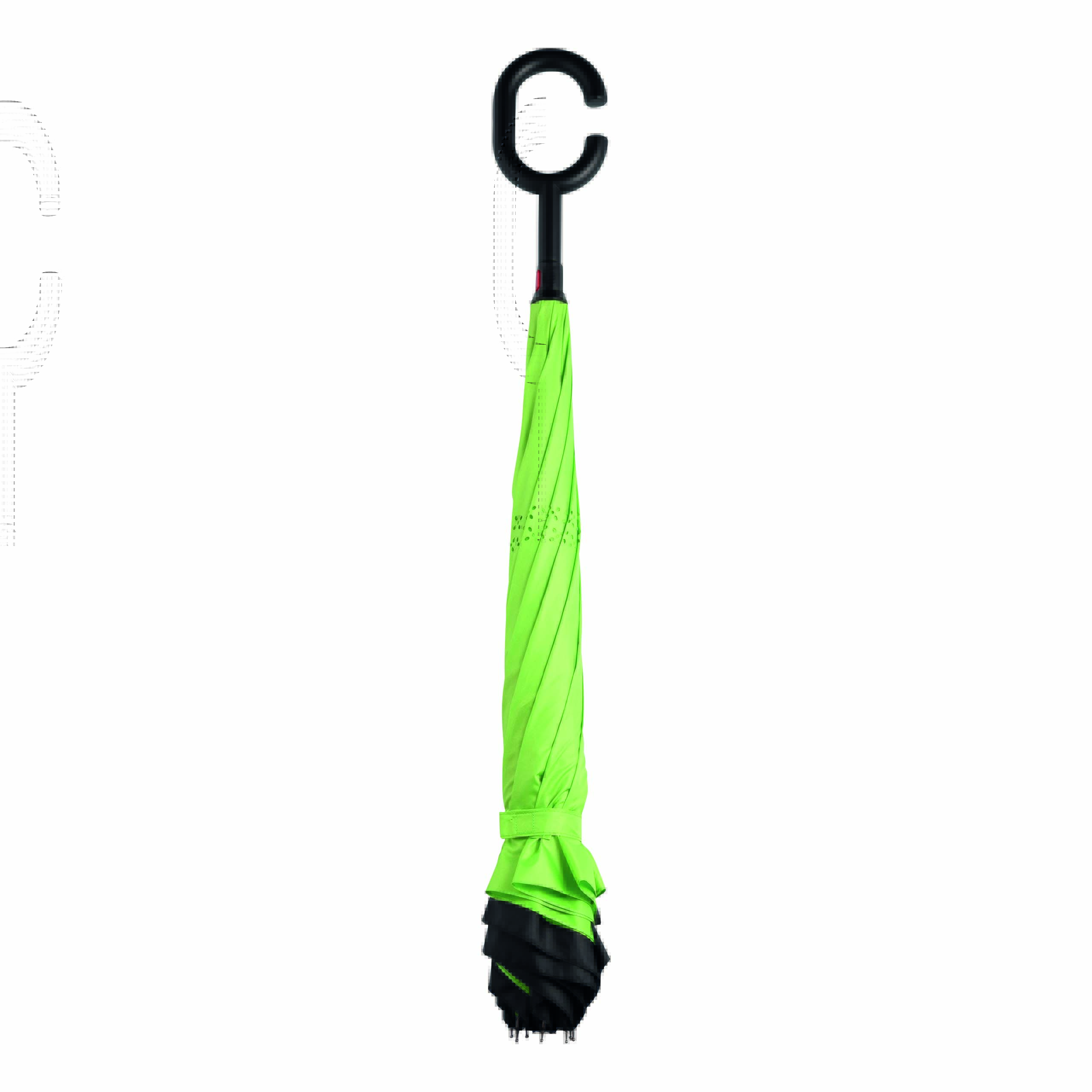 Parasol FLIPPED odwrotnie otwierany, z automatycznym mechanizmem zamykającym, z zabezpieczeniem, z uchwytem w kształcie litery C, dzięki któremu dłonie pozostają wolne, z podwójną, wentylowaną powłoką, metalową laską, szynami z włókna szklanego, metalowymi kolcami. Poszycie z poliestru-pongee, zapinany na rzep.