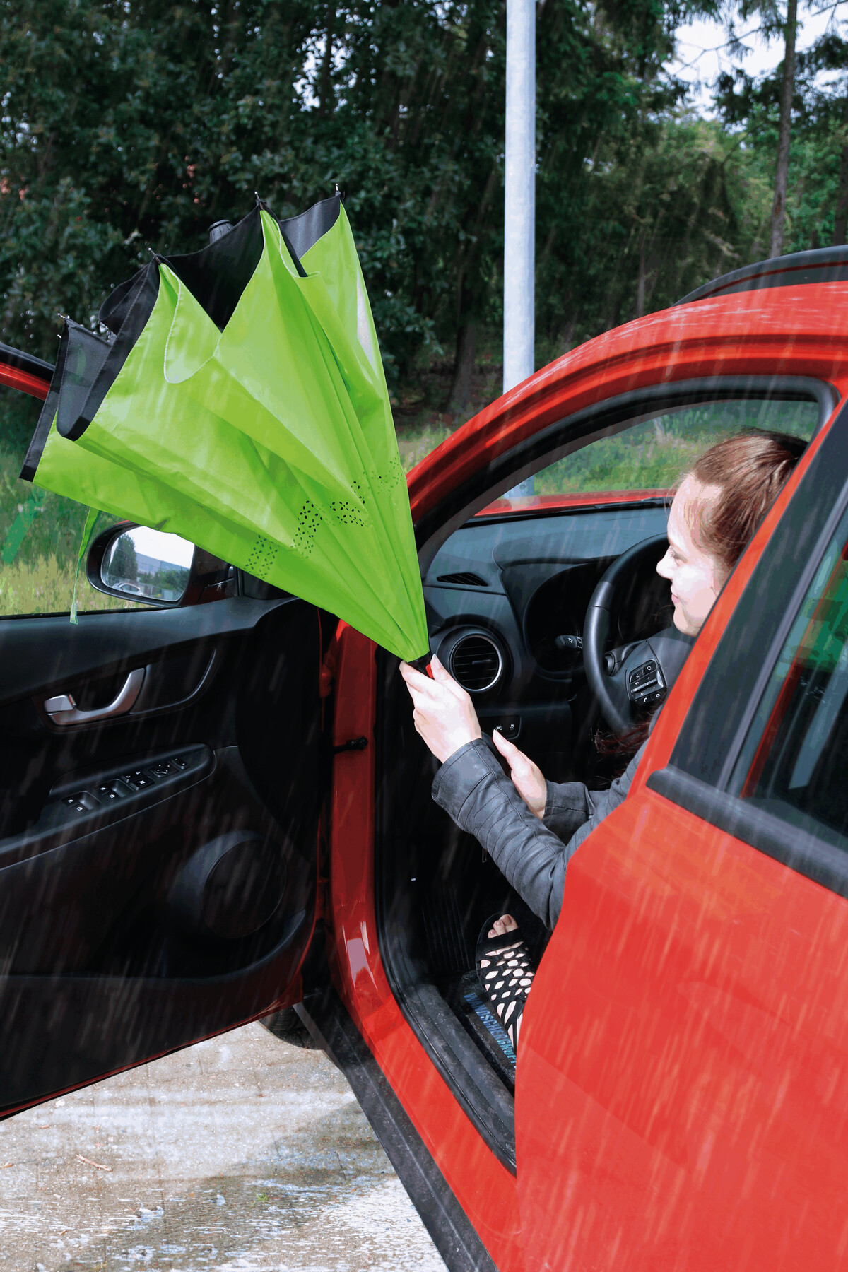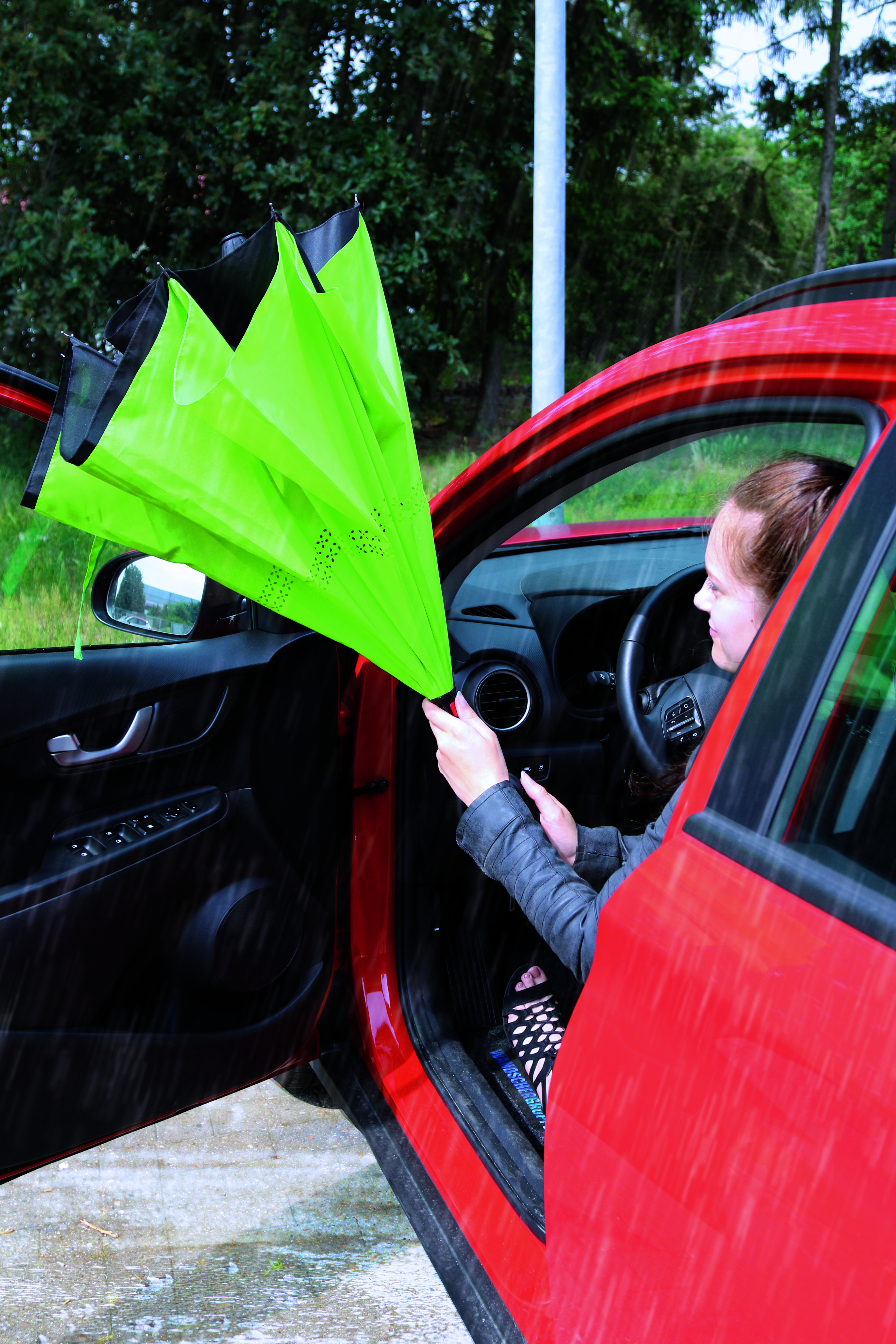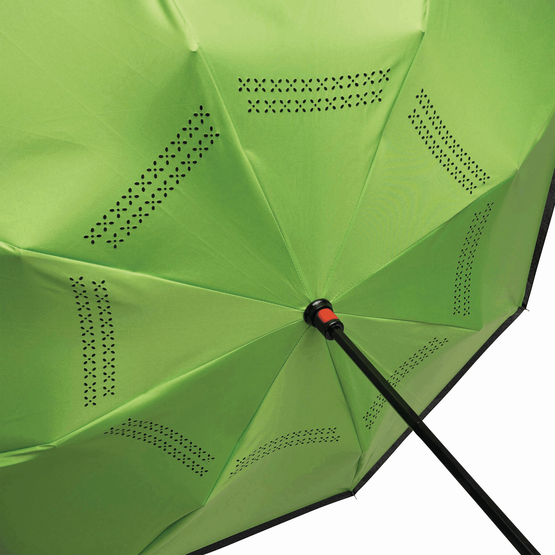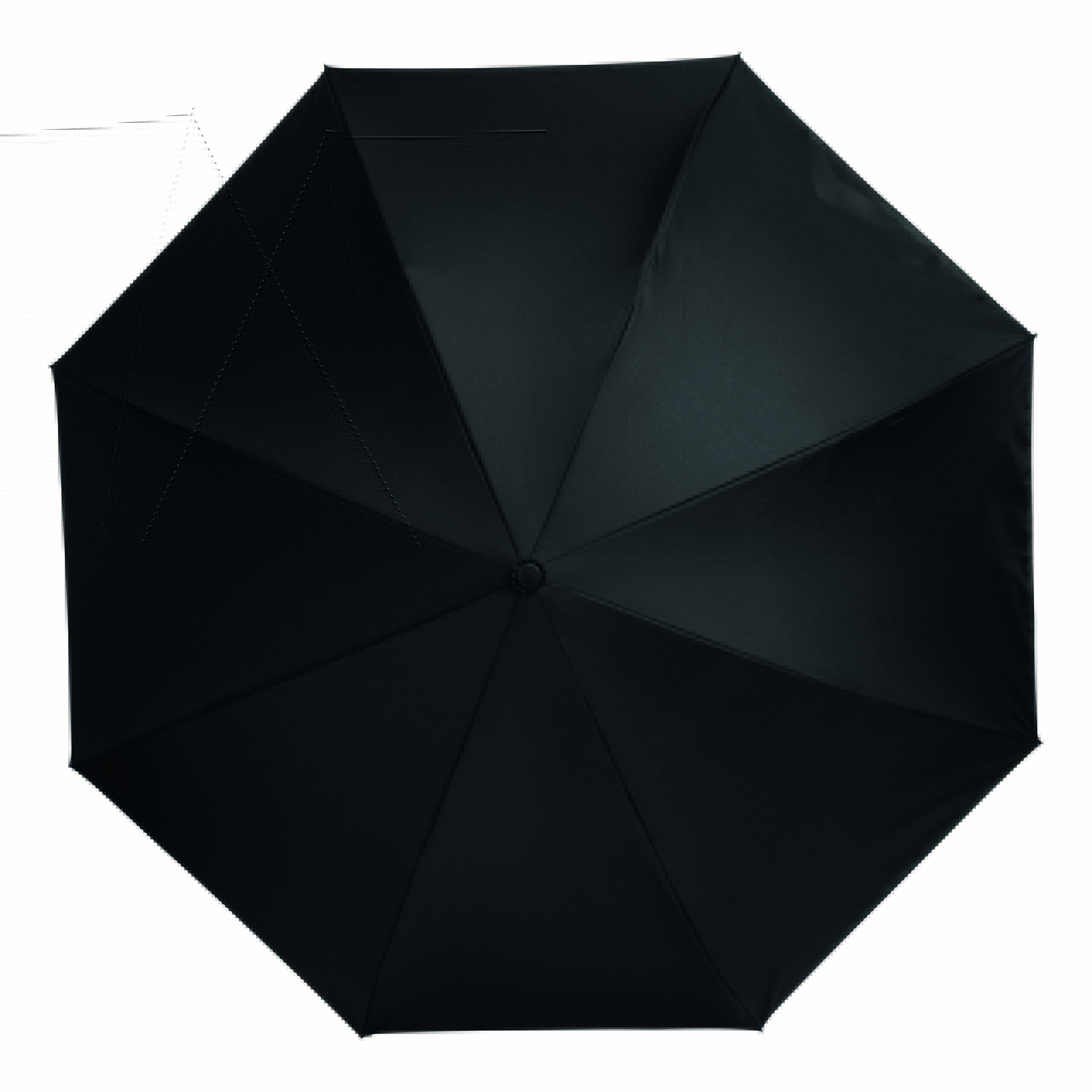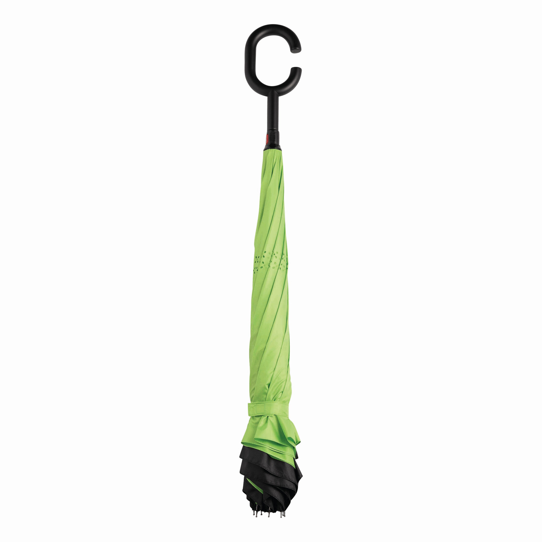 Parasol FLIPPED odwrotnie otwierany, z automatycznym mechanizmem zamykającym, z zabezpieczeniem, z uchwytem w kształcie litery C, dzięki któremu dłonie pozostają wolne, z podwójną, wentylowaną powłoką, metalową laską, szynami z włókna szklanego, metalowymi kolcami. Poszycie z poliestru-pongee, zapinany na rzep.