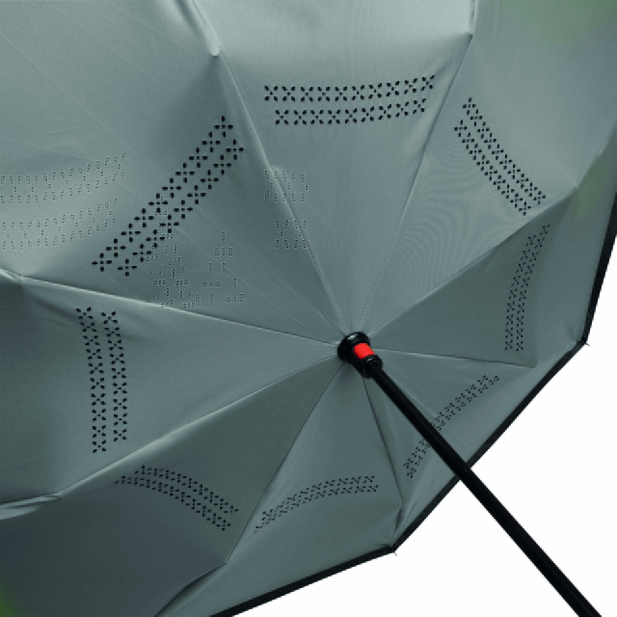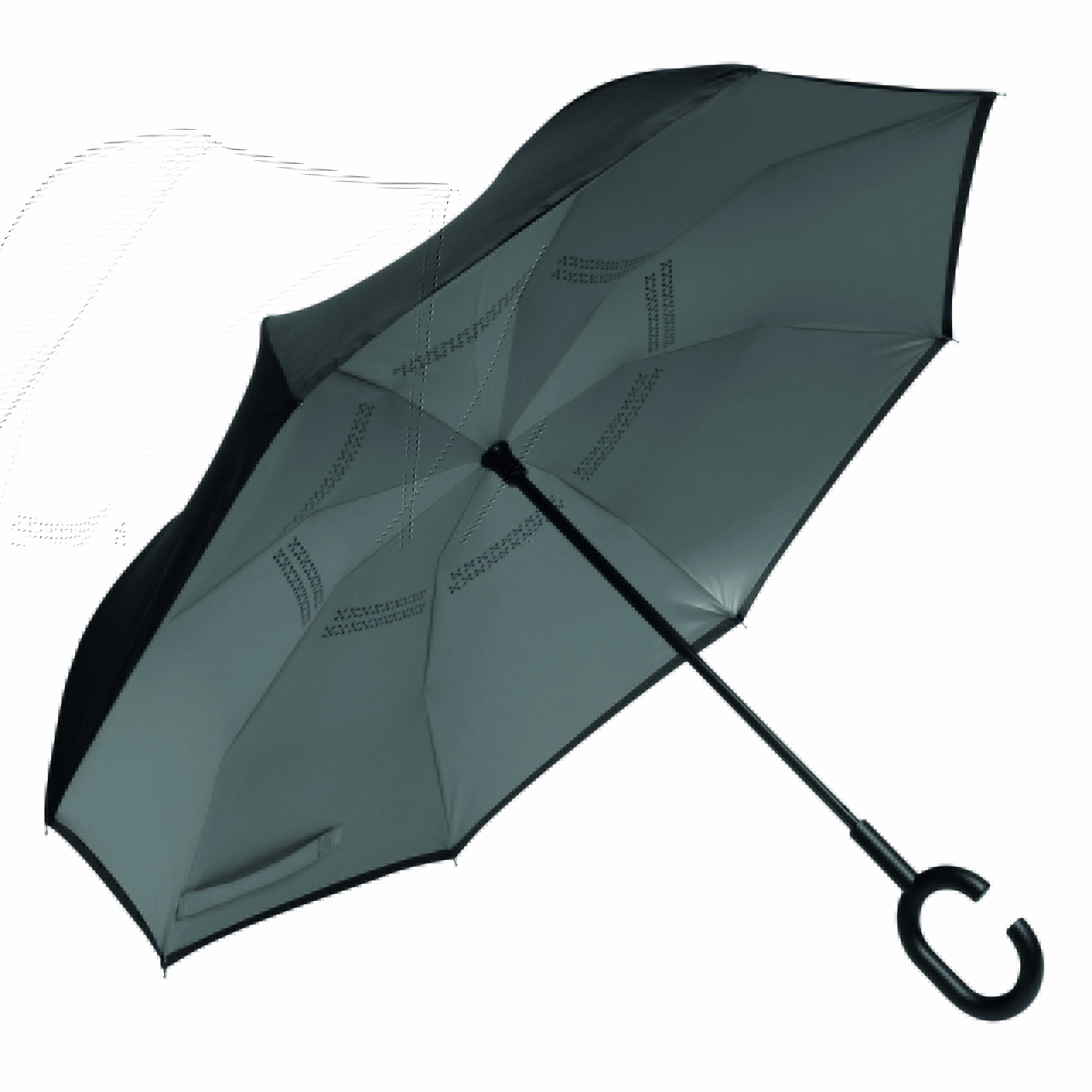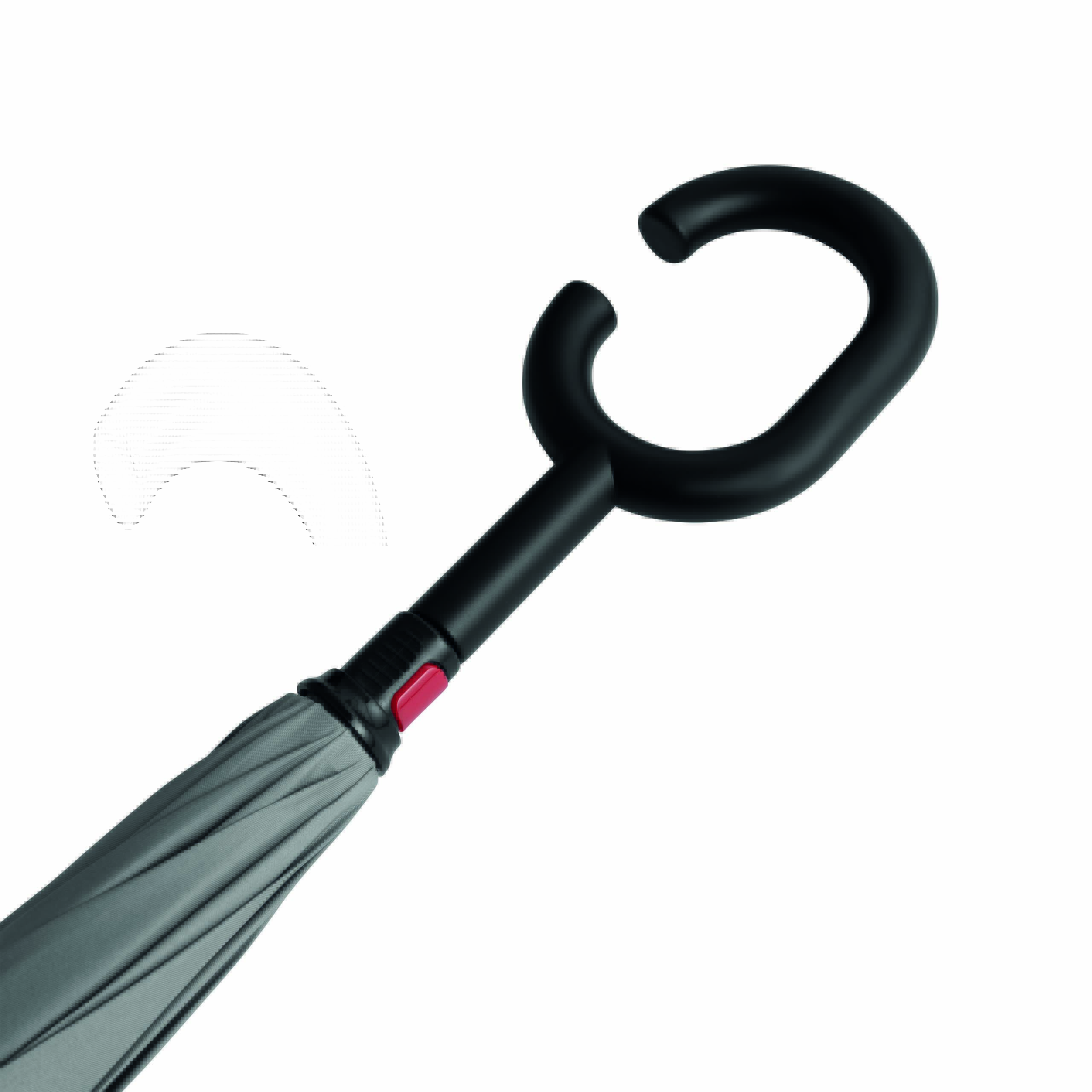 Parasol FLIPPED odwrotnie otwierany, z automatycznym mechanizmem zamykającym, z zabezpieczeniem, z uchwytem w kształcie litery C, dzięki któremu dłonie pozostają wolne, z podwójną, wentylowaną powłoką, metalową laską, szynami z włókna szklanego, metalowymi kolcami. Poszycie z poliestru-pongee, zapinany na rzep.