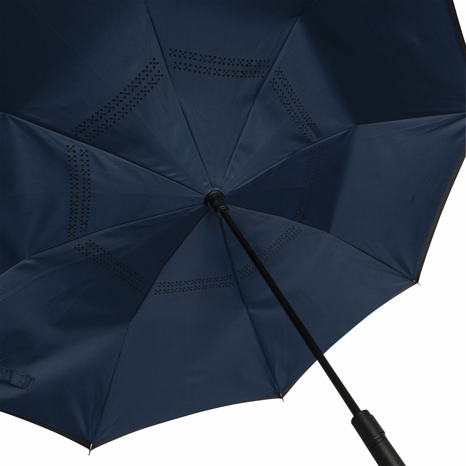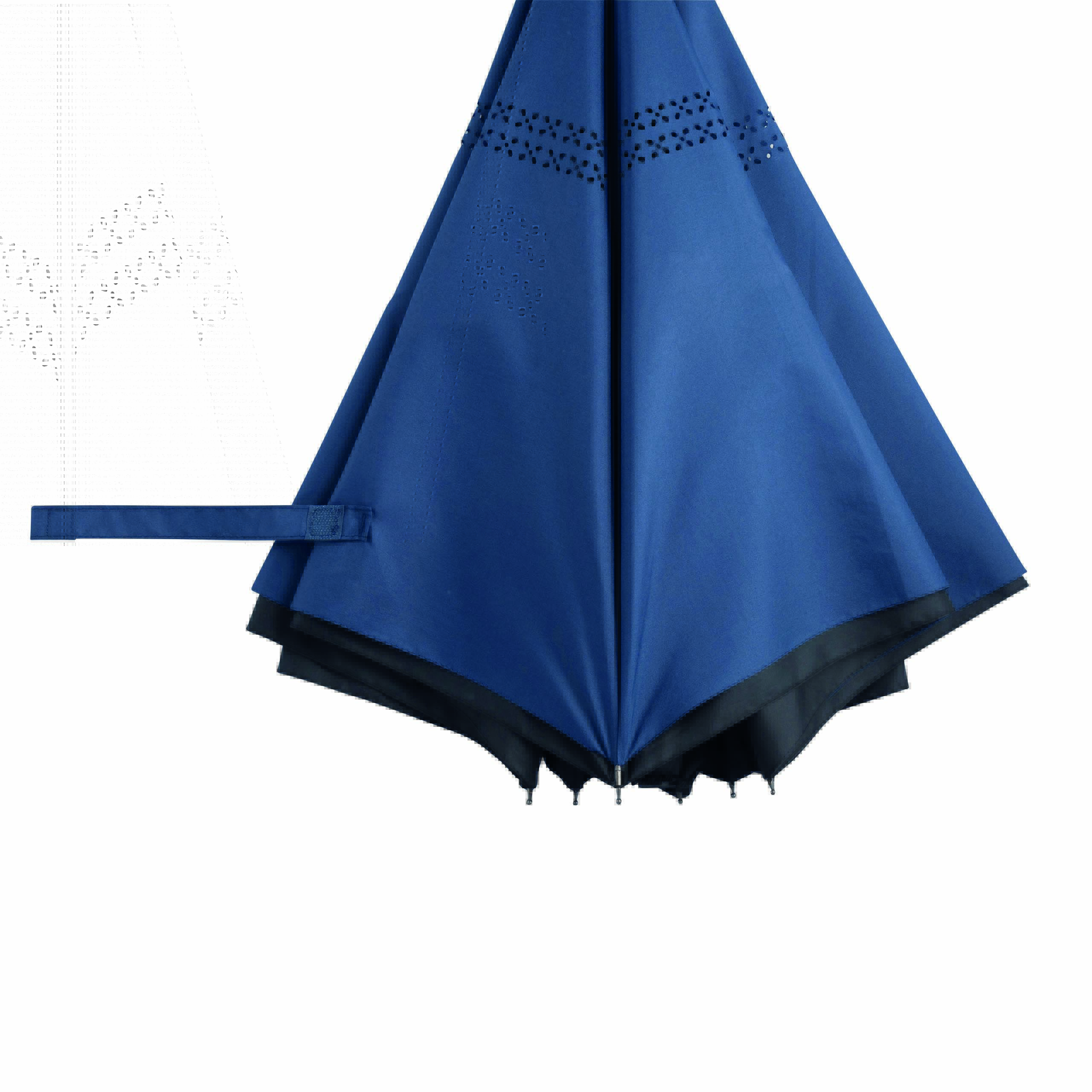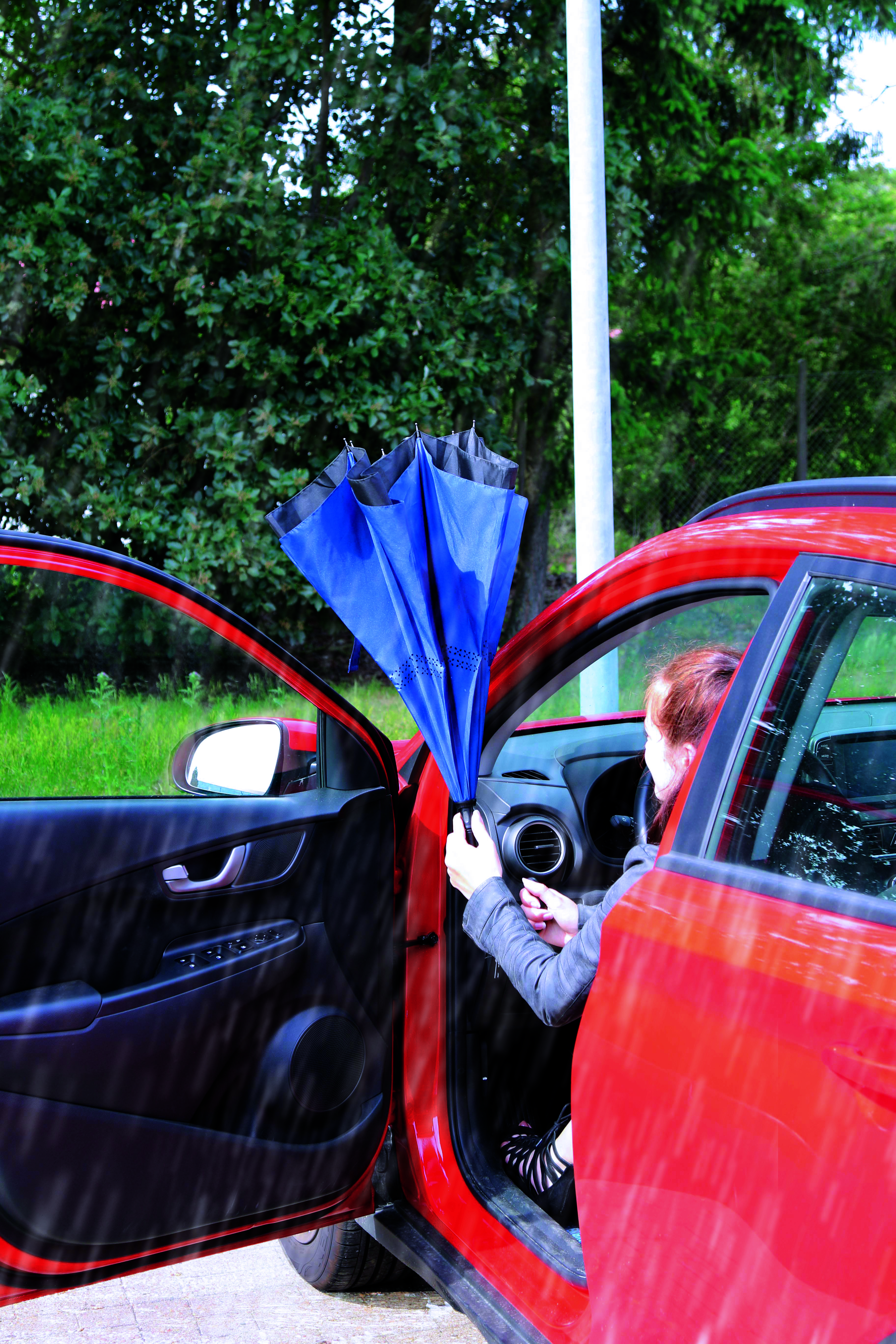 Parasol automatyczny OPPOSITE odwrotnie otwierany, z automatycznym mechanizmem zamykającym, z zabezpieczeniem, z podwójną, wentylowaną powłoką, metalową laską, szynami z włókna szklanego, metalowymi kolcami i plastikowym uchwytem. Poszycie z poliestru-pongee, zapinany na rzep.
