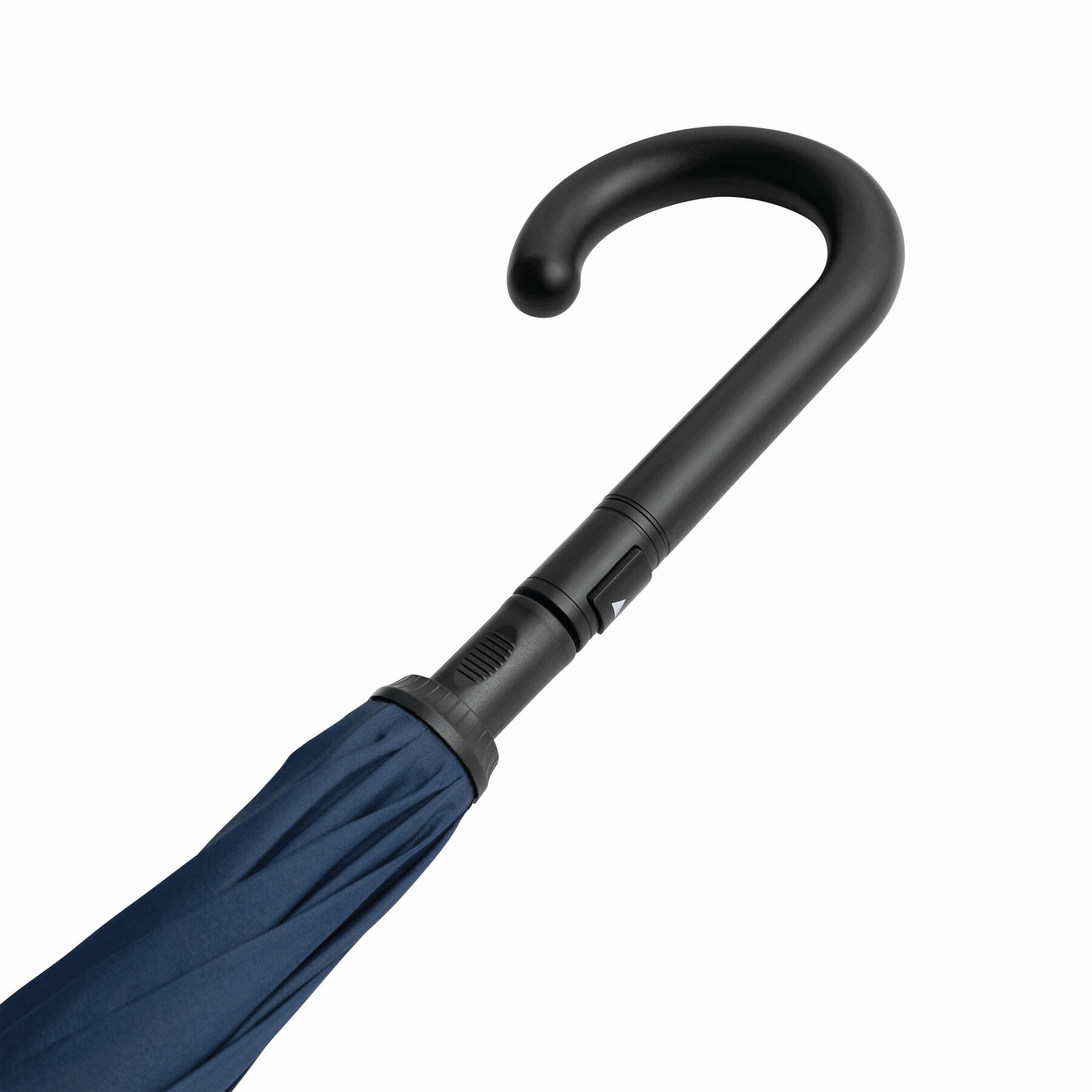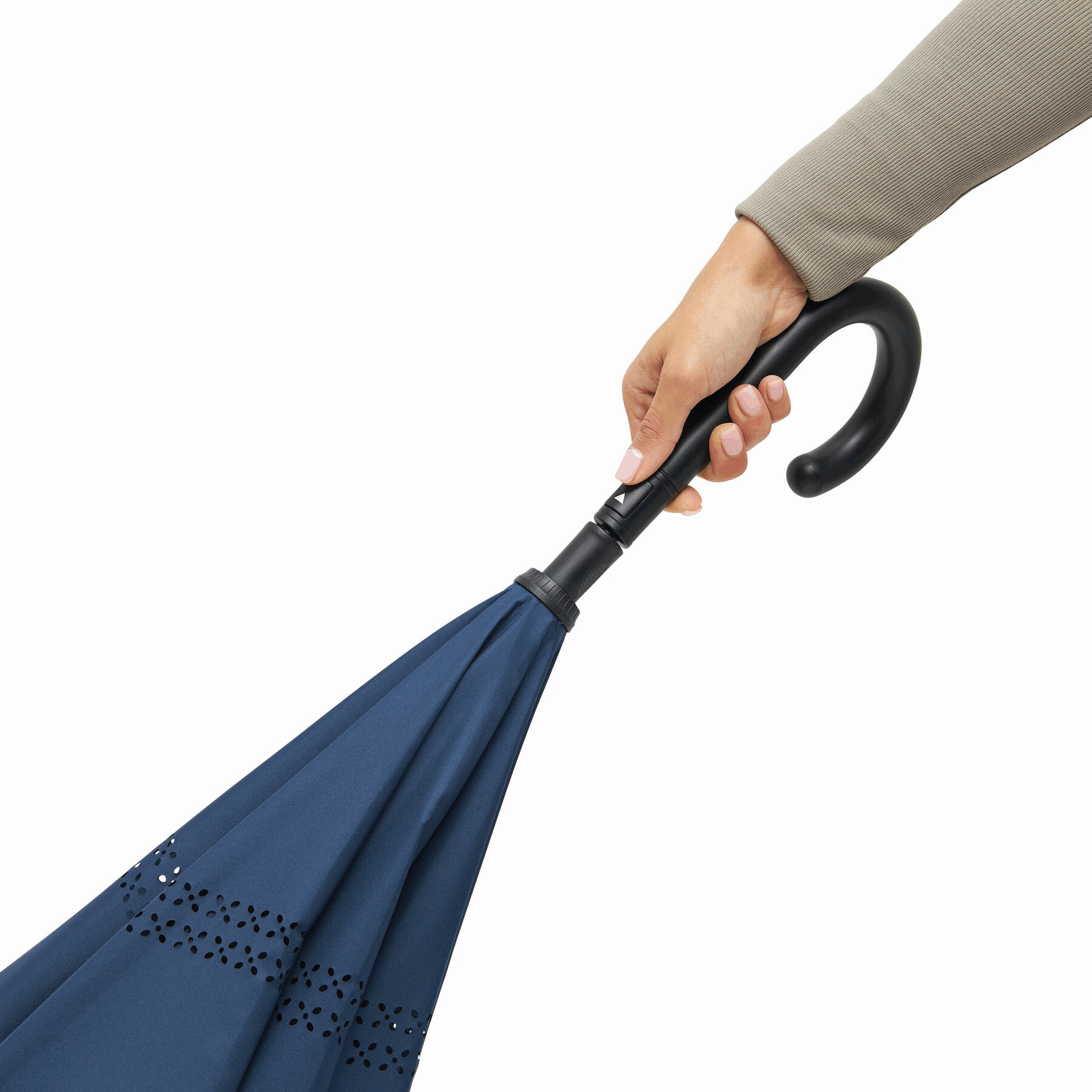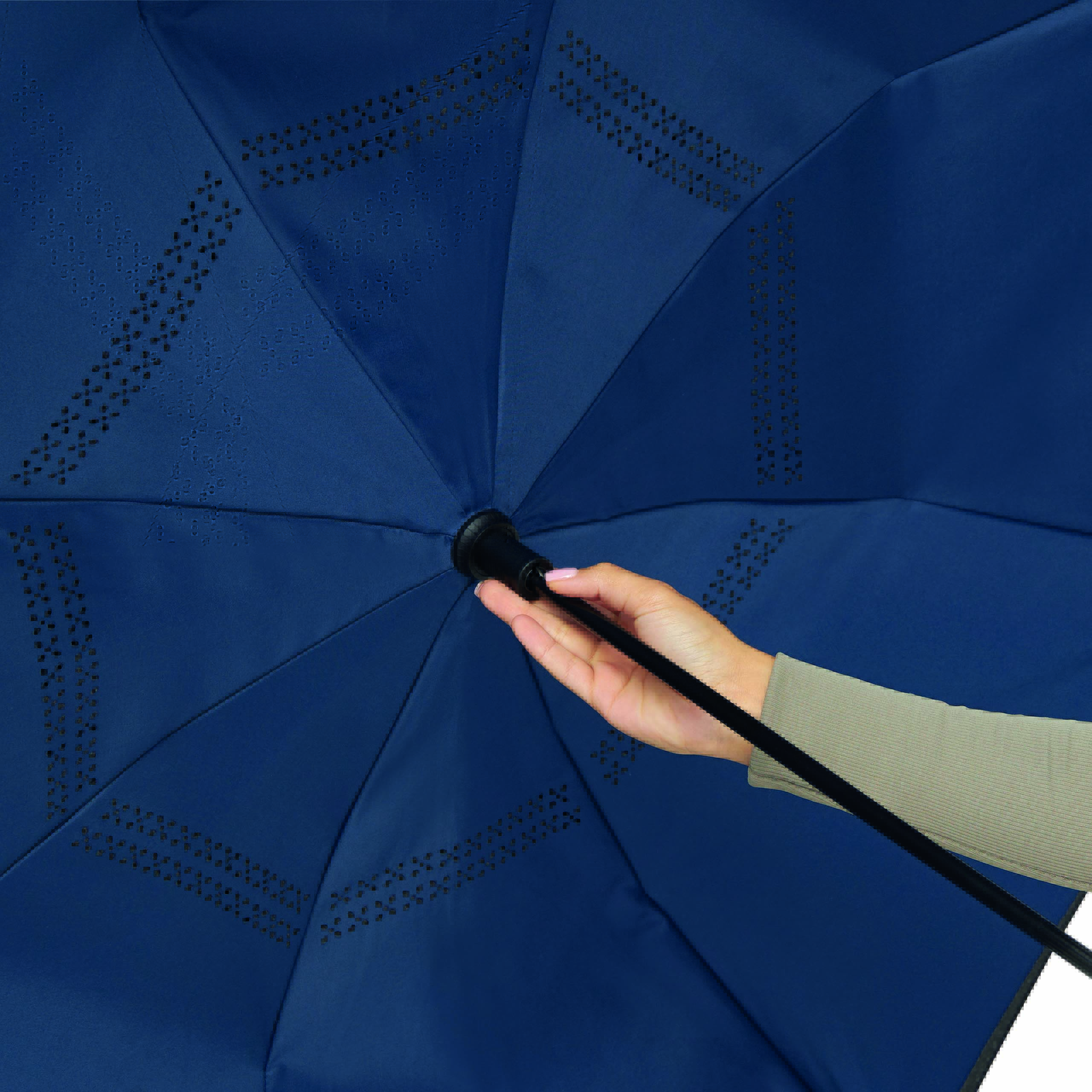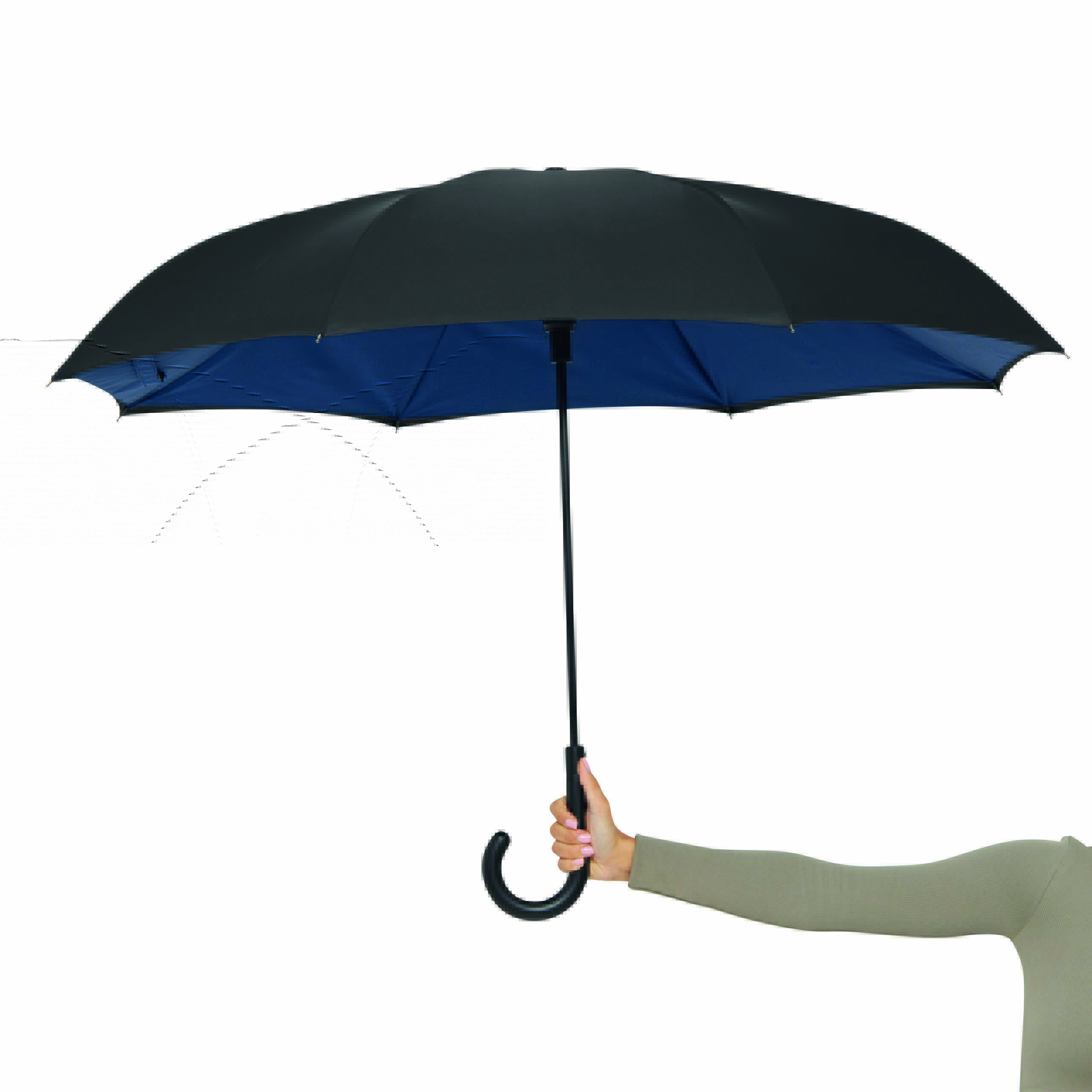 Parasol automatyczny OPPOSITE odwrotnie otwierany, z automatycznym mechanizmem zamykającym, z zabezpieczeniem, z podwójną, wentylowaną powłoką, metalową laską, szynami z włókna szklanego, metalowymi kolcami i plastikowym uchwytem. Poszycie z poliestru-pongee, zapinany na rzep.