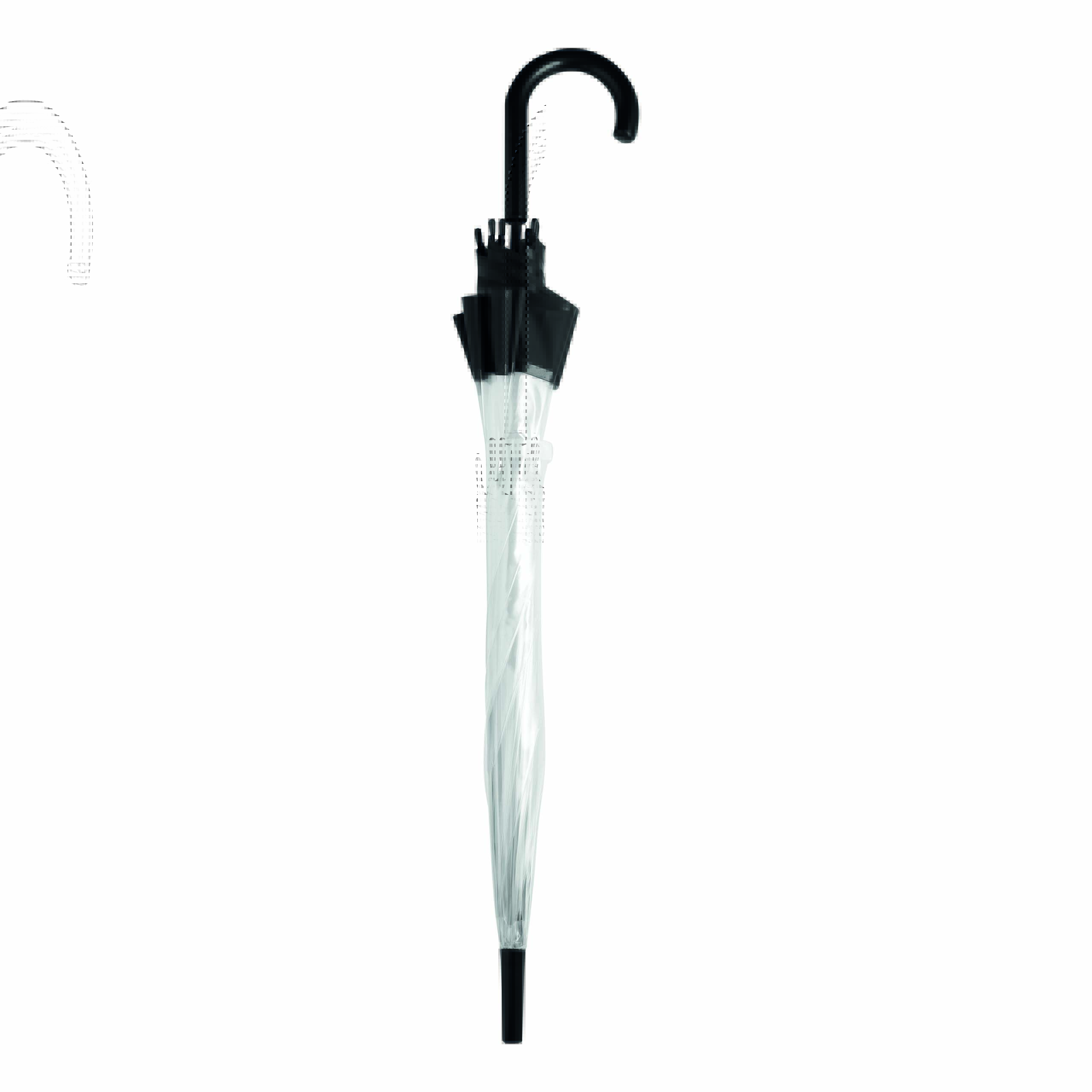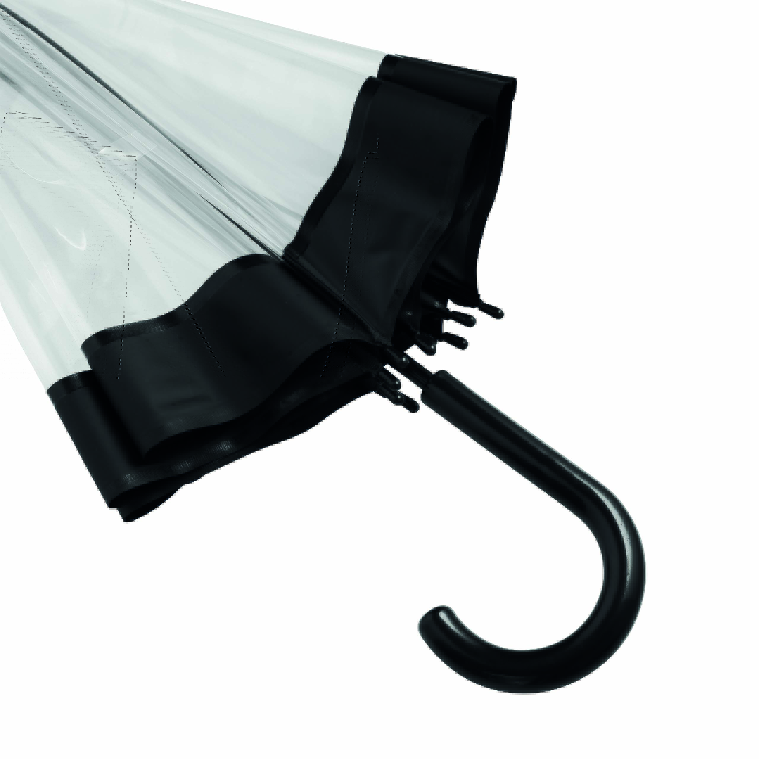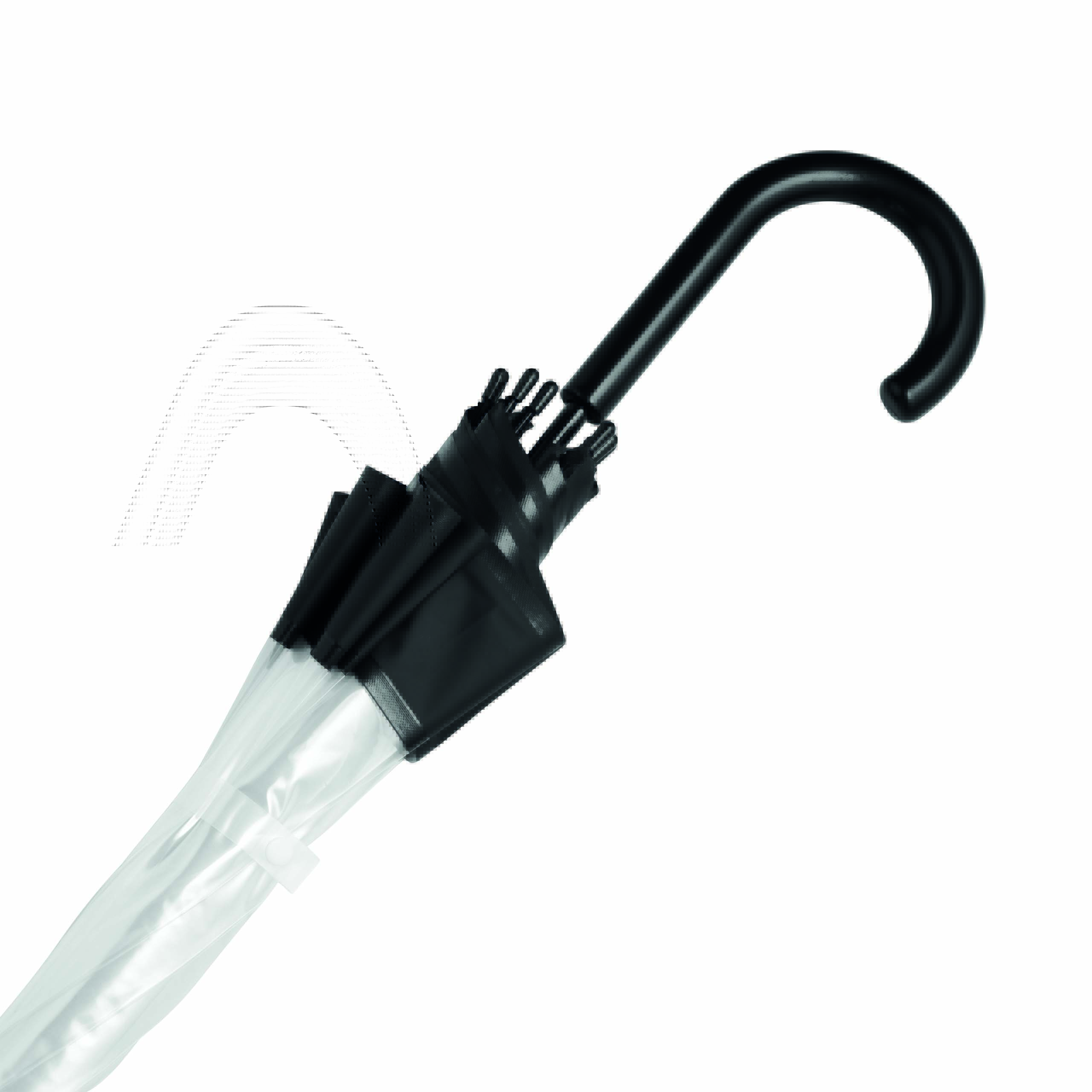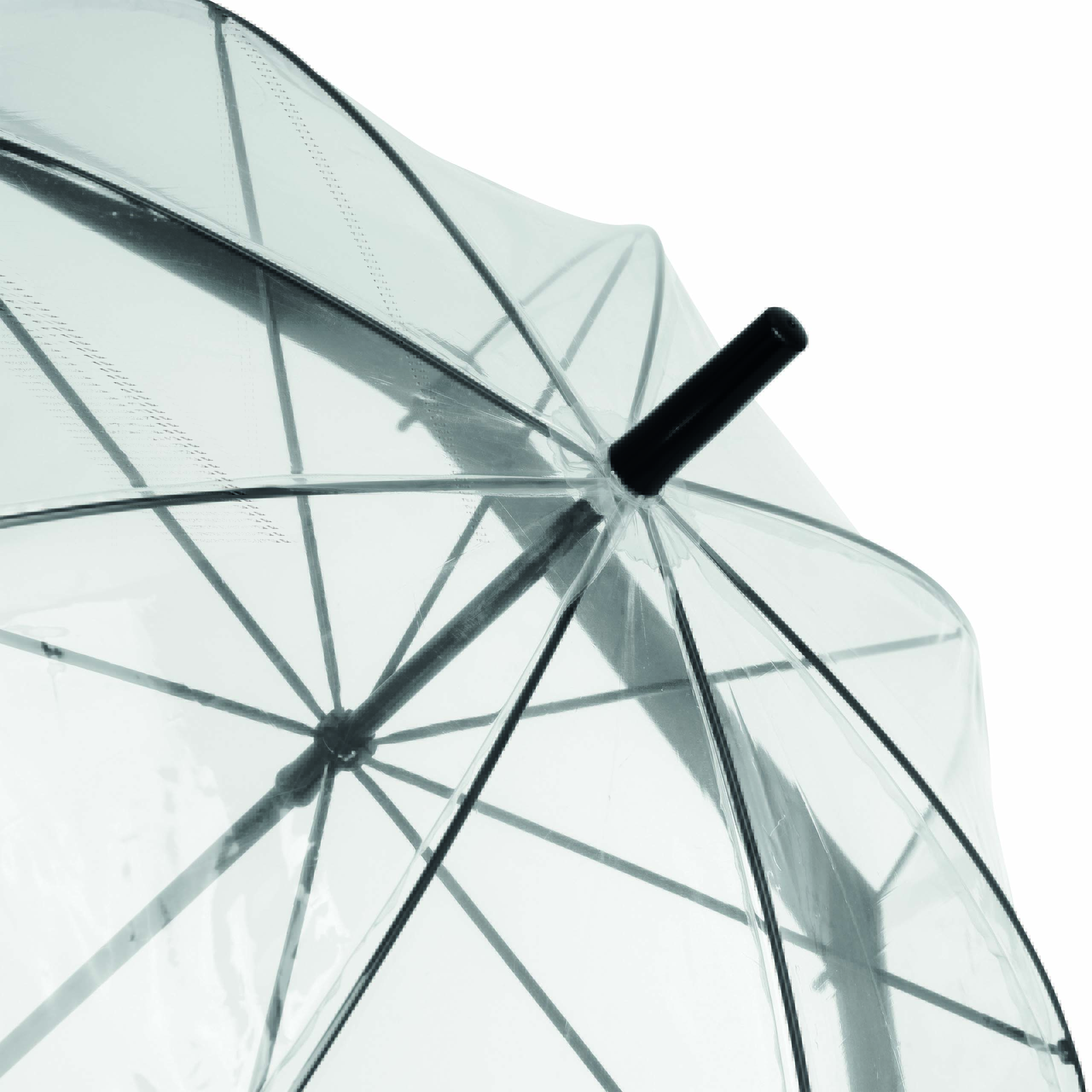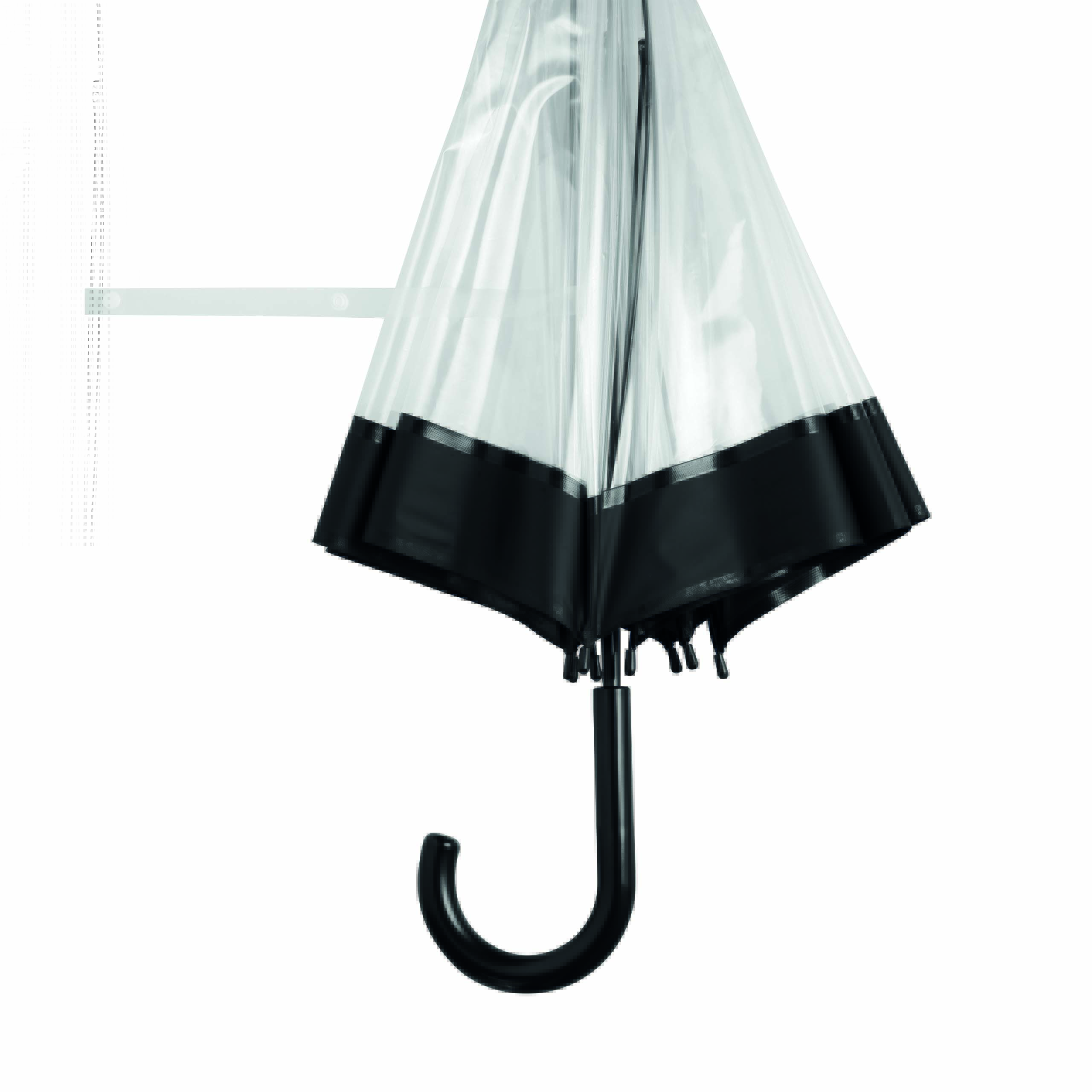 Parasol HONEYMOON z zaokrąglonym, plastikowym uchwytem, z metalową laską i szynami, plastikowe kolce. Poszycie z transparentnej folii POE z kolorową obwódką i paskiem spinającym zapinanym na zatrzask