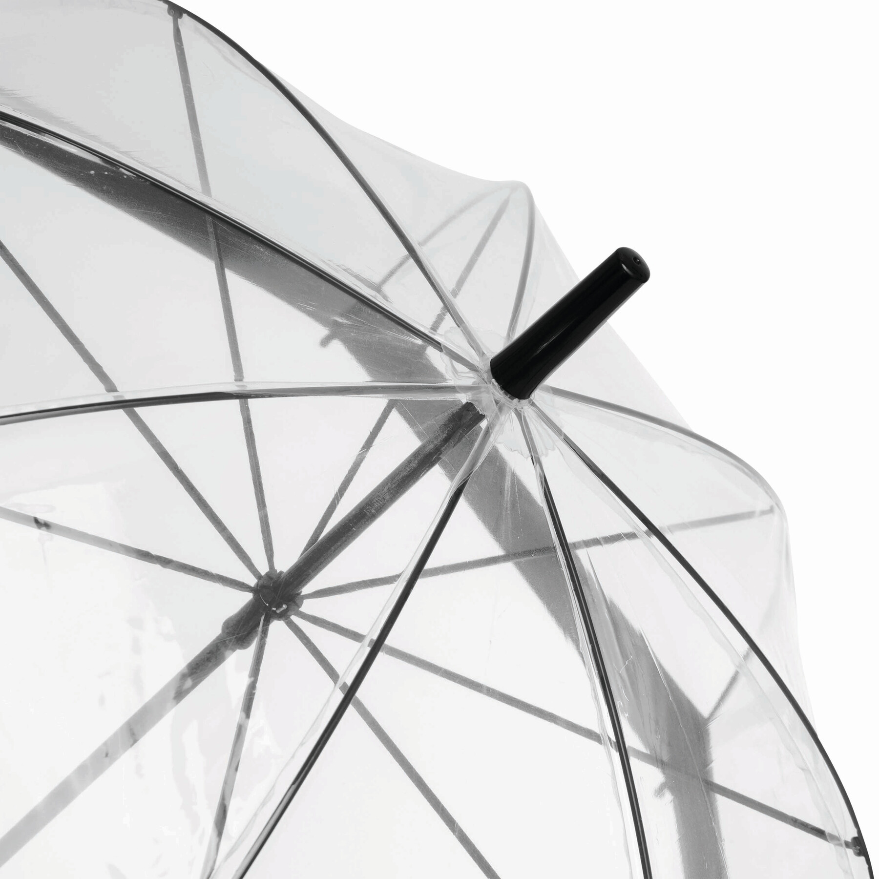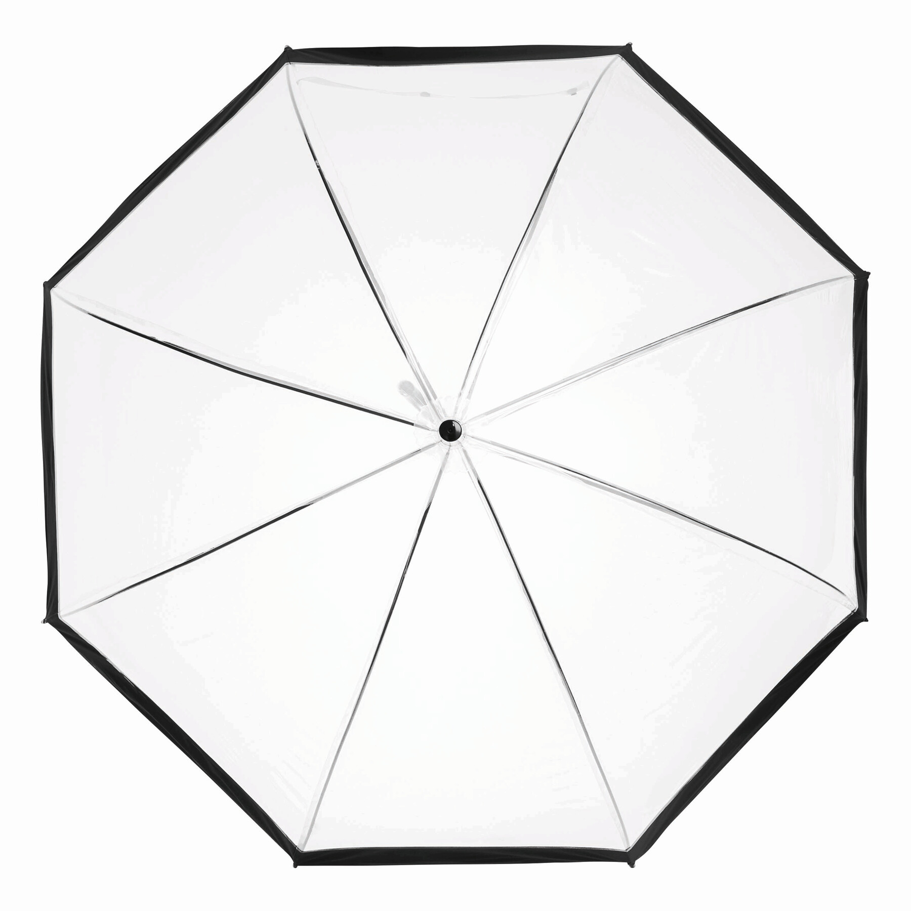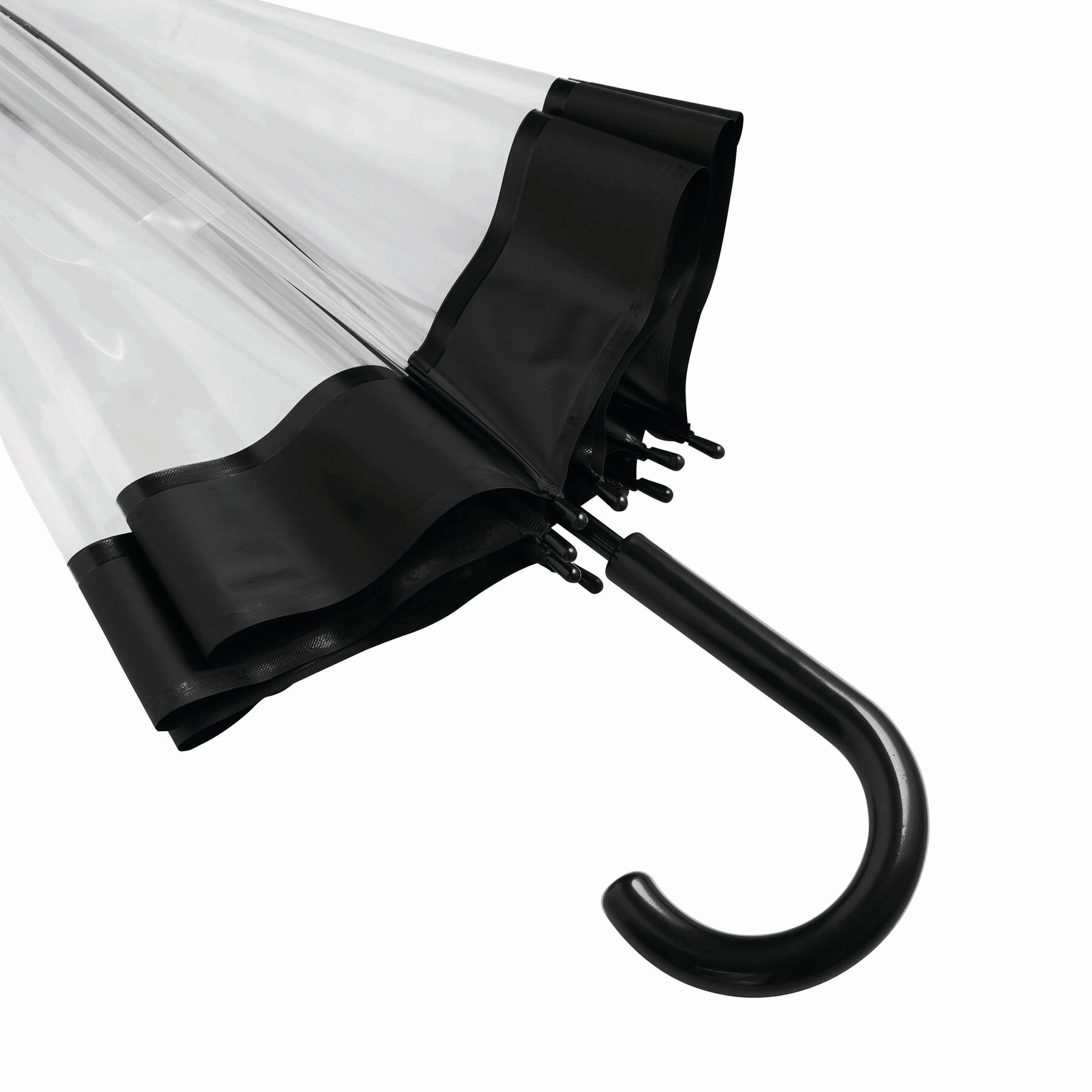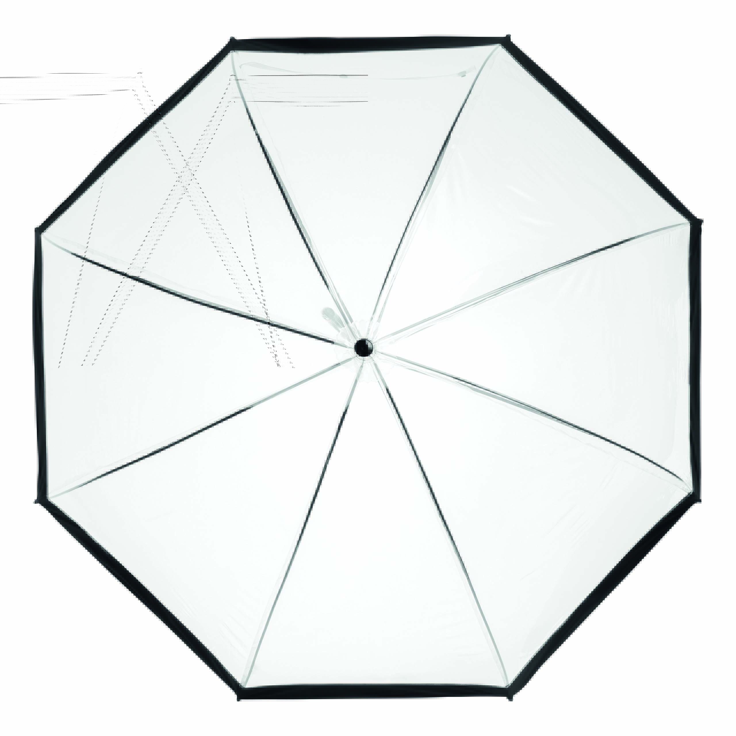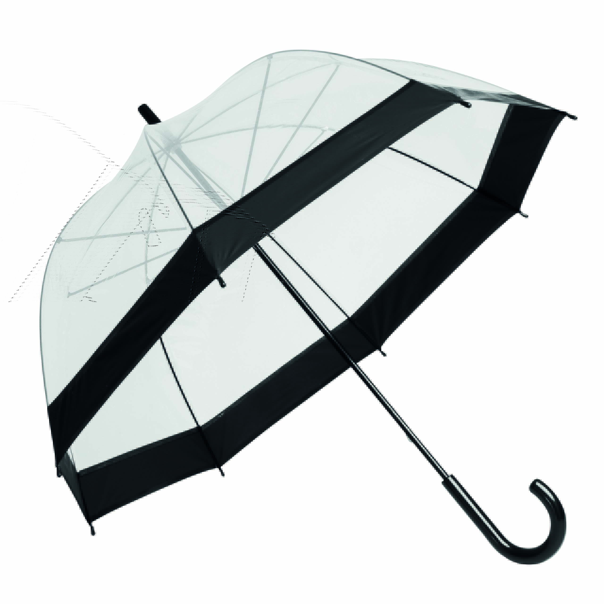 Parasol HONEYMOON z zaokrąglonym, plastikowym uchwytem, z metalową laską i szynami, plastikowe kolce. Poszycie z transparentnej folii POE z kolorową obwódką i paskiem spinającym zapinanym na zatrzask