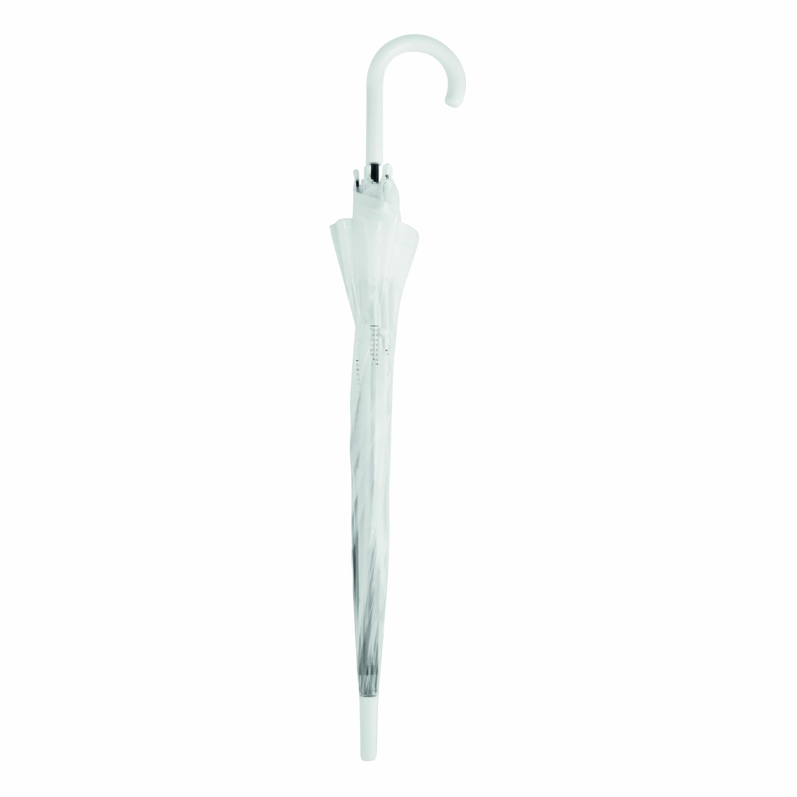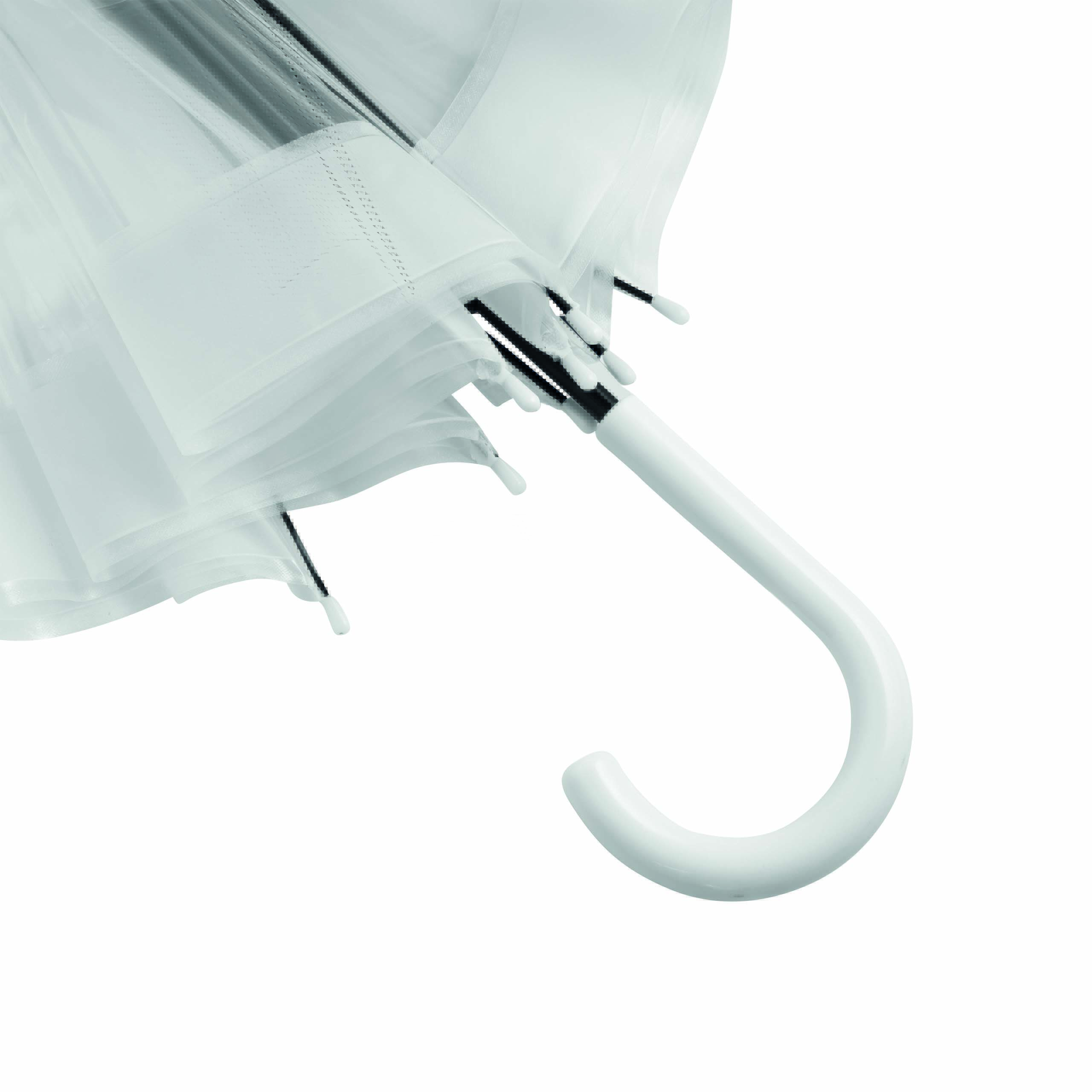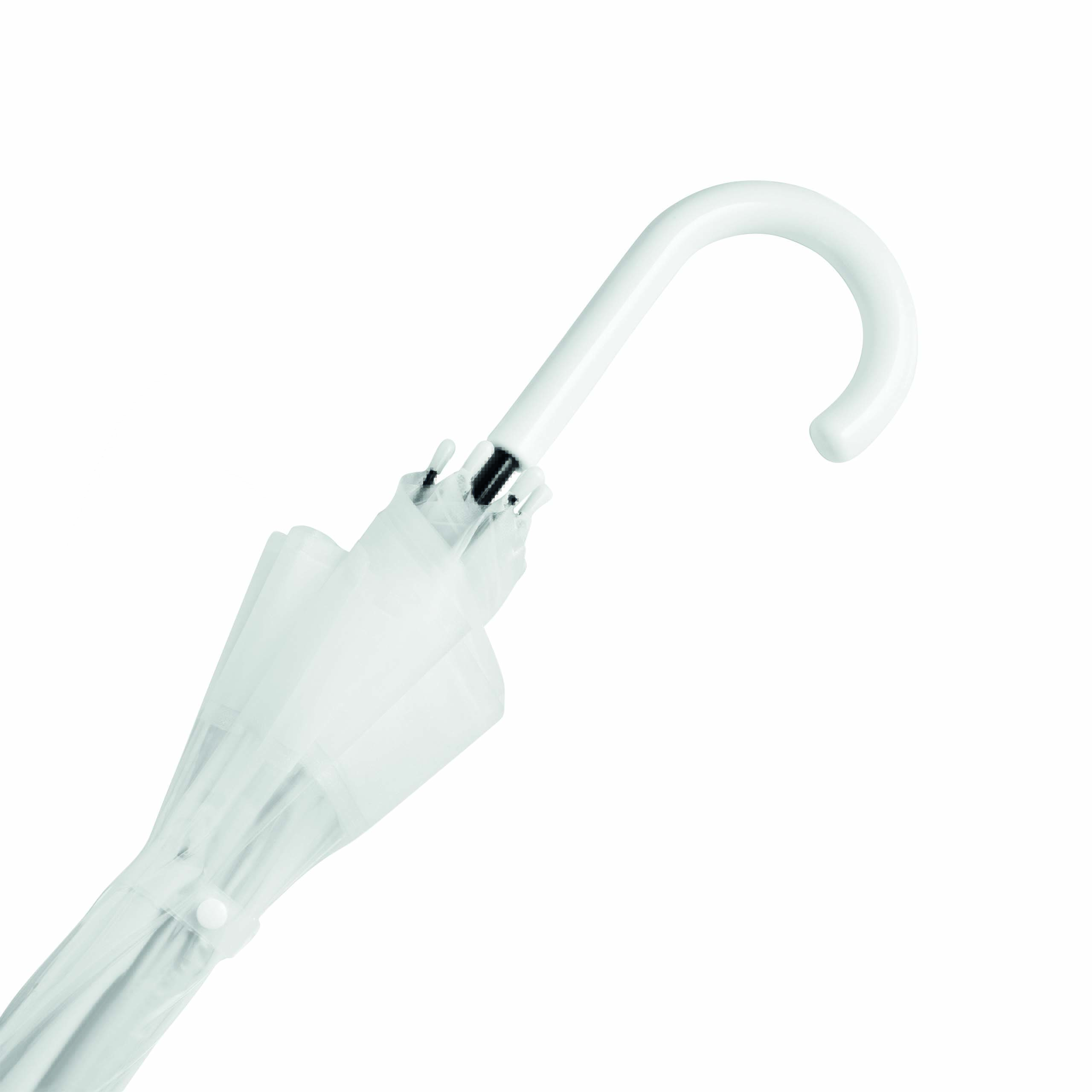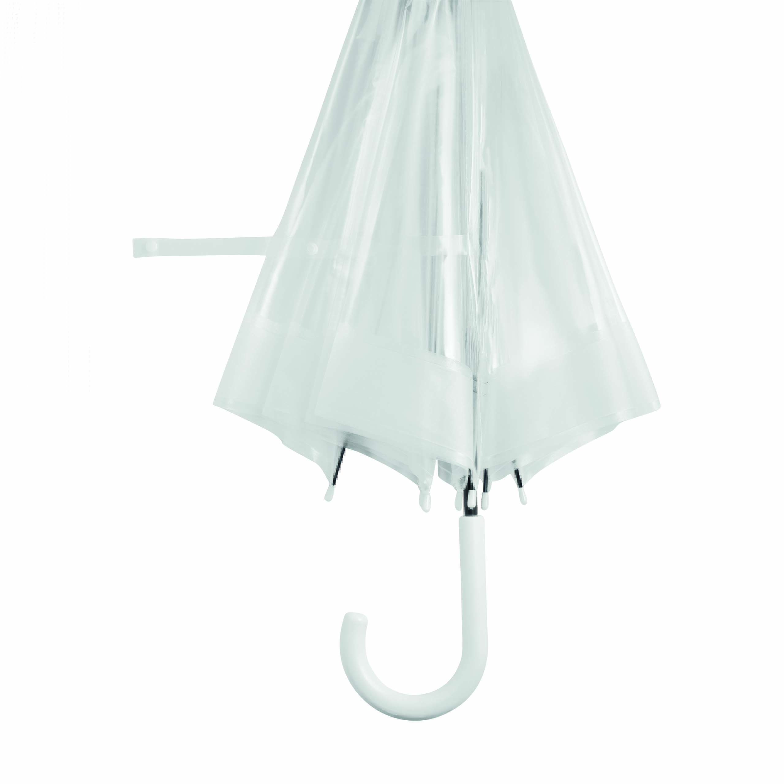 Parasol HONEYMOON z zaokrąglonym, plastikowym uchwytem, z metalową laską i szynami, plastikowe kolce. Poszycie z transparentnej folii POE z kolorową obwódką i paskiem spinającym zapinanym na zatrzask