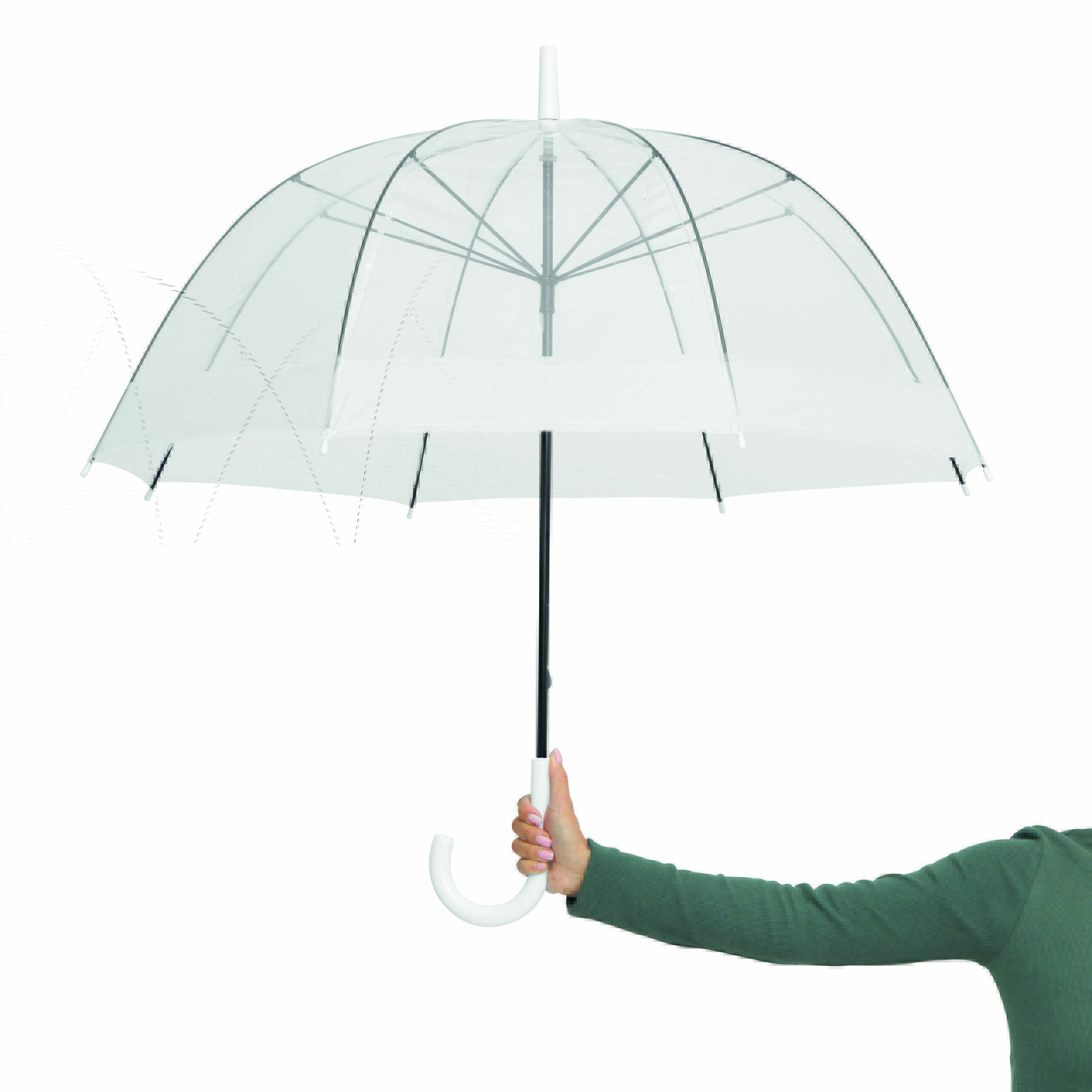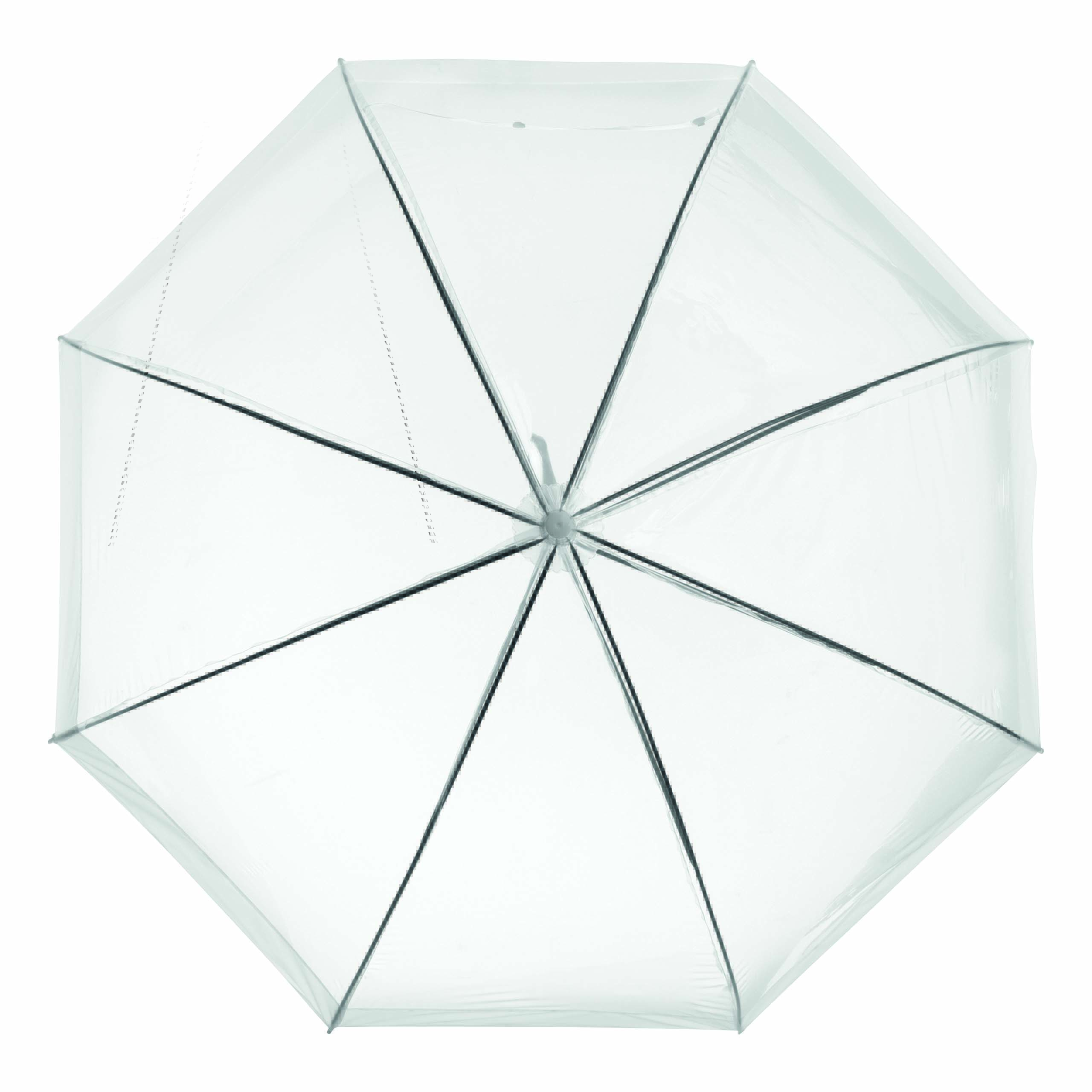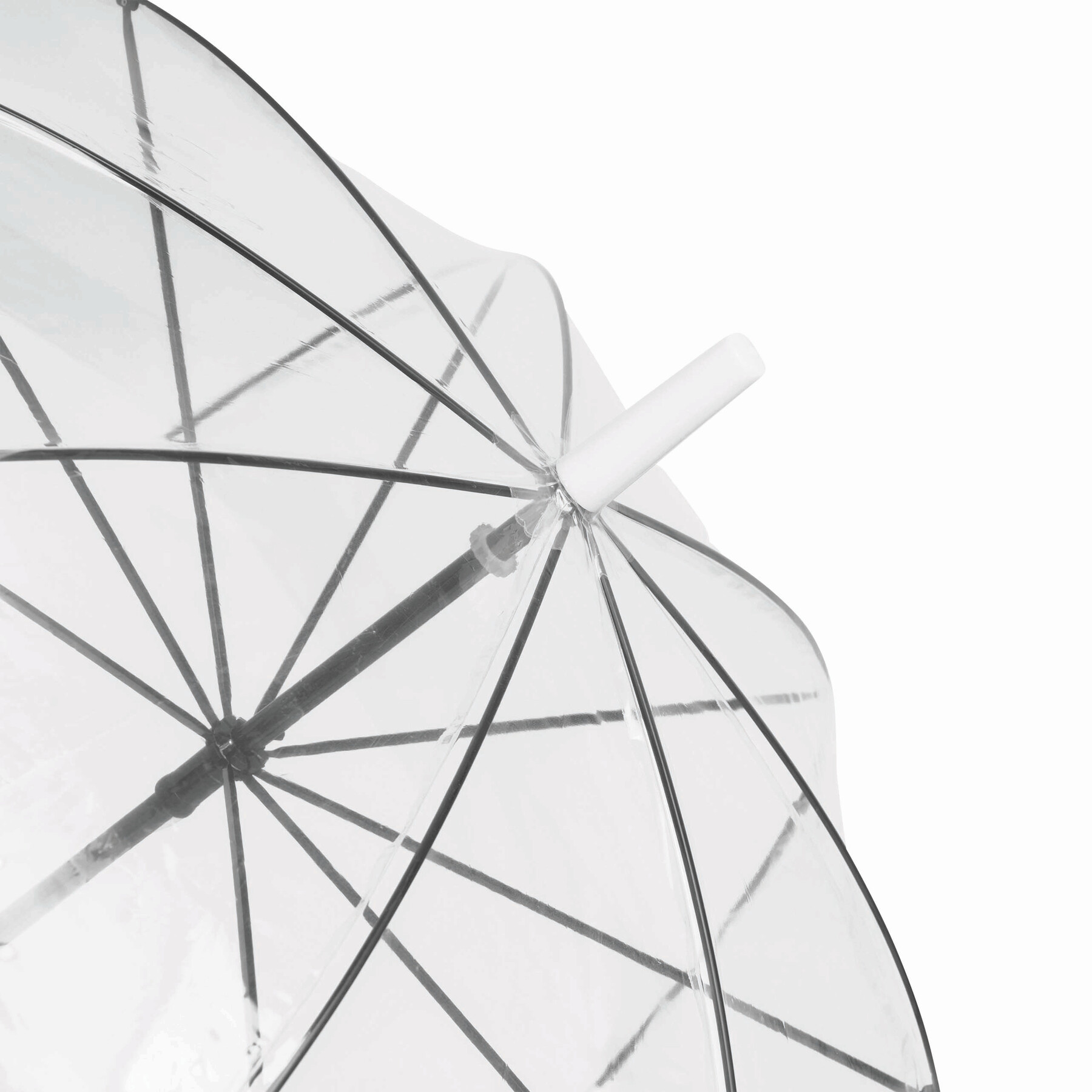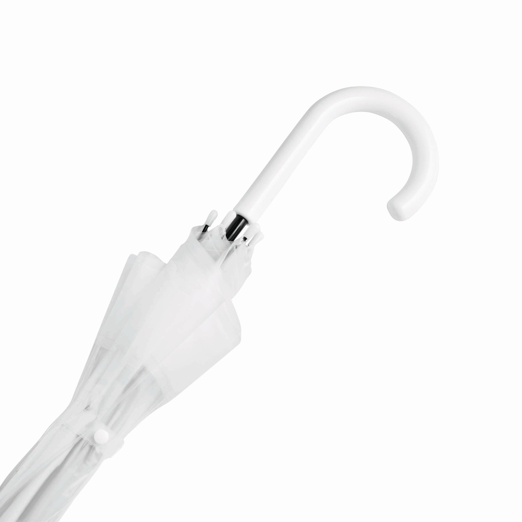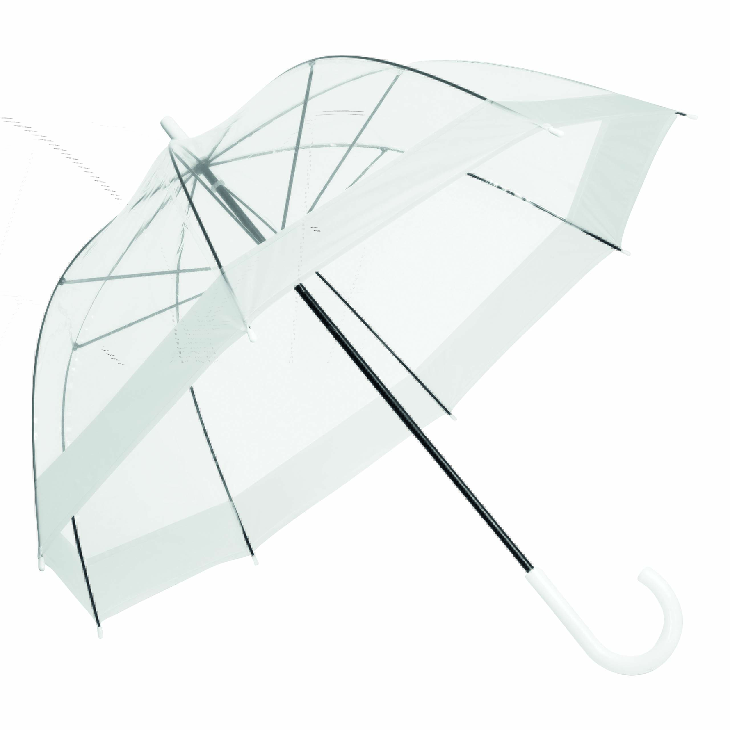 Parasol HONEYMOON z zaokrąglonym, plastikowym uchwytem, z metalową laską i szynami, plastikowe kolce. Poszycie z transparentnej folii POE z kolorową obwódką i paskiem spinającym zapinanym na zatrzask