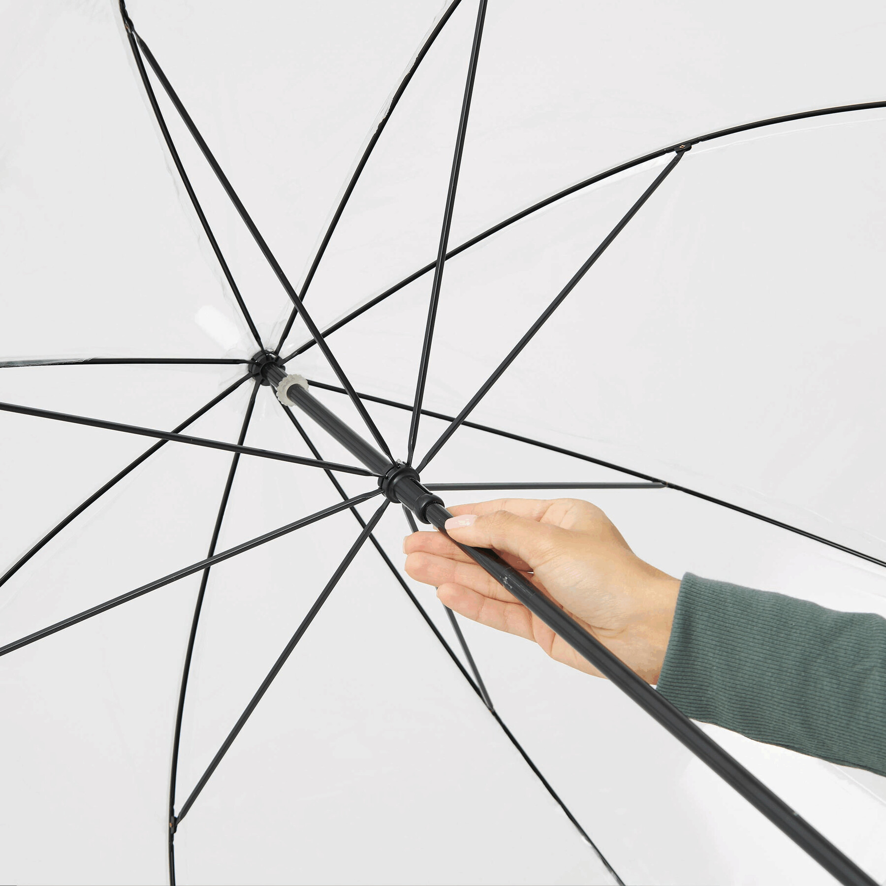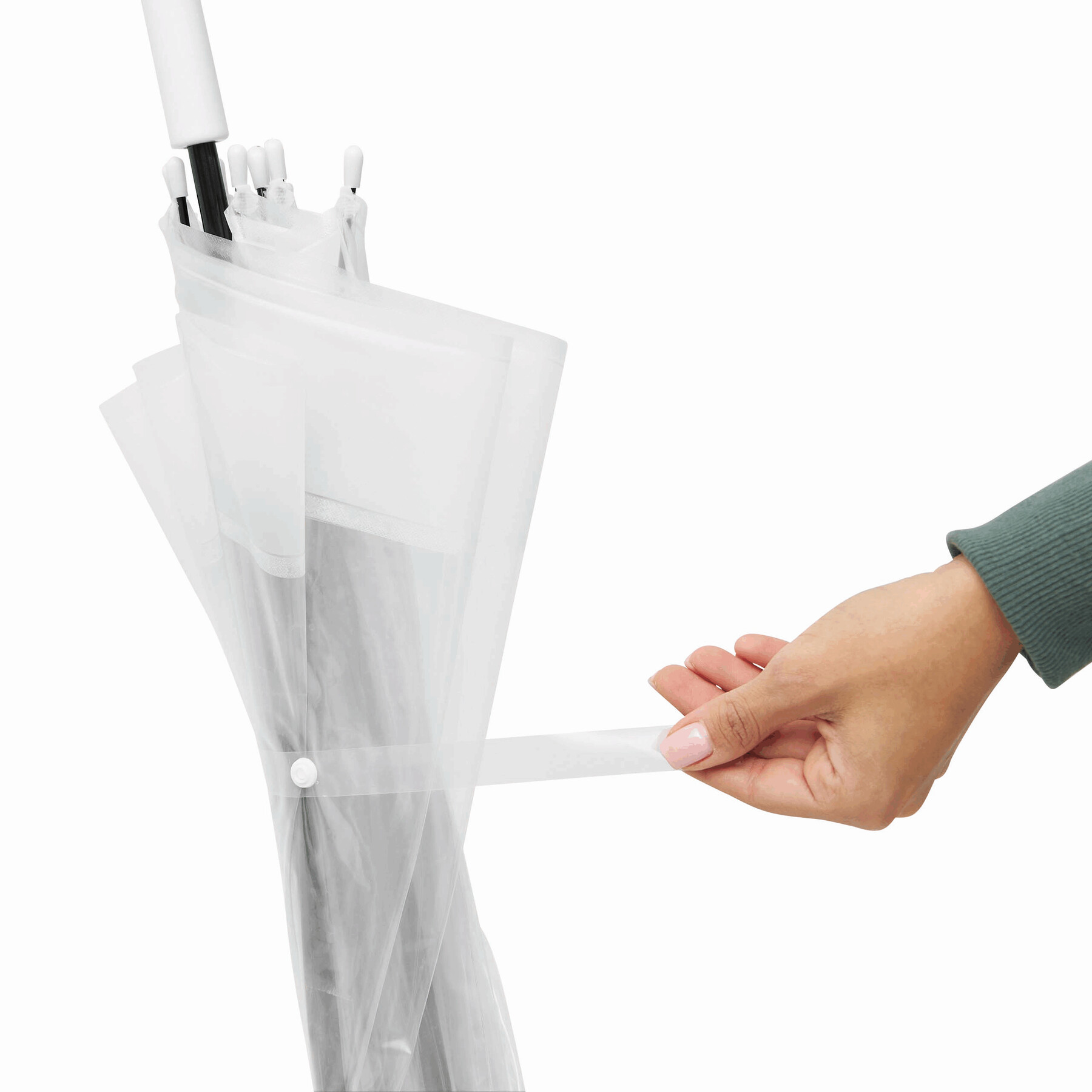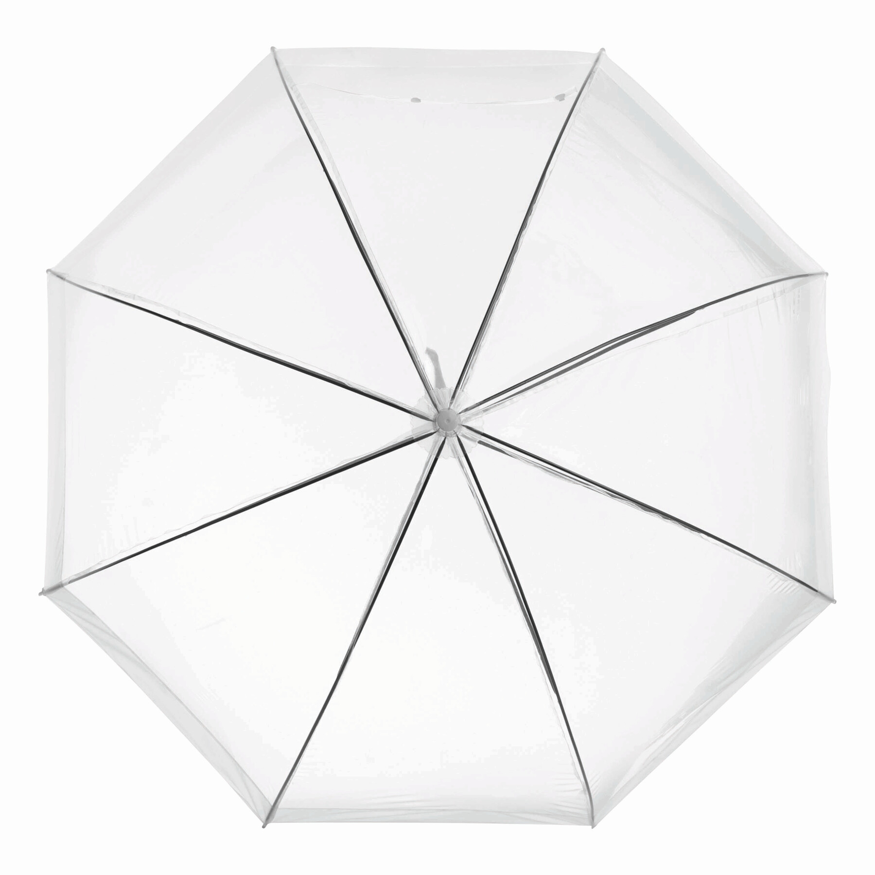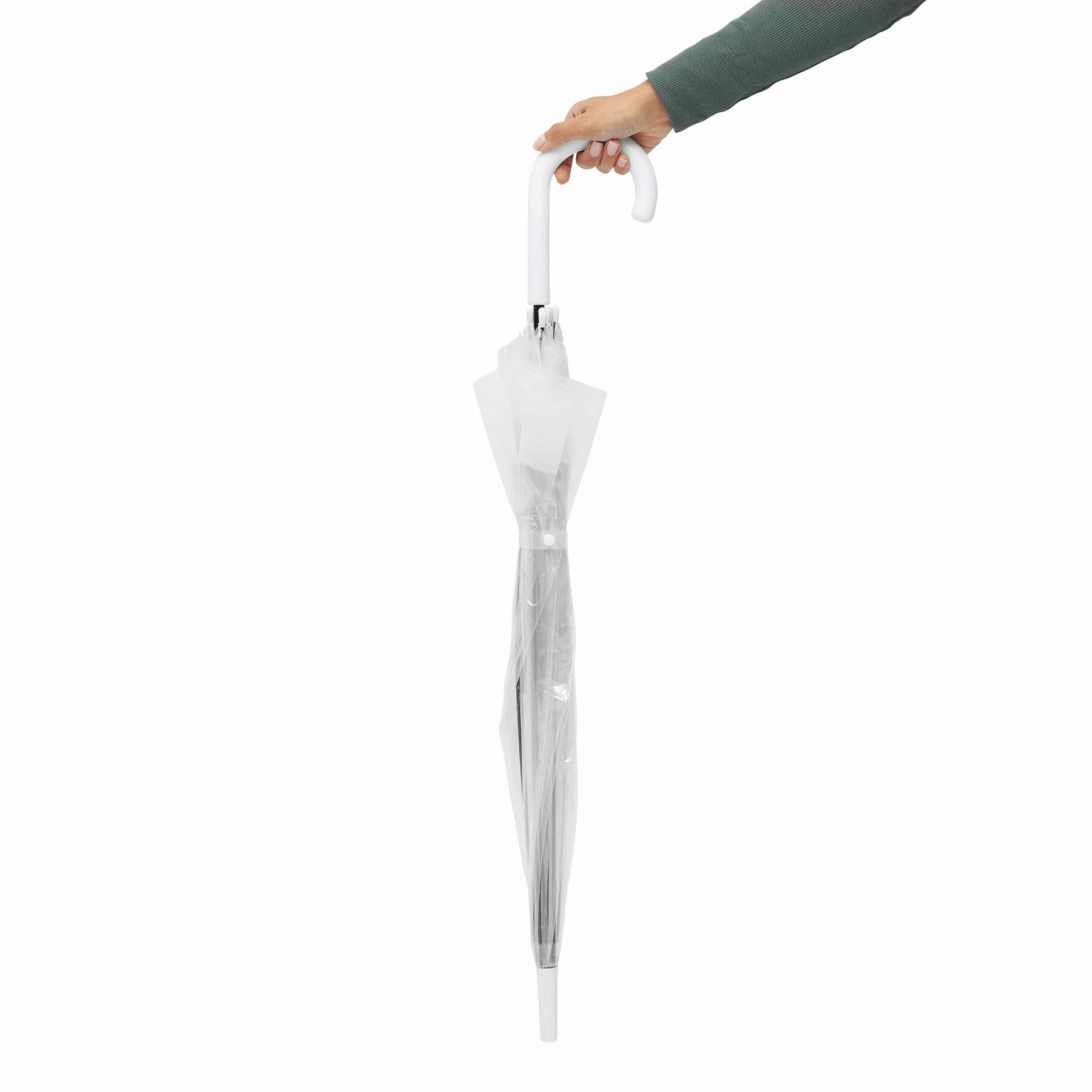 Parasol HONEYMOON z zaokrąglonym, plastikowym uchwytem, z metalową laską i szynami, plastikowe kolce. Poszycie z transparentnej folii POE z kolorową obwódką i paskiem spinającym zapinanym na zatrzask