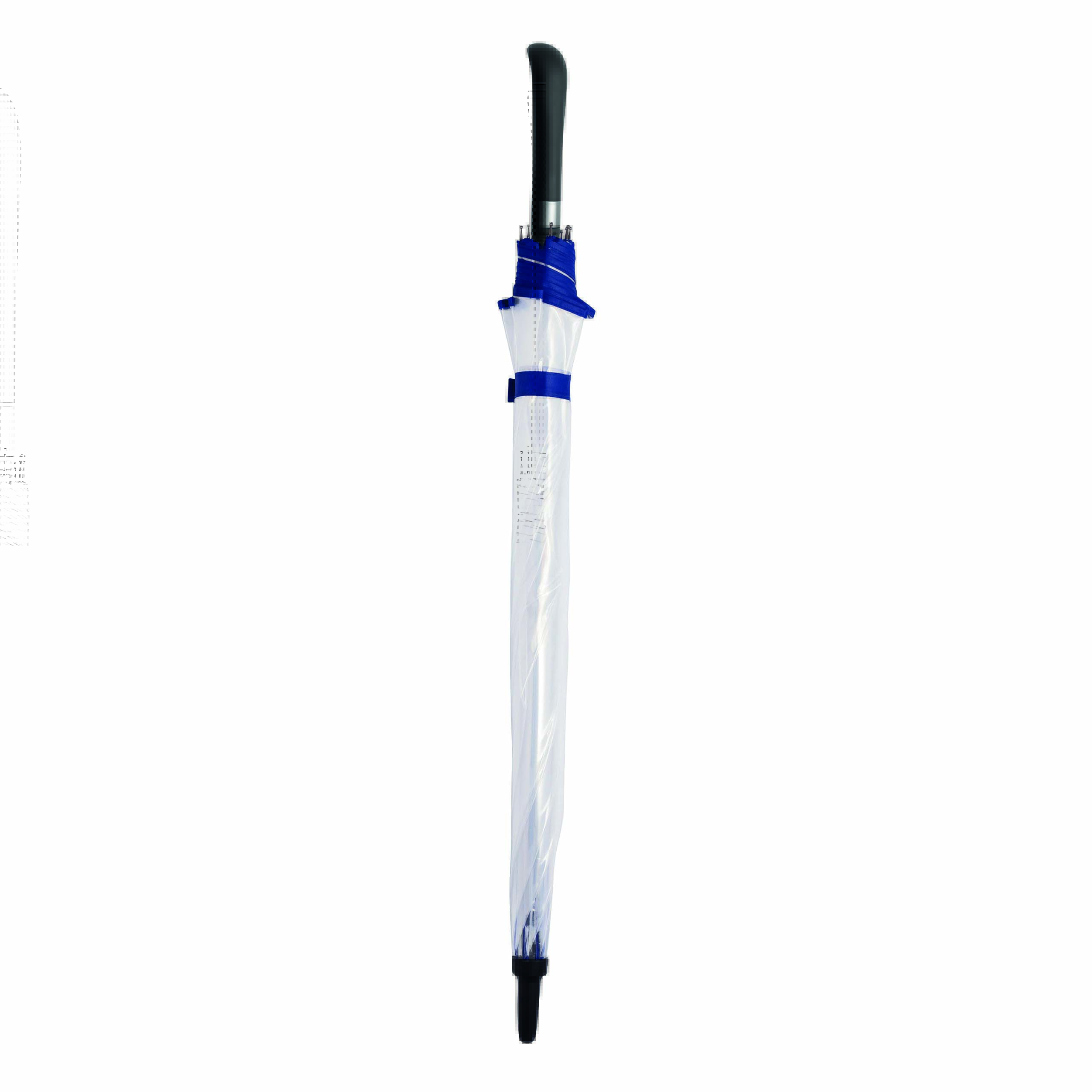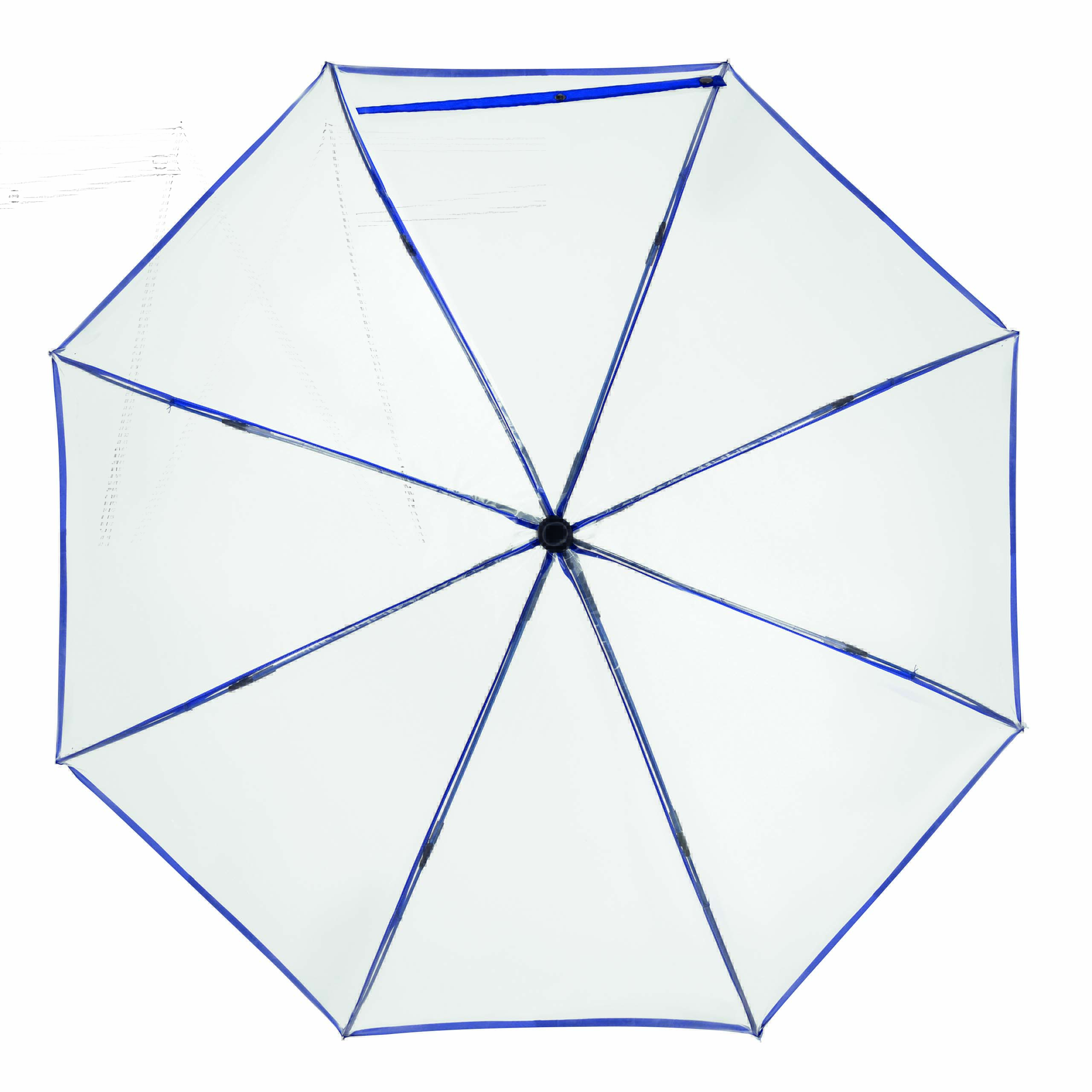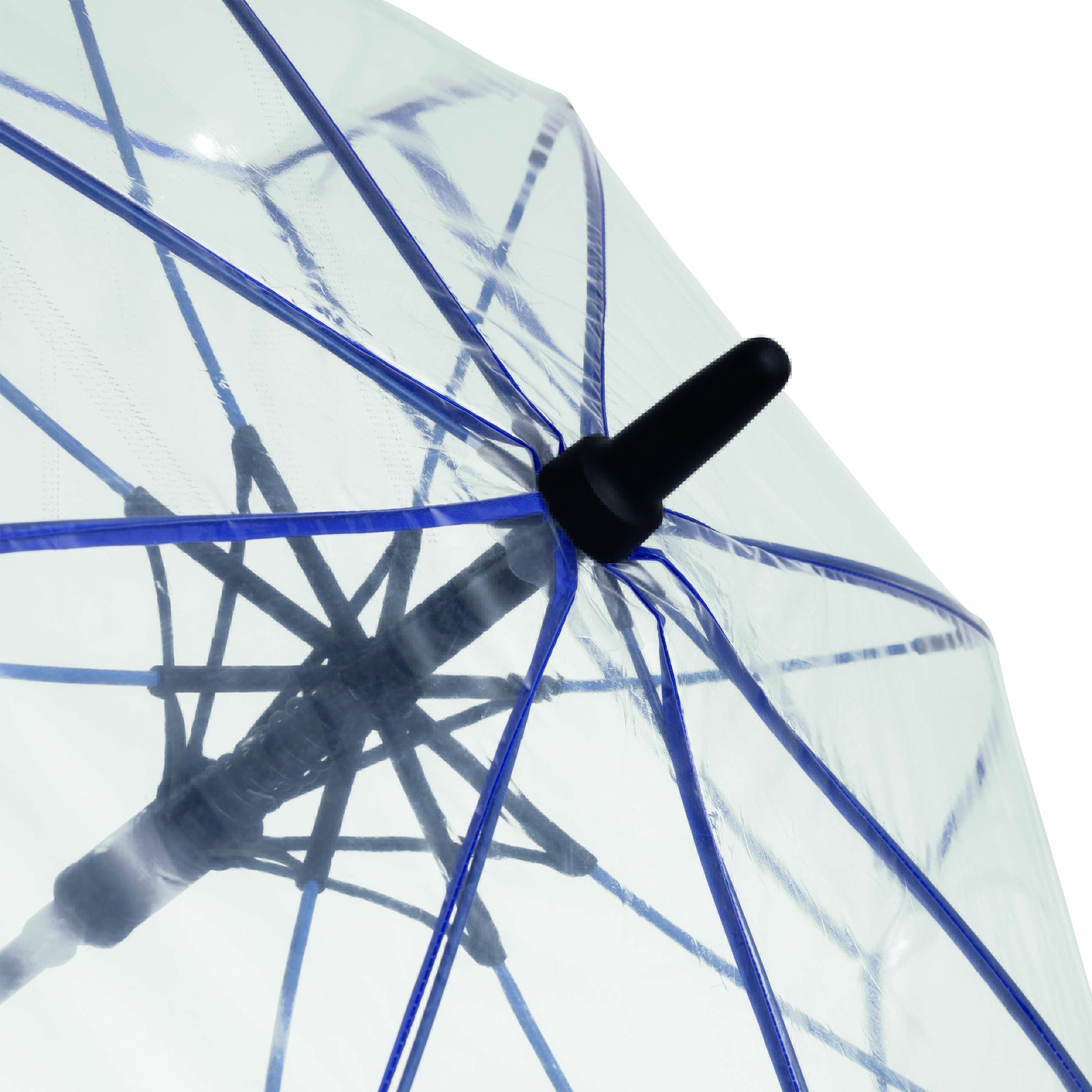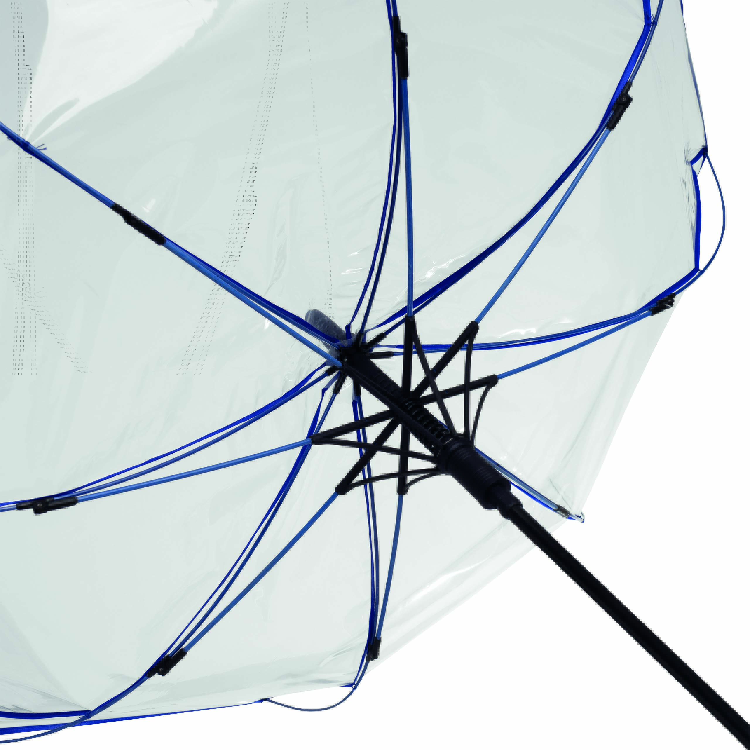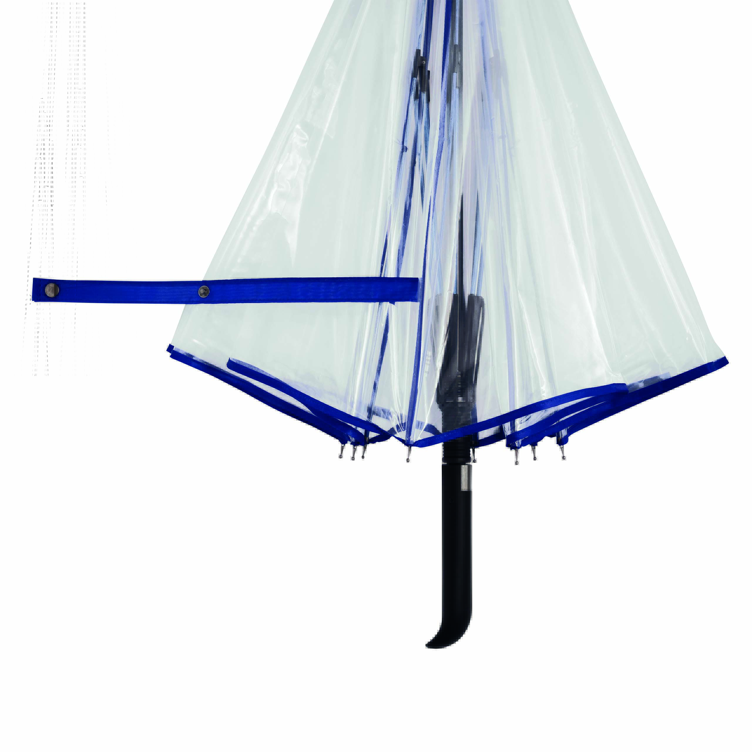 Automatyczny parasol VIP z plastikowym uchwytem, z metalową laską oraz kolorowymi szynami z segmentami z włókna szklanego, metalowymi kolcami. Poszycie z transparentnej folii POE z kolorową lamówką i paskiem spinającym zapinanym na zatrzask