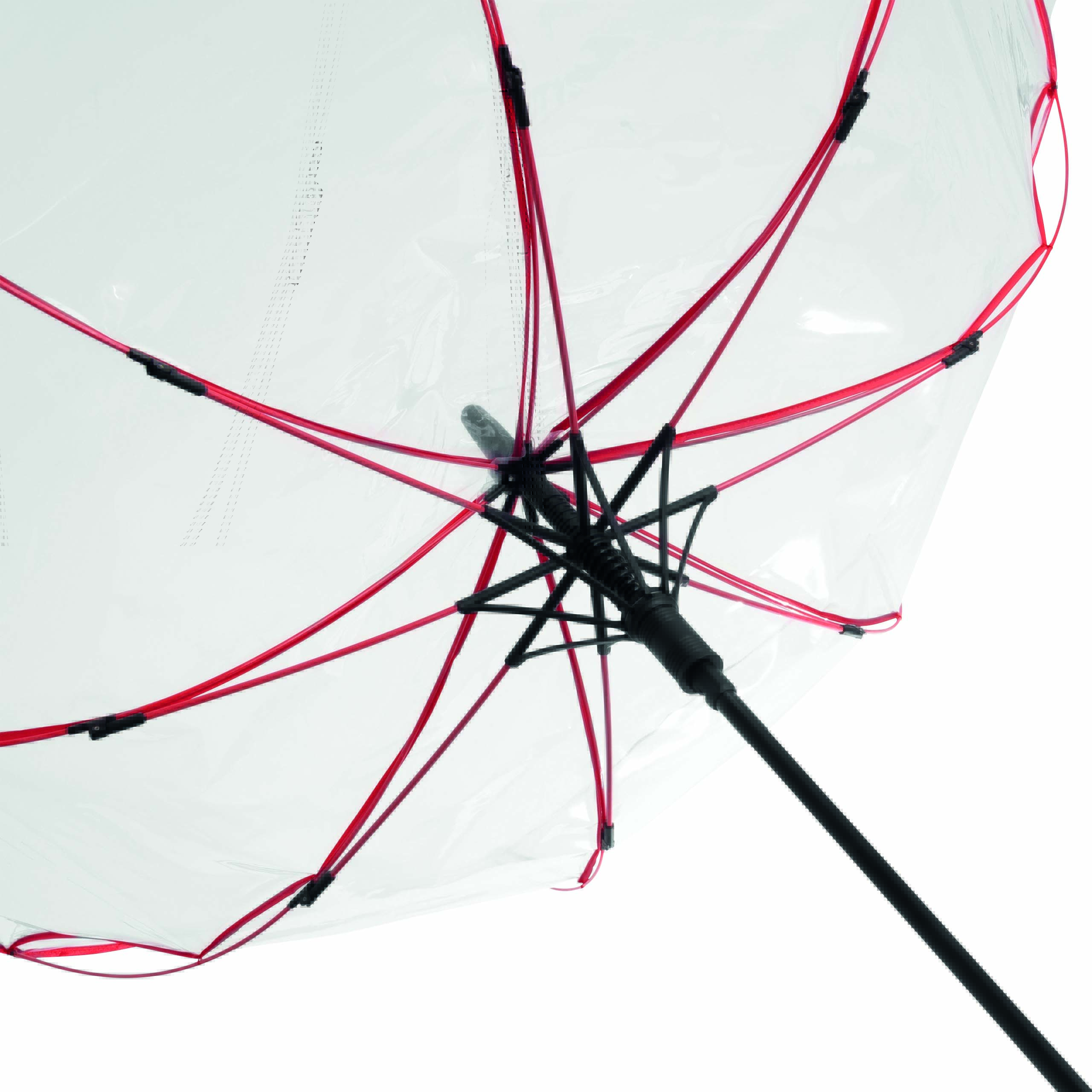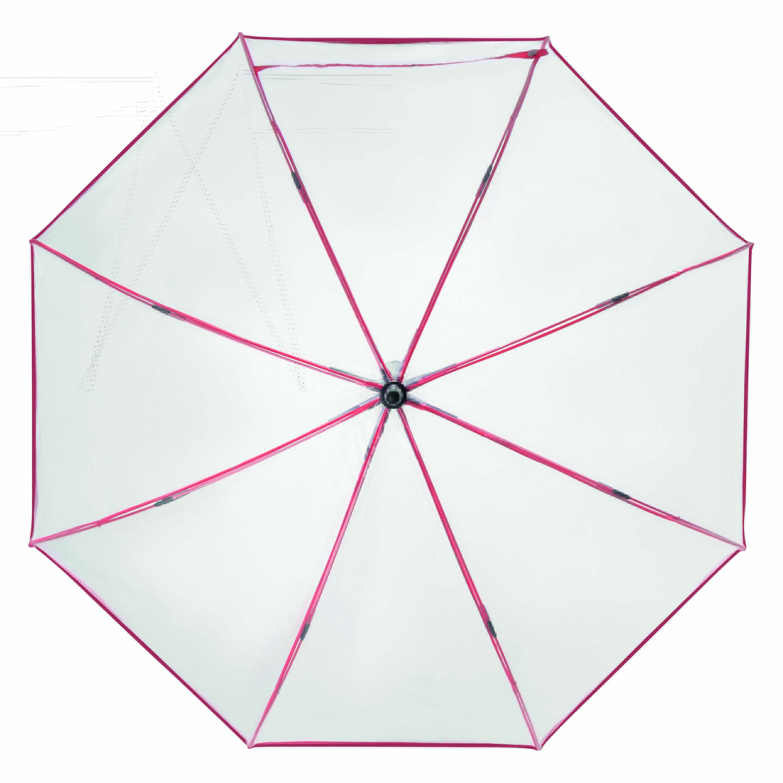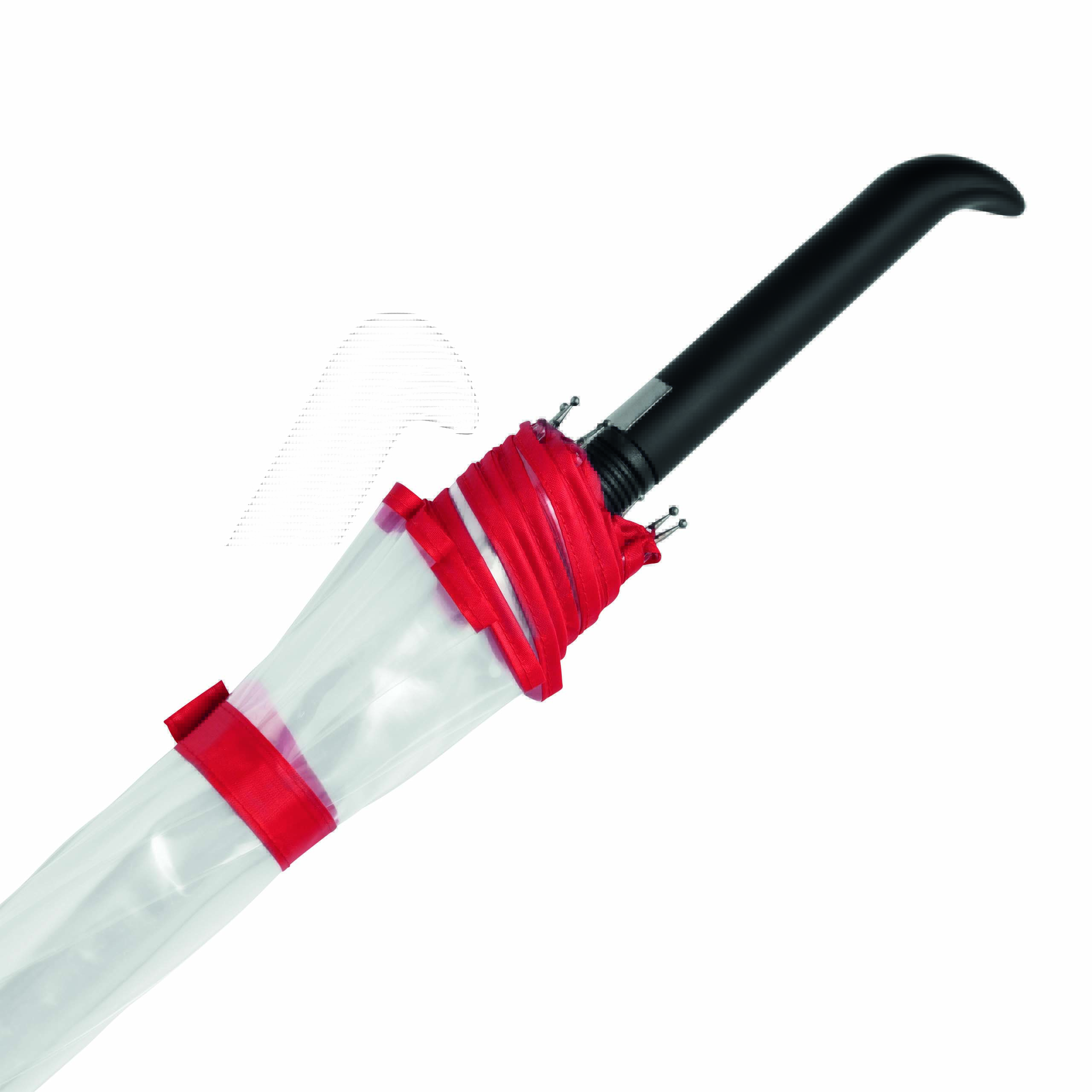 Automatyczny parasol VIP z plastikowym uchwytem, z metalową laską oraz kolorowymi szynami z segmentami z włókna szklanego, metalowymi kolcami. Poszycie z transparentnej folii POE z kolorową lamówką i paskiem spinającym zapinanym na zatrzask
