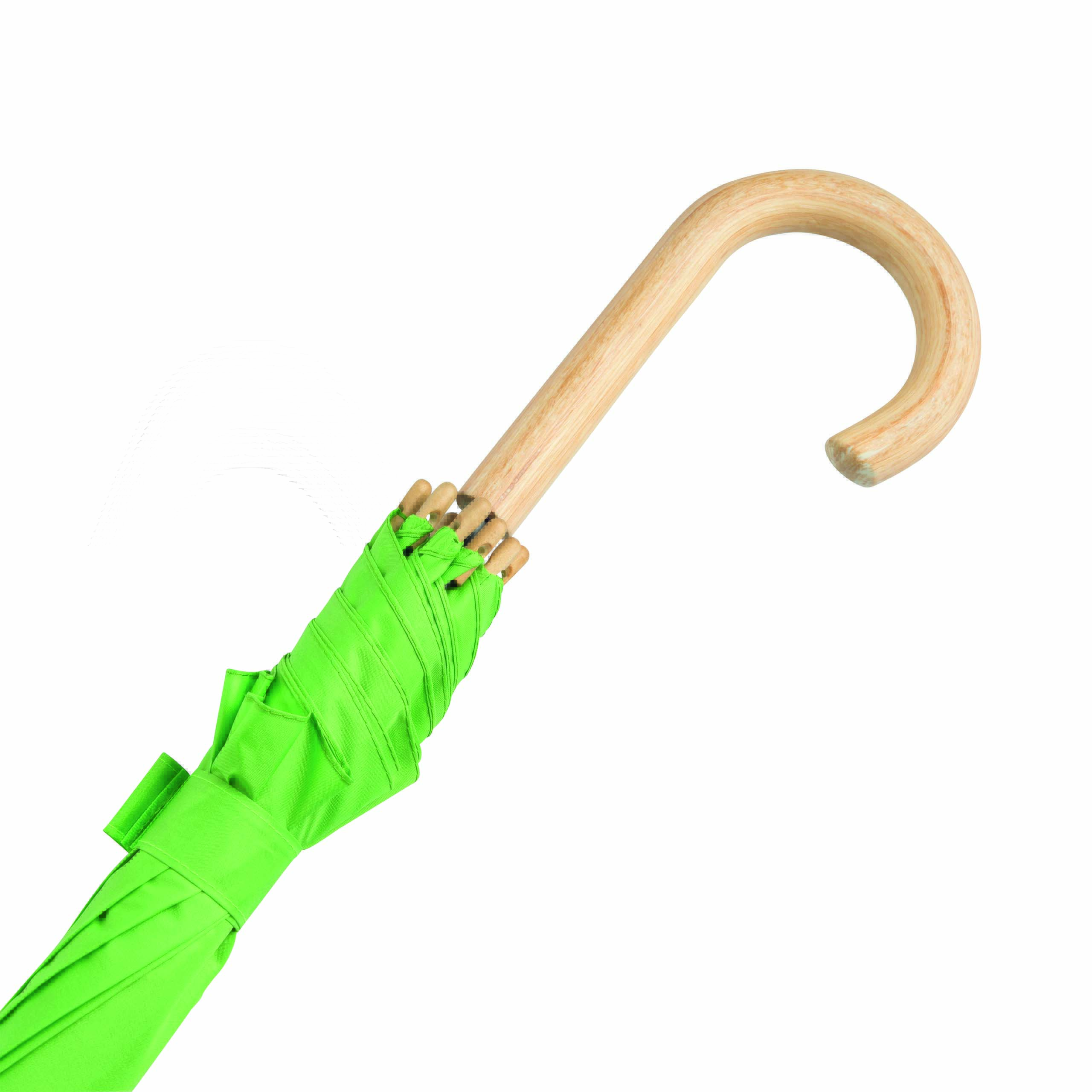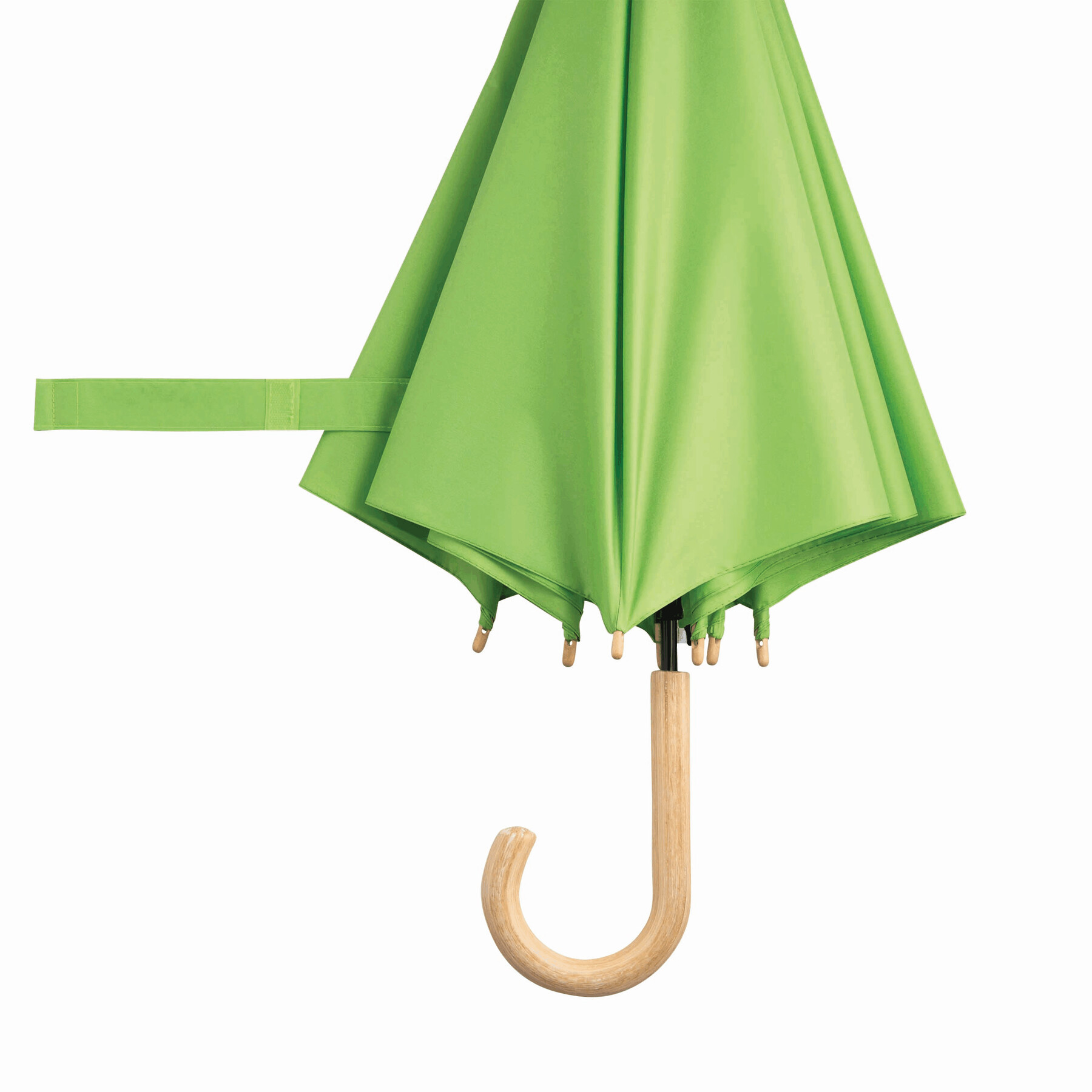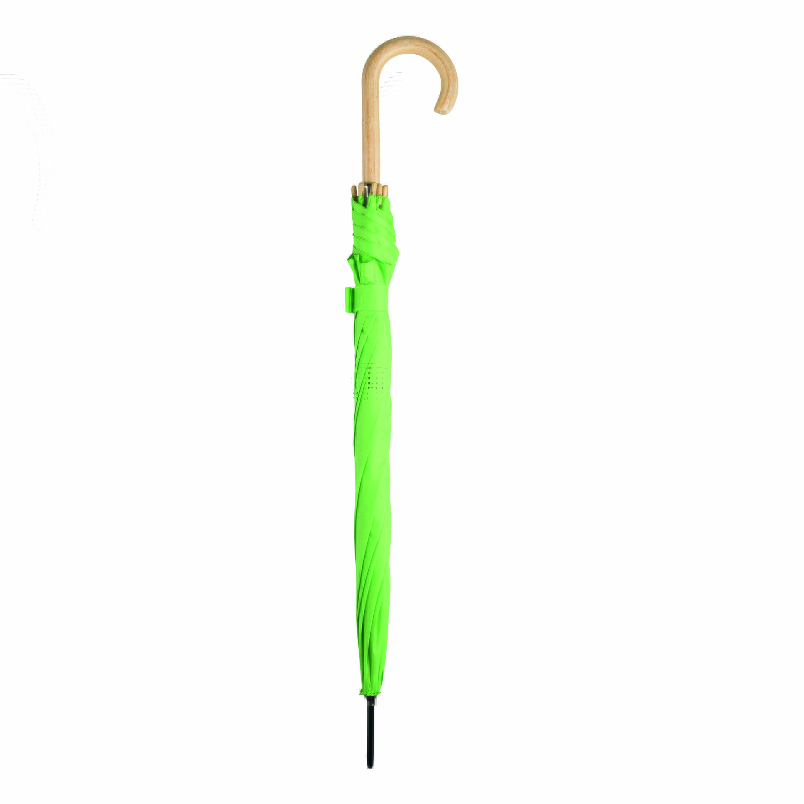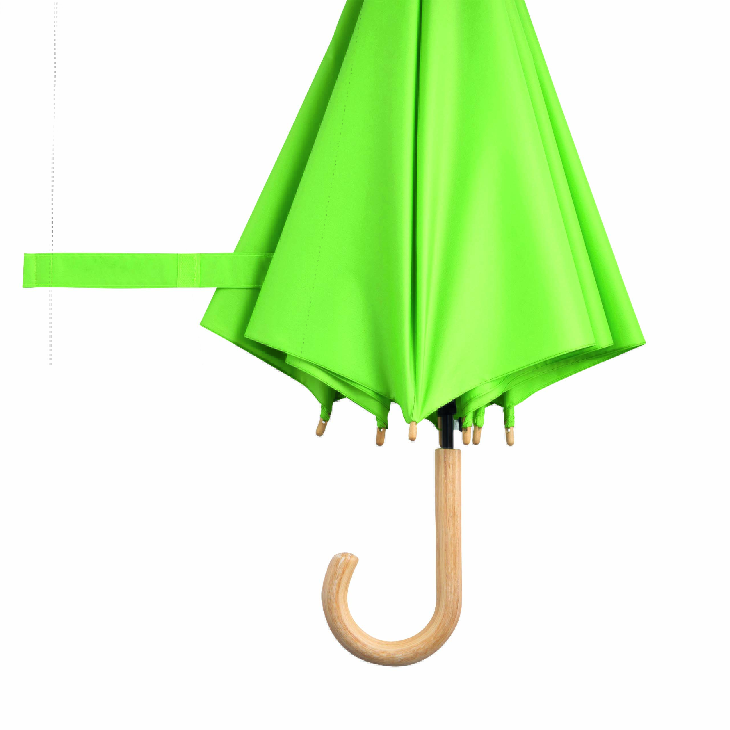 Parasol automatyczny LIPSI z metalową laską. Szyny z włókna szklanego, drewniane kolce i drewniany, zaokrąglony uchwyt. Poszycie z poliestru pongee wykonanego z plastiku pochodzącego z recyklingu / RPET. Zapięcie na rzep.
