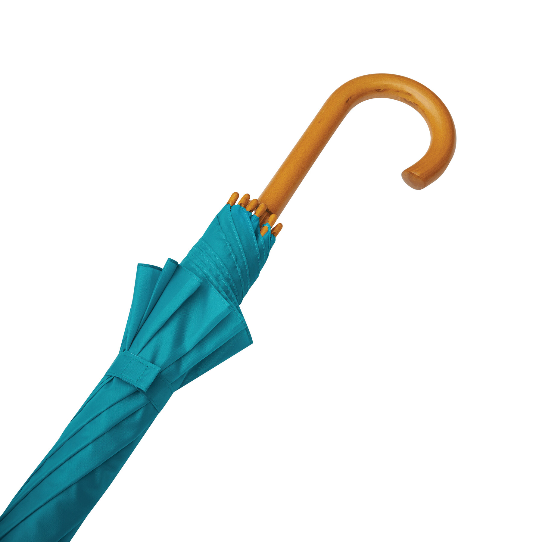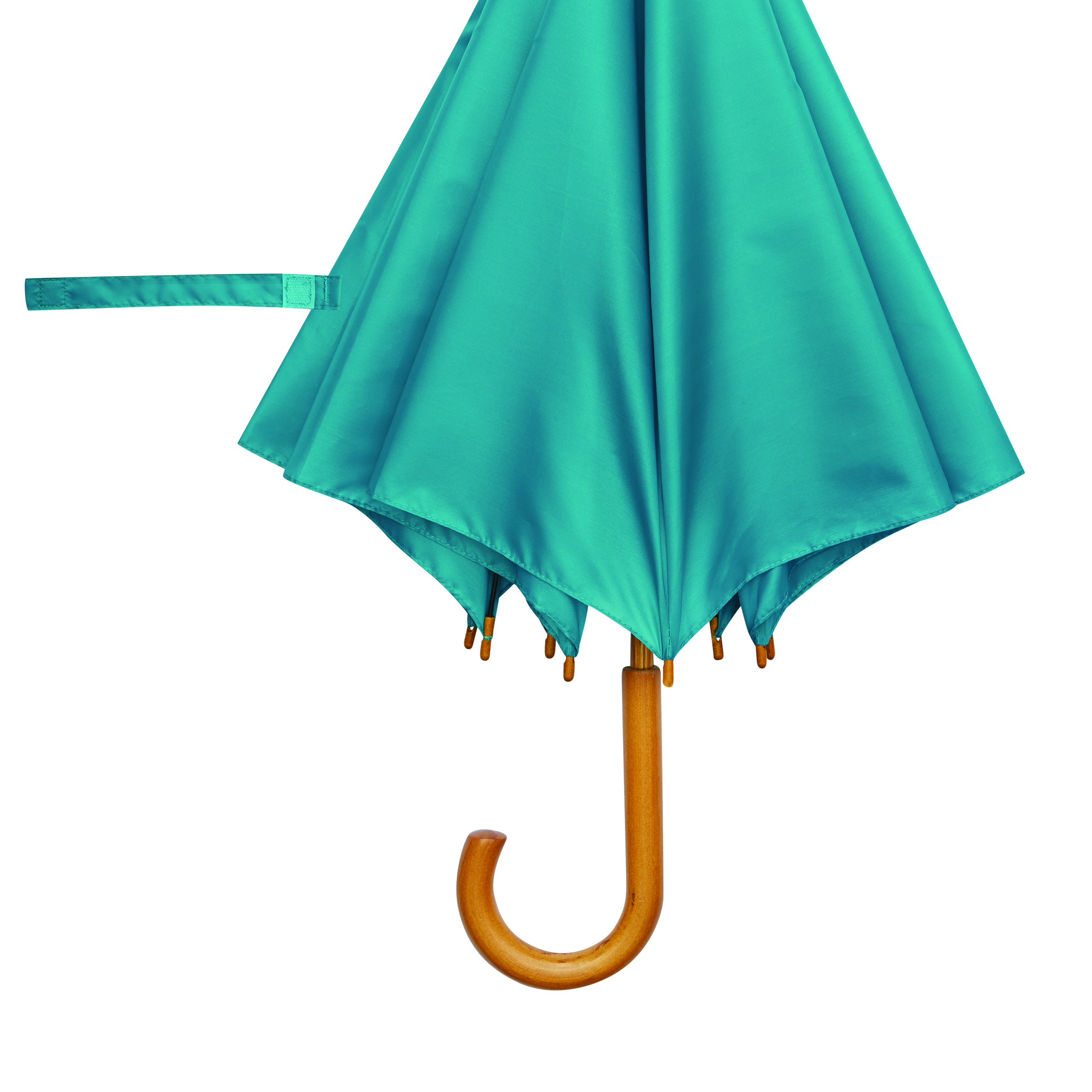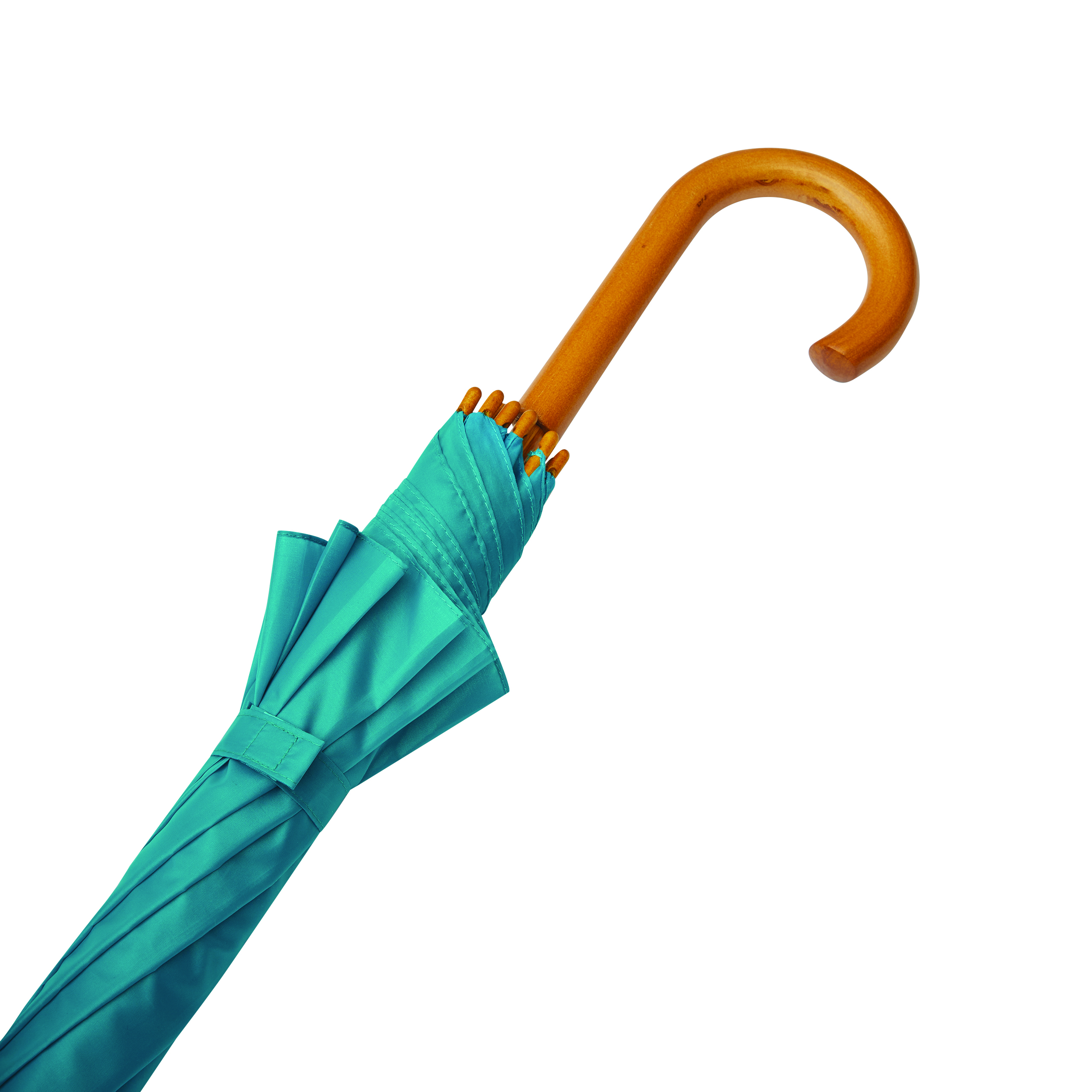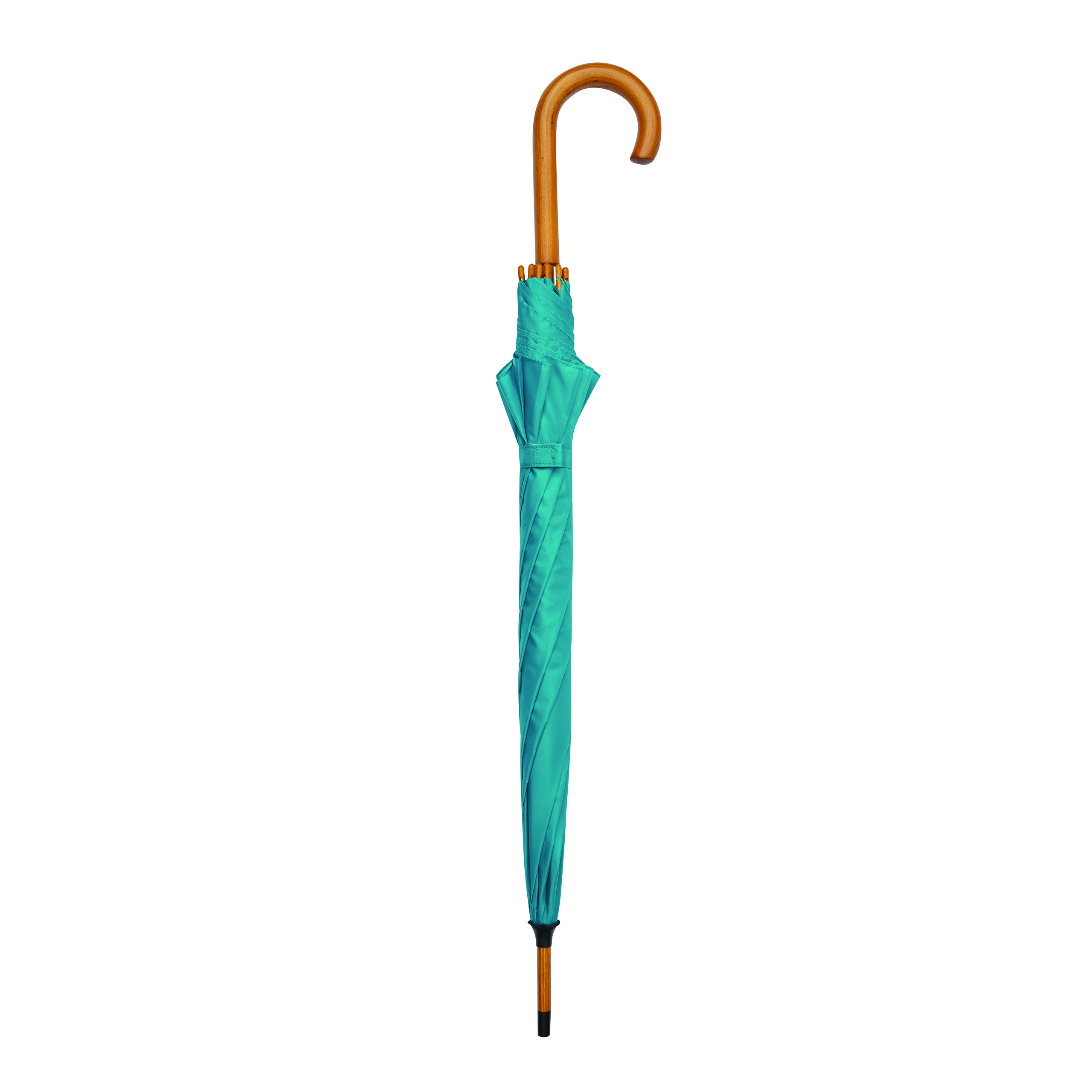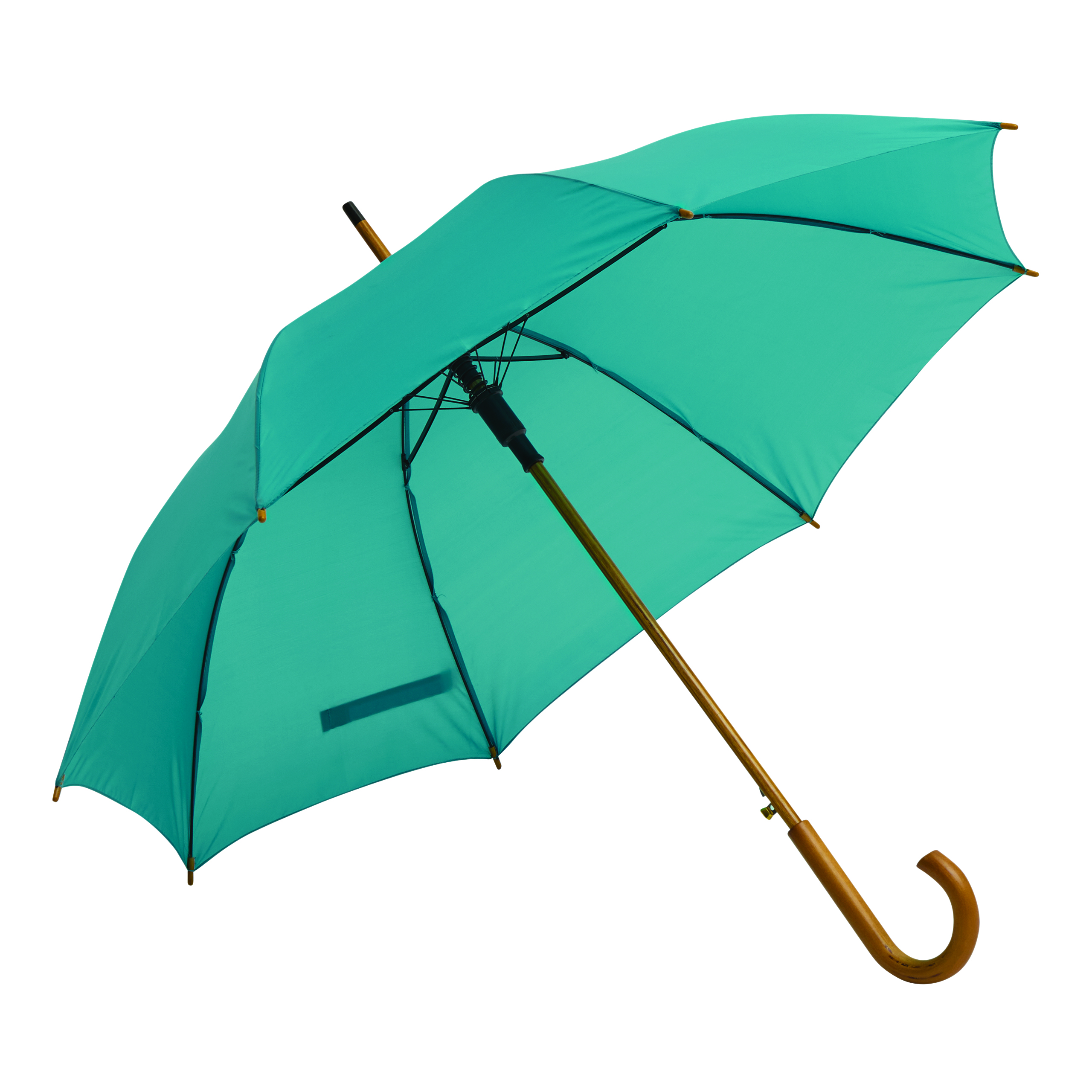 Automatyczny parasol JAZZ z poszyciem z poliestru wykonanego z tworzyw sztucznych pochodzących z recyklingu. Ma drewnianą laskę, szyny z włókna szklanego oraz drewniane kolce. Posiada zaokrąglony, drewniany uchwyt. Zapinany jest na rzep.