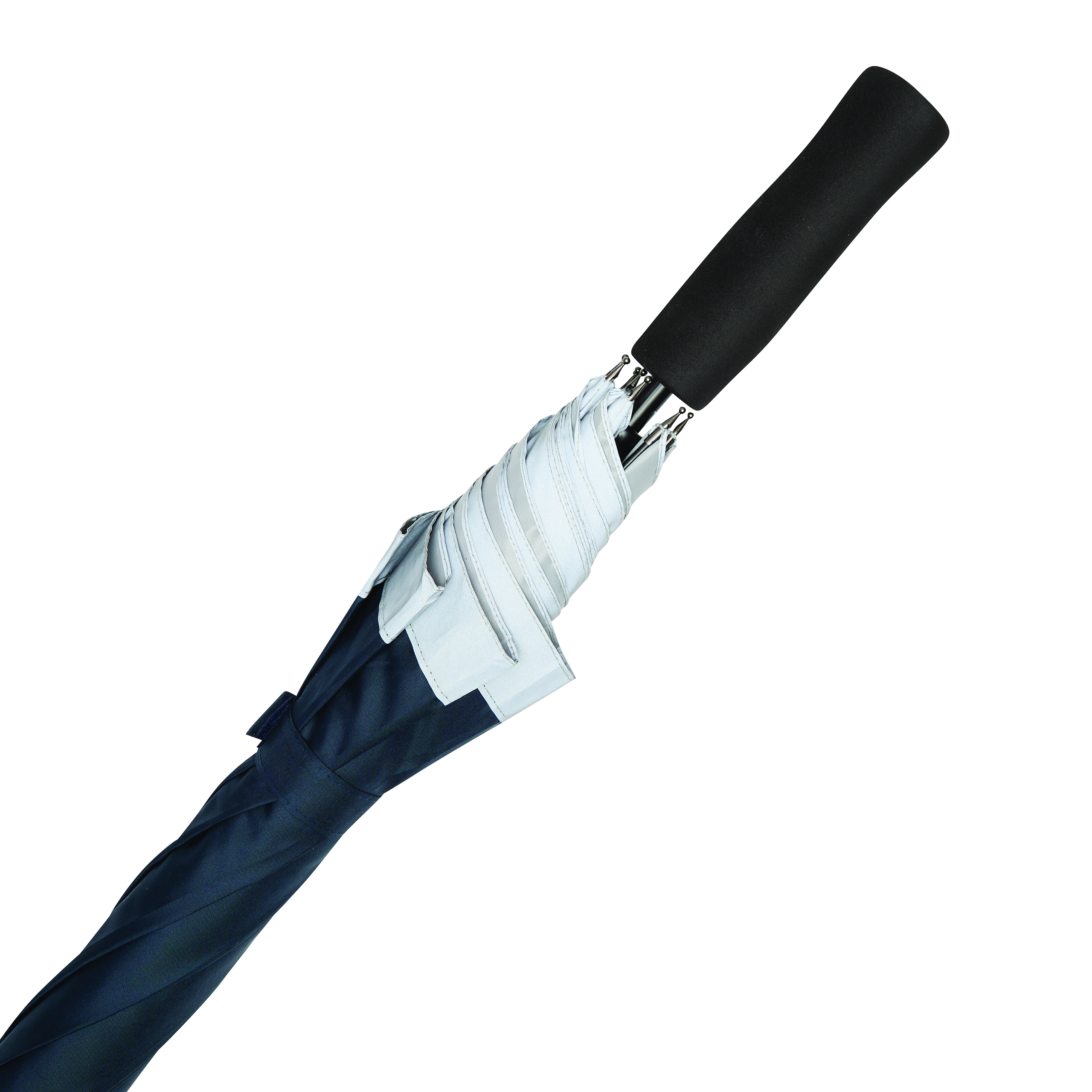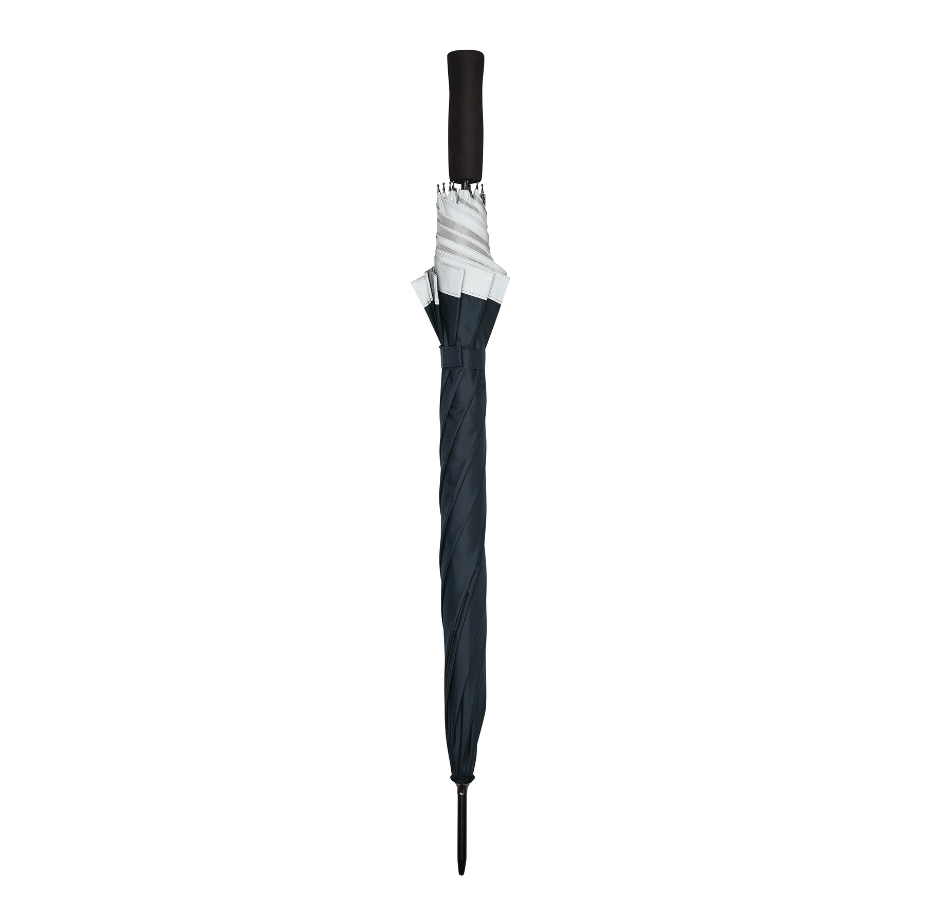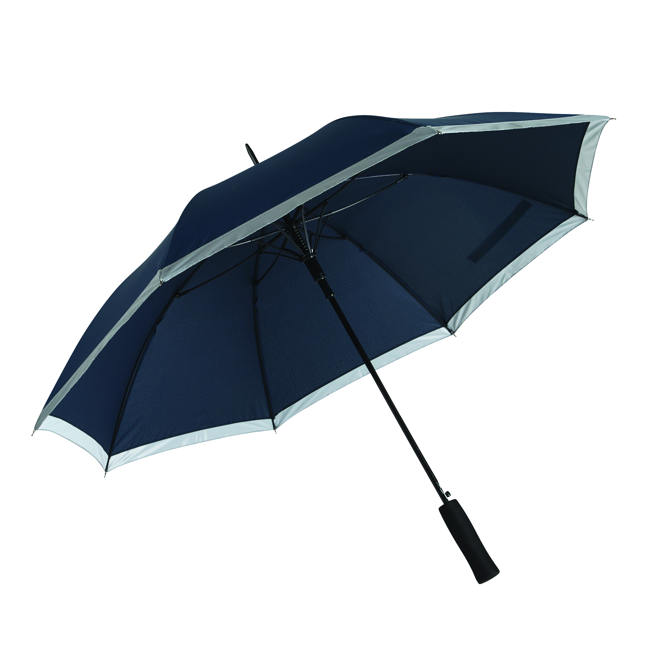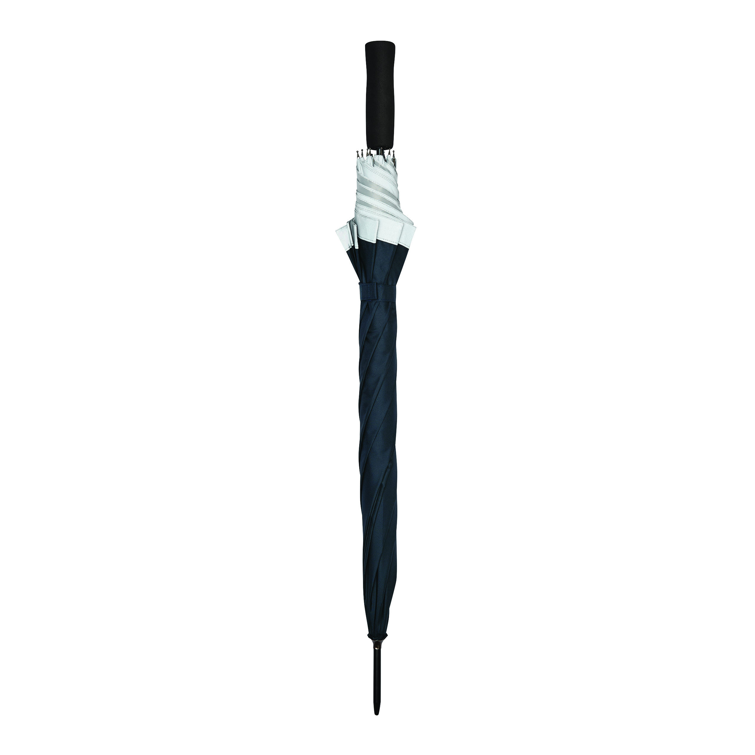 Automatyczny parasol CALIMA. Posiada metalową laskę, szyny z włókna szklanego, metalowe końcówki oraz uchwyt EVA. Czasza wykonana jest z poliestru pongee z tworzywa sztucznego pochodzącego z recyklingu / RPET i posiada srebrny pasek odbijający światło. Zapinany jest na rzep.