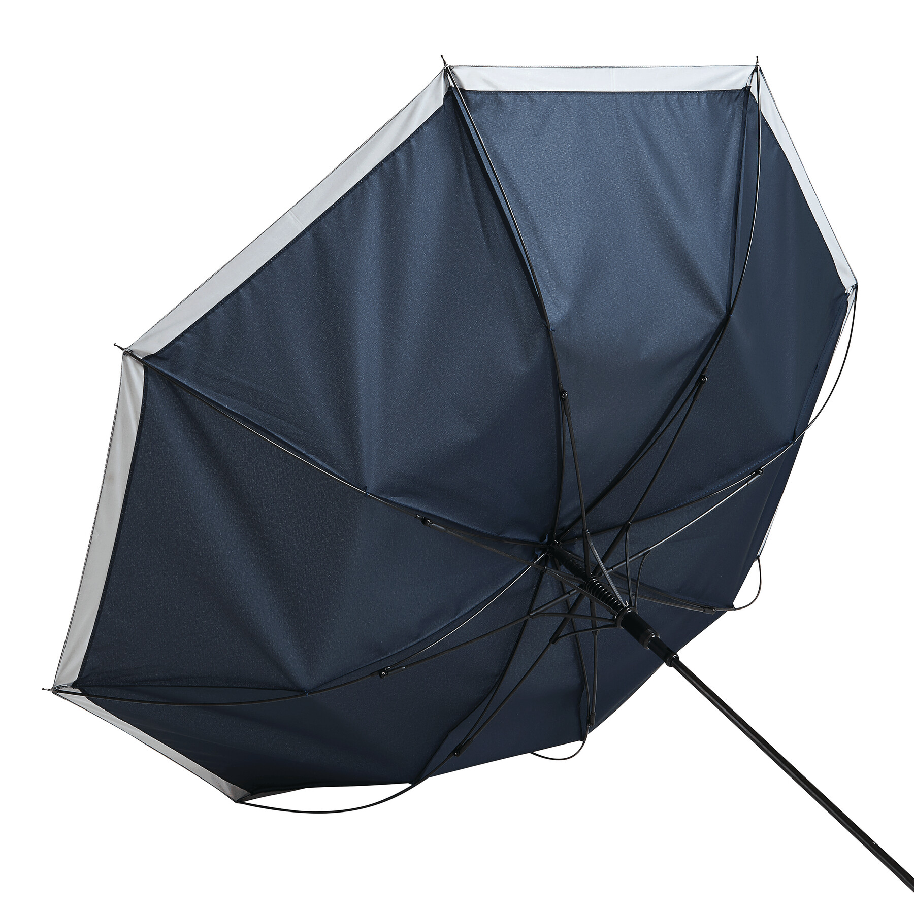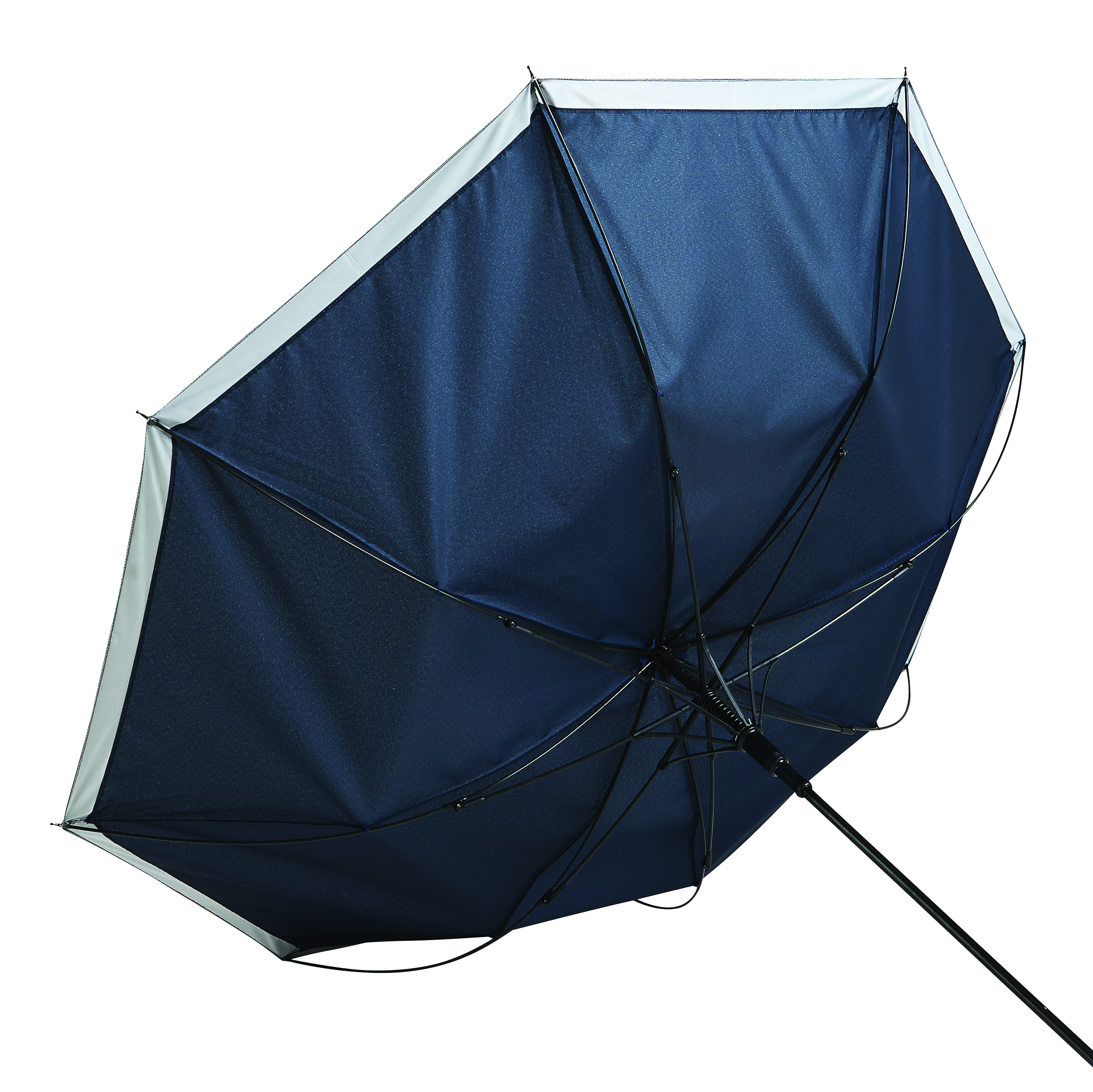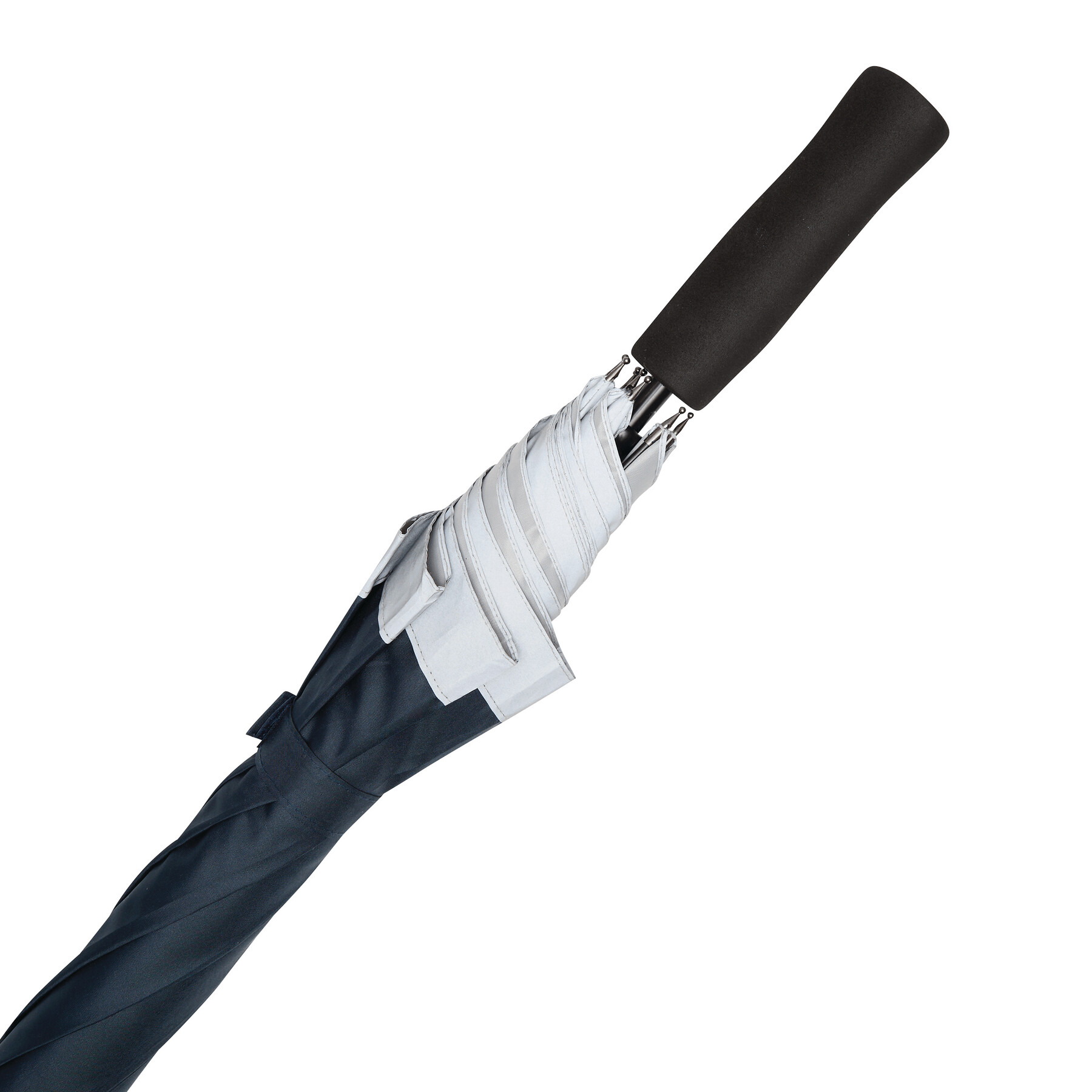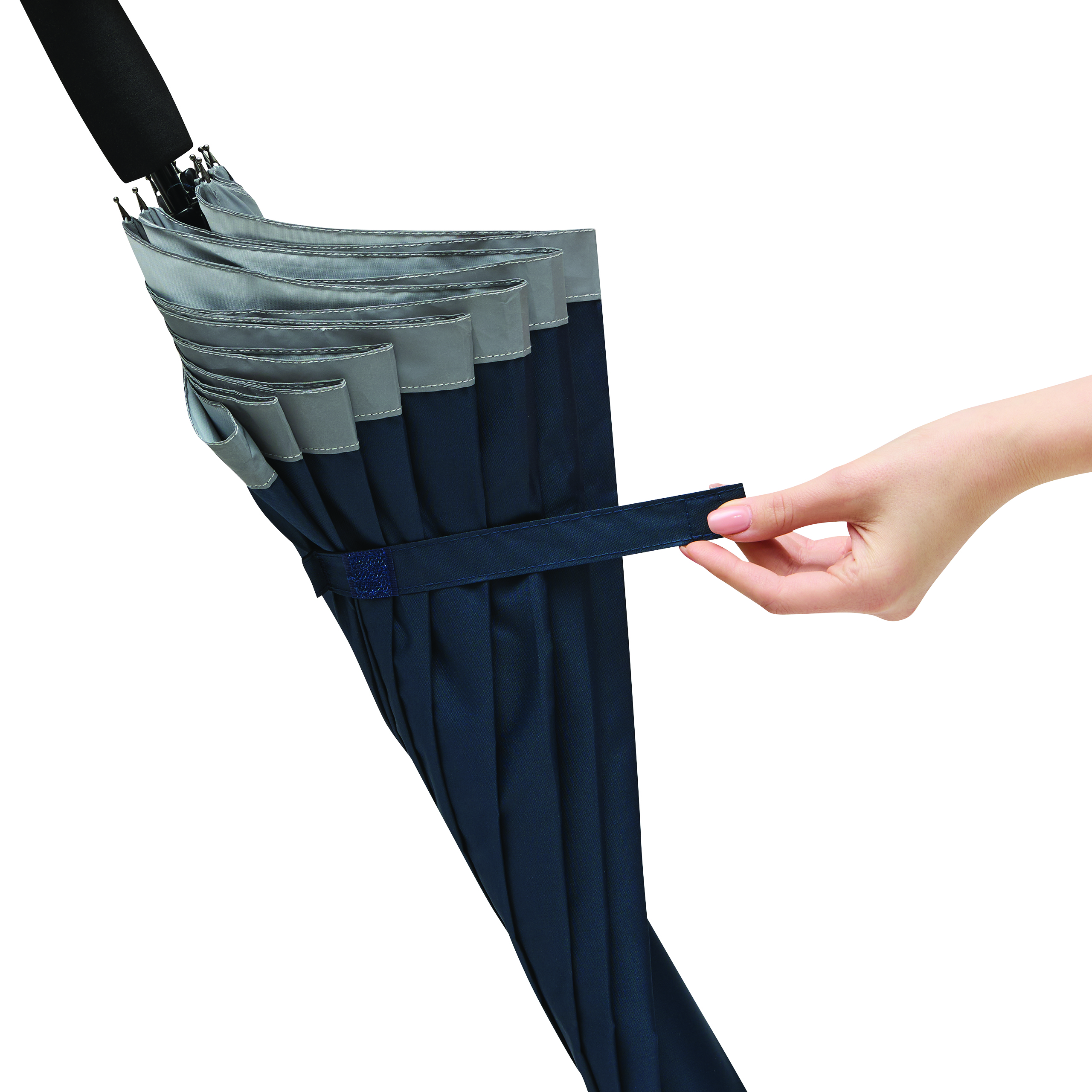 Automatyczny parasol CALIMA. Posiada metalową laskę, szyny z włókna szklanego, metalowe końcówki oraz uchwyt EVA. Czasza wykonana jest z poliestru pongee z tworzywa sztucznego pochodzącego z recyklingu / RPET i posiada srebrny pasek odbijający światło. Zapinany jest na rzep.