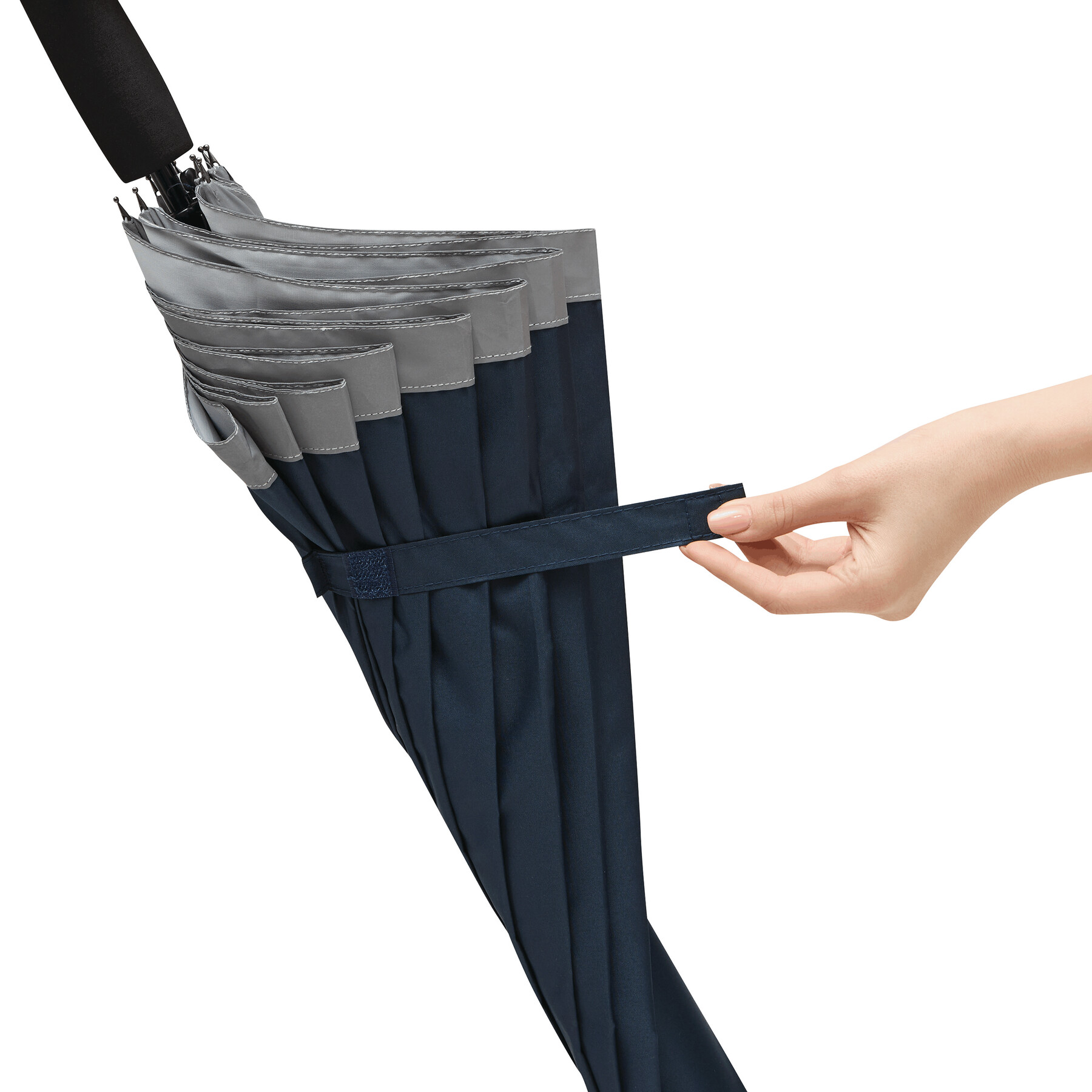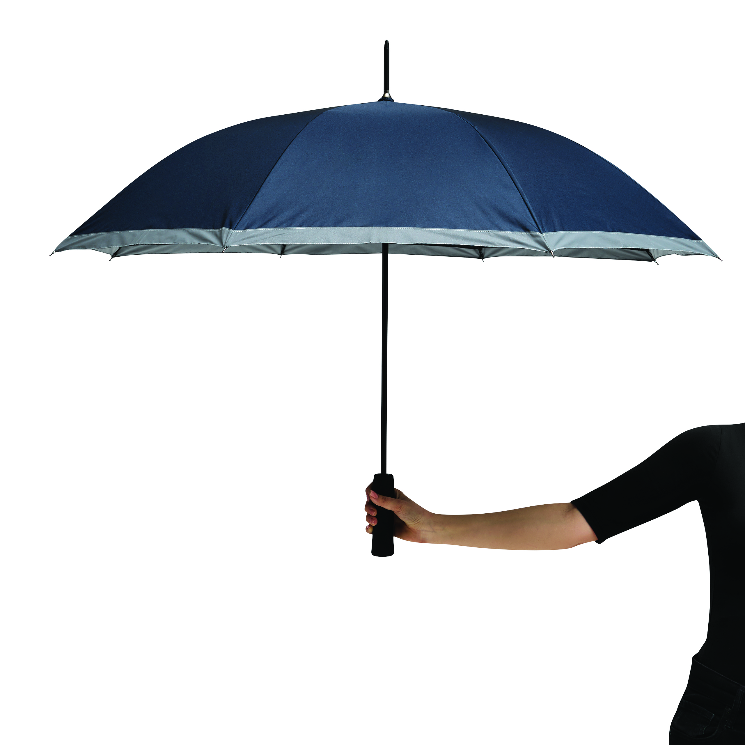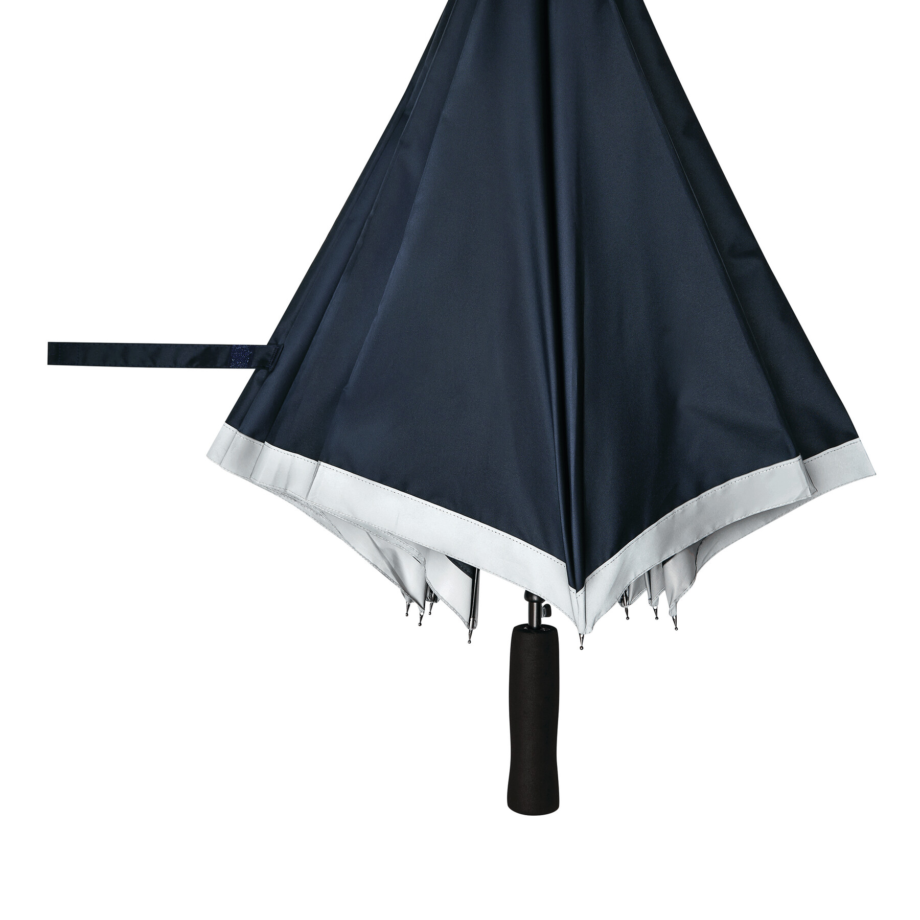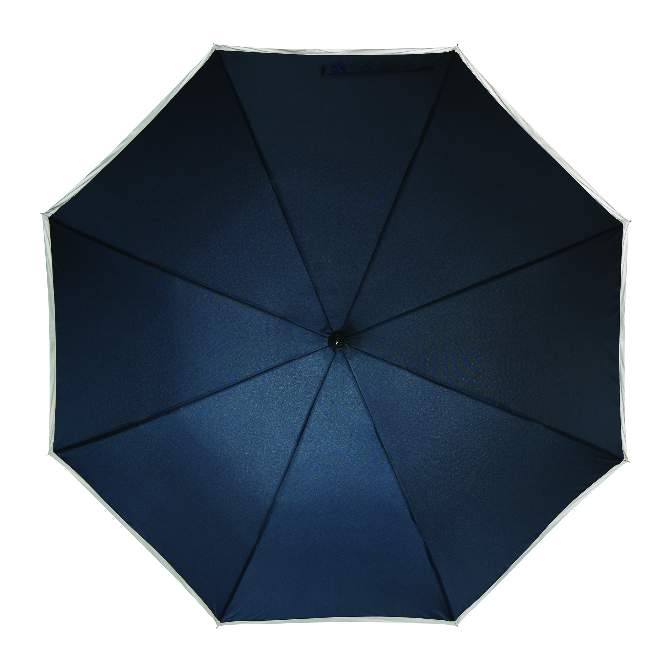 Automatyczny parasol CALIMA. Posiada metalową laskę, szyny z włókna szklanego, metalowe końcówki oraz uchwyt EVA. Czasza wykonana jest z poliestru pongee z tworzywa sztucznego pochodzącego z recyklingu / RPET i posiada srebrny pasek odbijający światło. Zapinany jest na rzep.