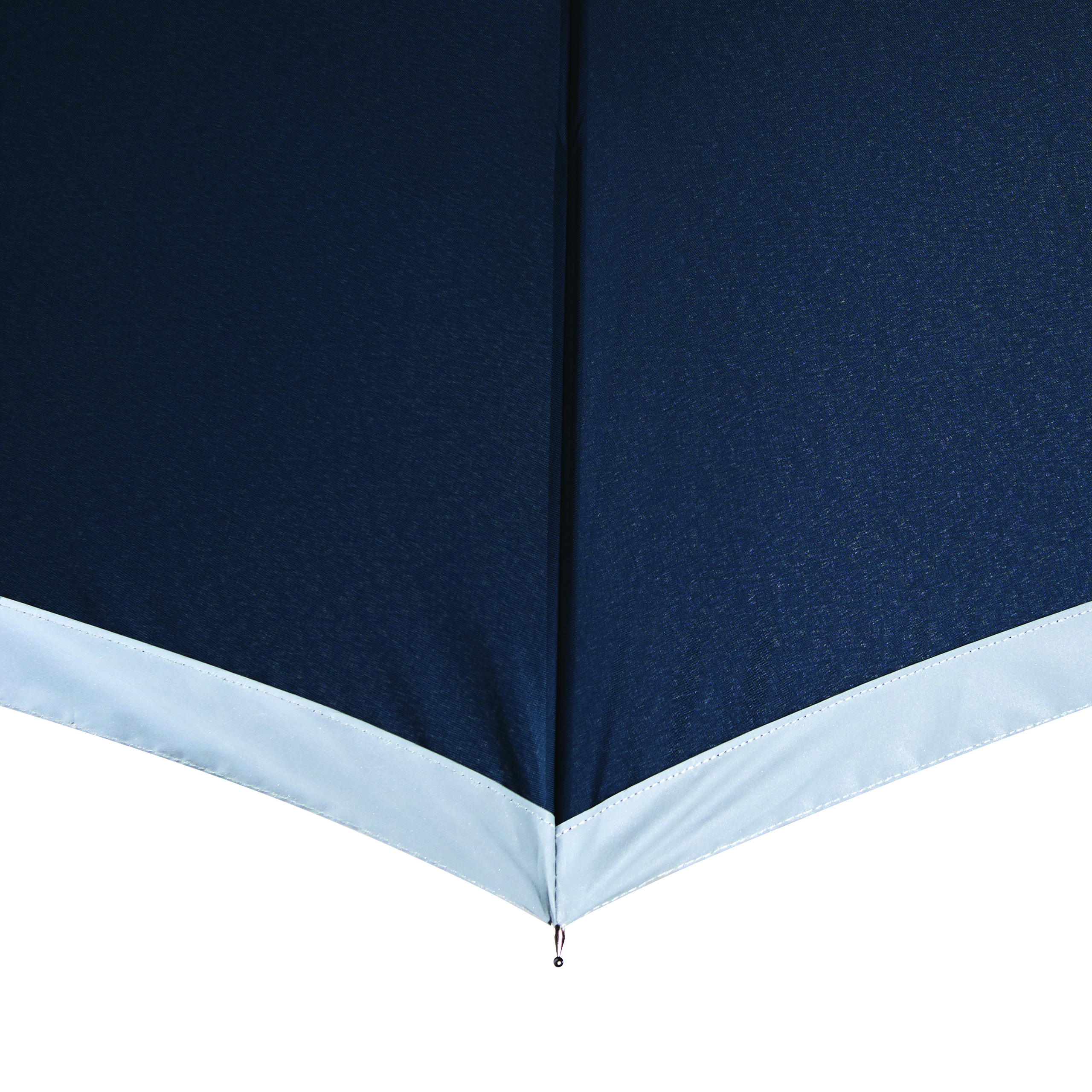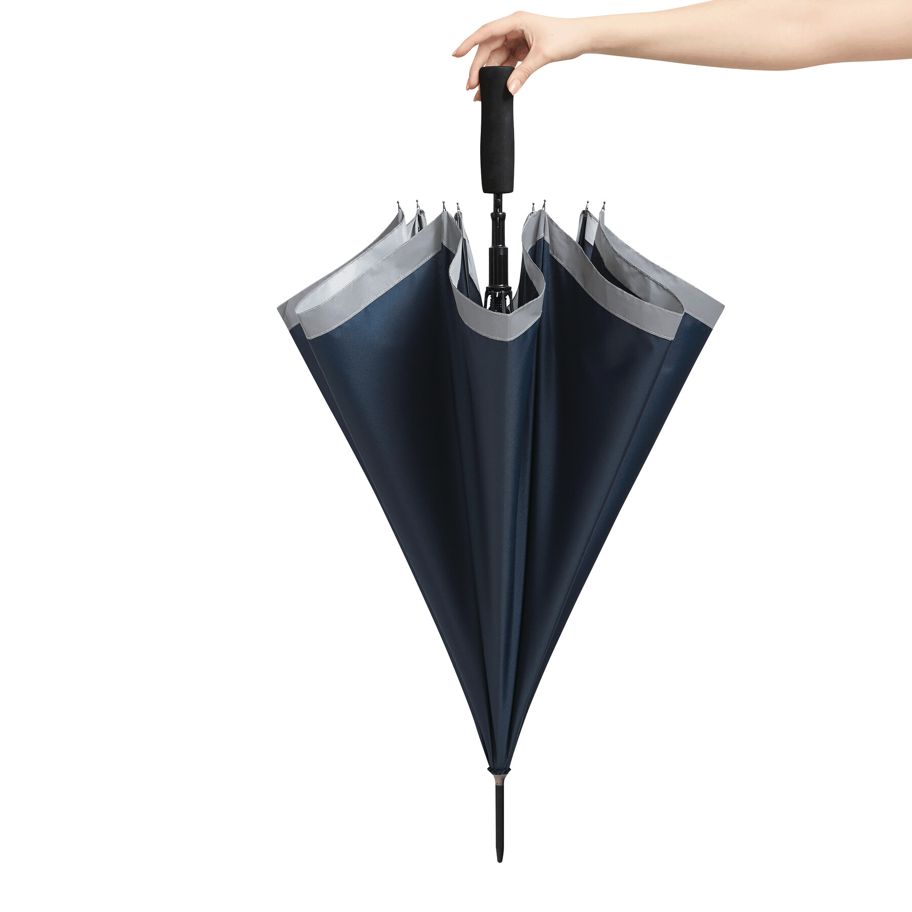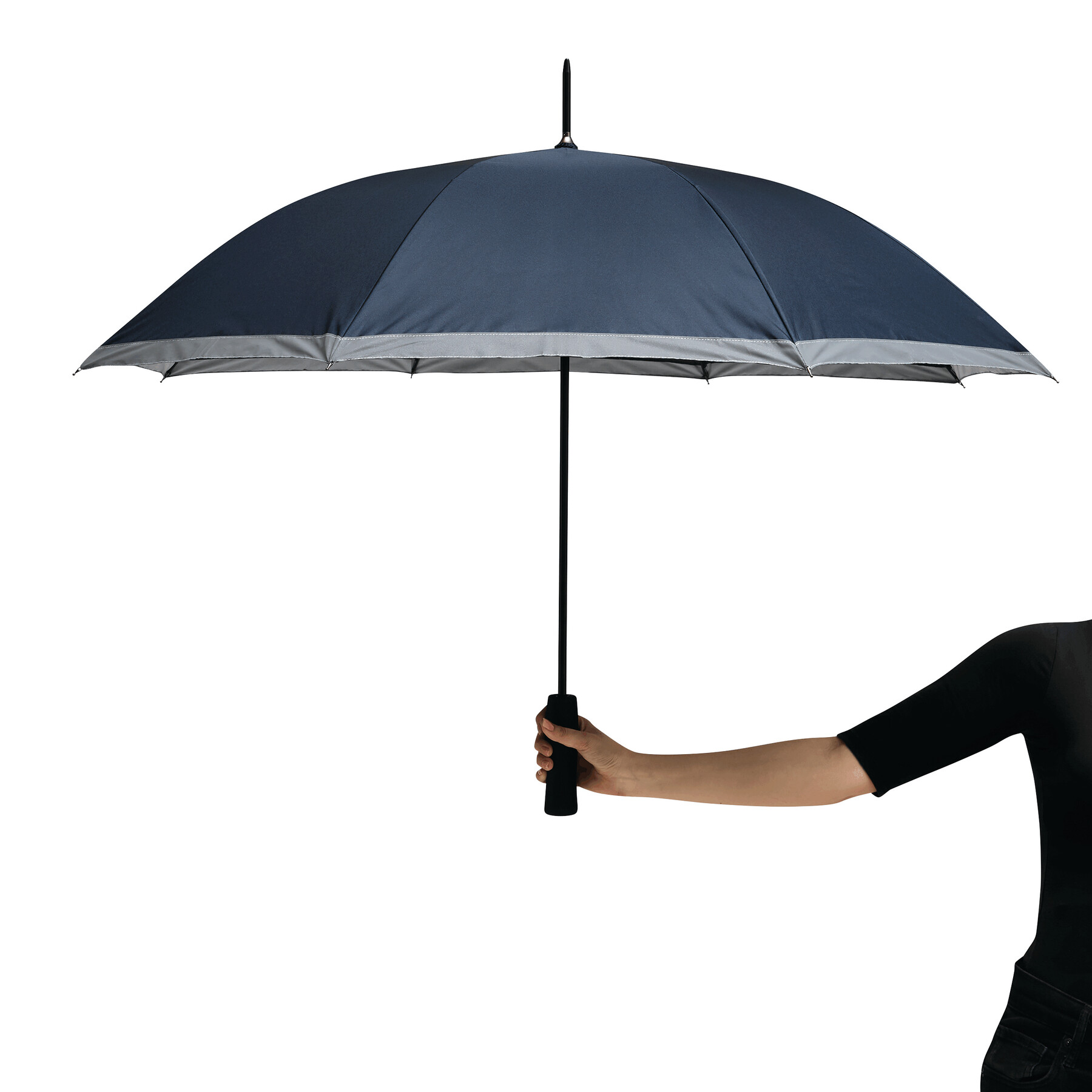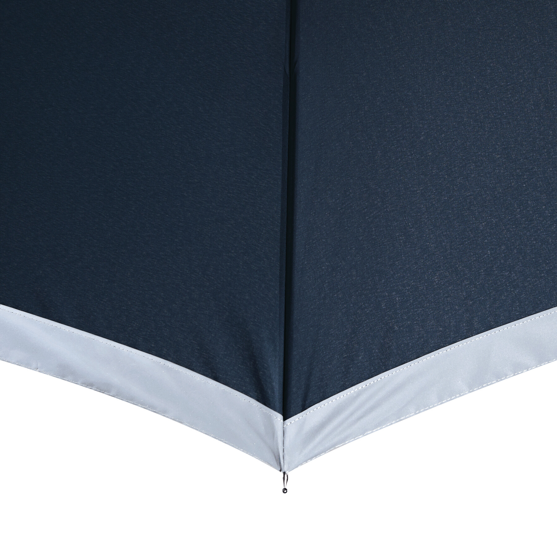 Automatyczny parasol CALIMA. Posiada metalową laskę, szyny z włókna szklanego, metalowe końcówki oraz uchwyt EVA. Czasza wykonana jest z poliestru pongee z tworzywa sztucznego pochodzącego z recyklingu / RPET i posiada srebrny pasek odbijający światło. Zapinany jest na rzep.