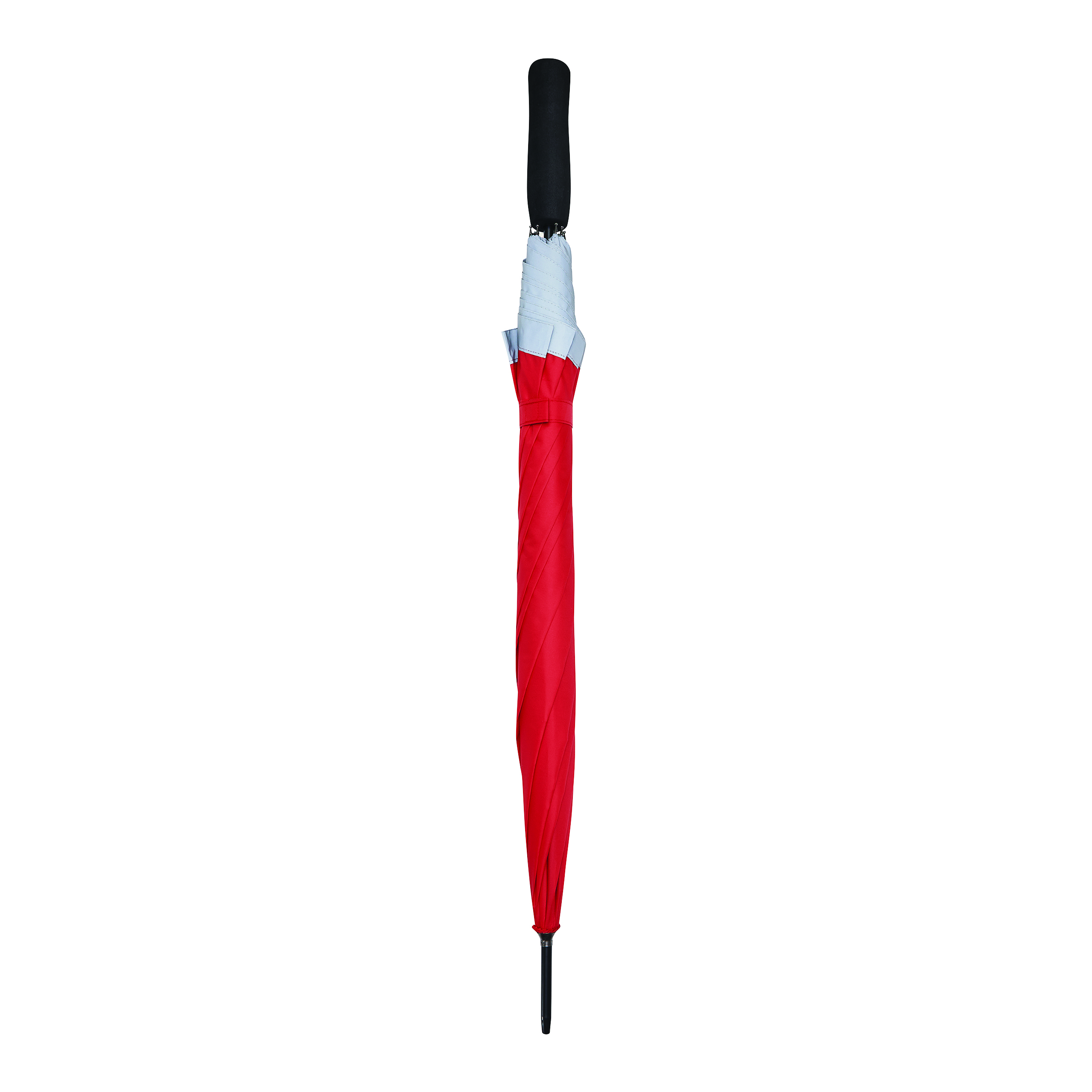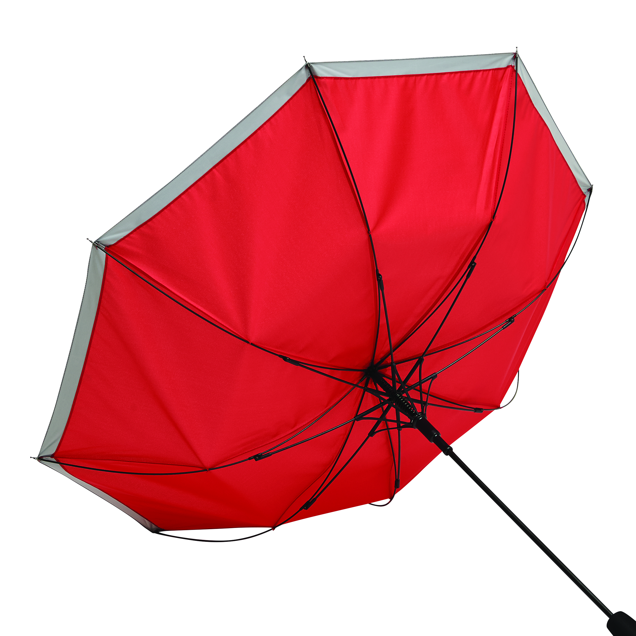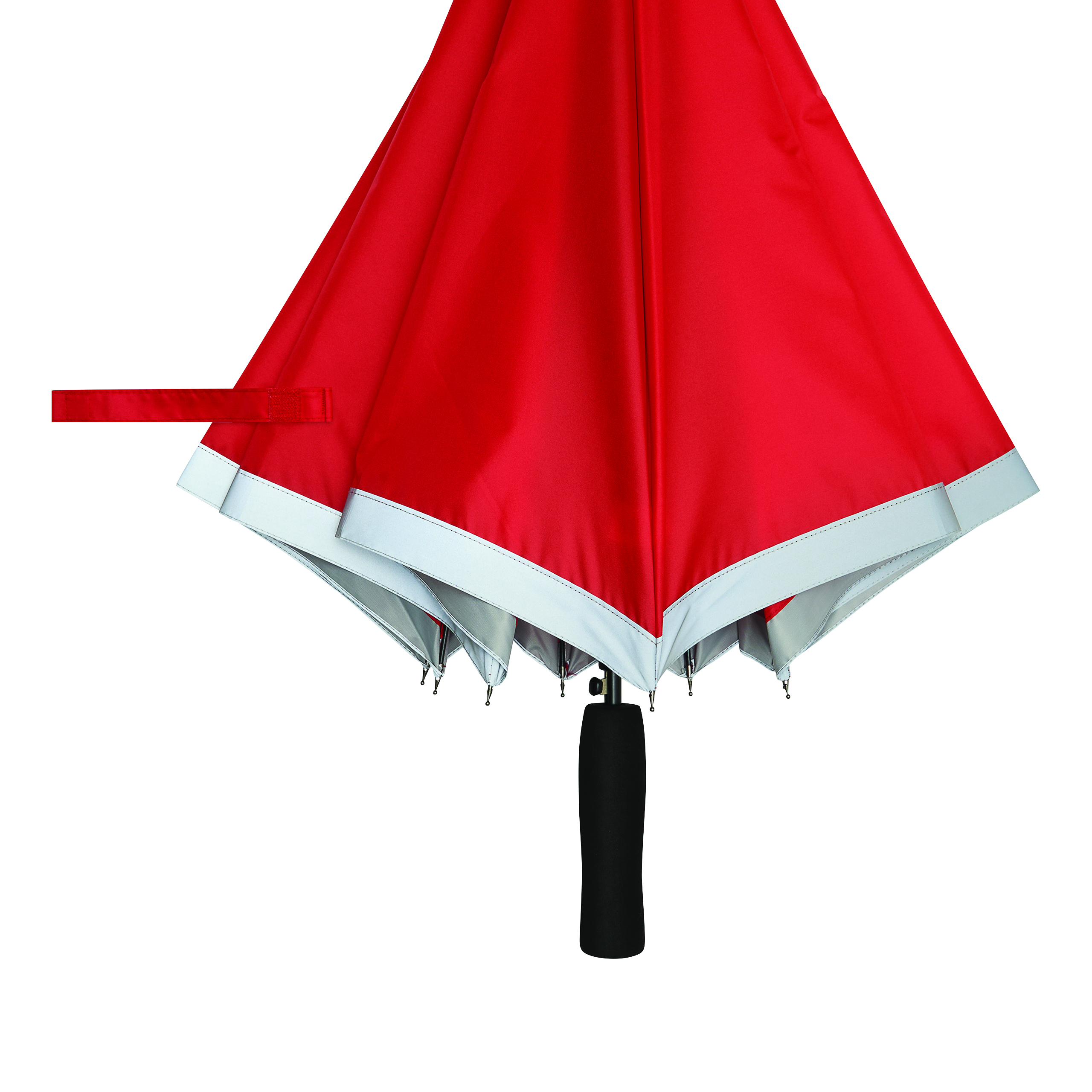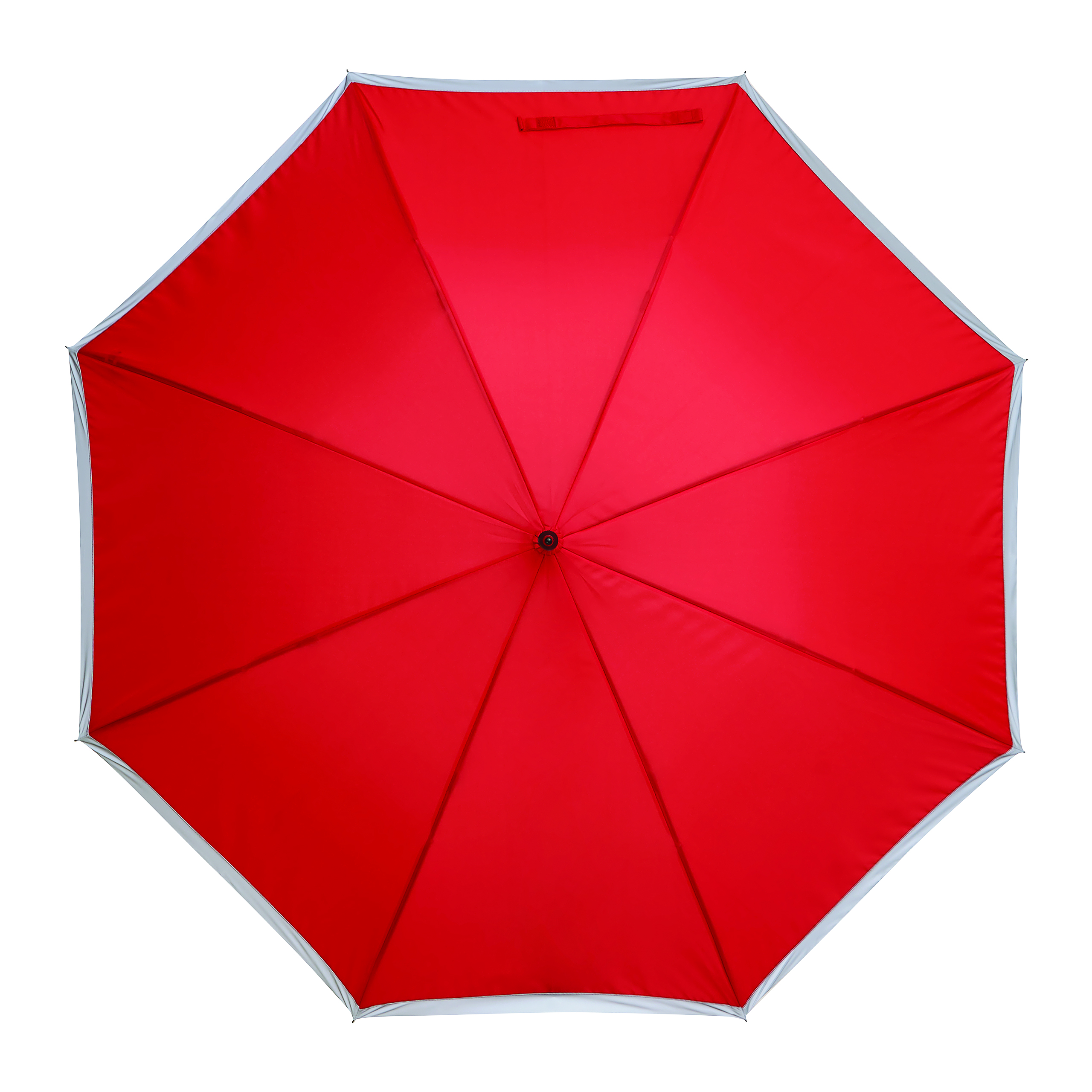 Automatyczny parasol CALIMA. Posiada metalową laskę, szyny z włókna szklanego, metalowe końcówki oraz uchwyt EVA. Czasza wykonana jest z poliestru pongee z tworzywa sztucznego pochodzącego z recyklingu / RPET i posiada srebrny pasek odbijający światło. Zapinany jest na rzep.