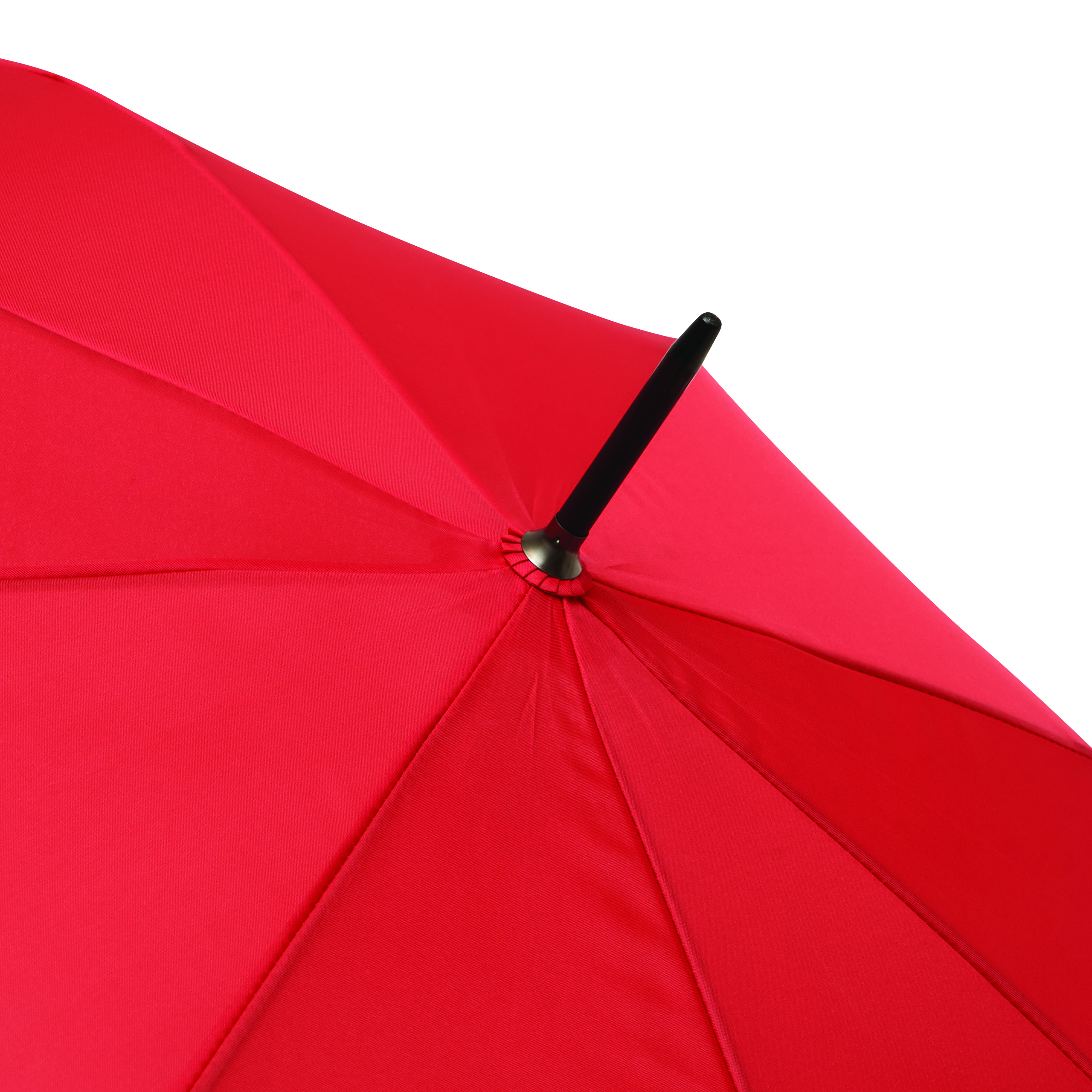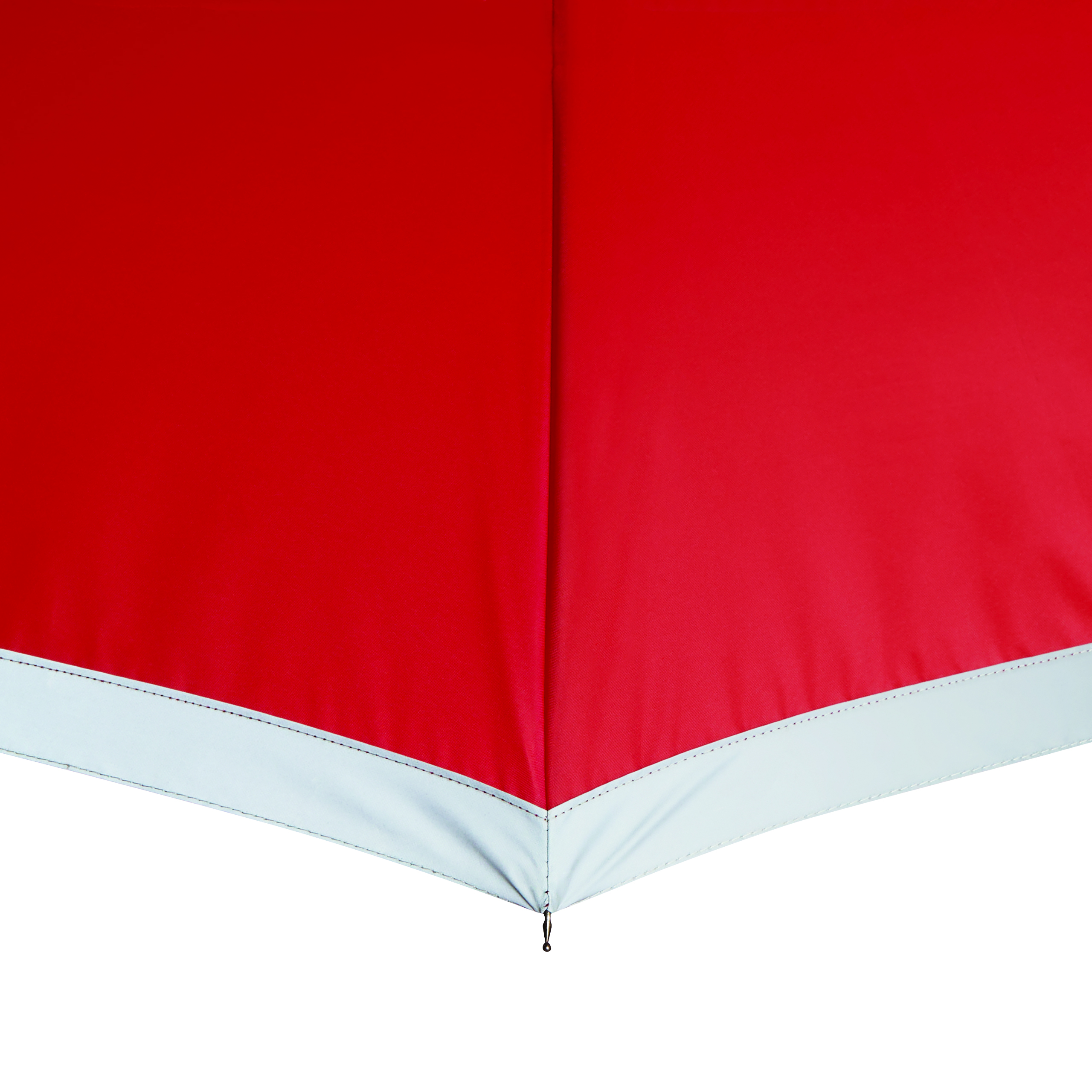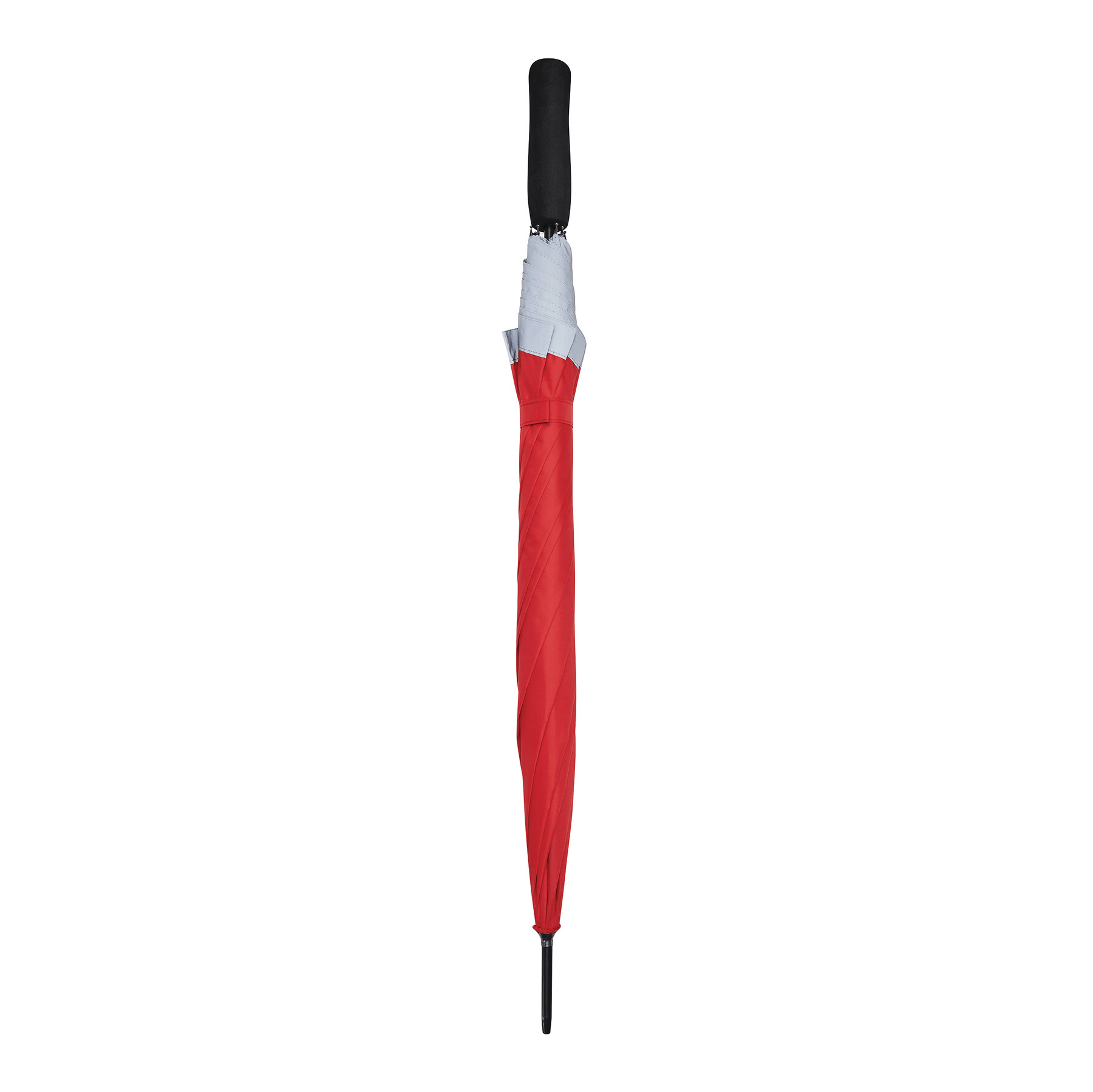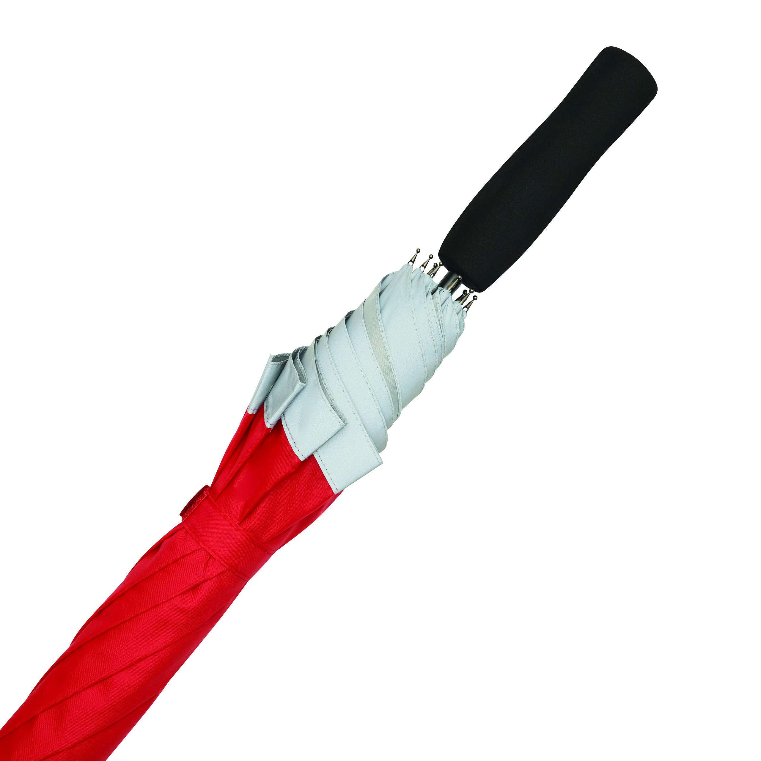 Automatyczny parasol CALIMA. Posiada metalową laskę, szyny z włókna szklanego, metalowe końcówki oraz uchwyt EVA. Czasza wykonana jest z poliestru pongee z tworzywa sztucznego pochodzącego z recyklingu / RPET i posiada srebrny pasek odbijający światło. Zapinany jest na rzep.