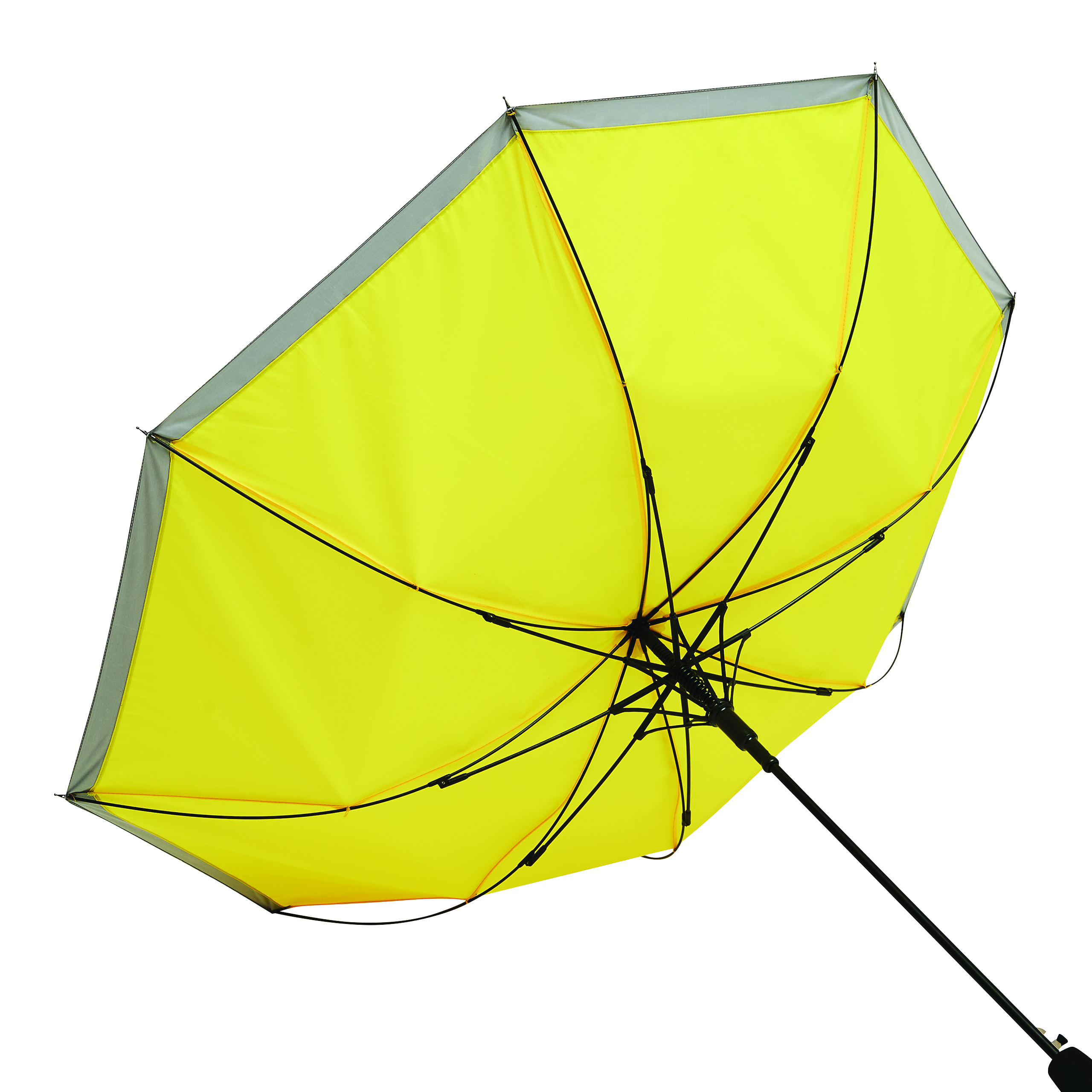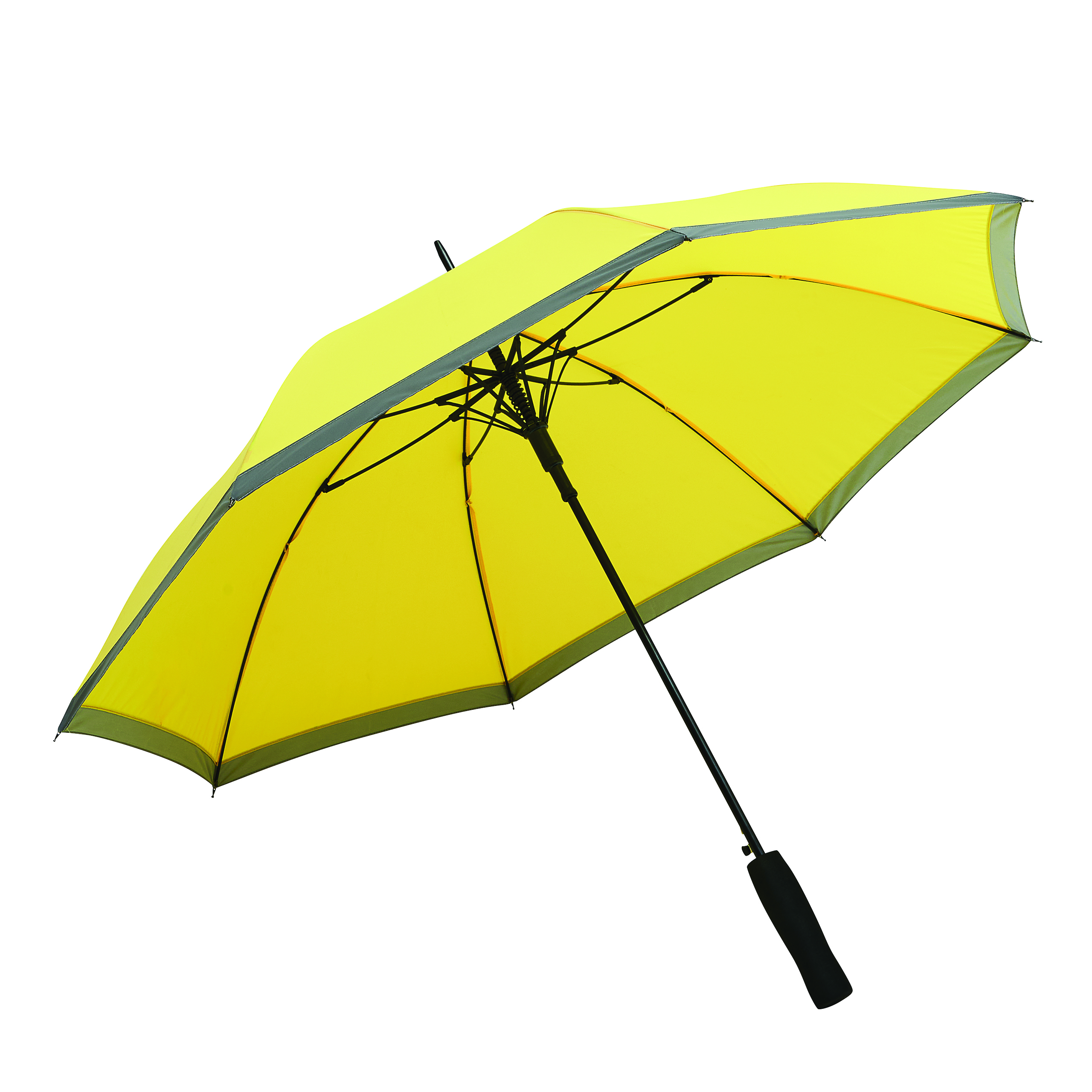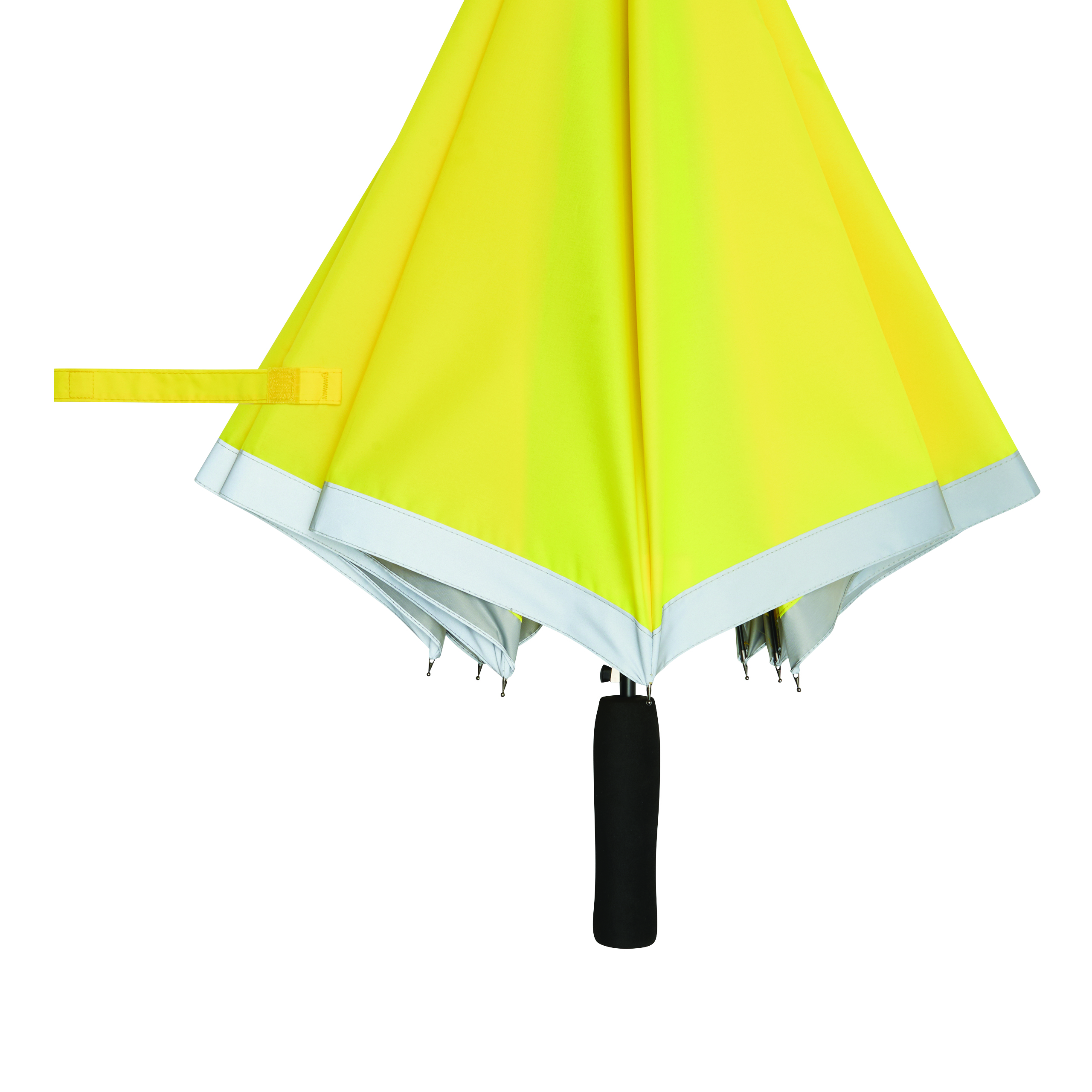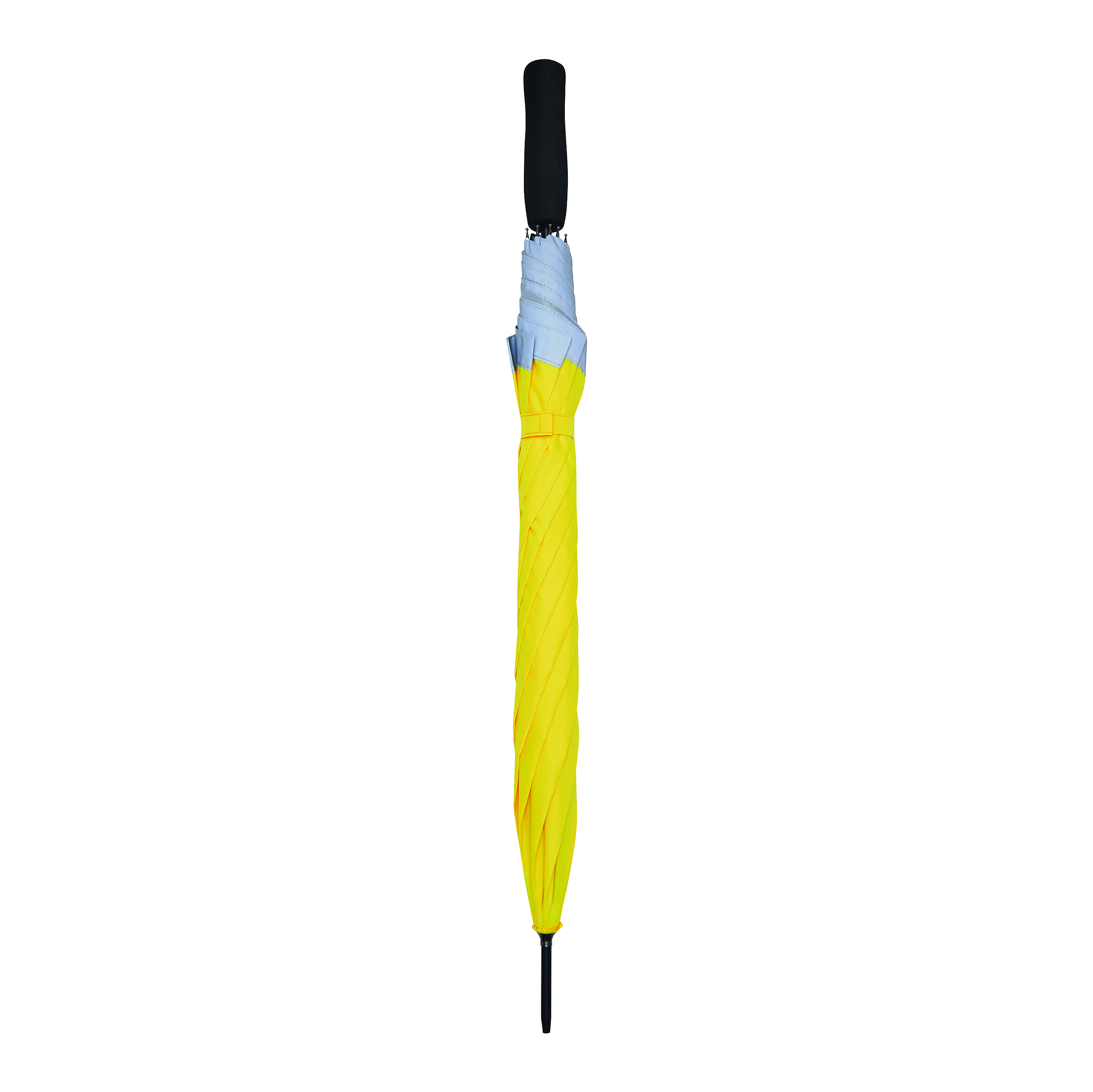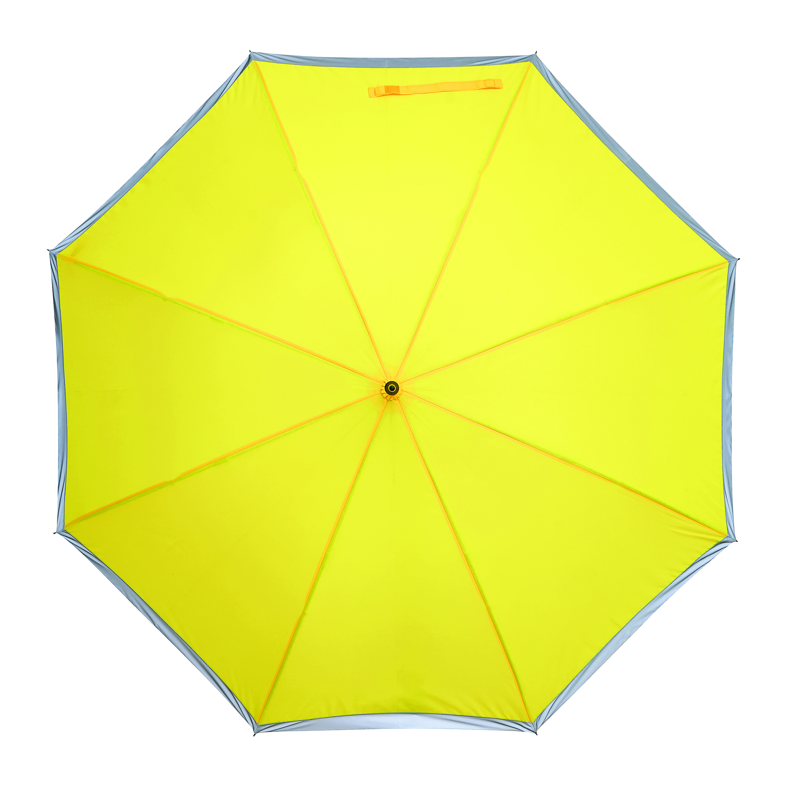 Automatyczny parasol CALIMA. Posiada metalową laskę, szyny z włókna szklanego, metalowe końcówki oraz uchwyt EVA. Czasza wykonana jest z poliestru pongee z tworzywa sztucznego pochodzącego z recyklingu / RPET i posiada srebrny pasek odbijający światło. Zapinany jest na rzep.