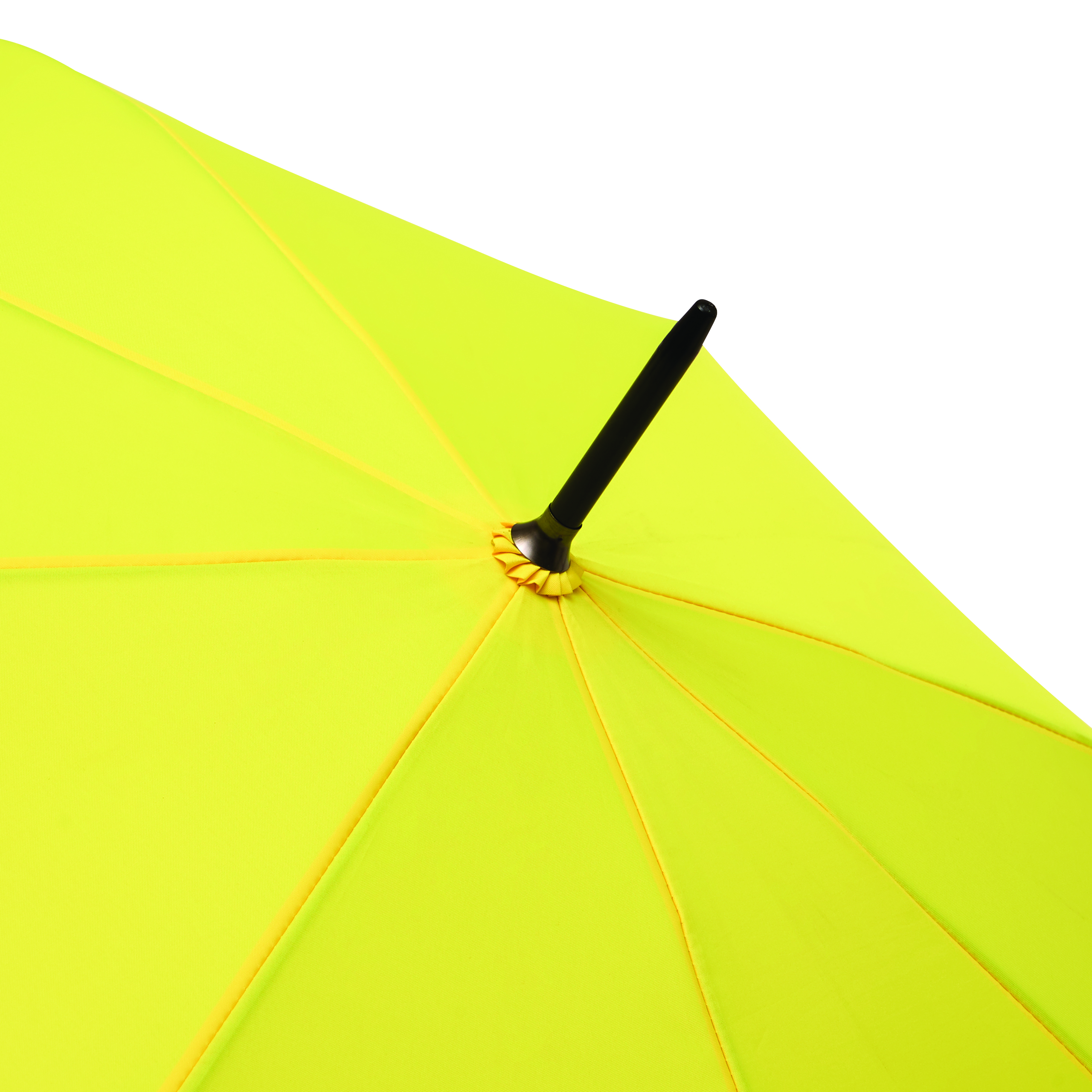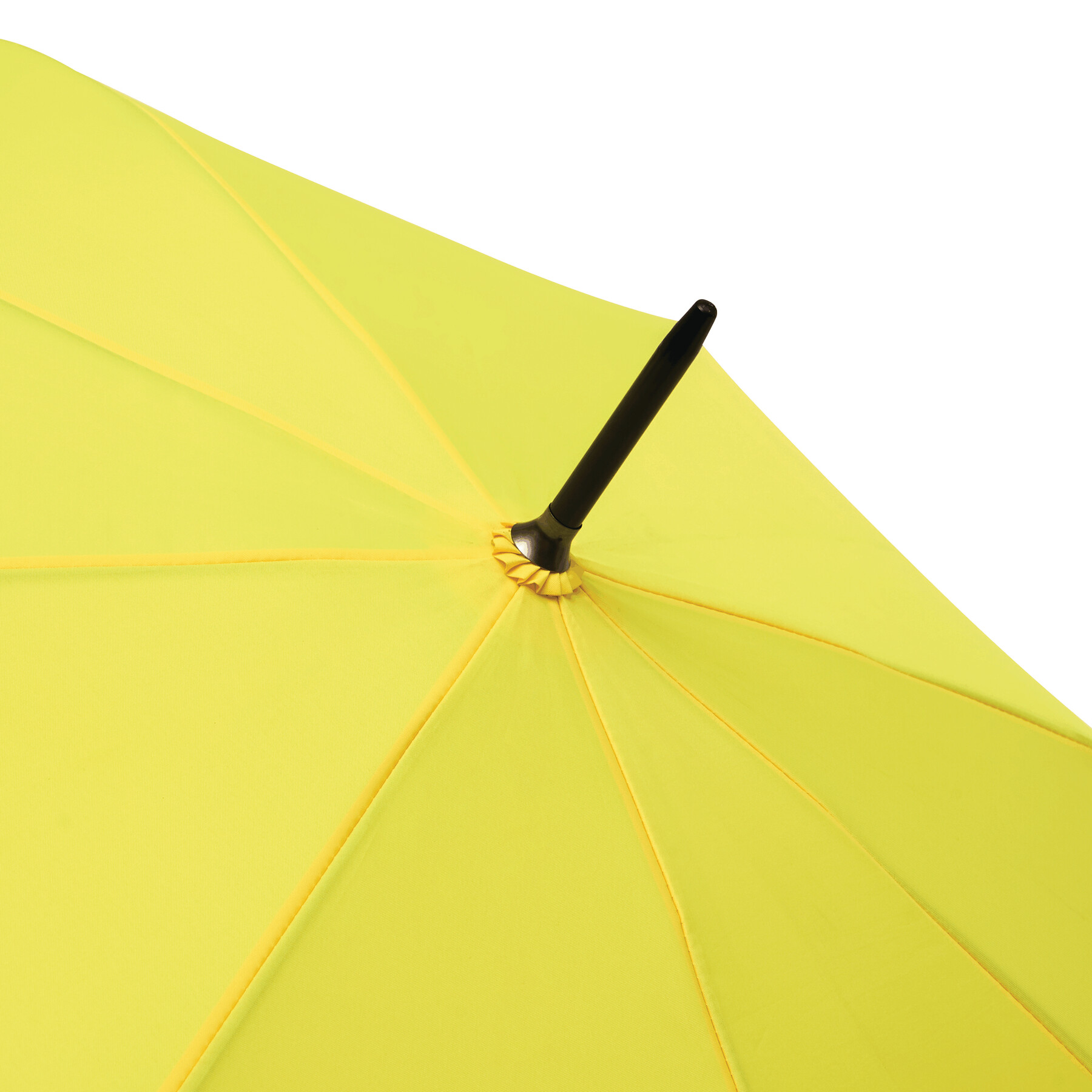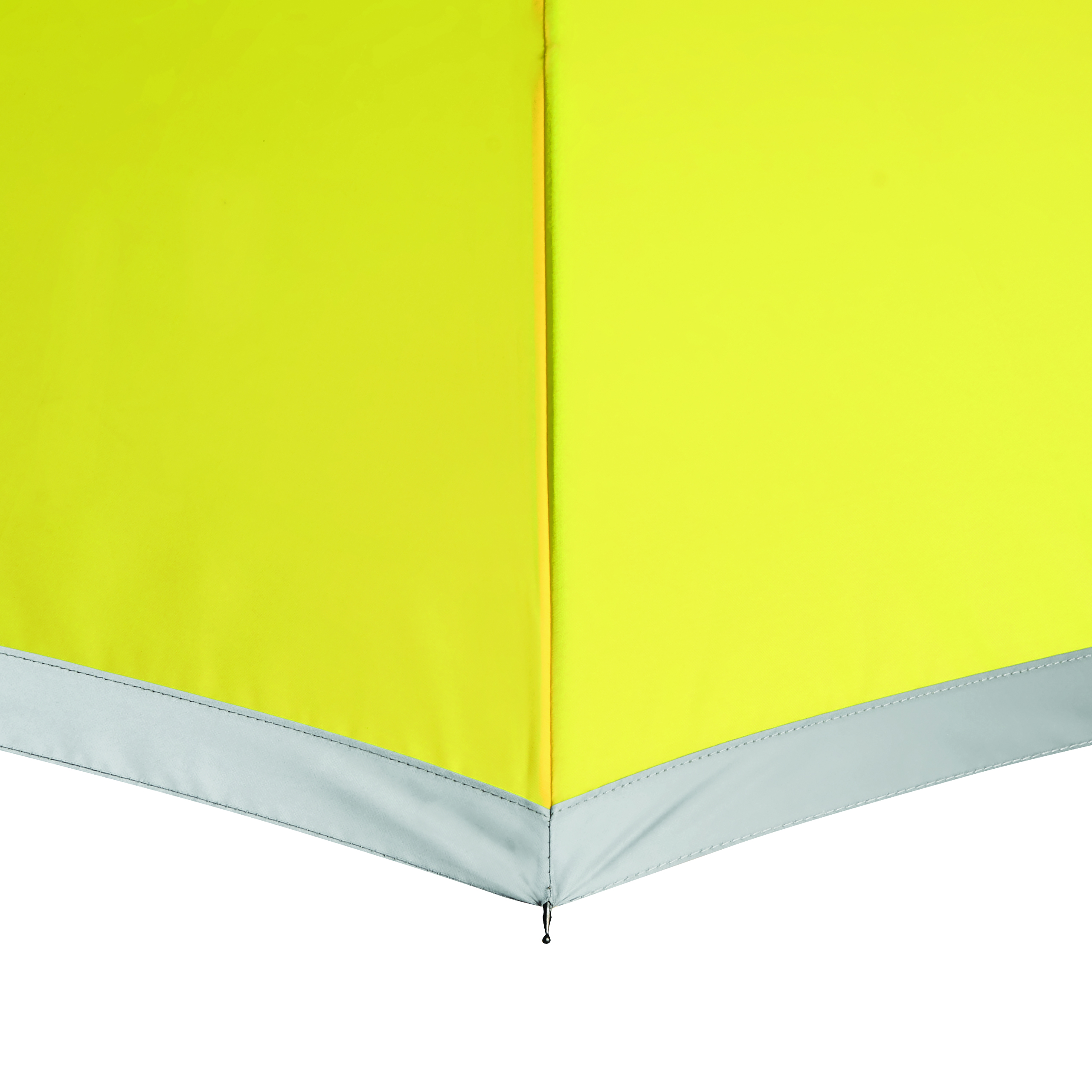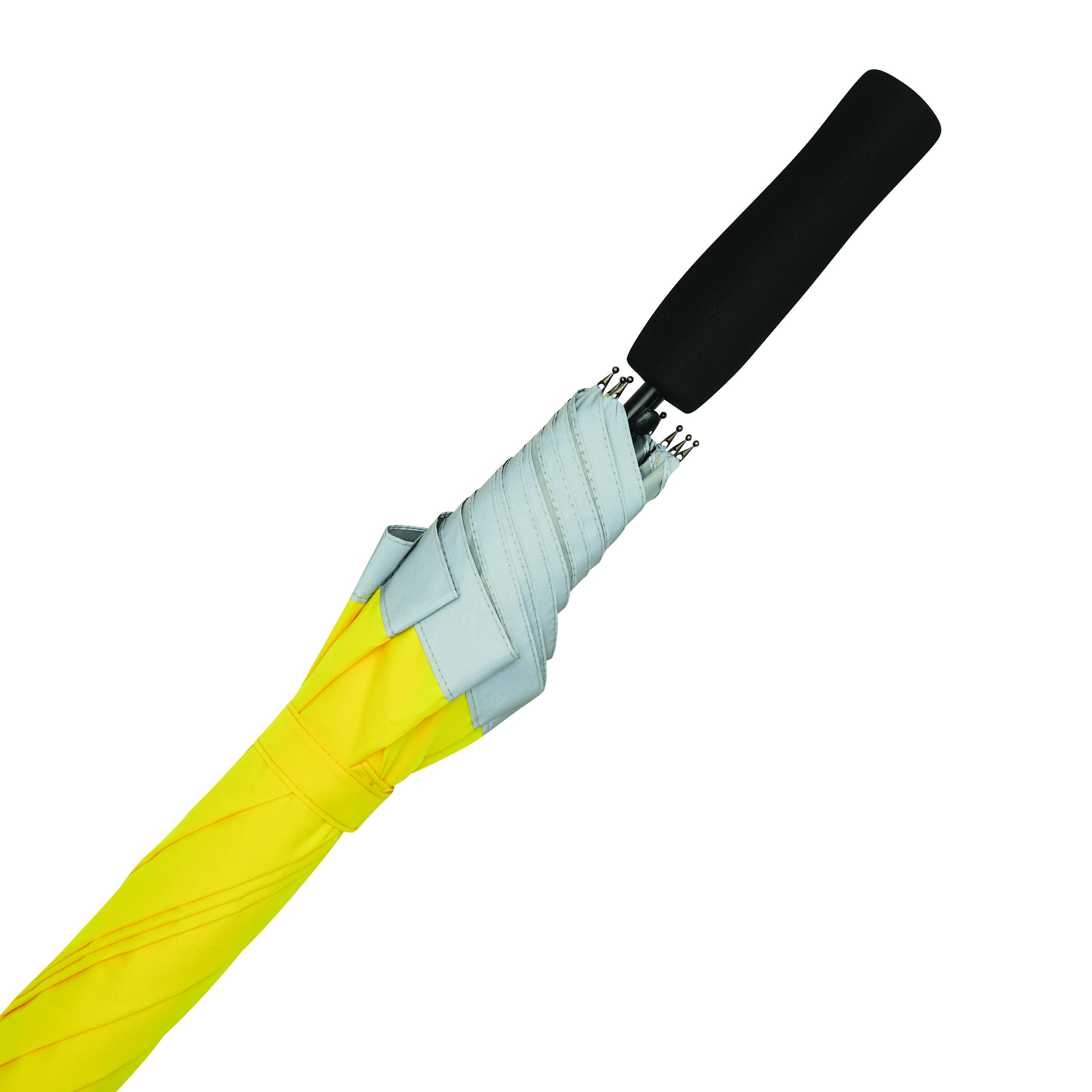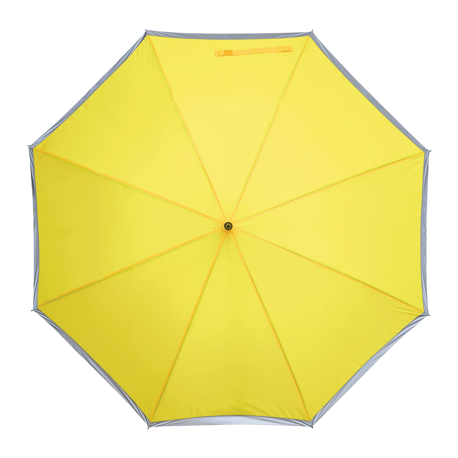 Automatyczny parasol CALIMA. Posiada metalową laskę, szyny z włókna szklanego, metalowe końcówki oraz uchwyt EVA. Czasza wykonana jest z poliestru pongee z tworzywa sztucznego pochodzącego z recyklingu / RPET i posiada srebrny pasek odbijający światło. Zapinany jest na rzep.
