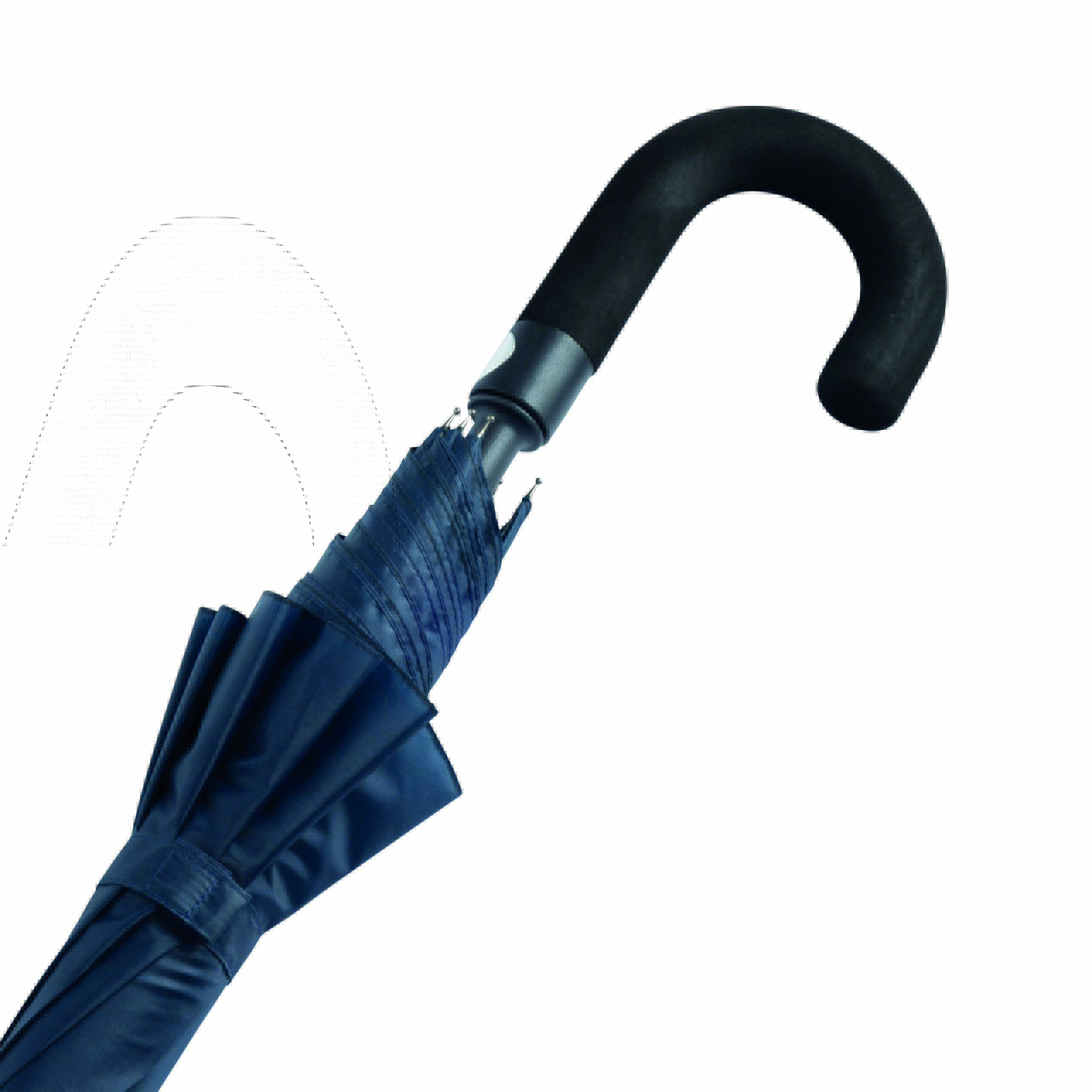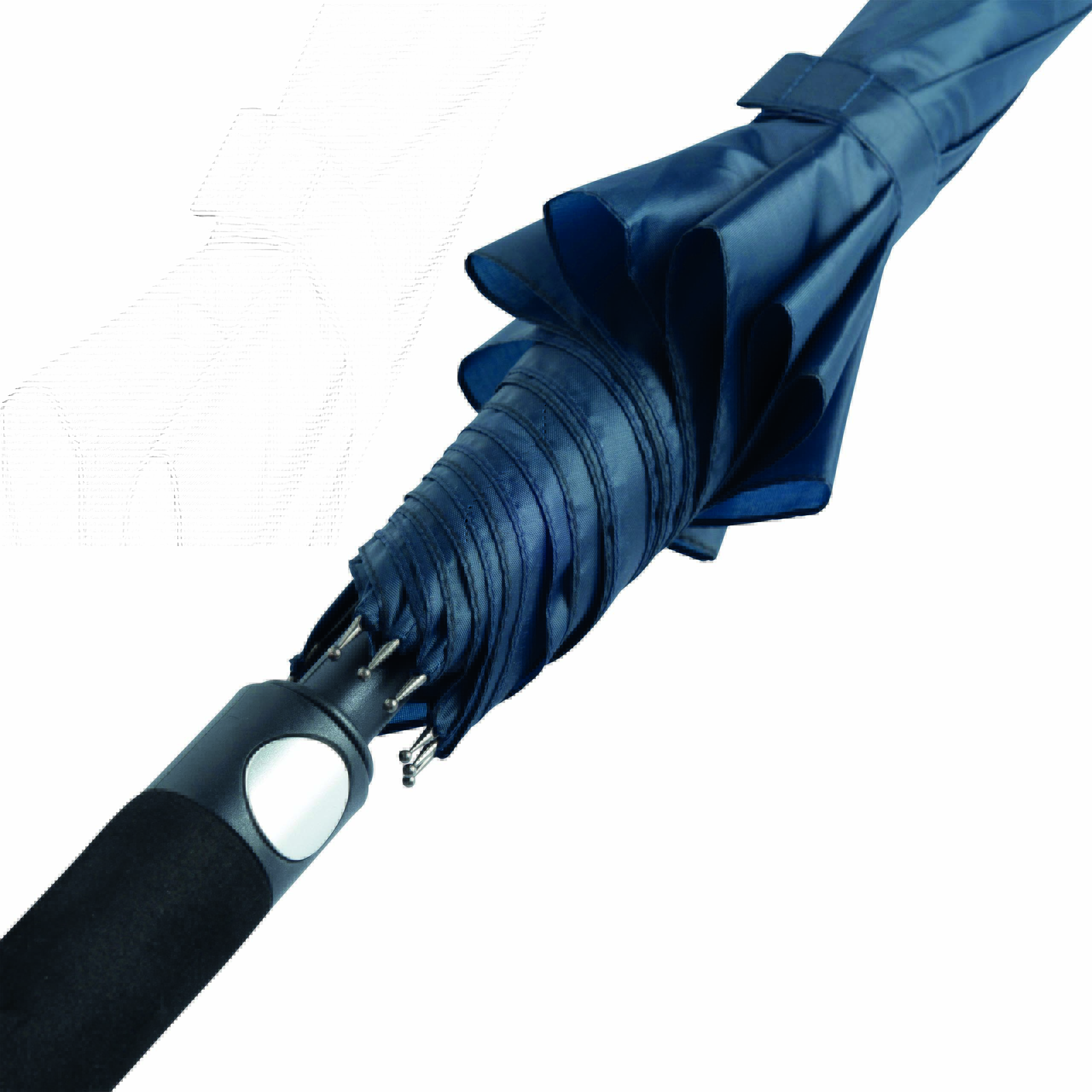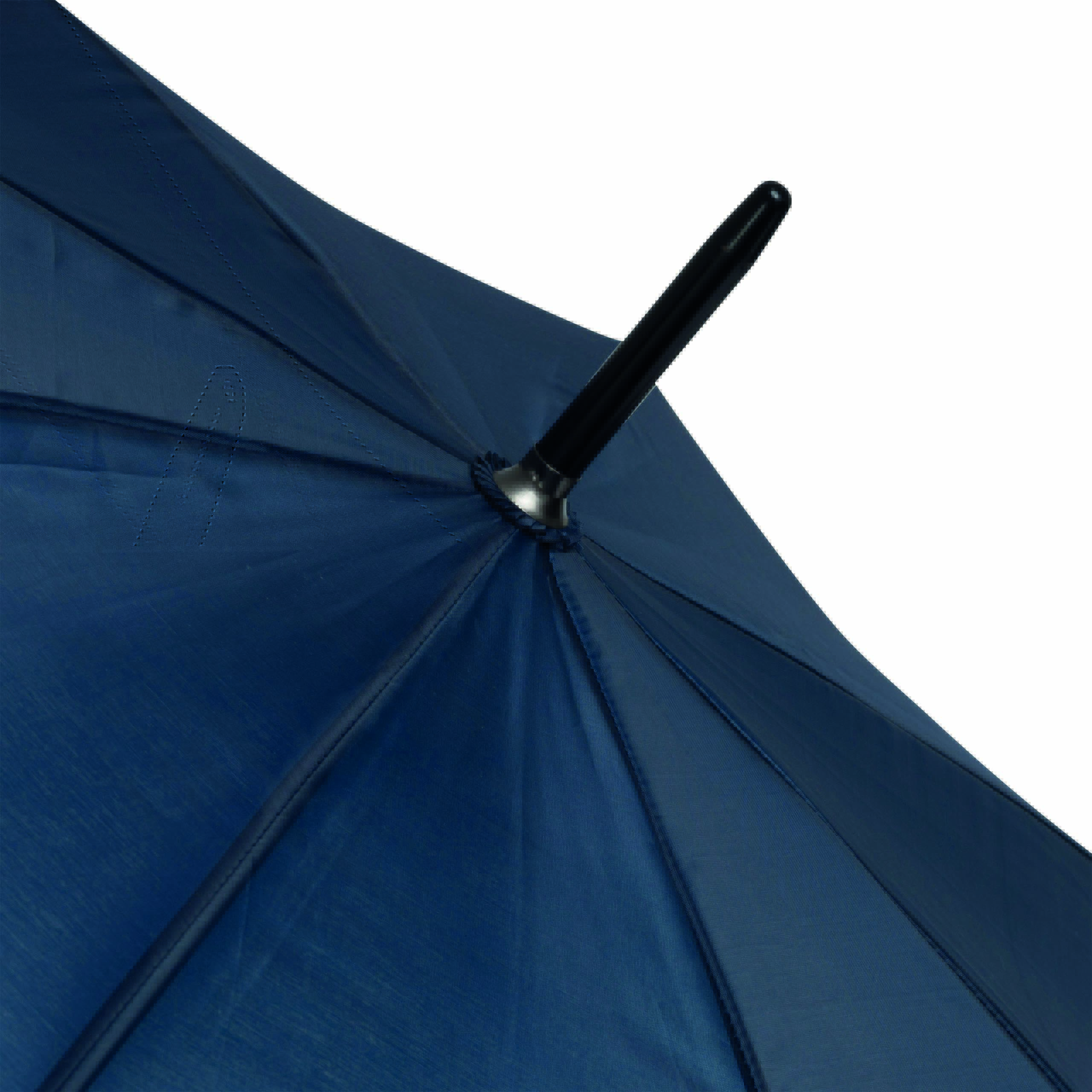 Parasol automatyczny typu golf SUBWAY z czarną metalową laską, szynami i kolcami. Czarny, zaokrąglony uchwyt z EVA z przyciskiem w kolorze srebrnym, poszycie z poliestru pongee ze specjalną wodoodporną powłoką, pasek spinający na rzep.