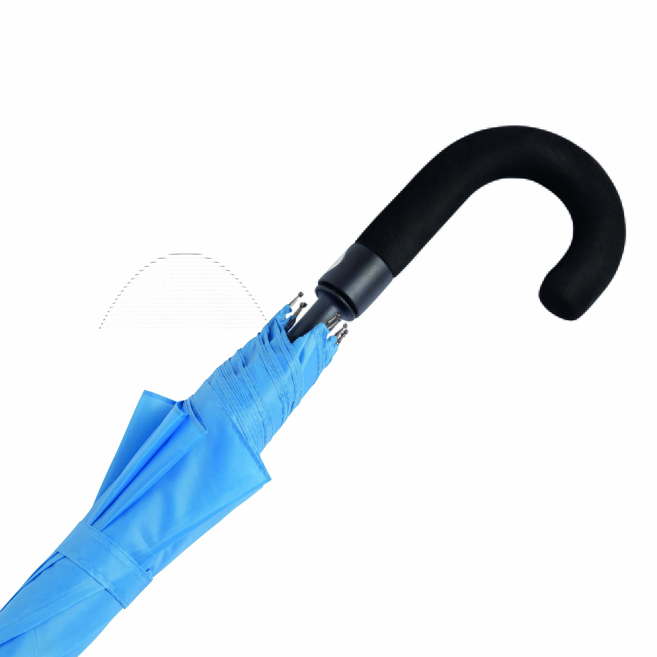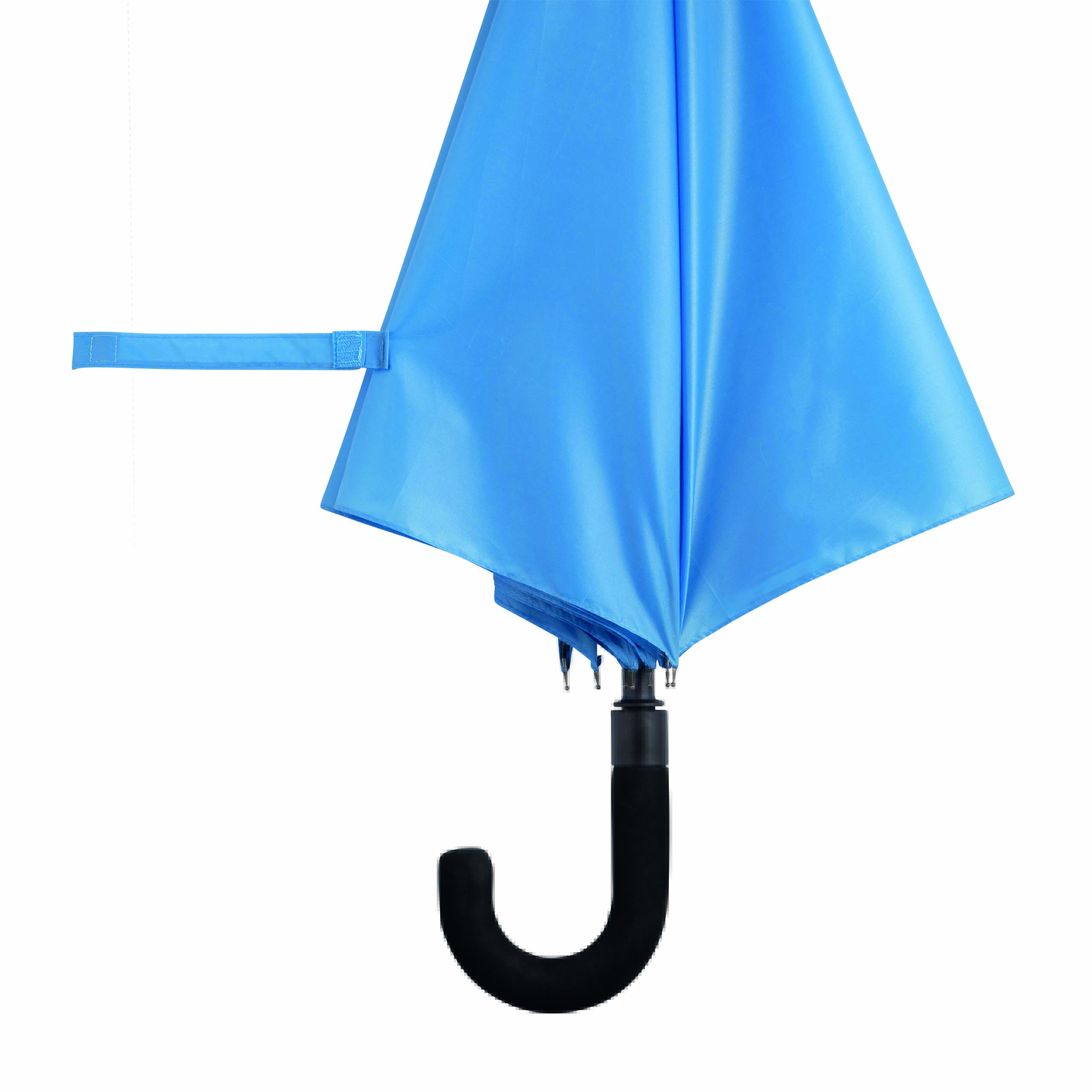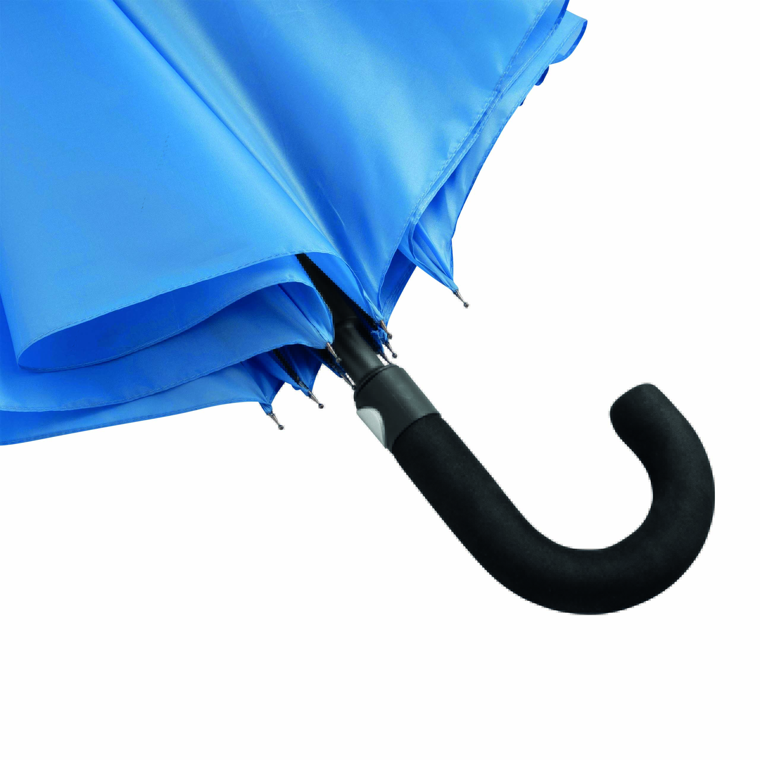 Parasol automatyczny typu golf SUBWAY z czarną metalową laską, szynami i kolcami. Czarny, zaokrąglony uchwyt z EVA z przyciskiem w kolorze srebrnym, poszycie z poliestru pongee ze specjalną wodoodporną powłoką, pasek spinający na rzep.