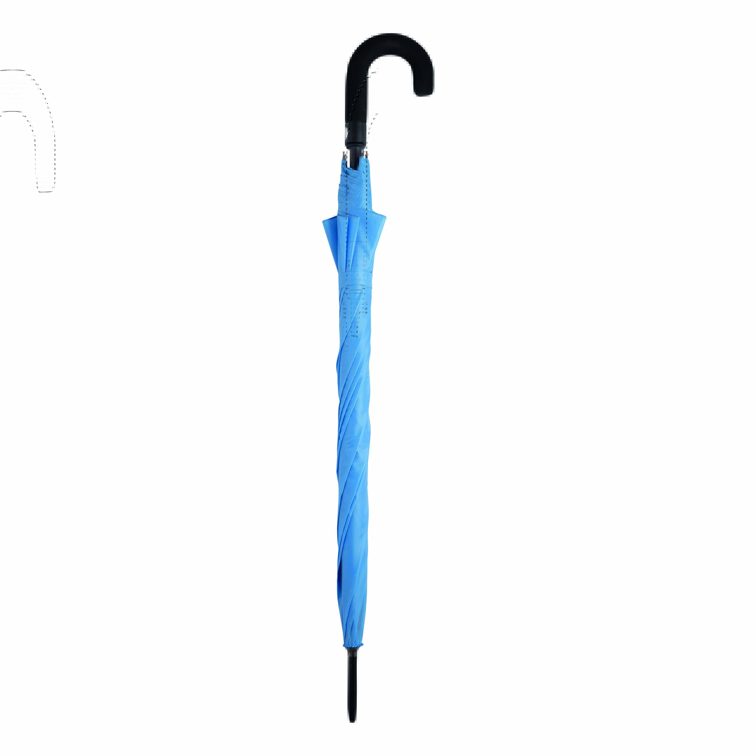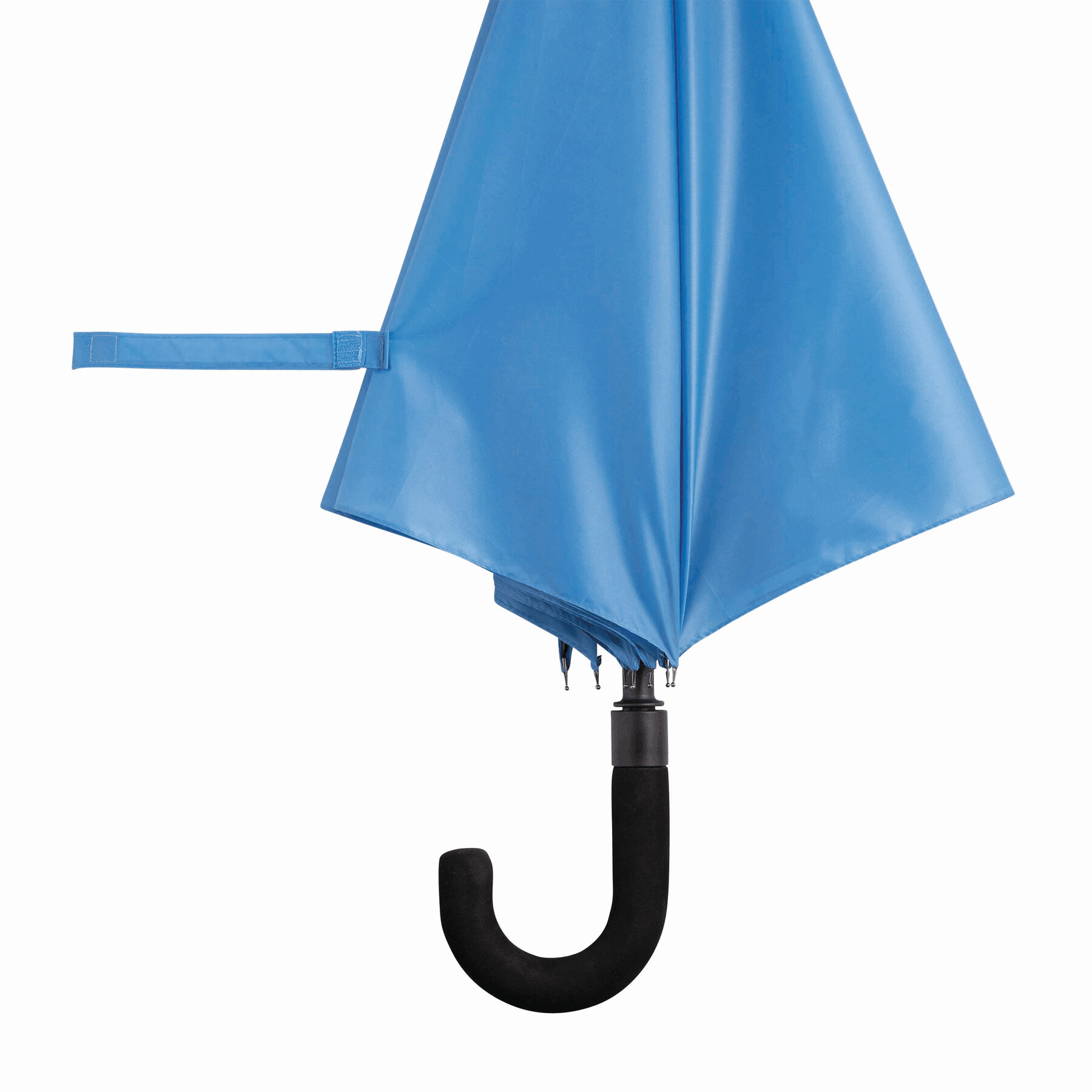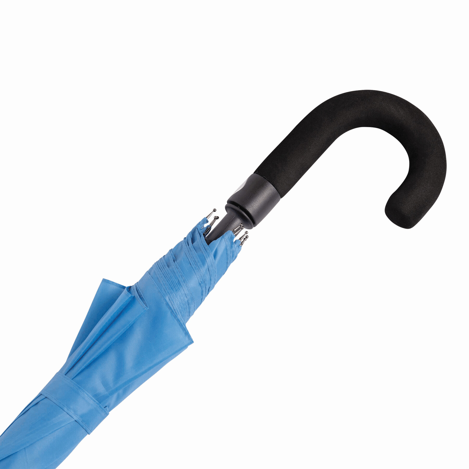 Parasol automatyczny typu golf SUBWAY z czarną metalową laską, szynami i kolcami. Czarny, zaokrąglony uchwyt z EVA z przyciskiem w kolorze srebrnym, poszycie z poliestru pongee ze specjalną wodoodporną powłoką, pasek spinający na rzep.