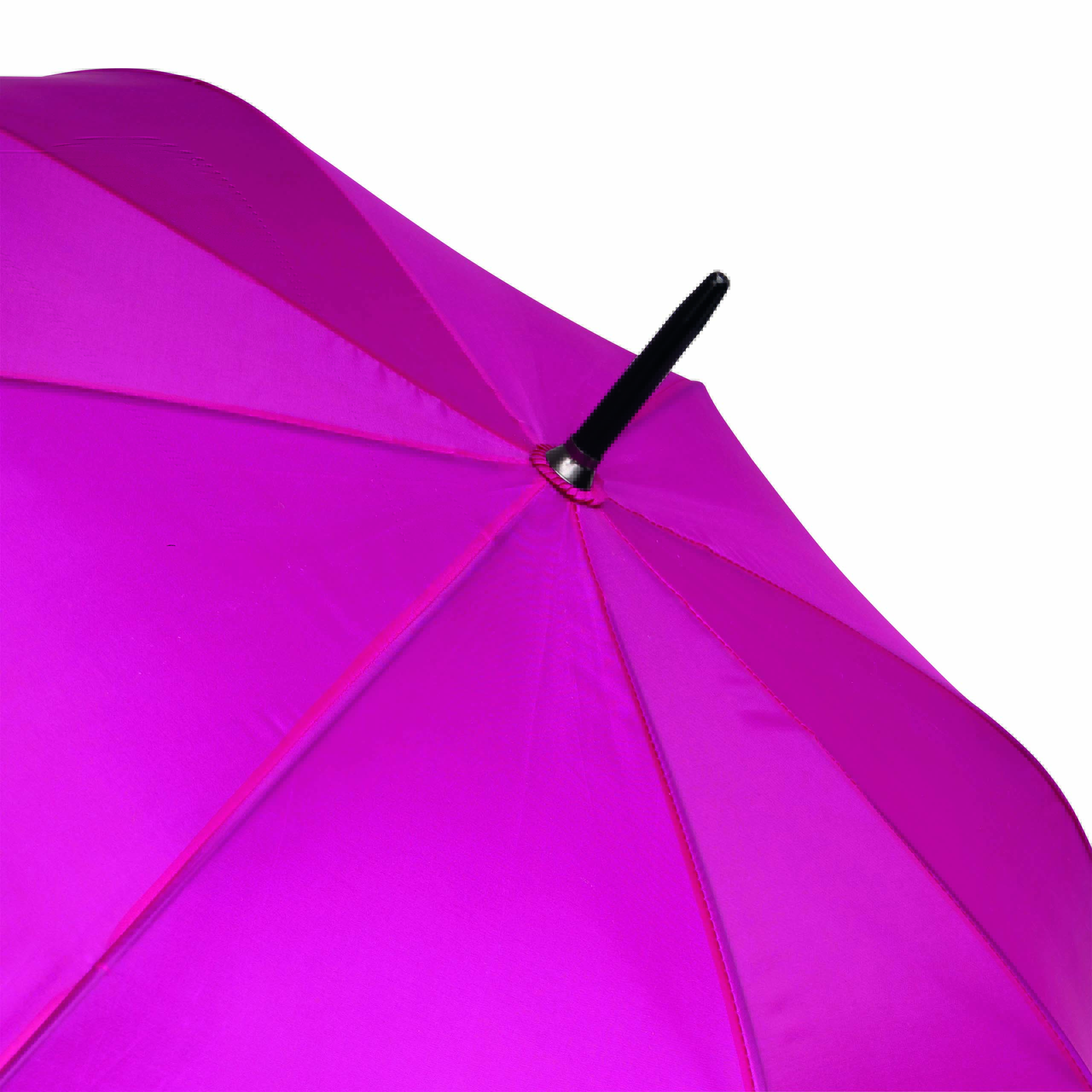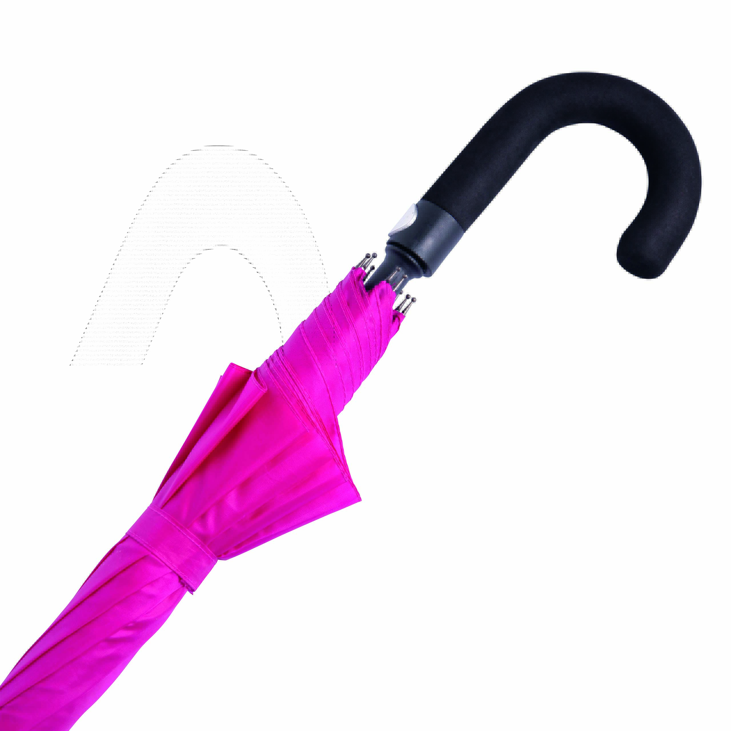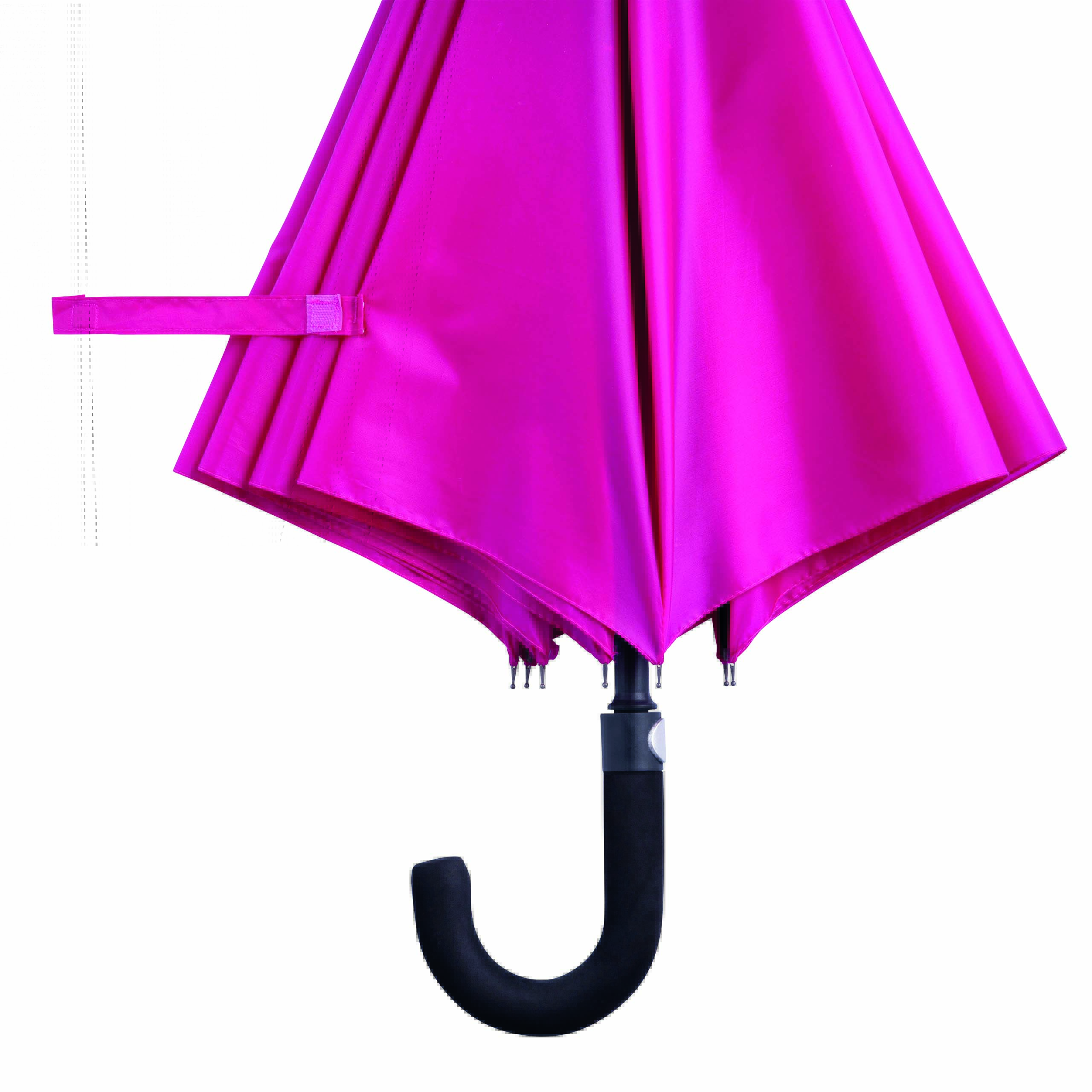 Parasol automatyczny typu golf SUBWAY z czarną metalową laską, szynami i kolcami. Czarny, zaokrąglony uchwyt z EVA z przyciskiem w kolorze srebrnym, poszycie z poliestru pongee ze specjalną wodoodporną powłoką, pasek spinający na rzep.