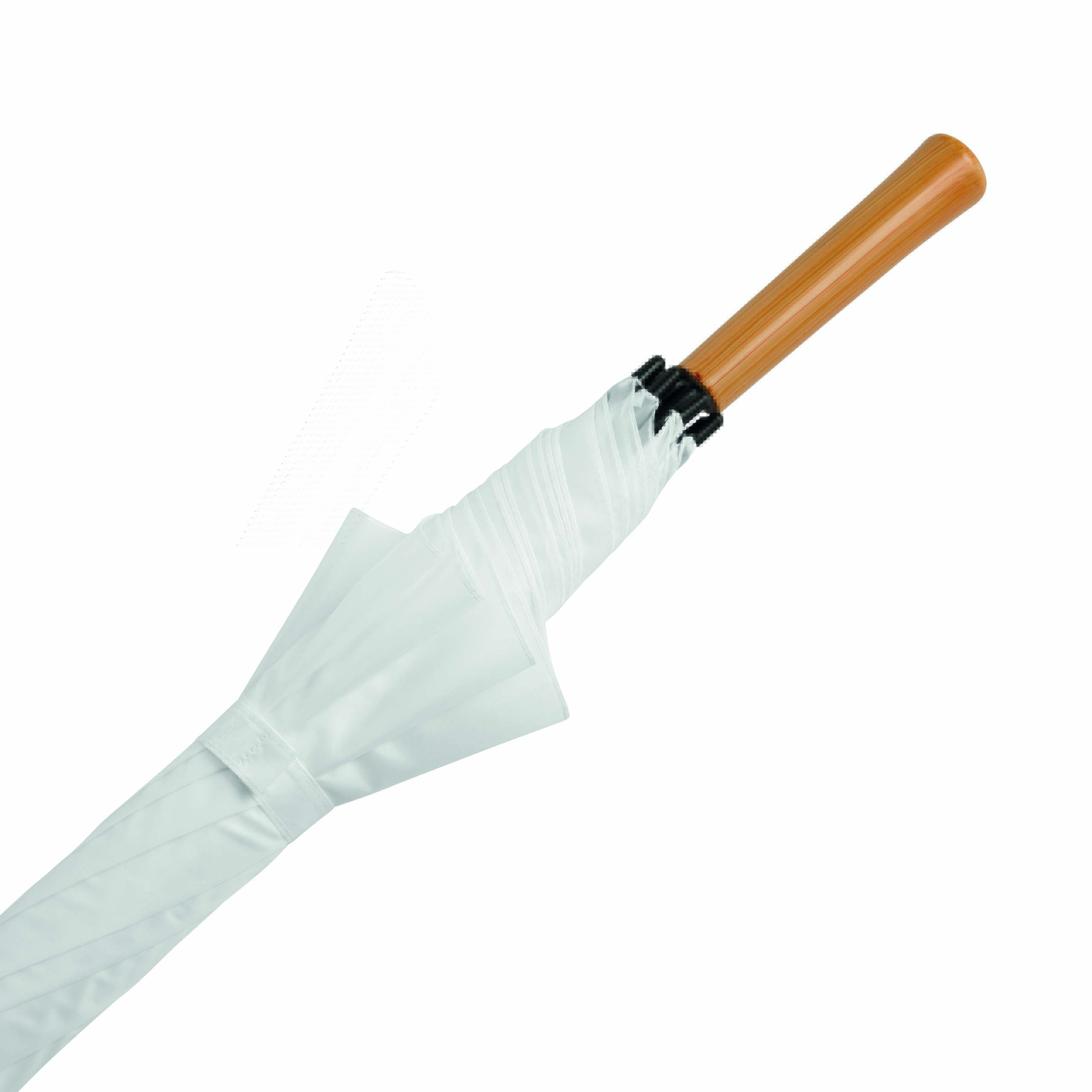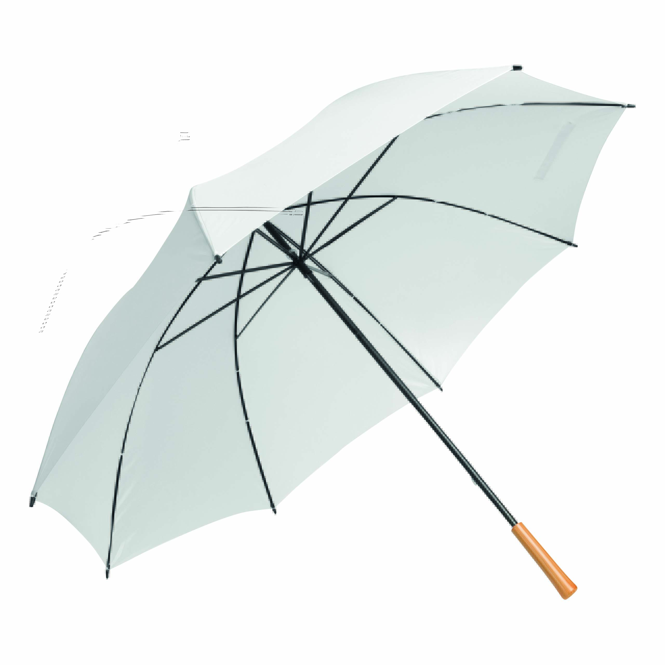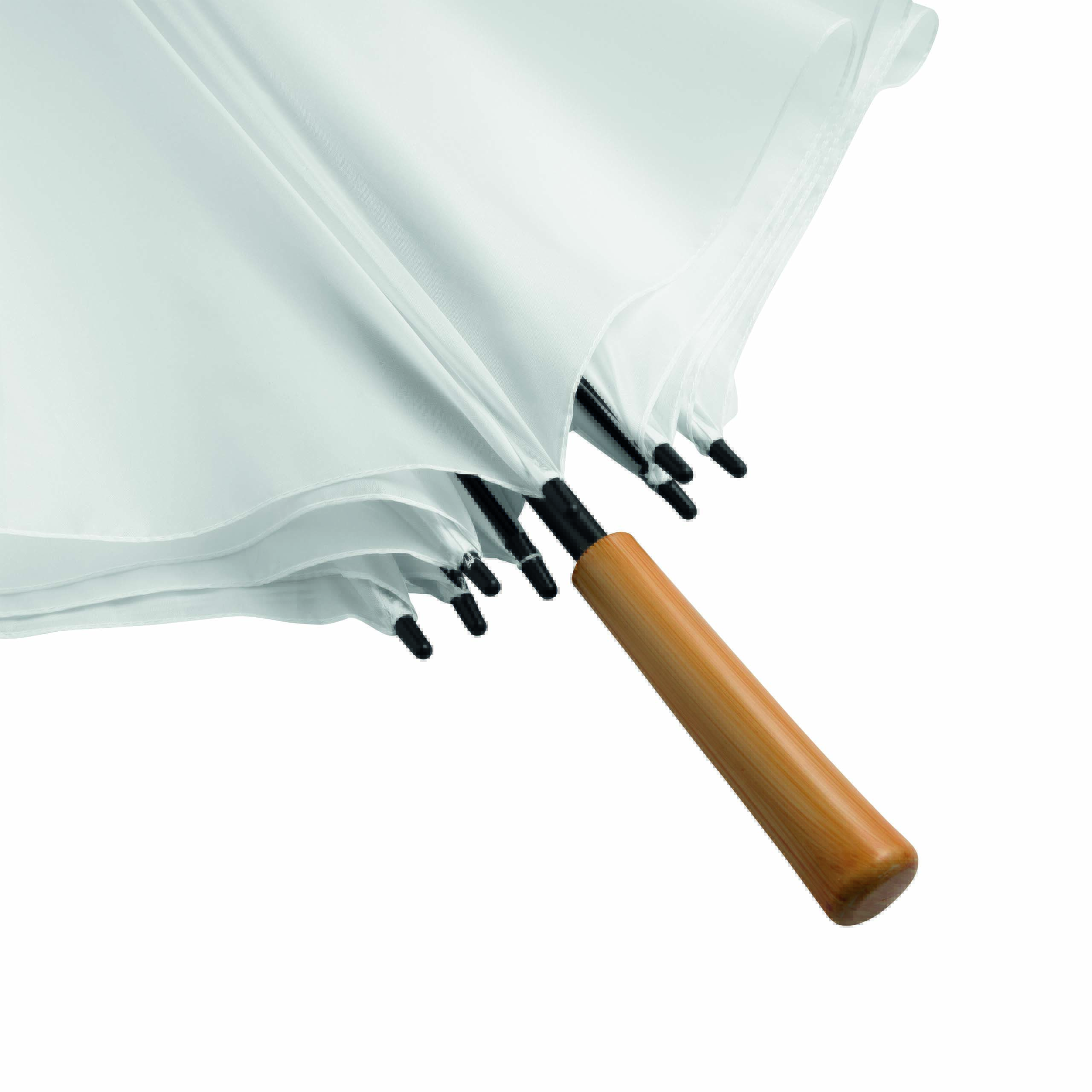 Parasol typu golf RAINDROPS z metalową laską i podwójnymi metalowymi szynami, plastikowe kolce, uchwyt o drewnianym wyglądzie, poszycie poliestrowe, zapinany na rzep.