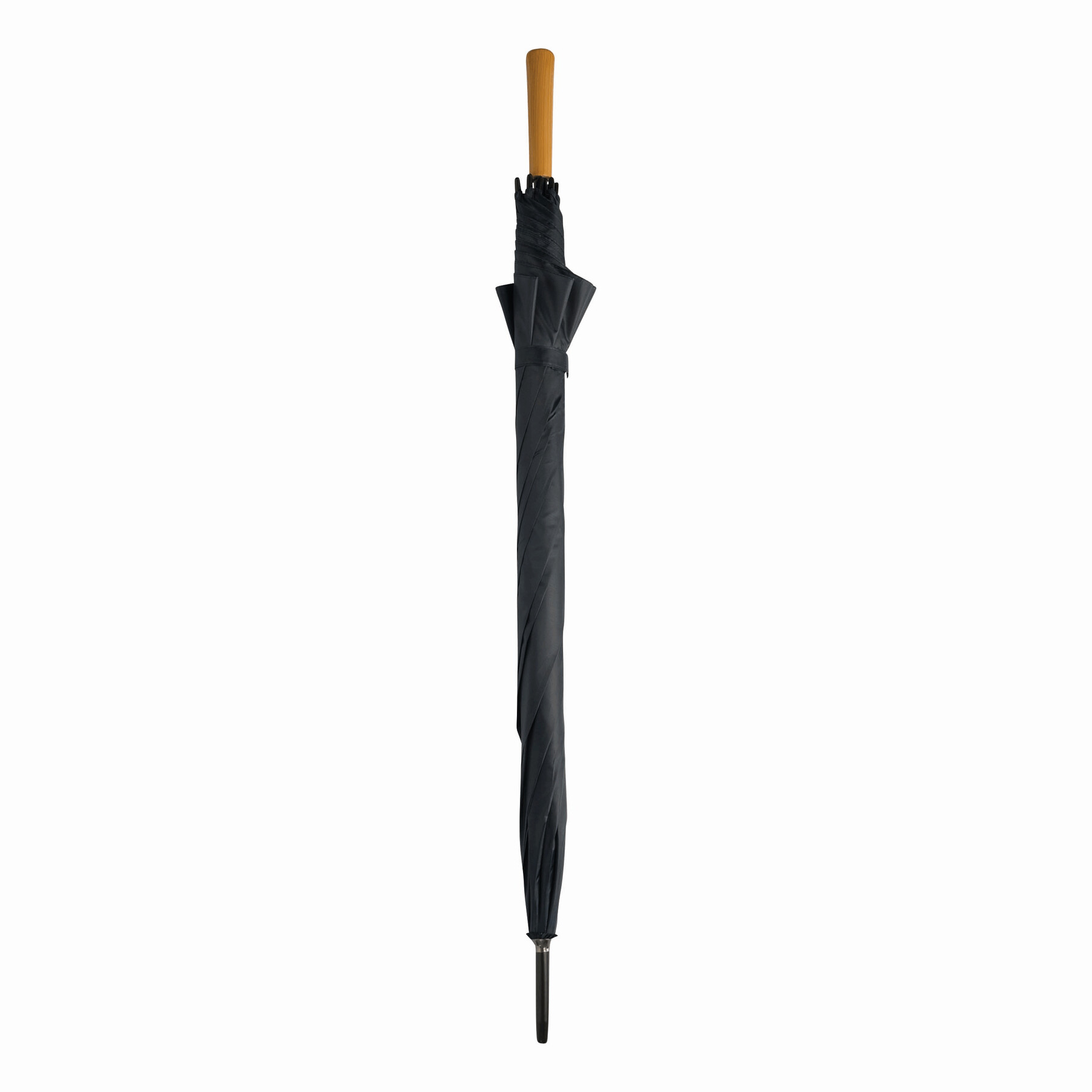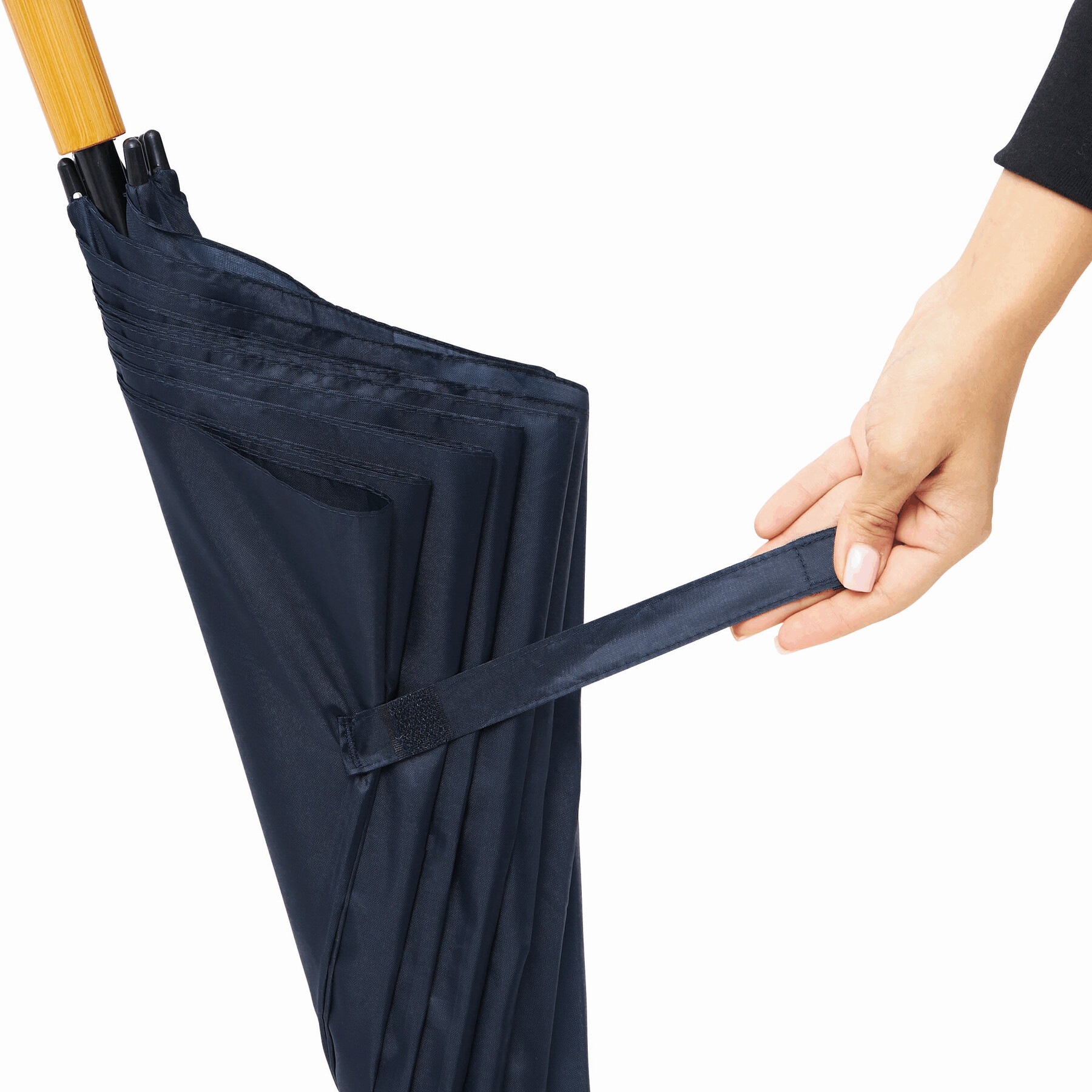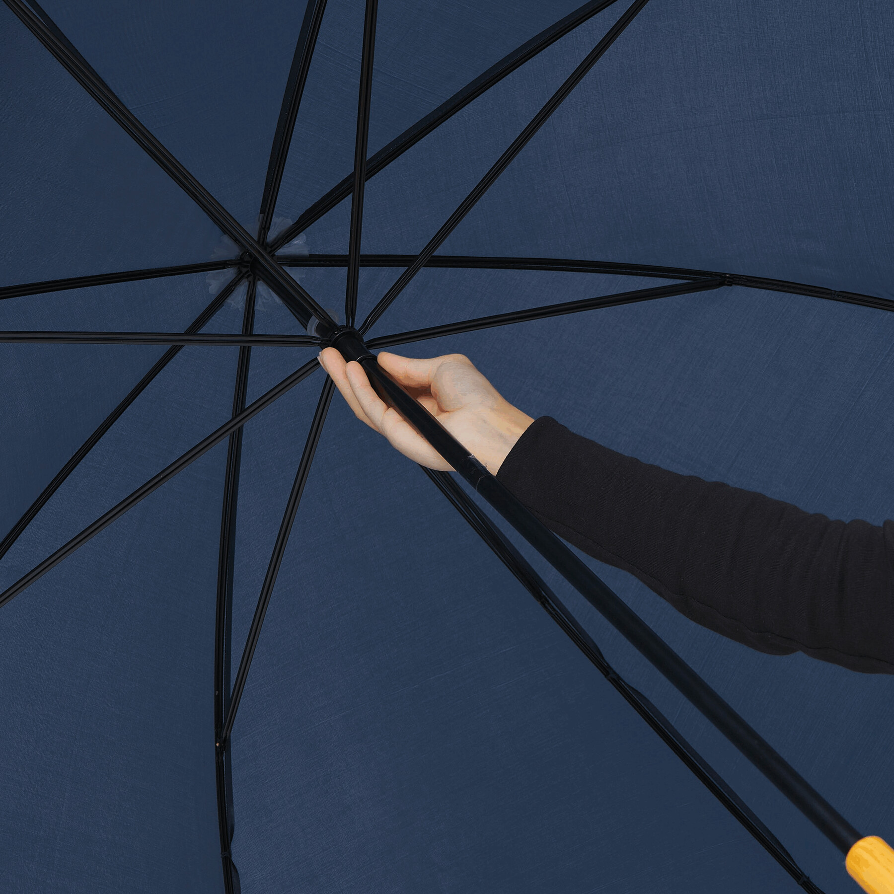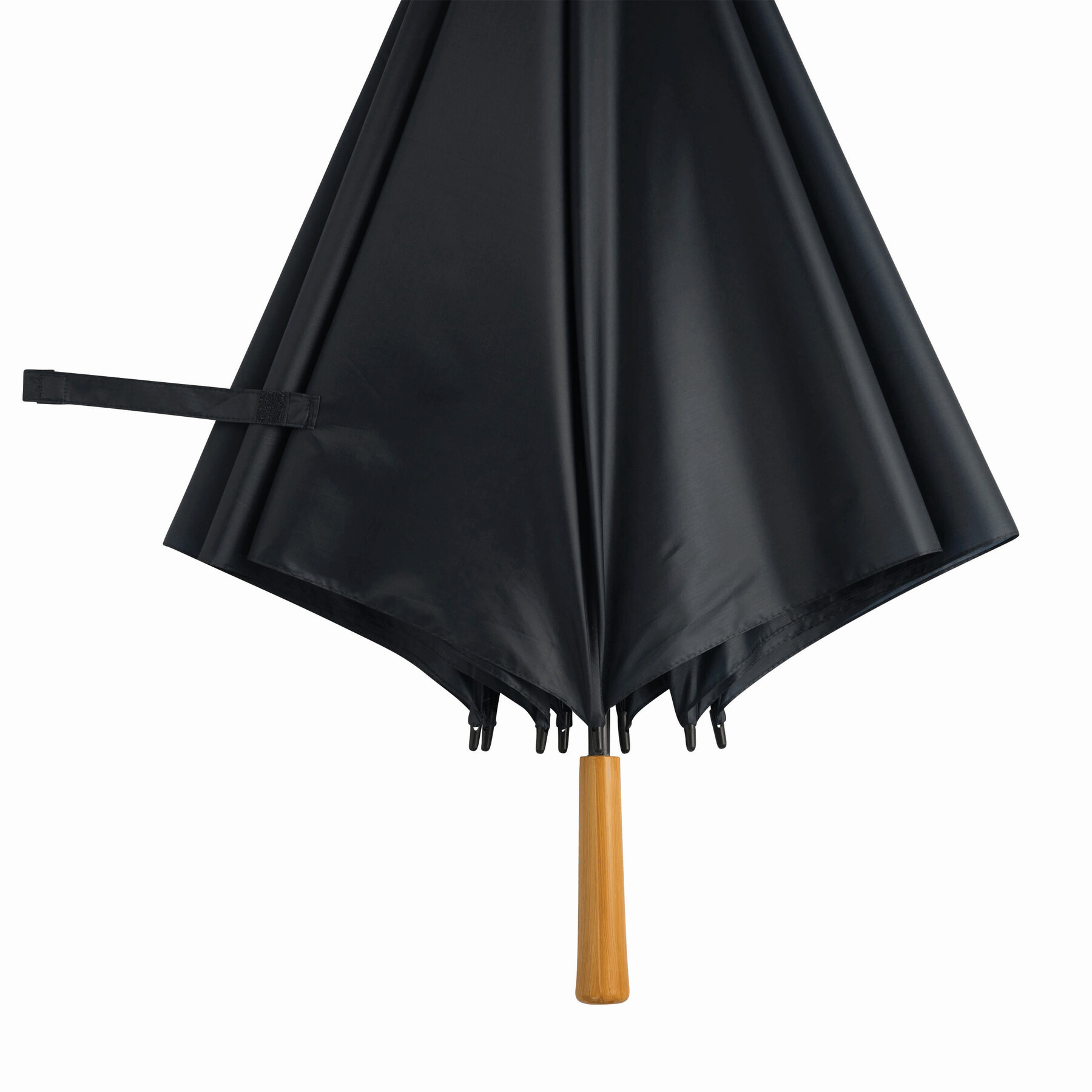 Parasol typu golf RAINDROPS z metalową laską i podwójnymi metalowymi szynami, plastikowe kolce, uchwyt o drewnianym wyglądzie, poszycie poliestrowe, zapinany na rzep.