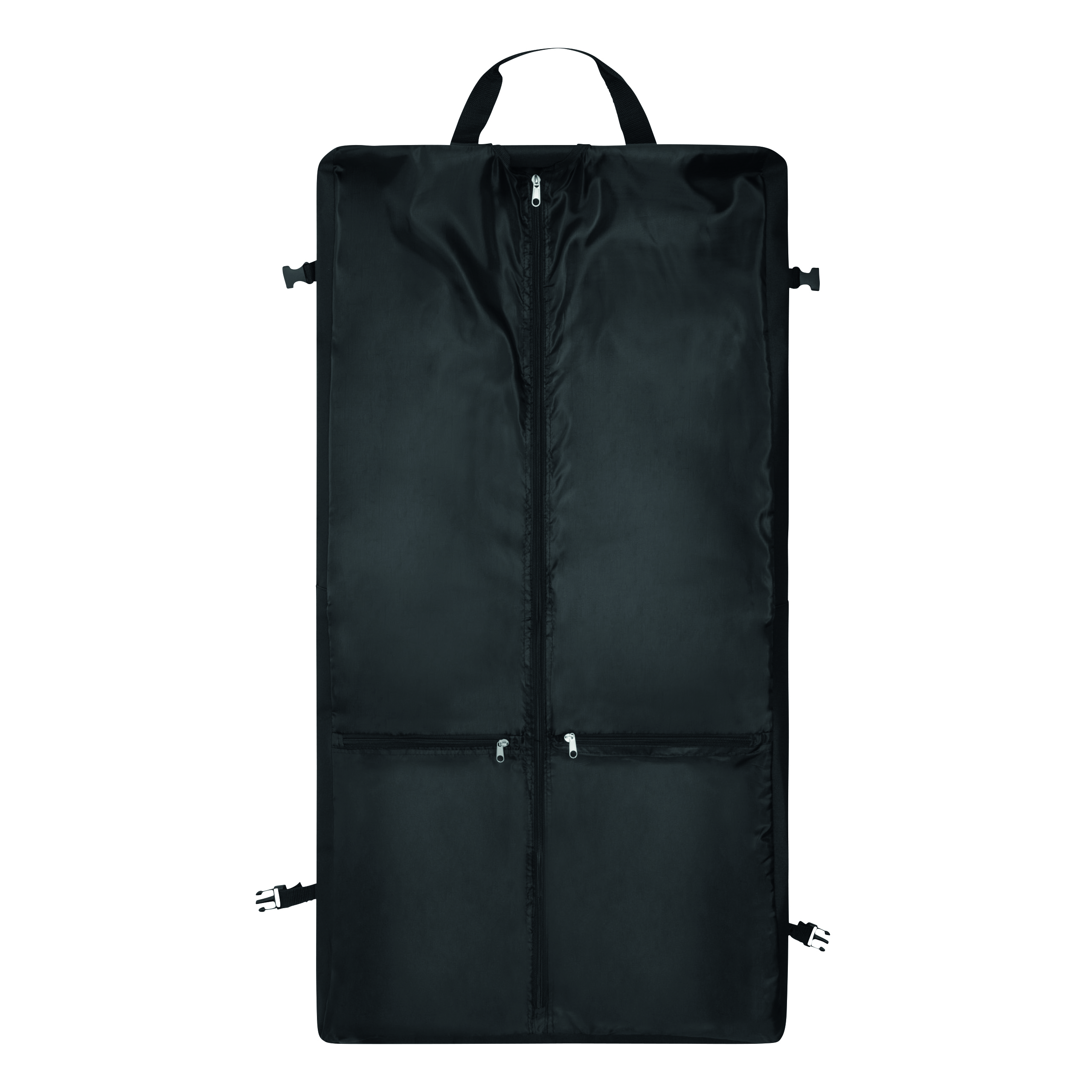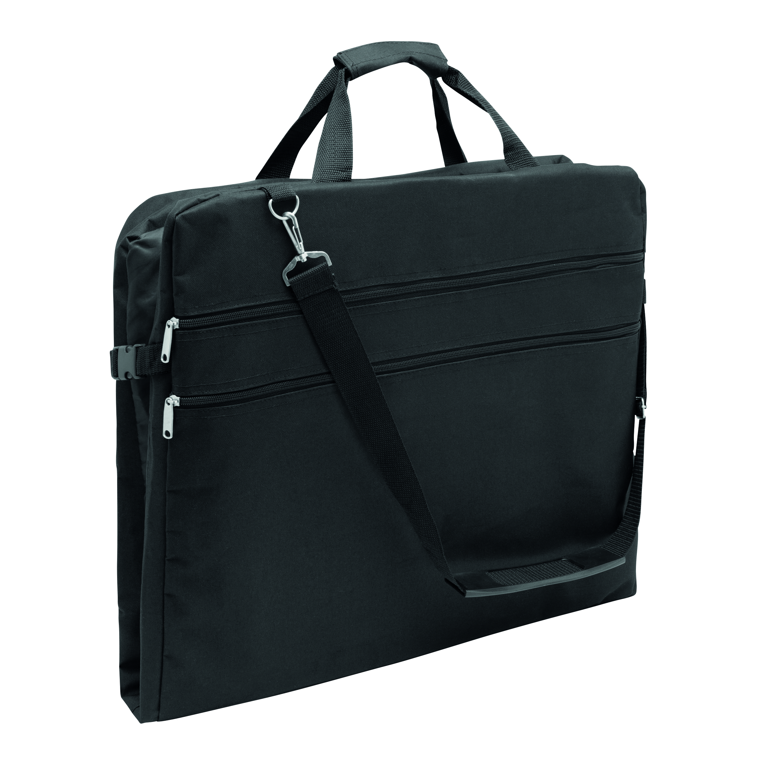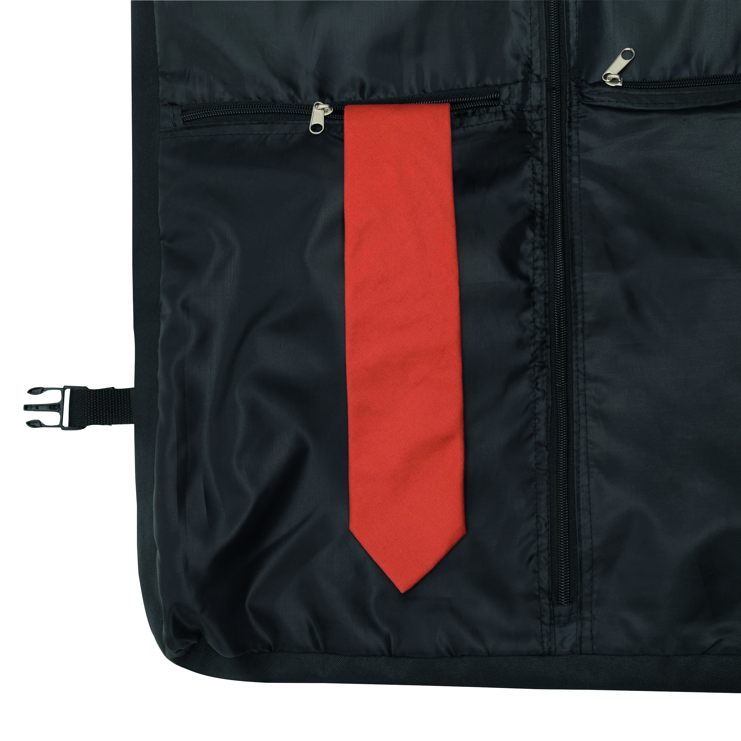 Pokrowiec na ubrania SMOKING ze stabilnym, metalowym wieszakiem i dodatkową kieszonką zamykaną na rzep. 2 uchwyty do przenoszenia z zapięciem na rzep, 2 klipy boczne, 2 kieszenie przednie, 1 duża wewnętrzna kieszeń zamykana na zamek i dwie mniejsze, regulowany i odczepiany pasek na ramię z miękką podkładką.