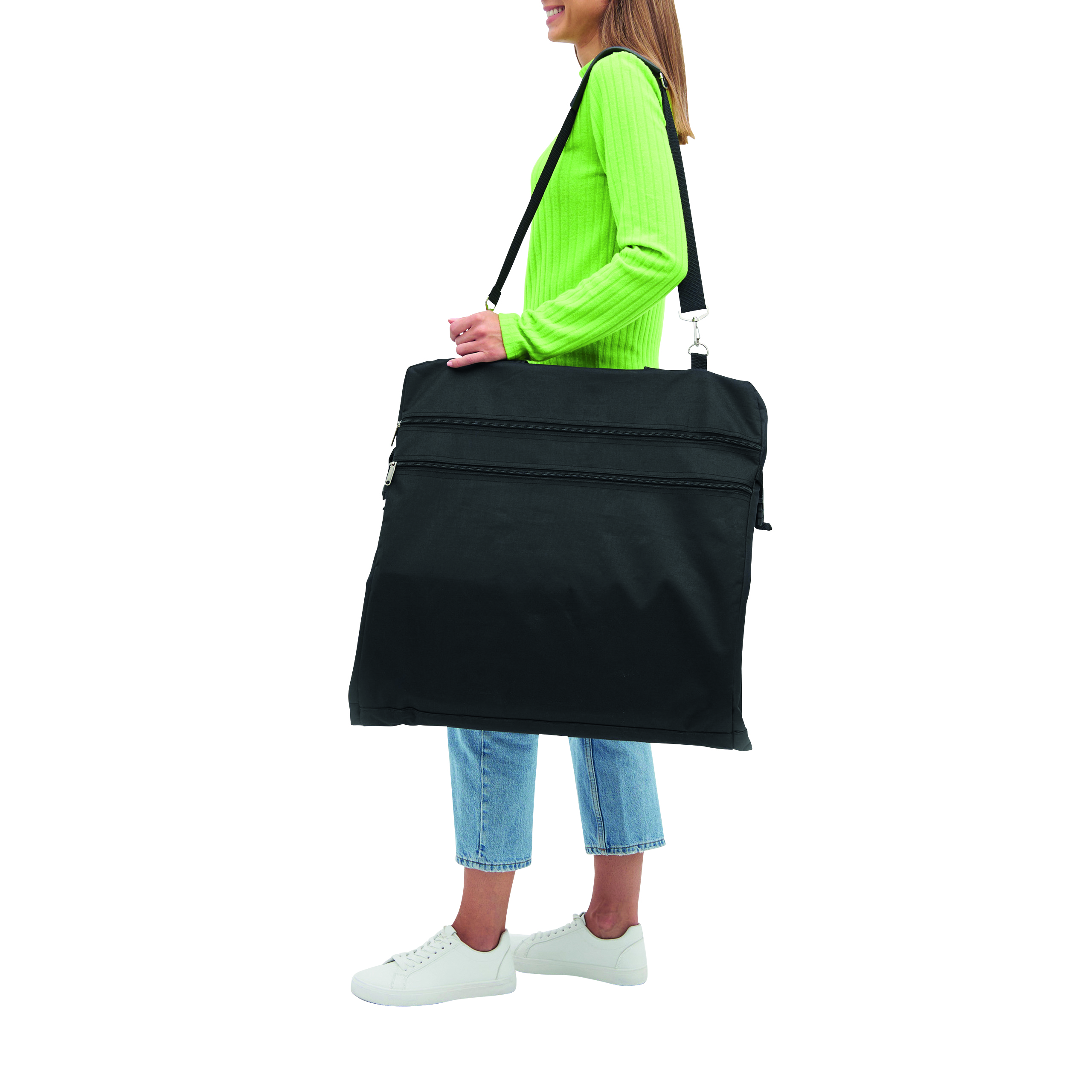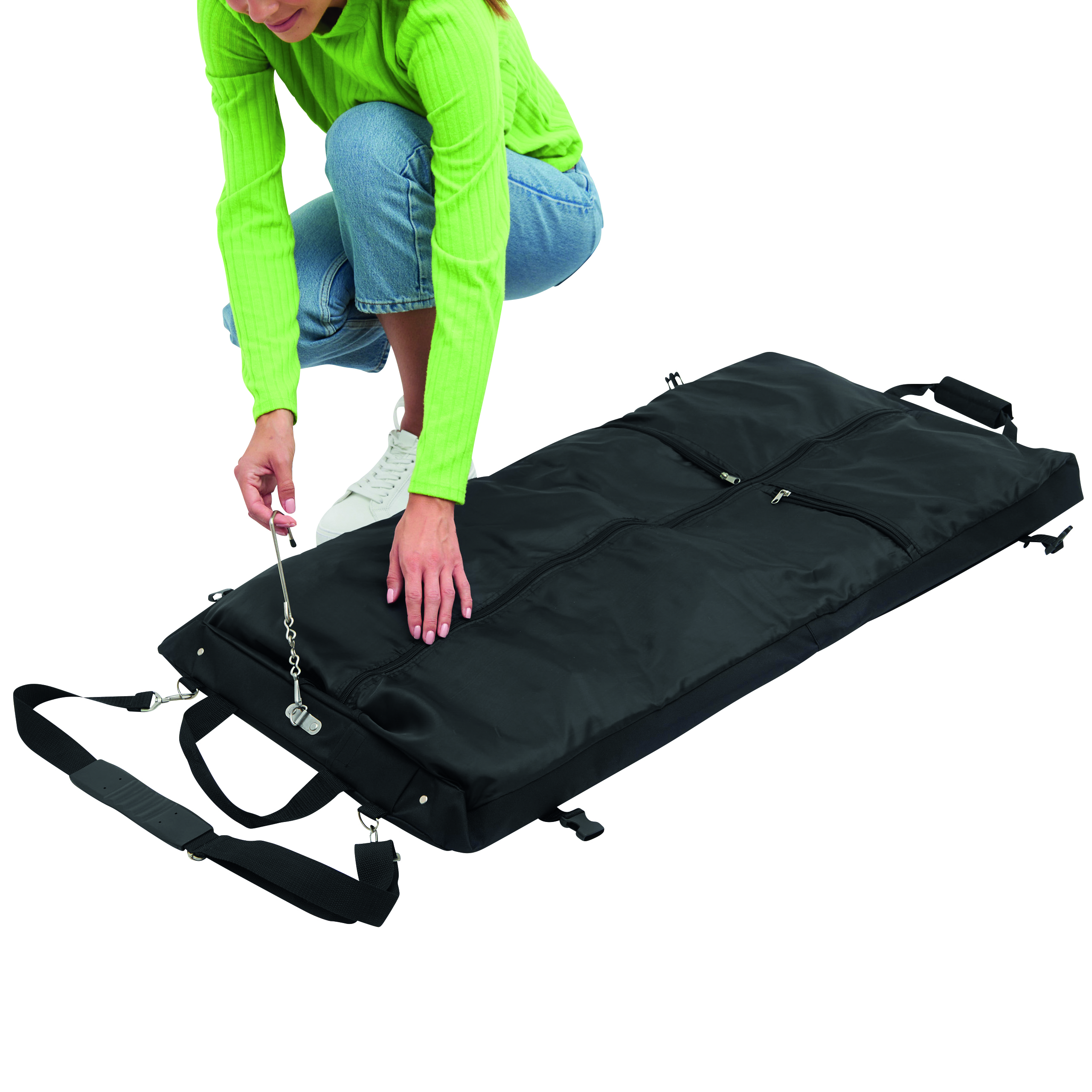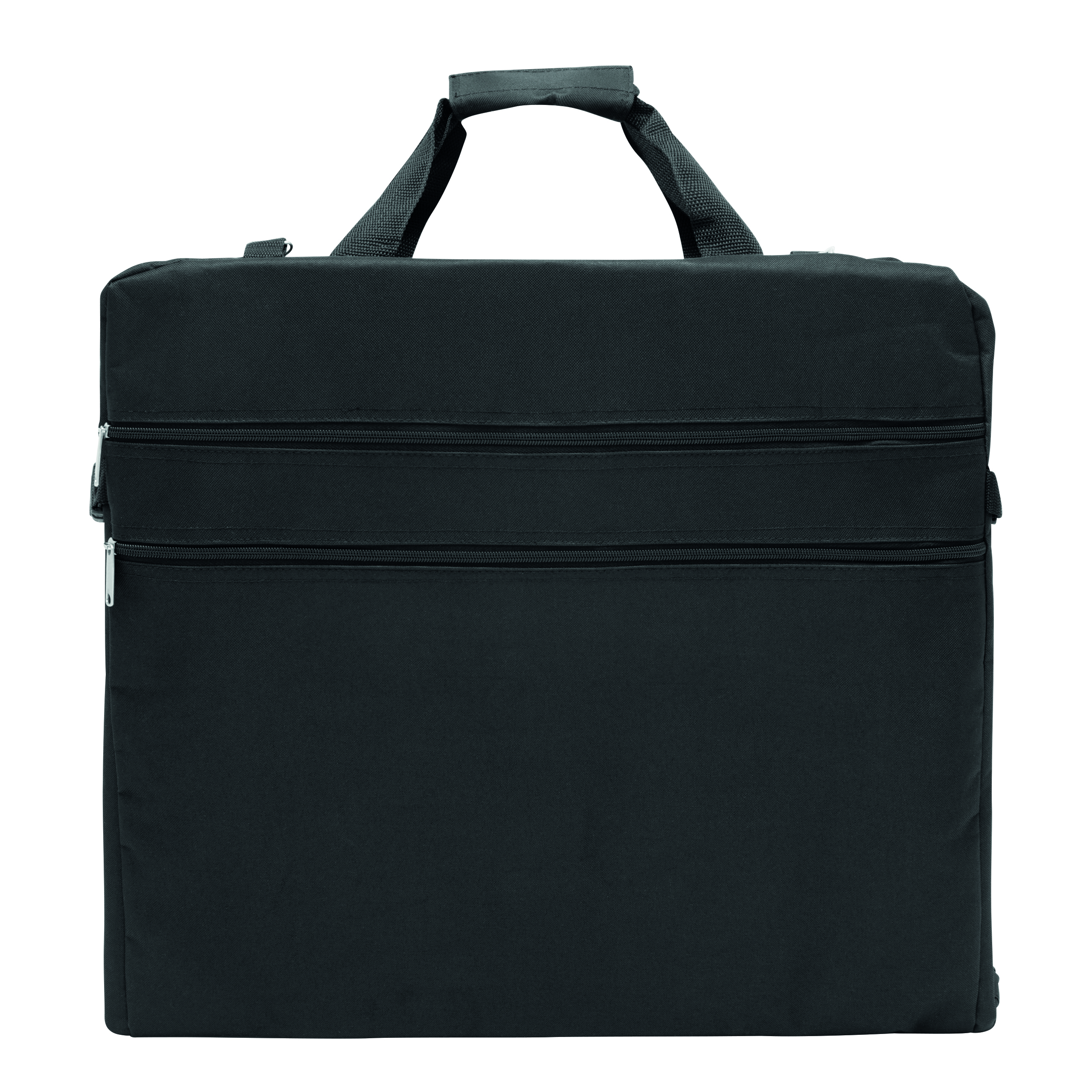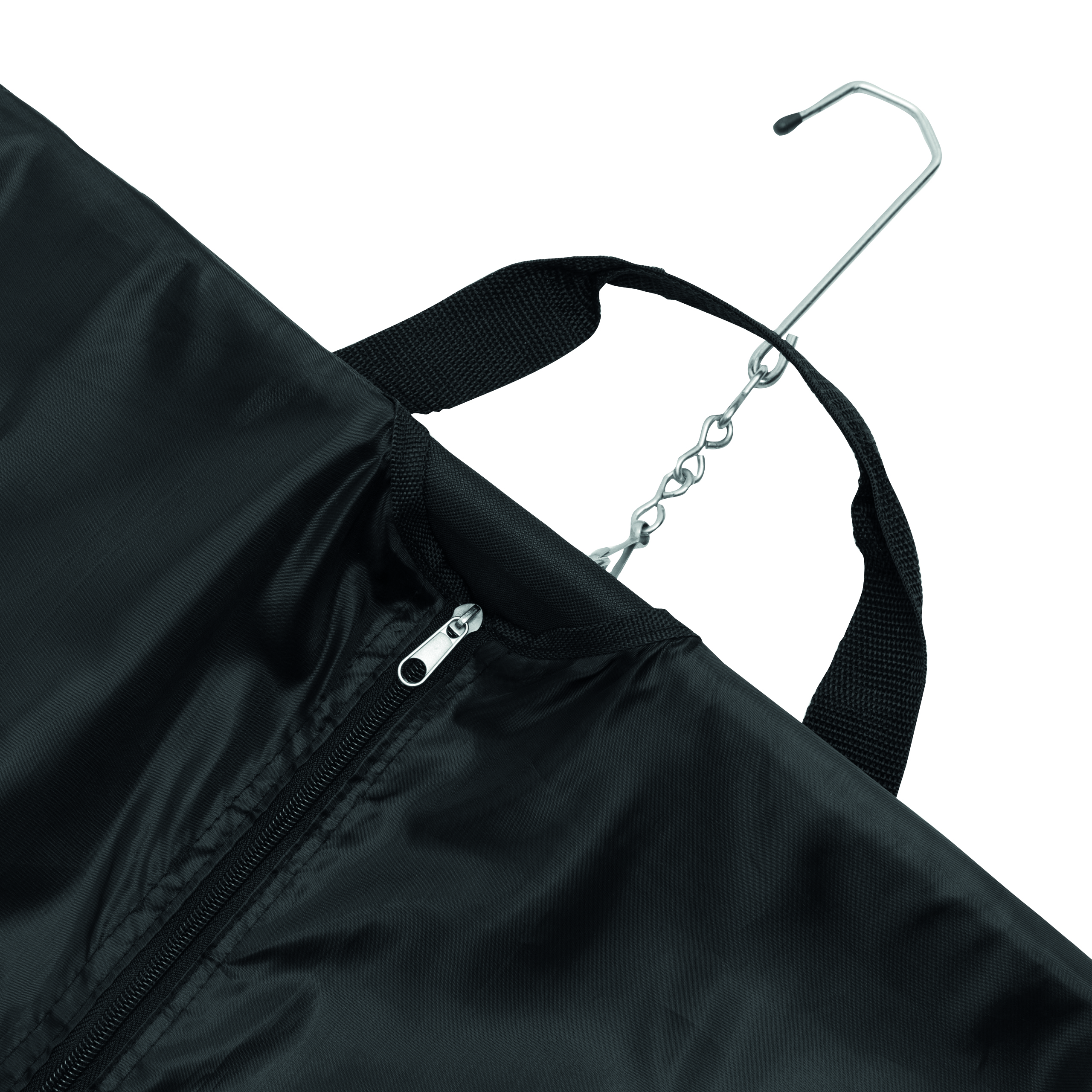 Pokrowiec na ubrania SMOKING ze stabilnym, metalowym wieszakiem i dodatkową kieszonką zamykaną na rzep. 2 uchwyty do przenoszenia z zapięciem na rzep, 2 klipy boczne, 2 kieszenie przednie, 1 duża wewnętrzna kieszeń zamykana na zamek i dwie mniejsze, regulowany i odczepiany pasek na ramię z miękką podkładką.