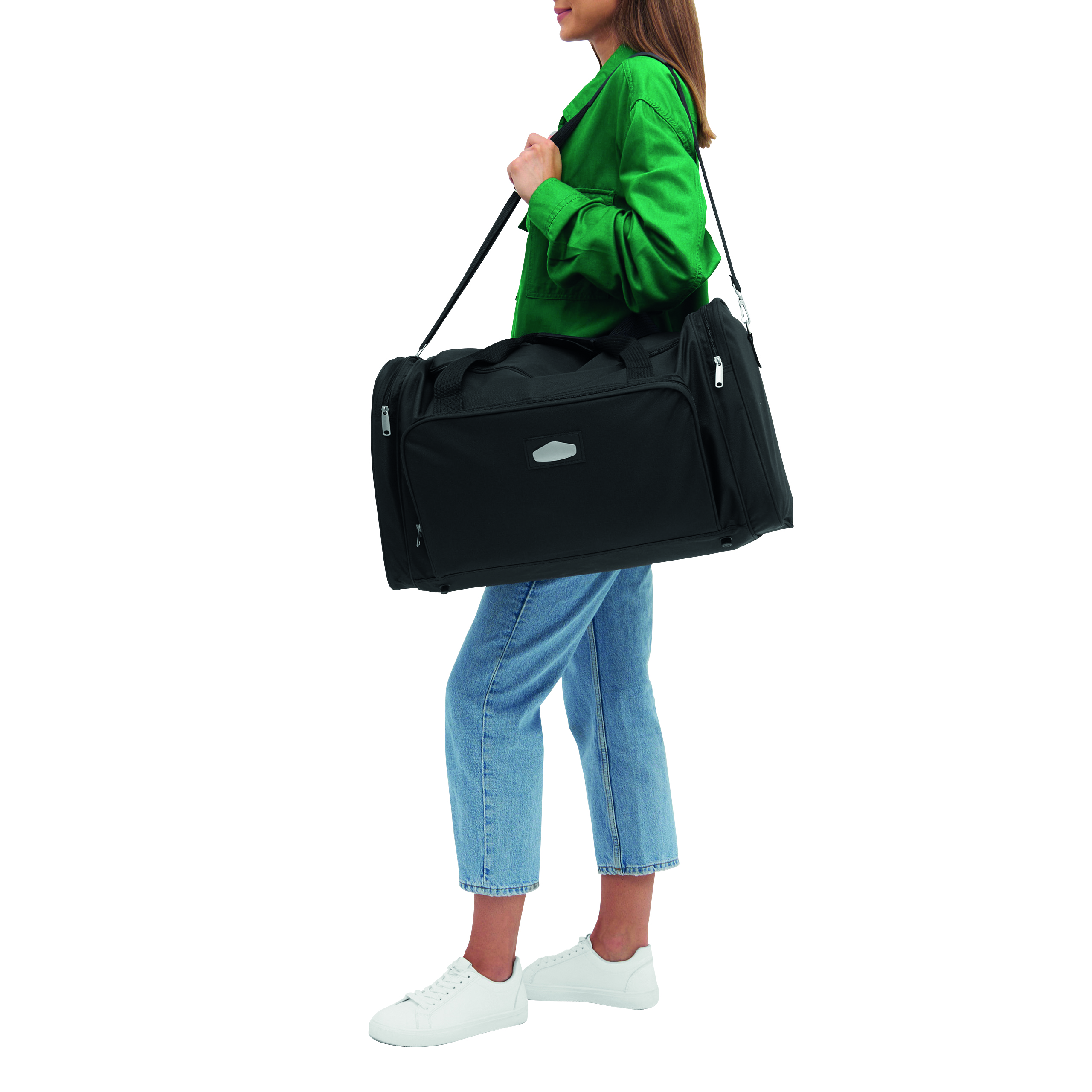 Torba podróżna LASER PLUS TRAV, główna komora na zamek błyskawiczny, przednia i boczna kieszeń na zamek, z wymienialnym metalowym emblematem, 2 tylnymi kieszeniami na zamek, zawiera regulowany i odpinany pasek na ramię.