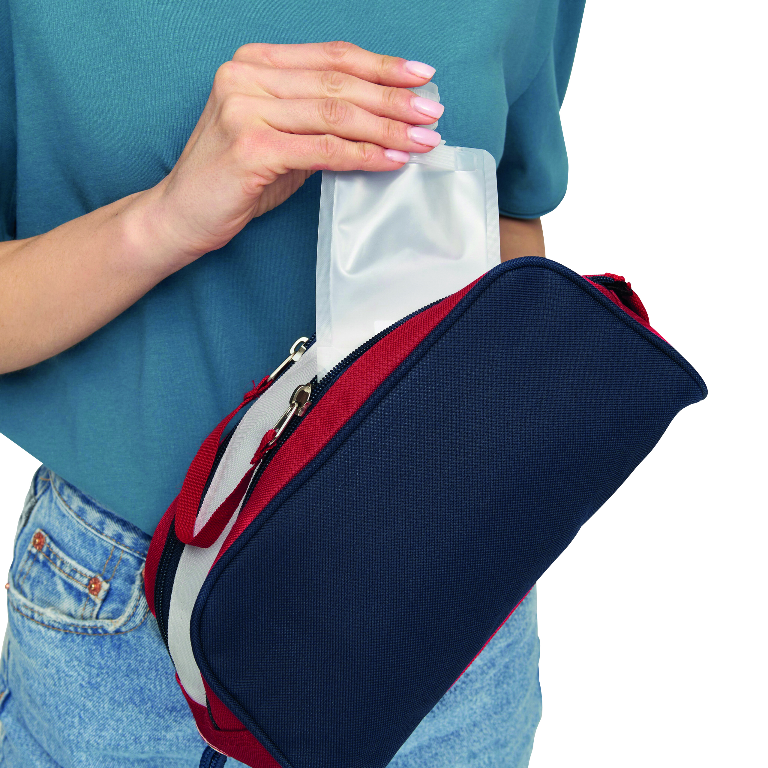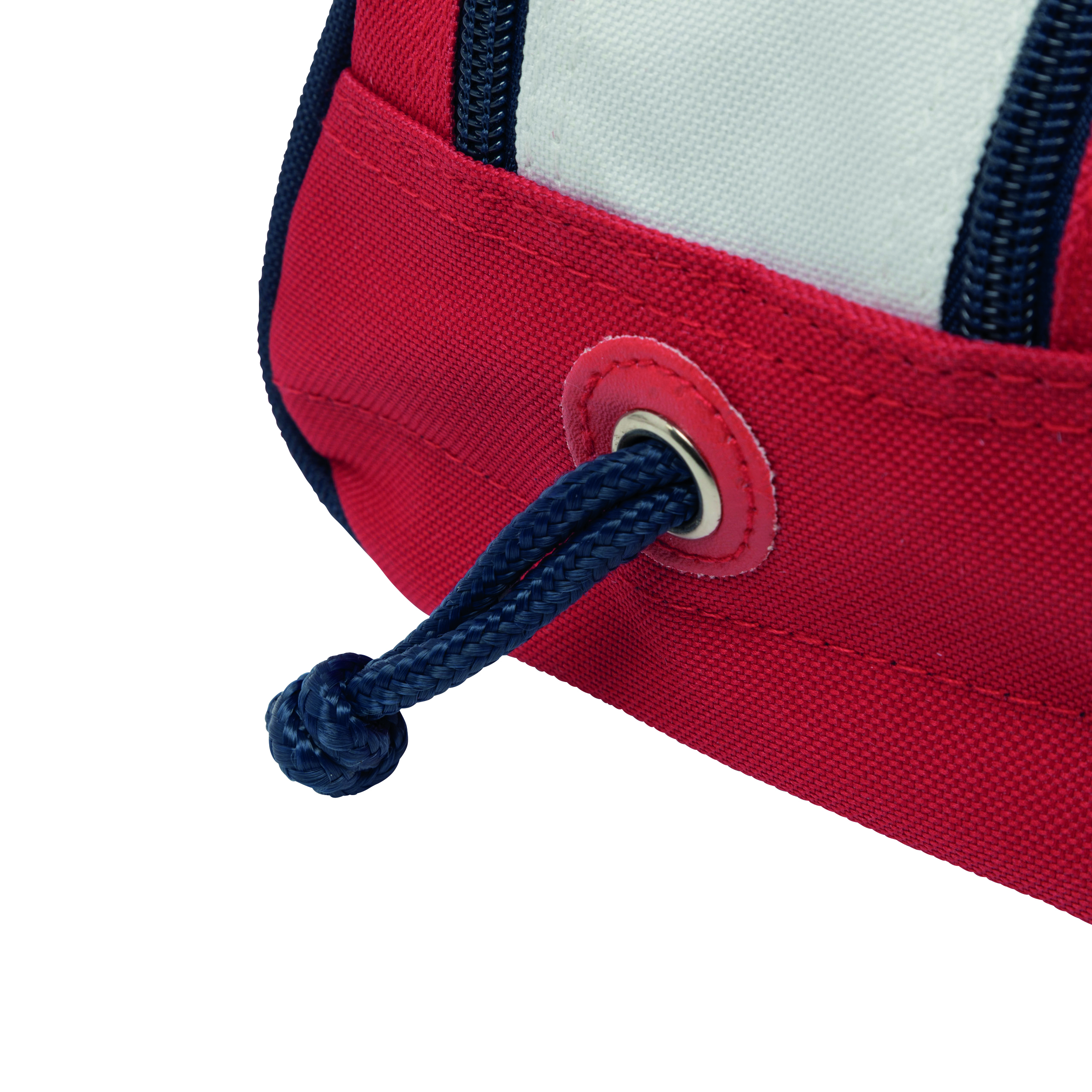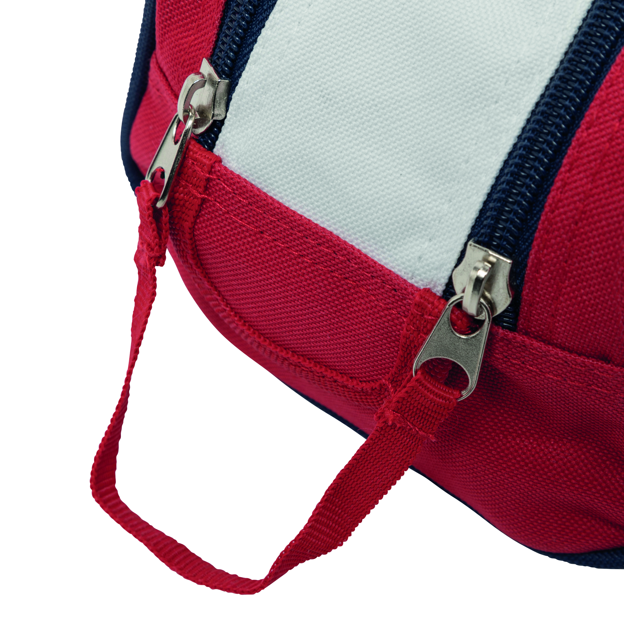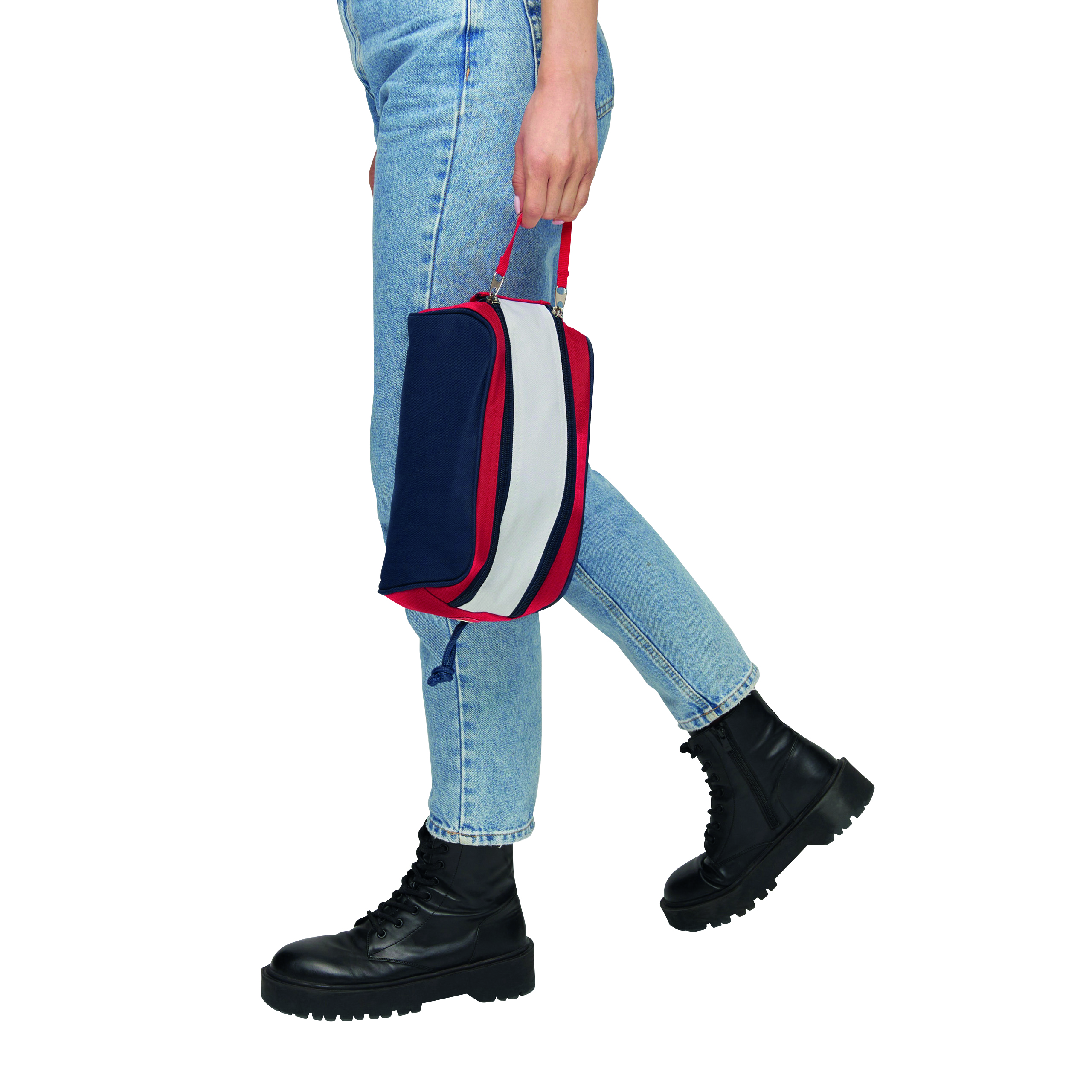 Kosmetyczka MARINA WASH z 2 równoległymi zamkami błyskawicznymi na górze i dodatkowym zapięciem na rzep, 6 kieszonek wewnątrz i dekoracyjną taśmą pomiędzy zamkami.