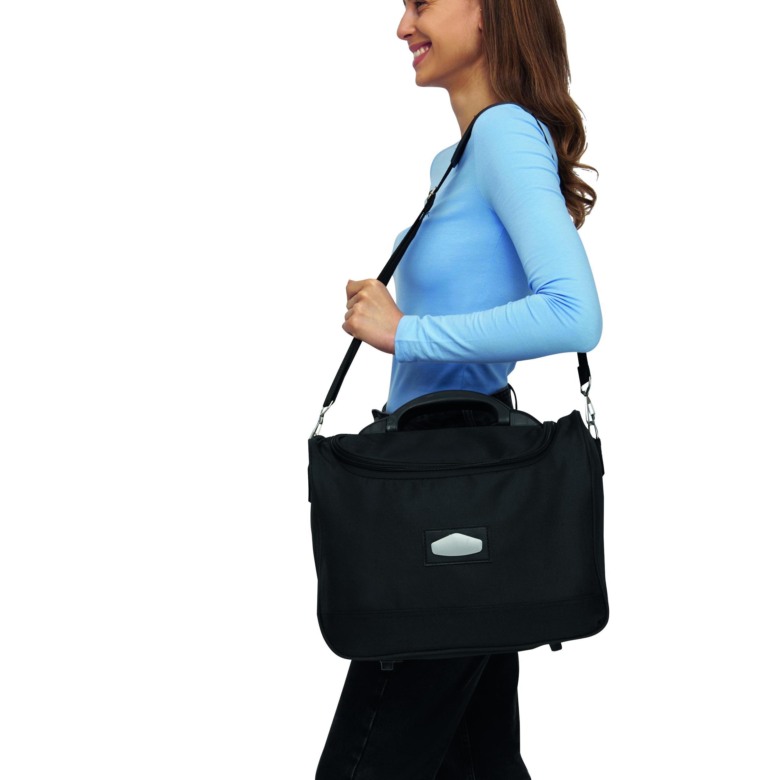 Torba kosmetyczka LASER PLUS. Główna komora na zamek błyskawiczny, z wymienialnym metalowym emblematem, rączką z odpornego plastiku, zawiera regulowany i odpinany pasek na ramię.
