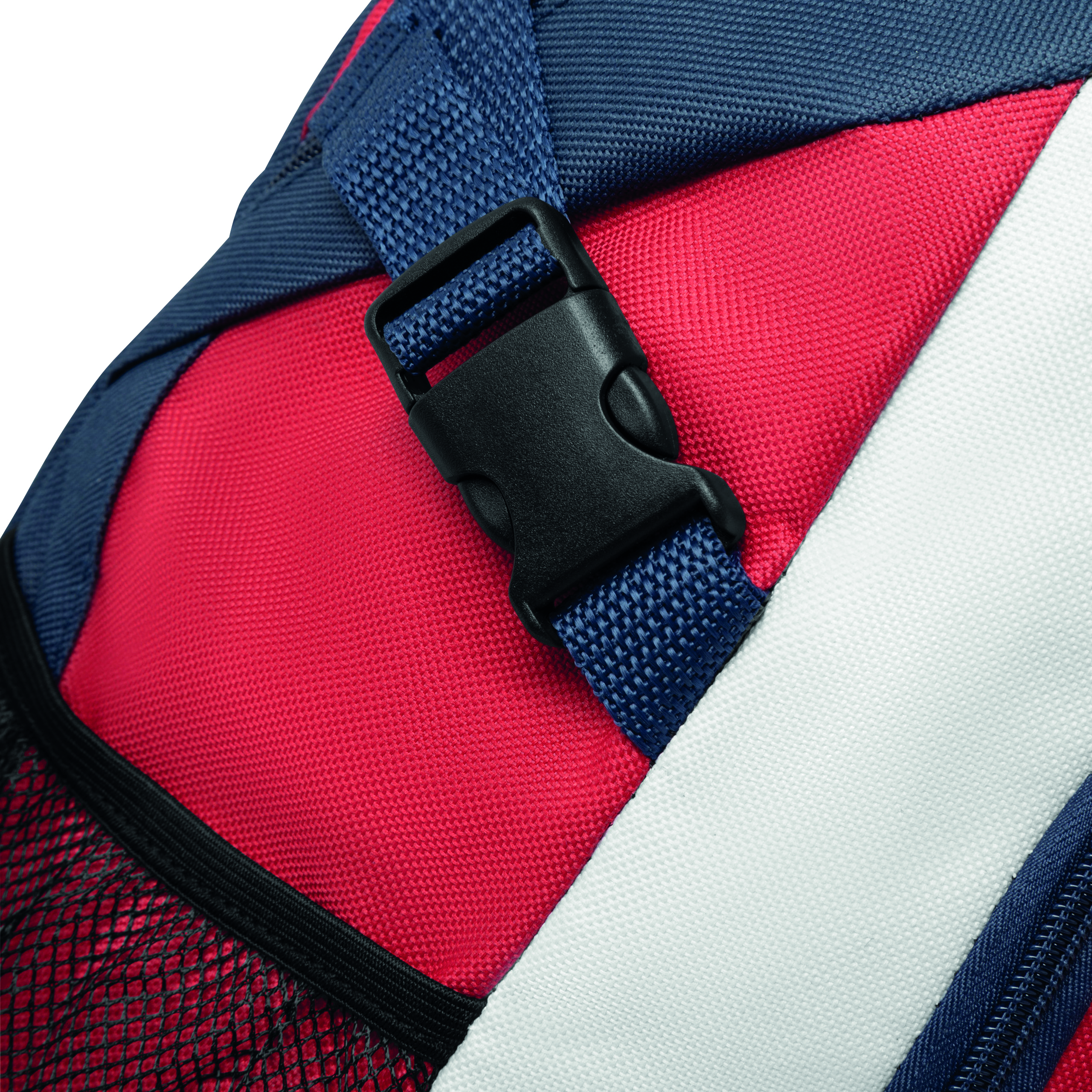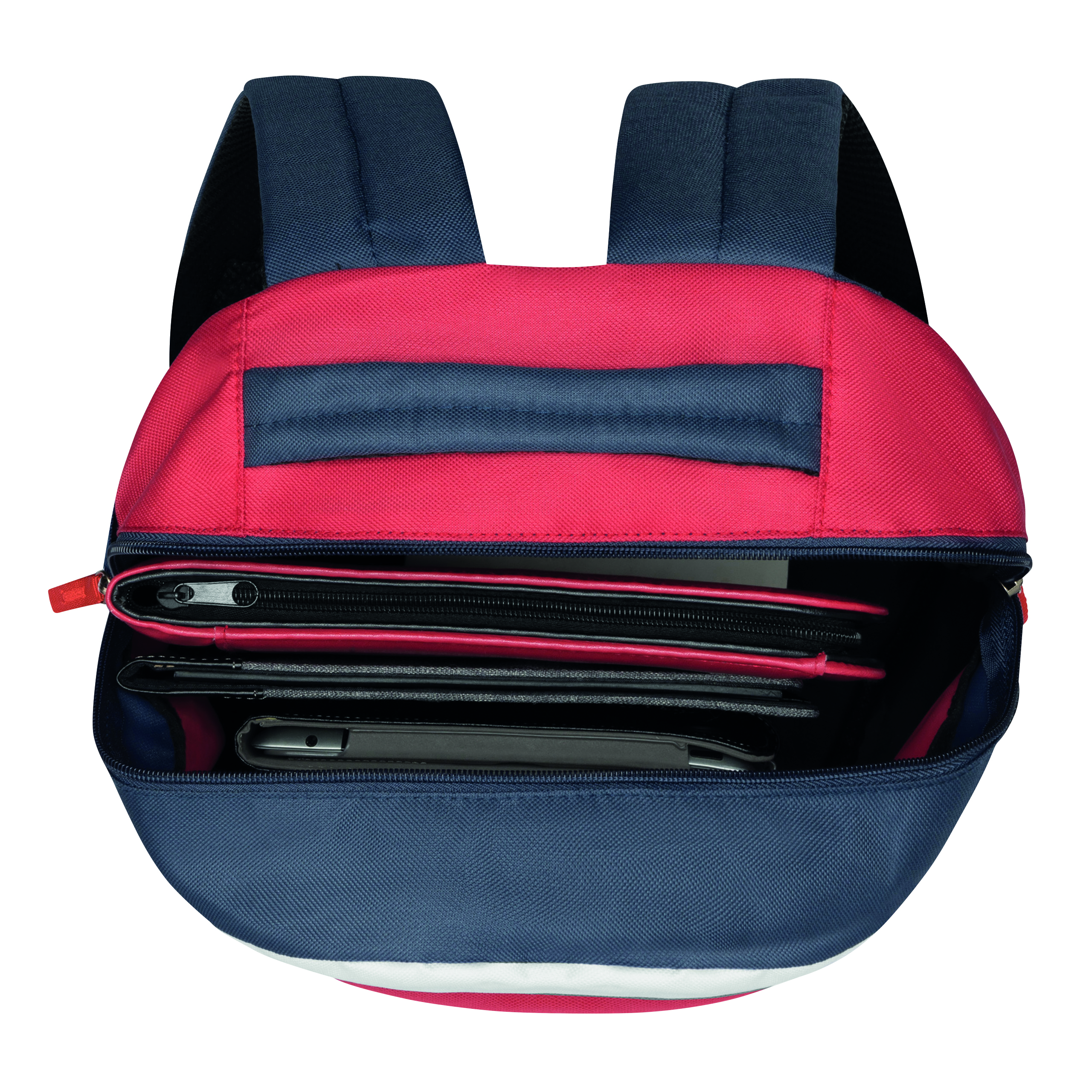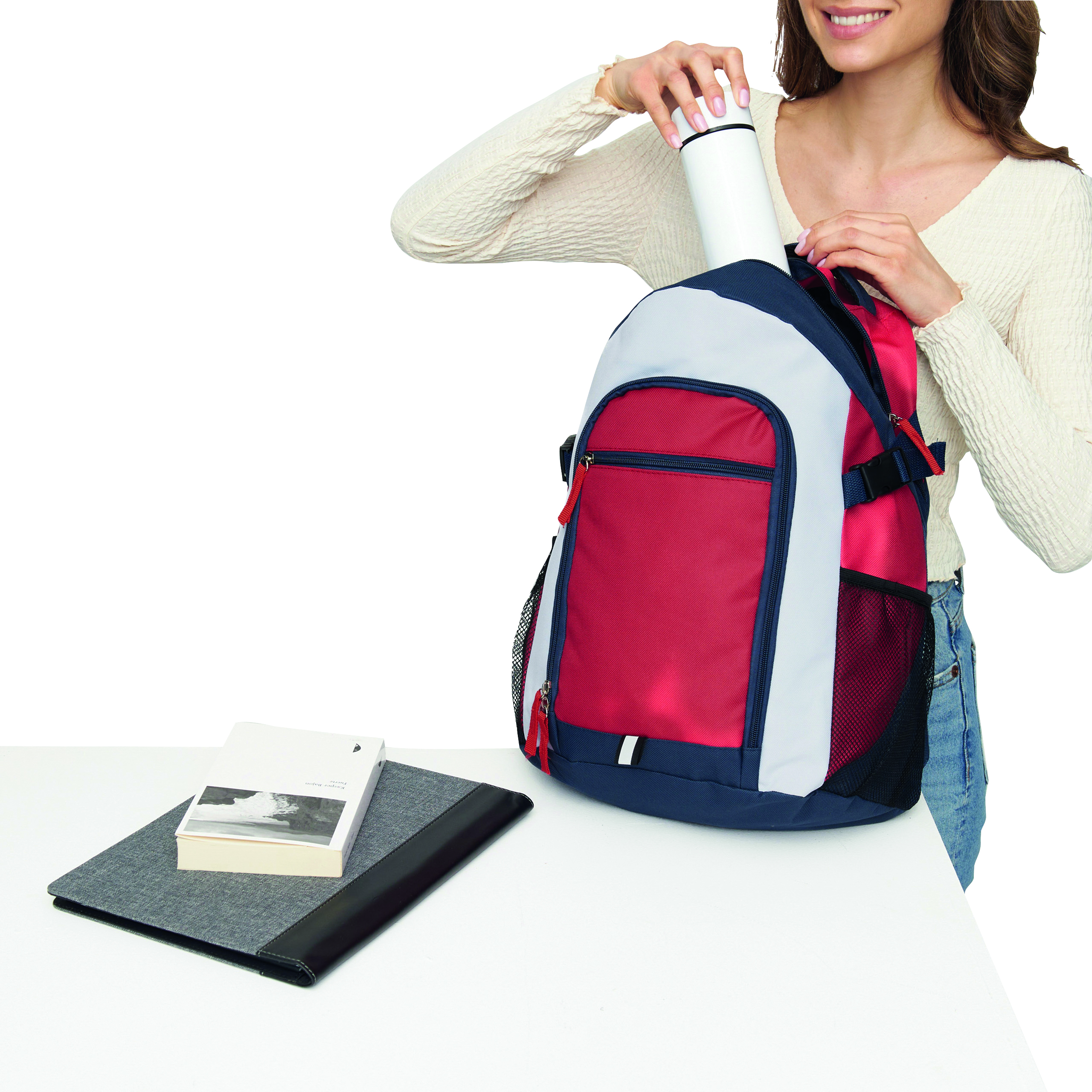 Plecak MARINA, z komorą główną, kieszenią przednią oraz kieszonkami dodatkowymi zapinanymi na zamek, dwiema bocznymi kieszeniami z siatki, bocznymi paskami zaciskowymi, wzmocnionym uchwytem, wyściełane szelki oraz tył plecaka.