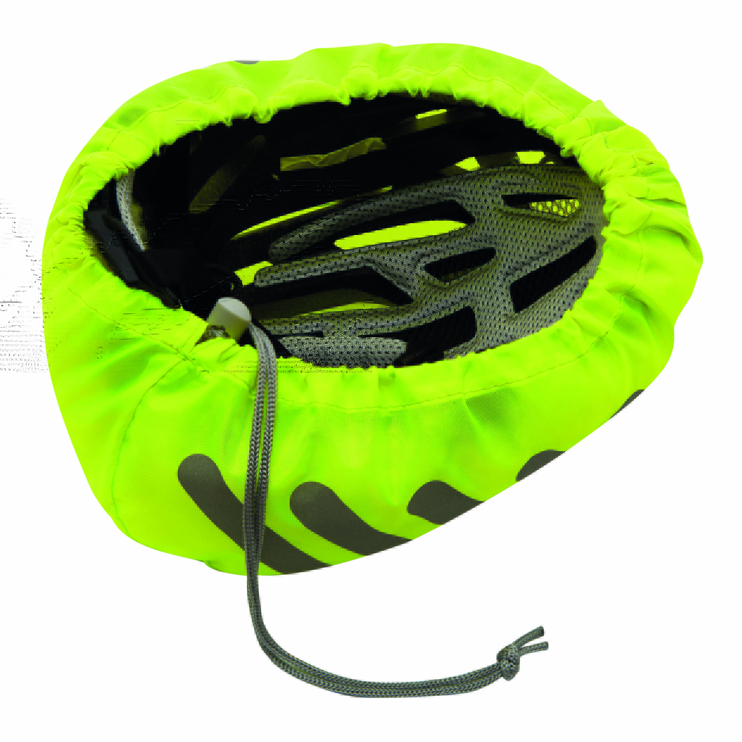 Ochraniacz przeciwdeszczowy na kask rowerowy BIKE PROTECT: wodoodporny i wiatroszczelny, z odblaskowymi paskami, pasuje do prawie wszystkich rozmiarów kasków dzięki sznurkowi ze stoperem.
